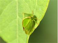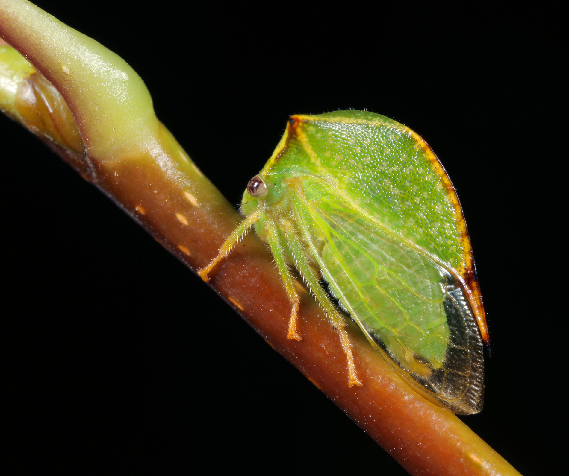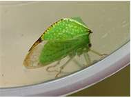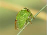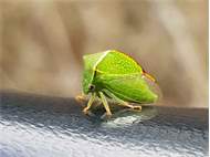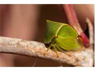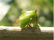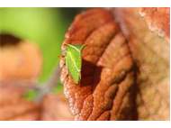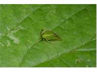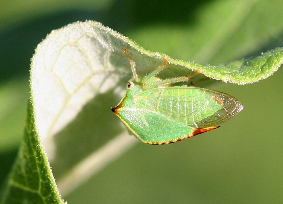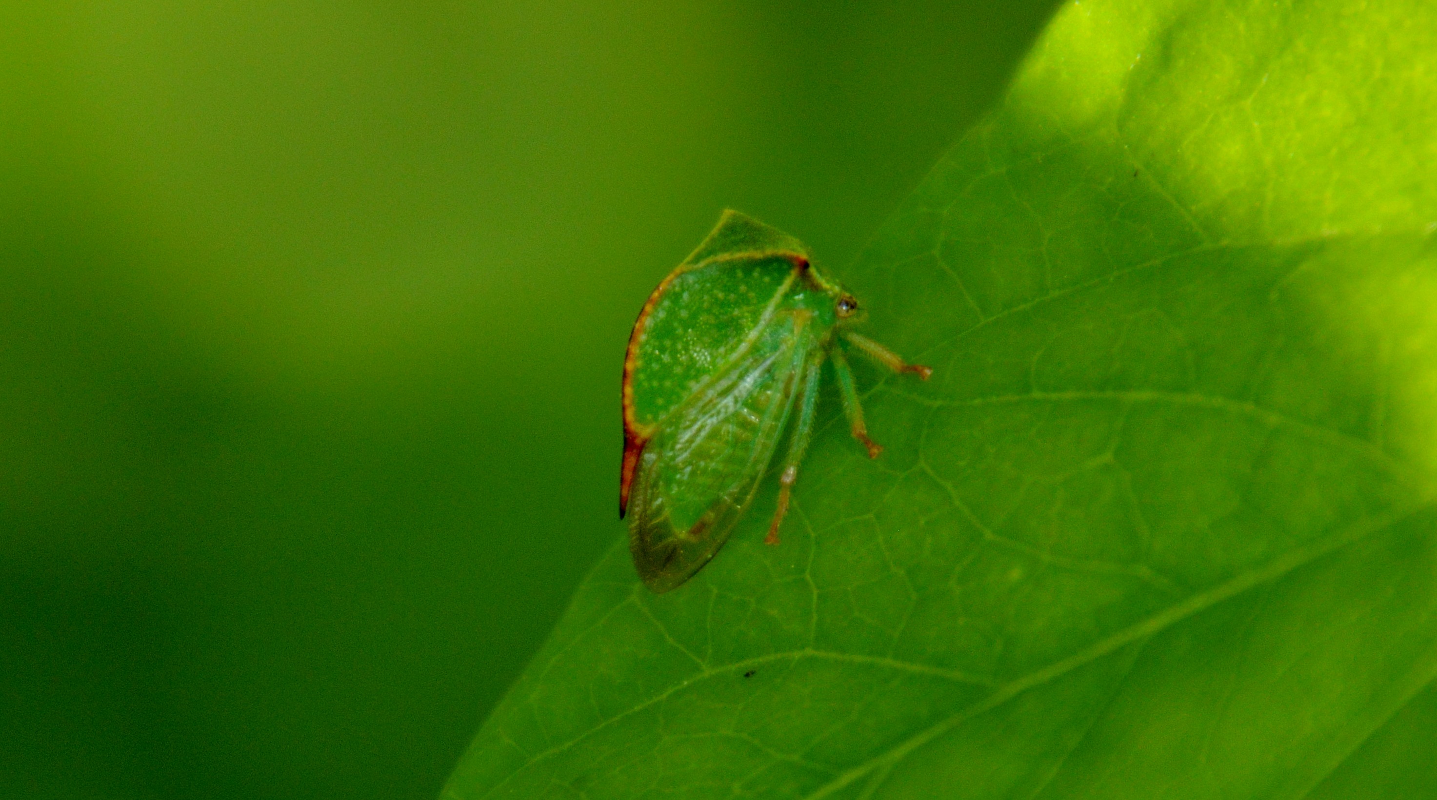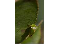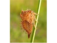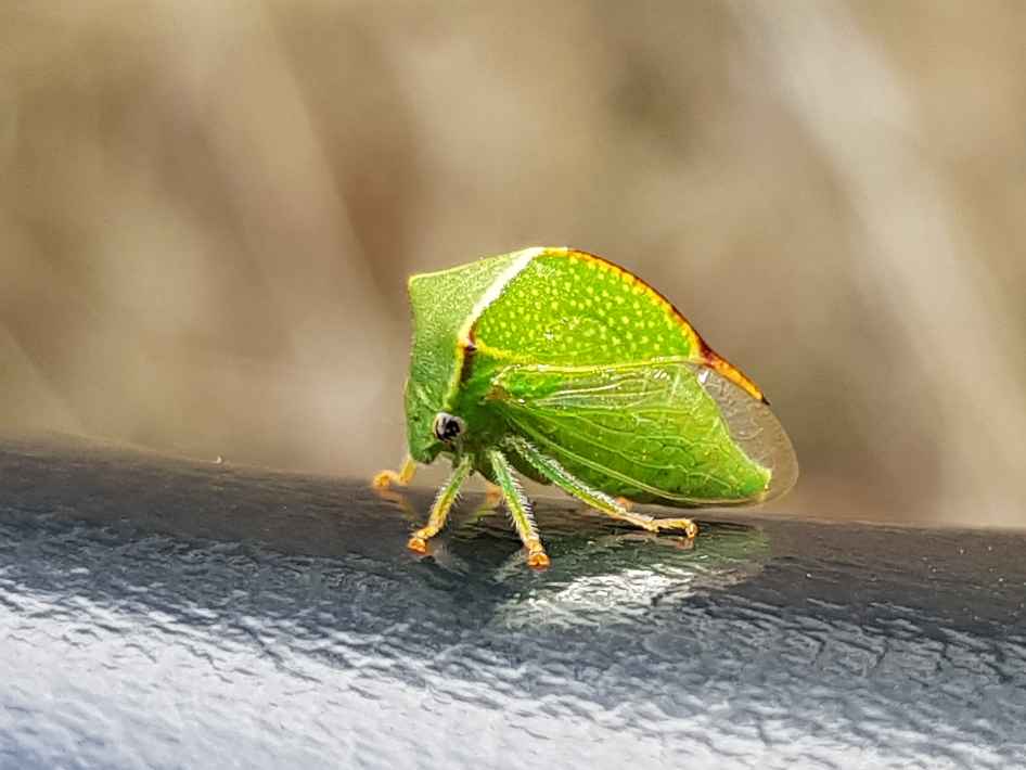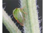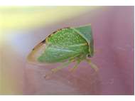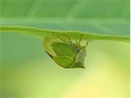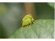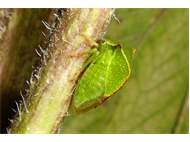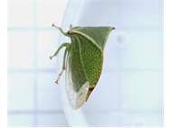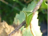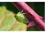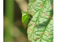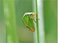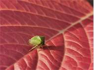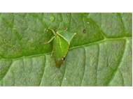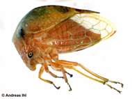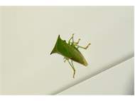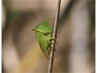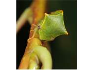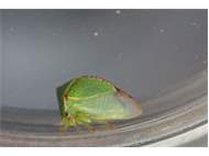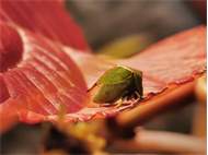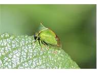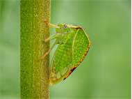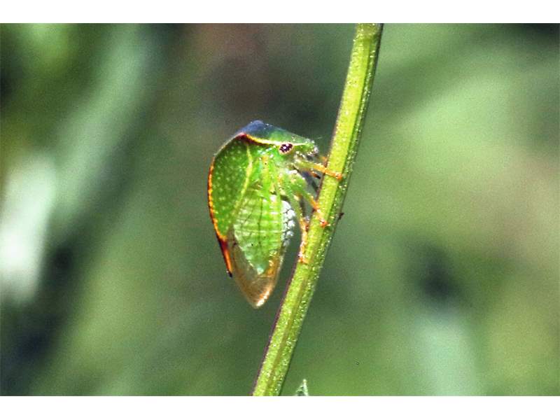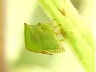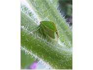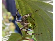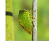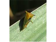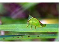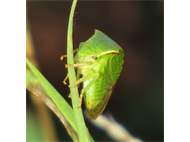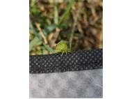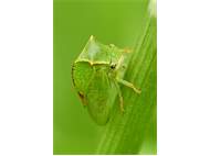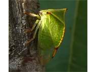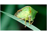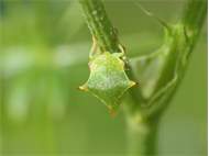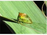 Büffelzikade, Stictocephala bisonia, als Beute einer Spinne auf einem Himbeerstrauch, Leipzig, Ortsteil Thekla, Sep. 2012 (© Victor Weiler)( Bild vergrößern)