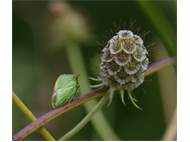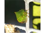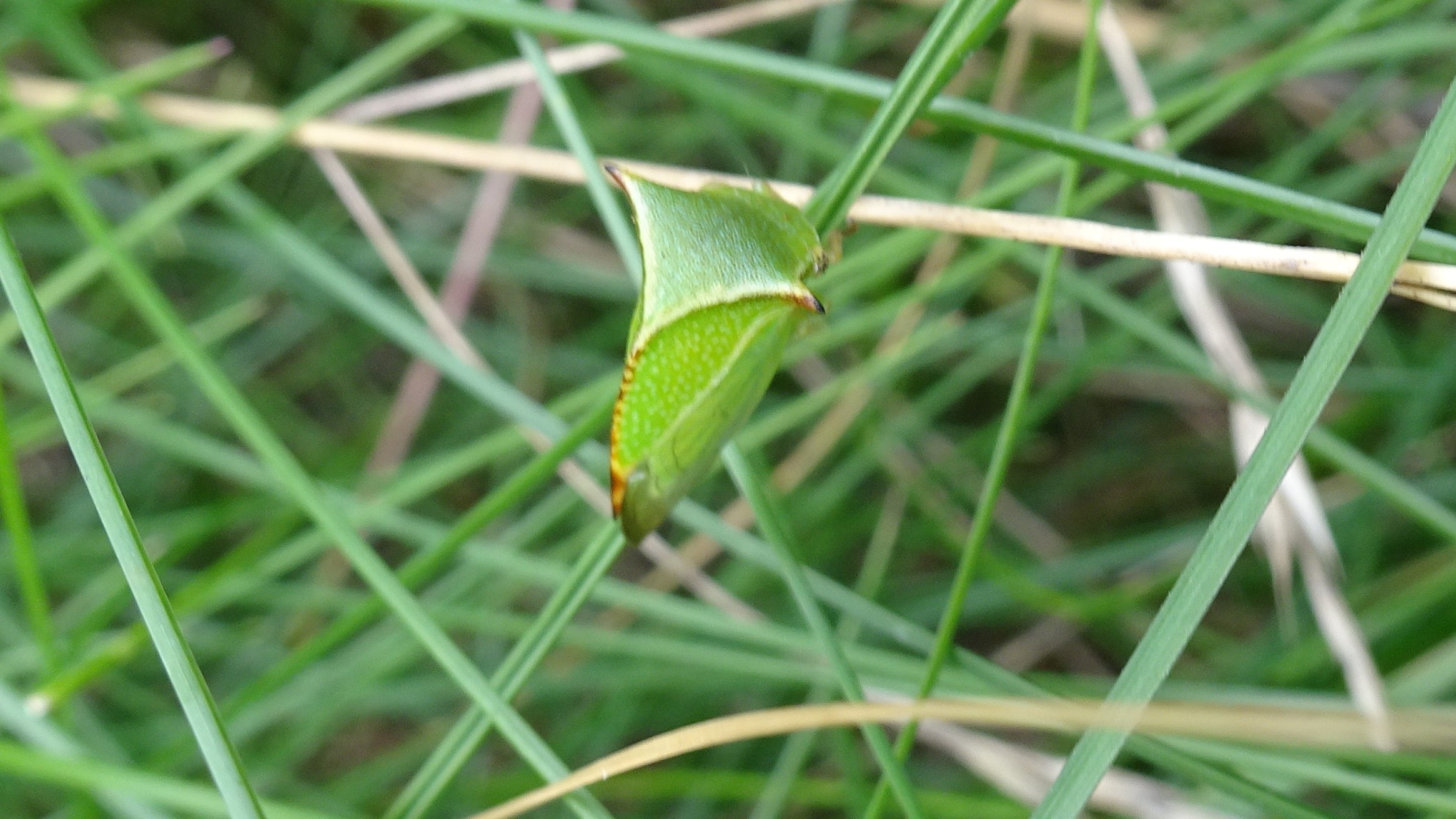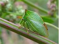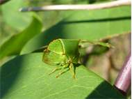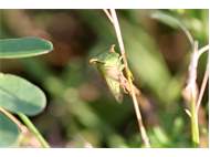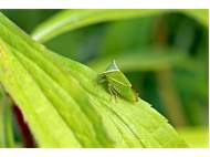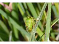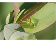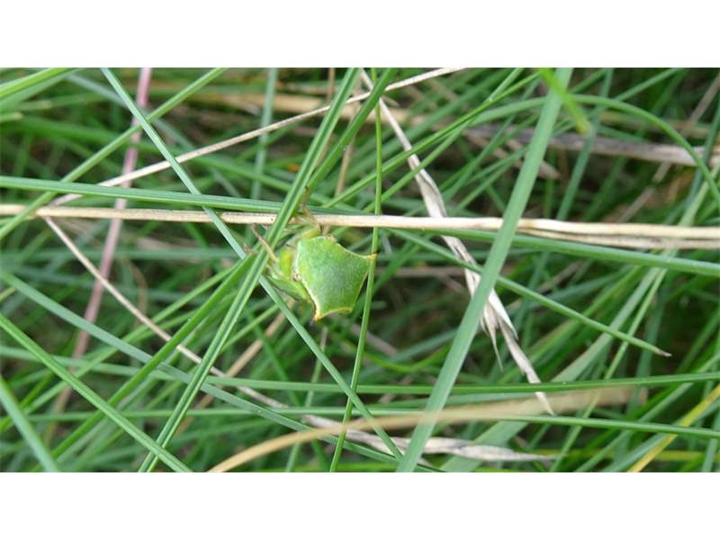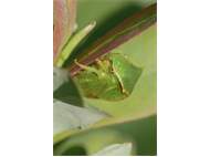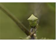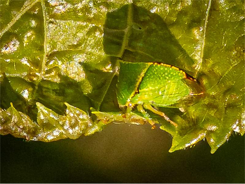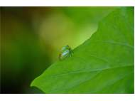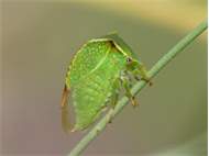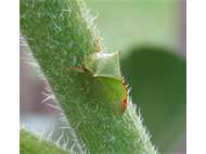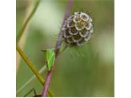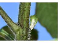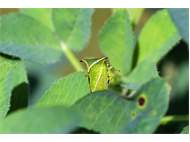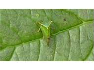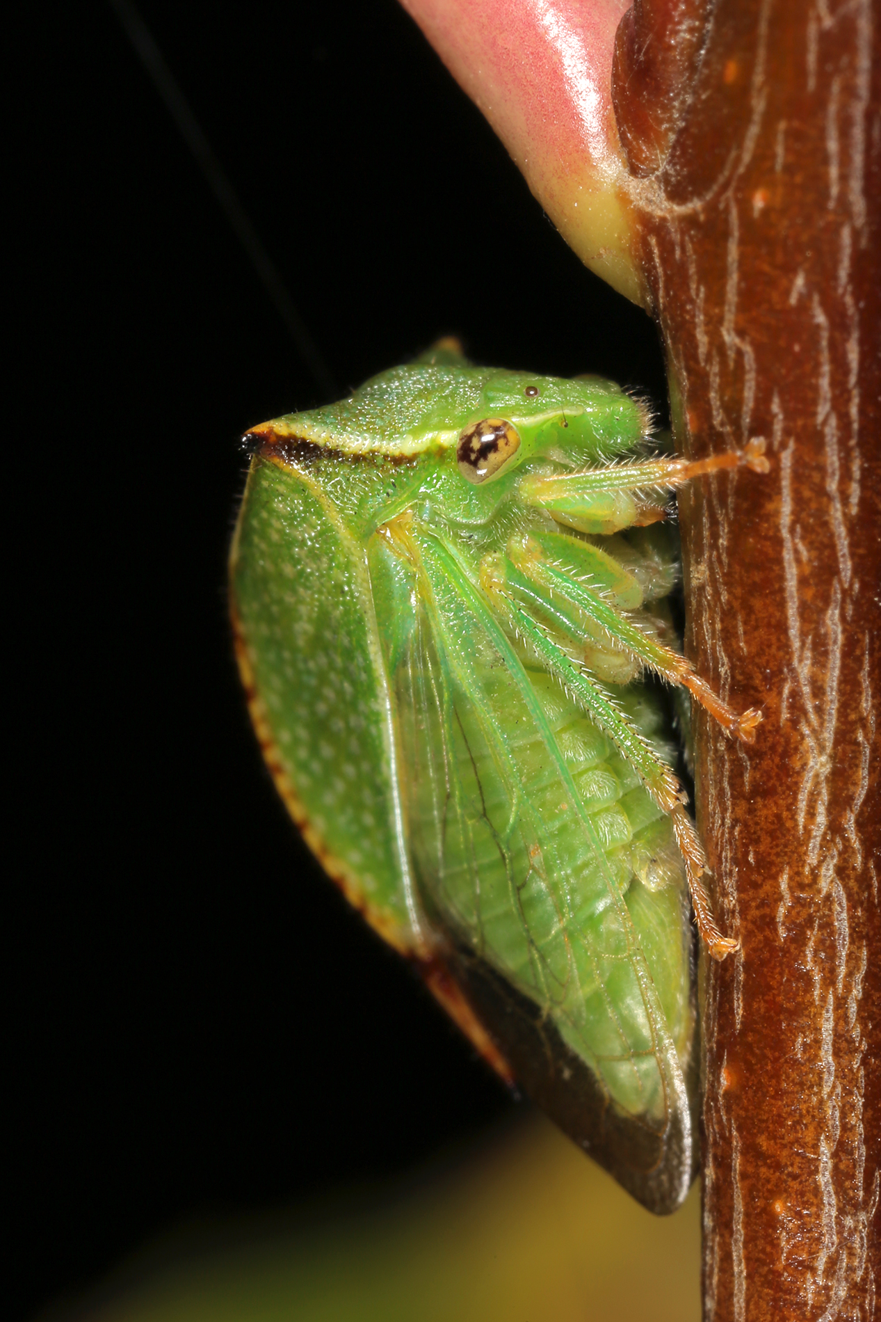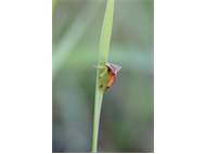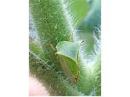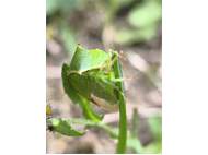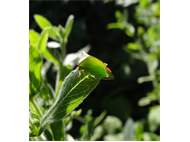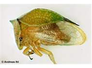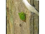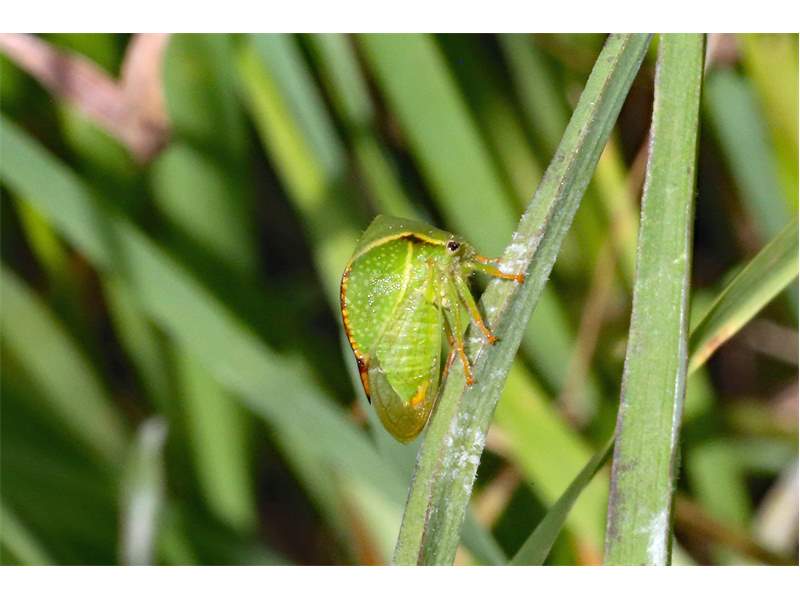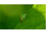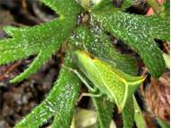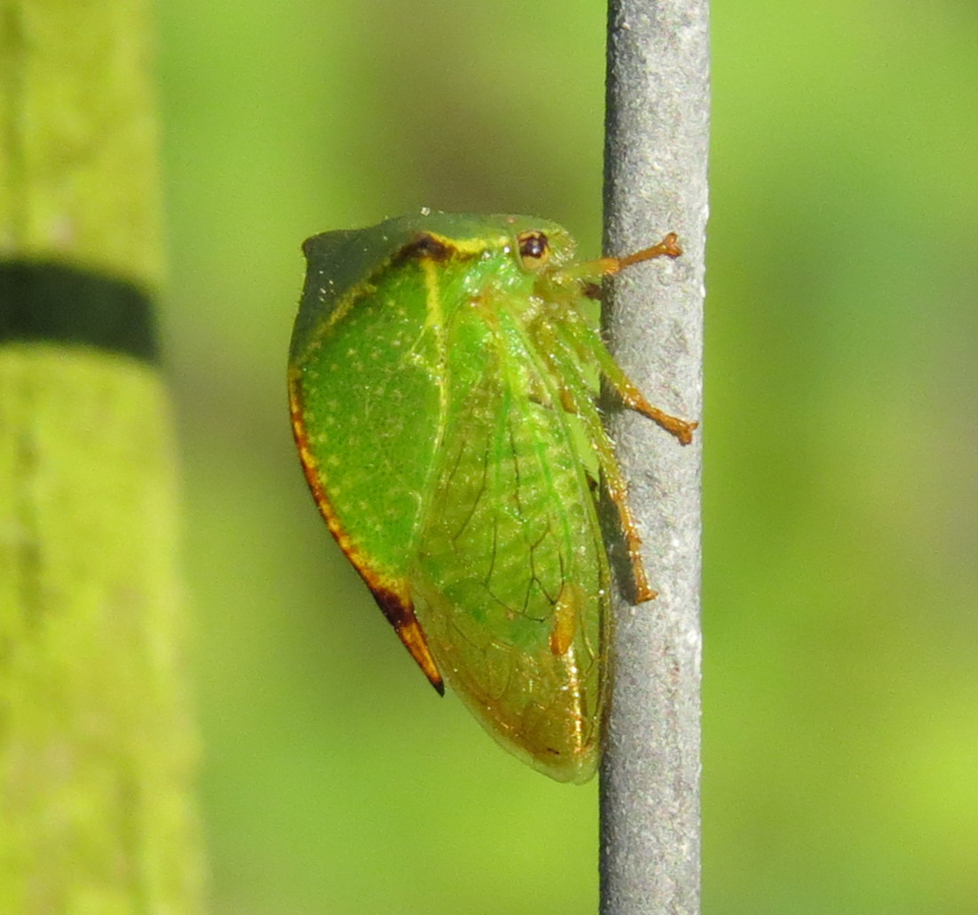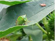 Büffelzikade, Stictocephala bisonia, als Beute einer Spinne auf einem Himbeerstrauch, Leipzig, Ortsteil Thekla, Sep. 2012 (© Victor Weiler)( Bild vergrößern)