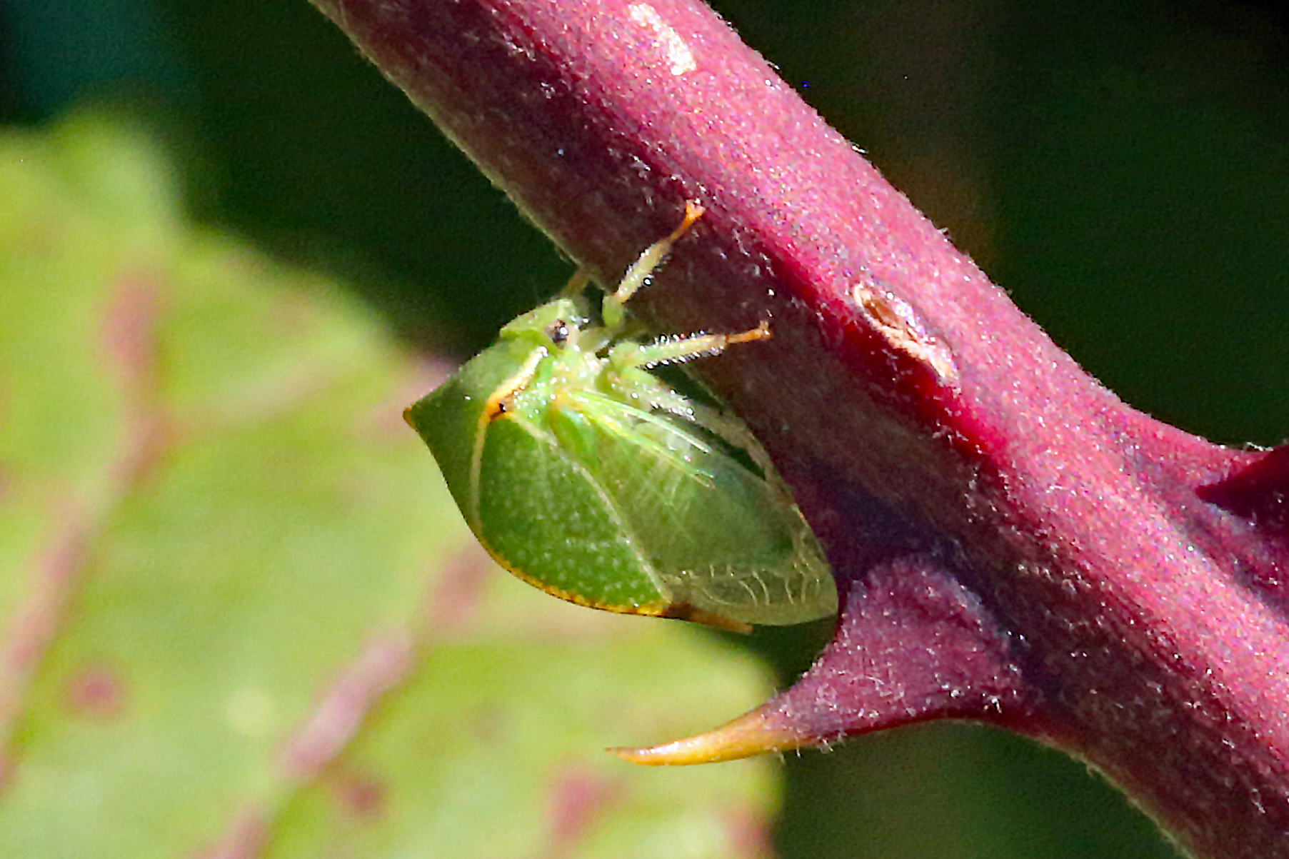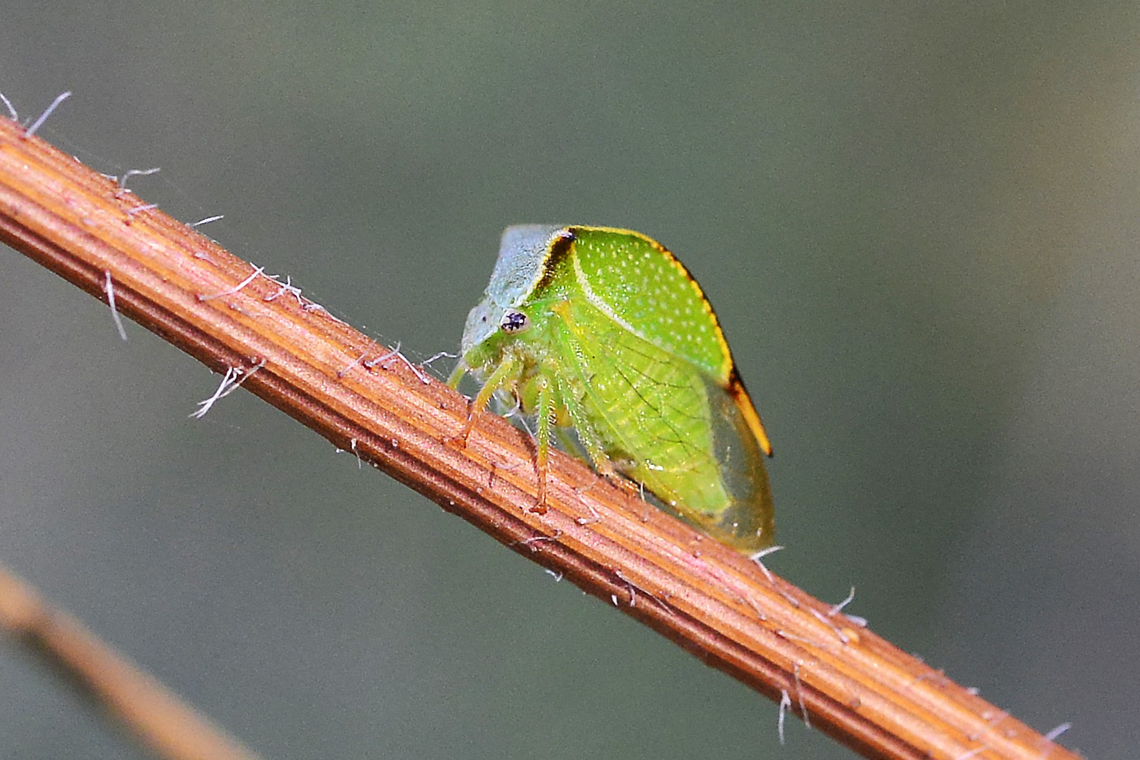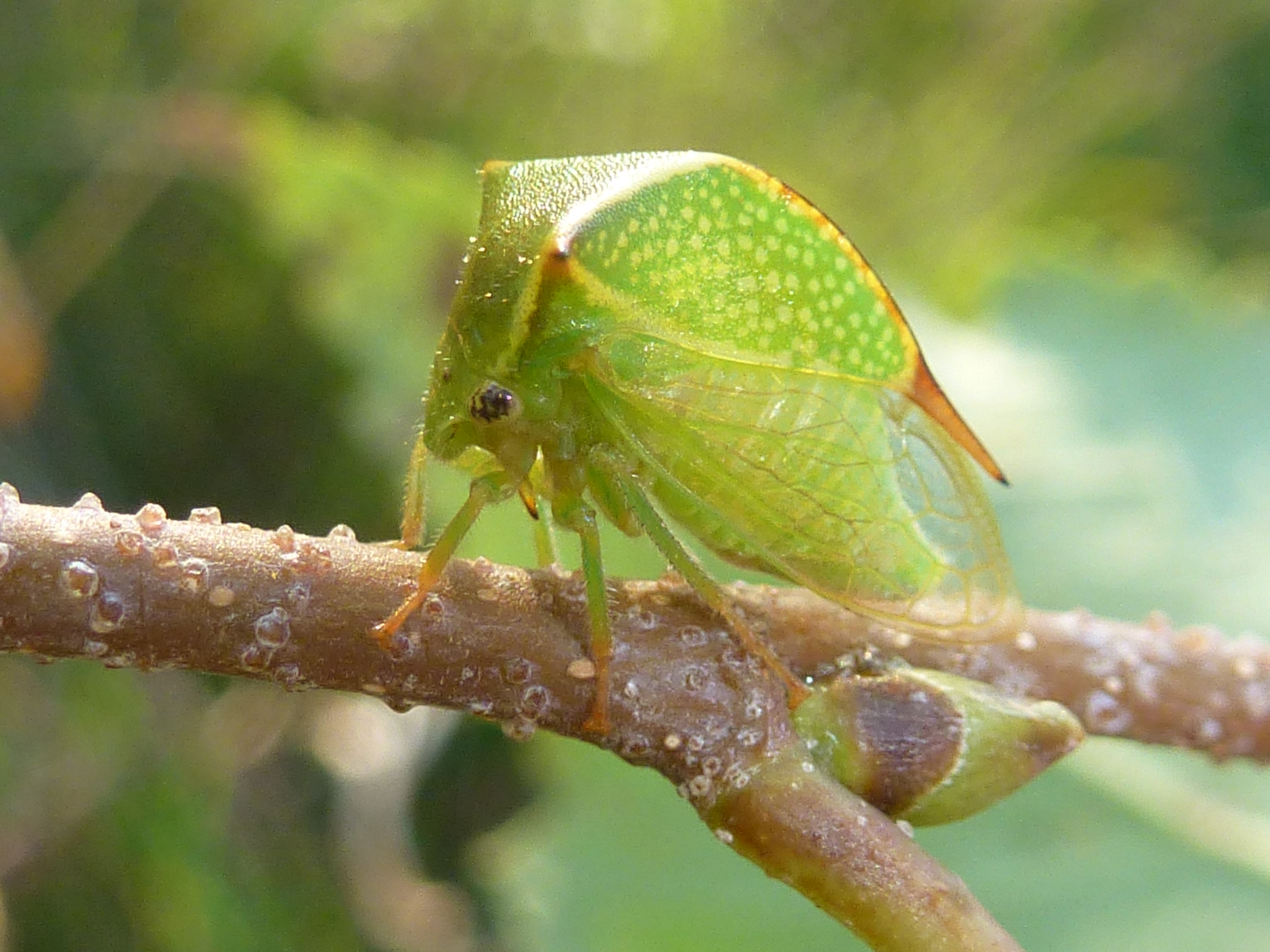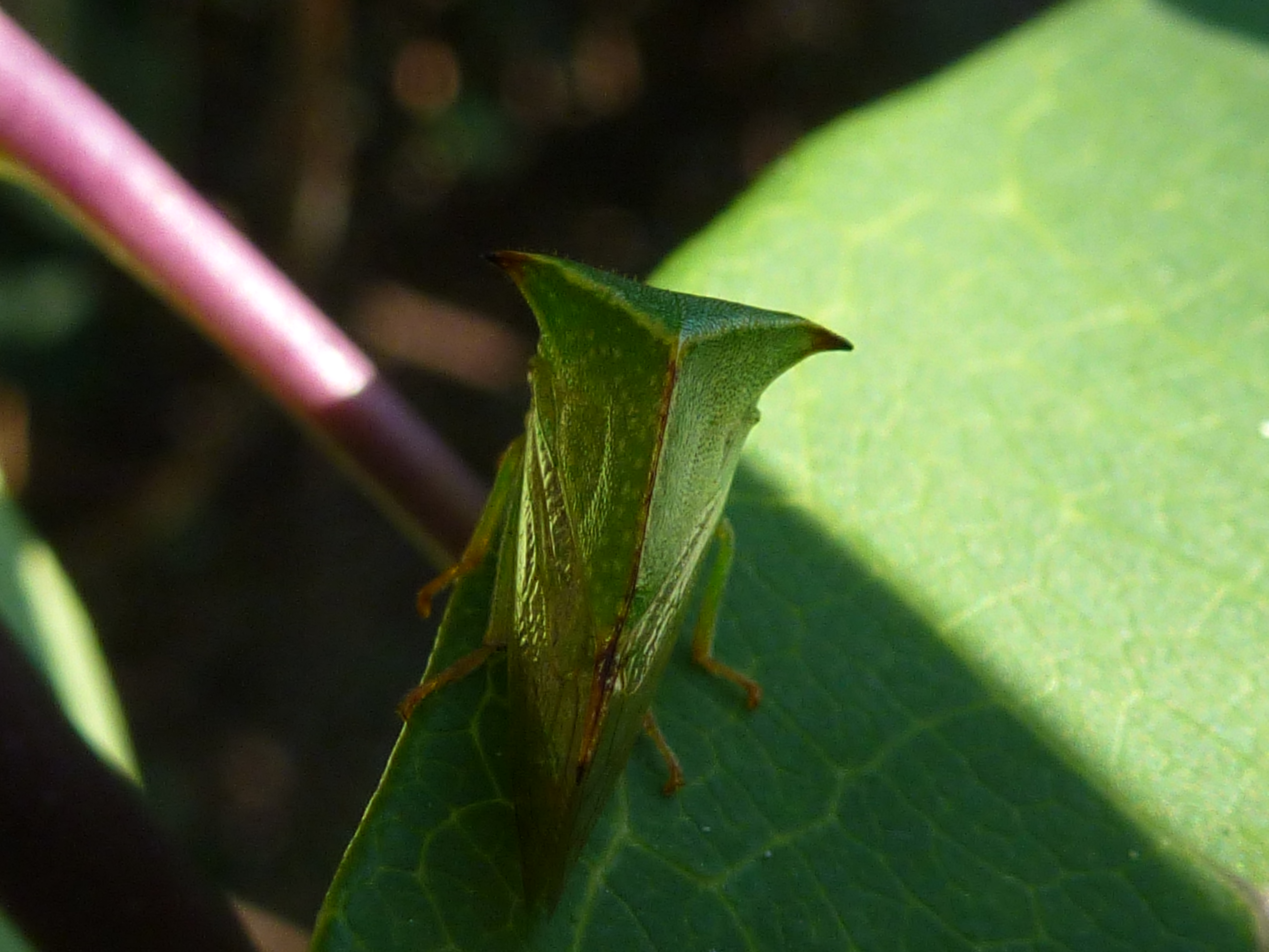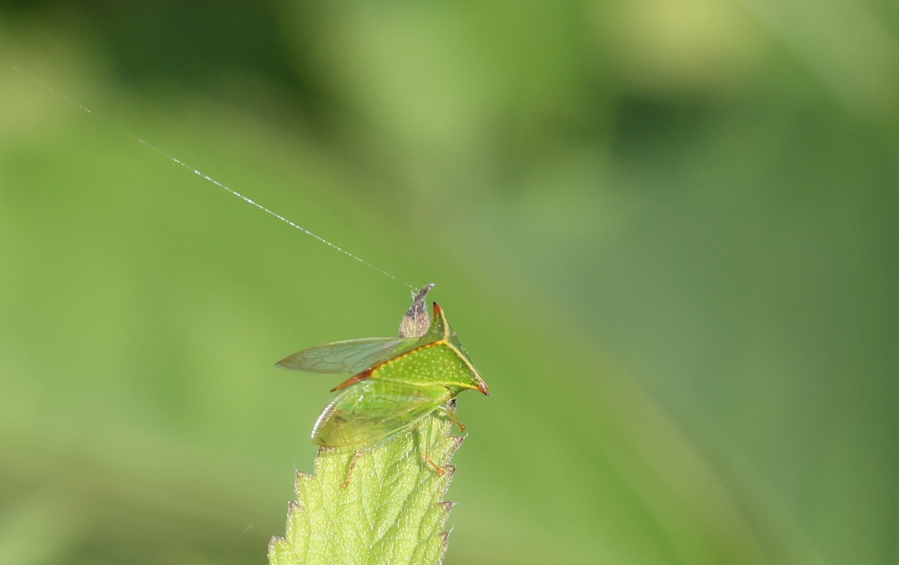 Büffelzikade, Stictocephala bisonia, als Beute einer Spinne auf einem Himbeerstrauch, Leipzig, Ortsteil Thekla, Sep. 2012