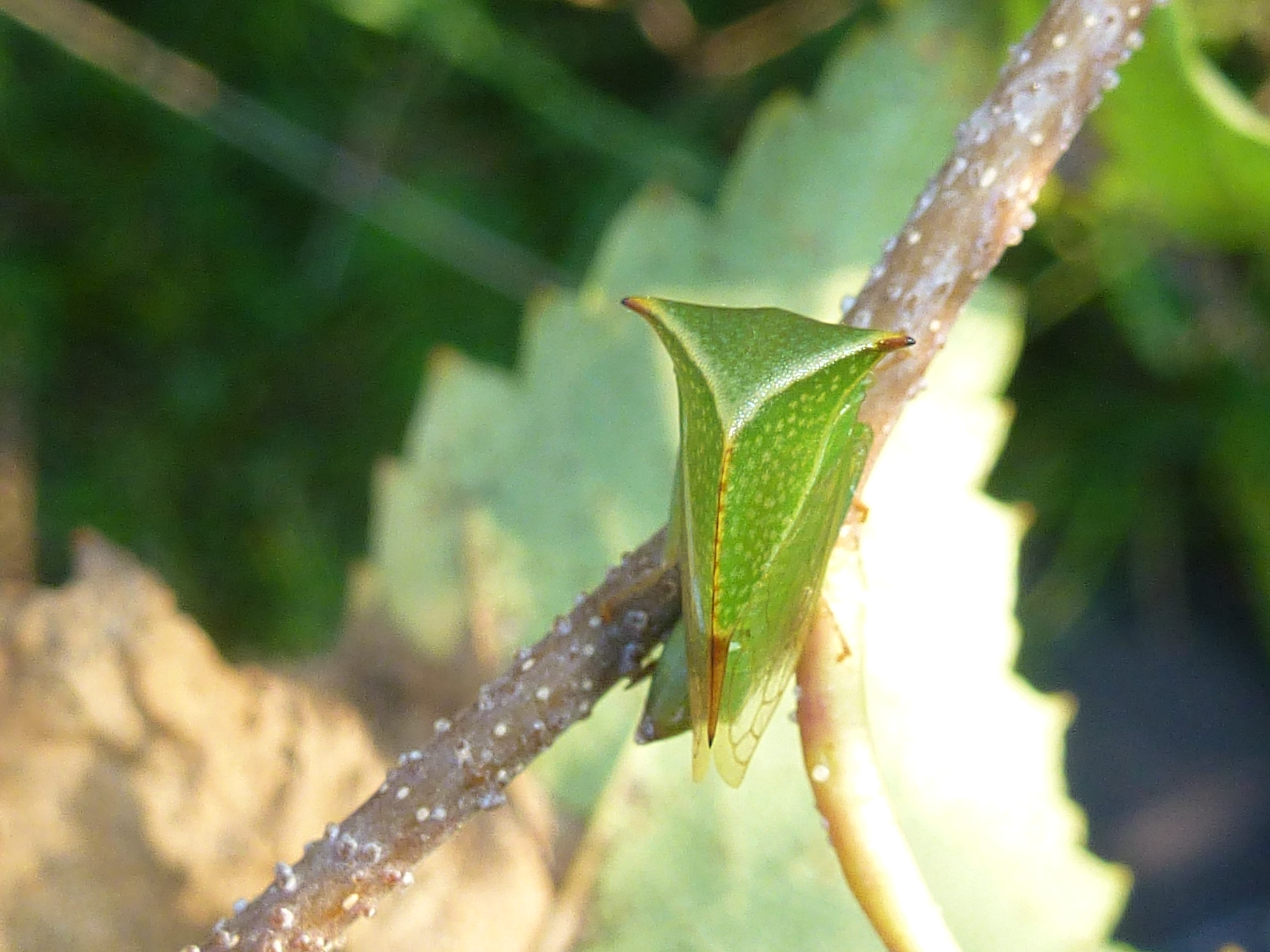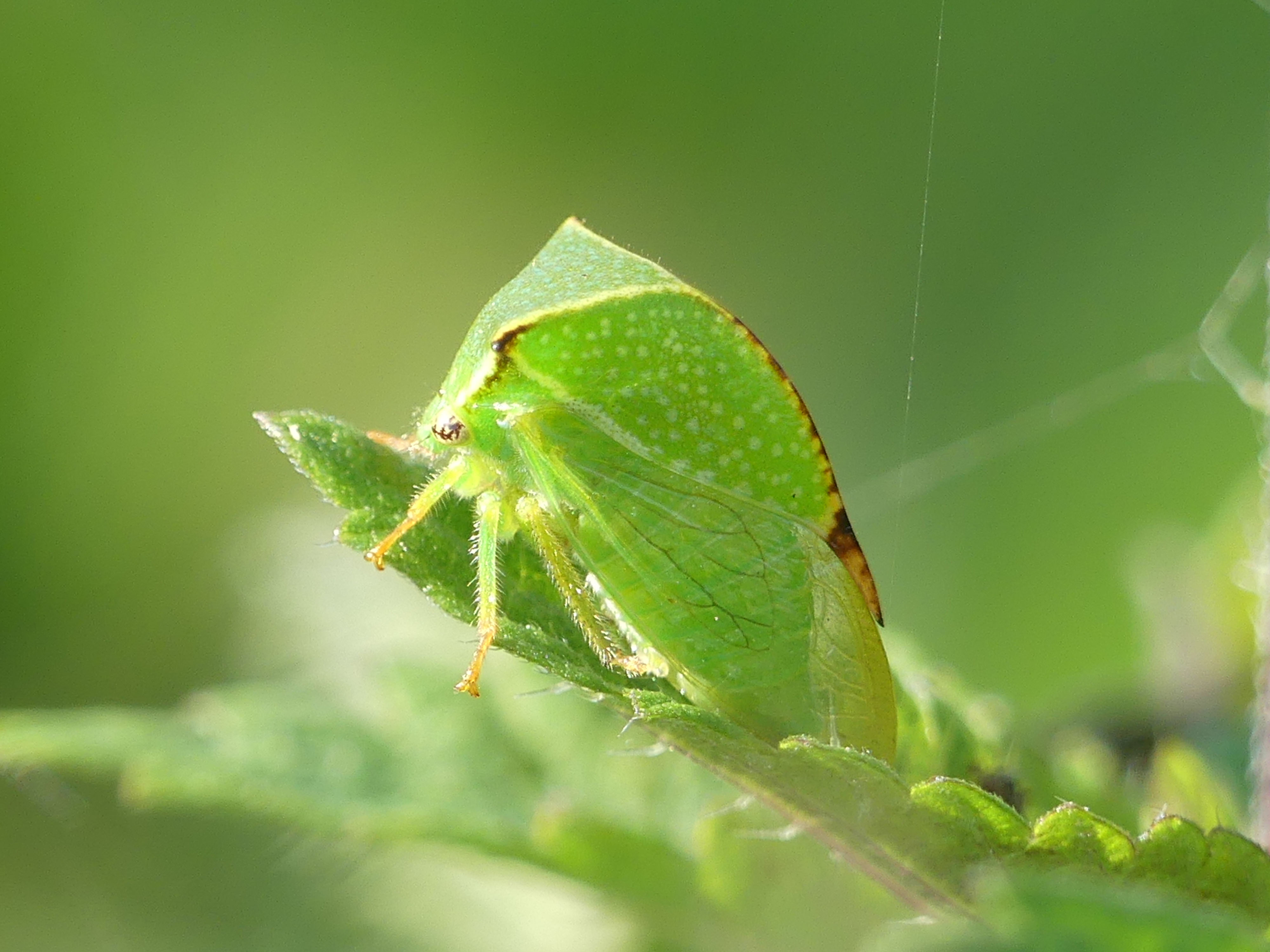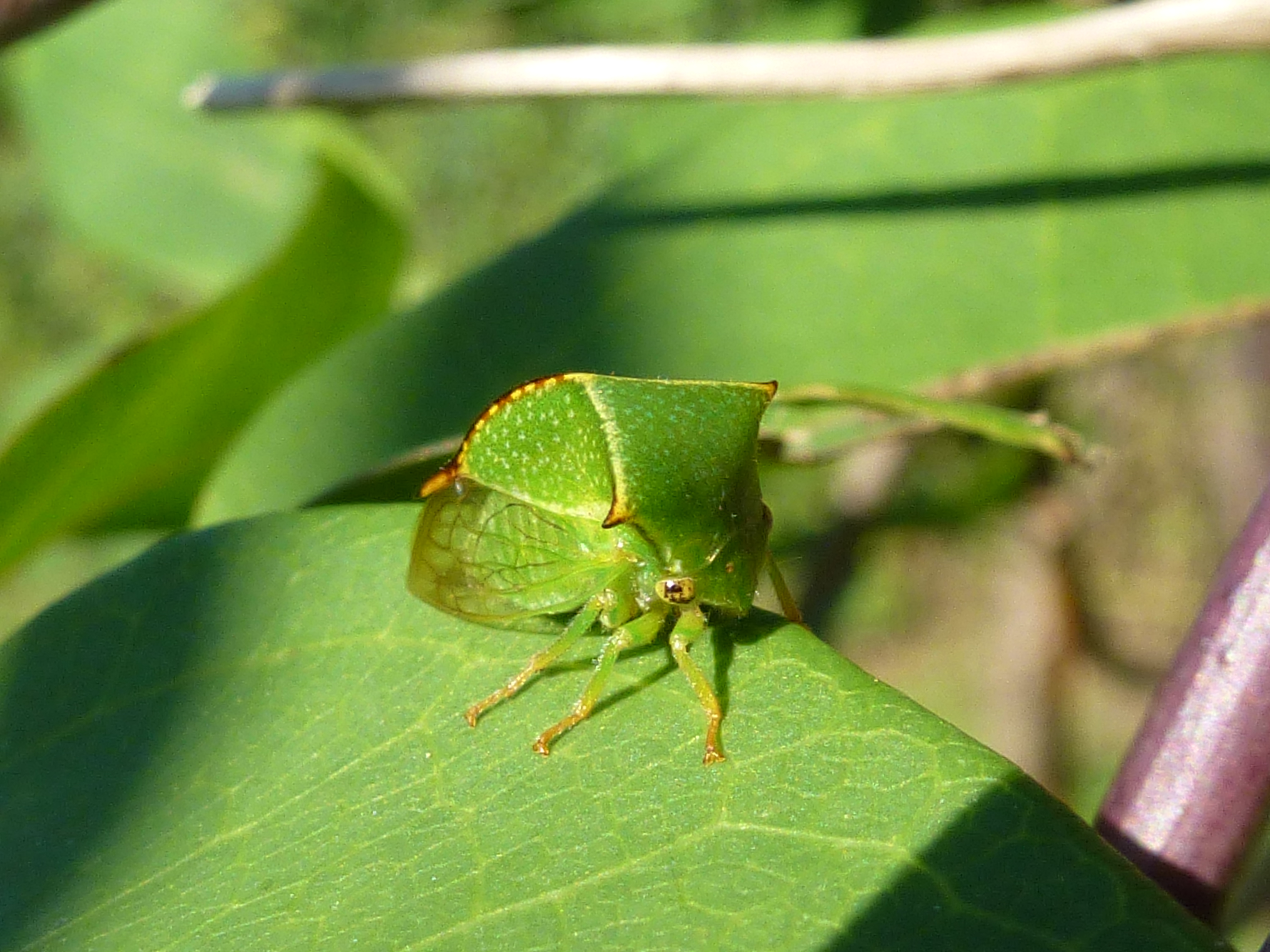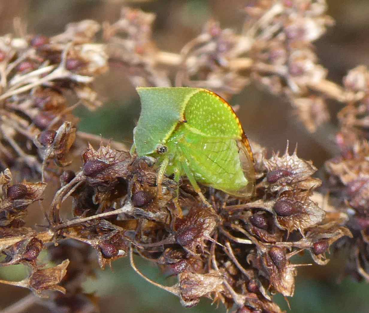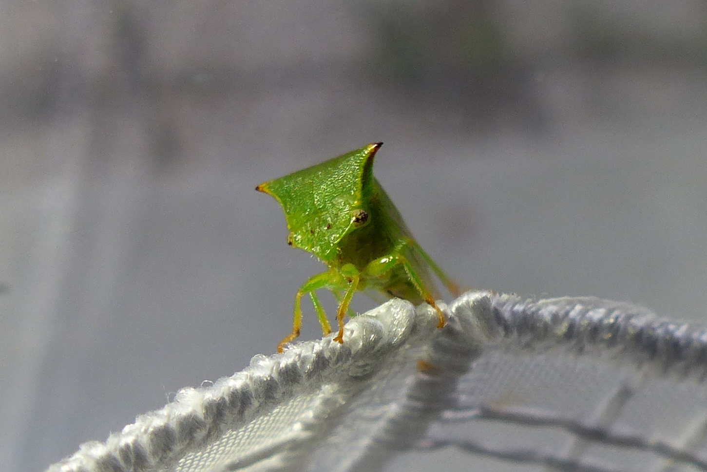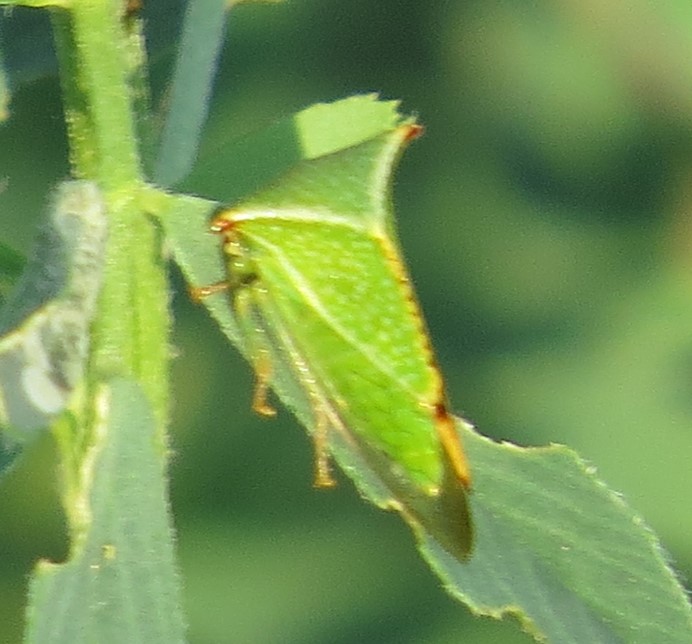 Büffelzikade, Stictocephala bisonia, als Beute einer Spinne auf einem Himbeerstrauch, Leipzig, Ortsteil Thekla, Sep. 2012