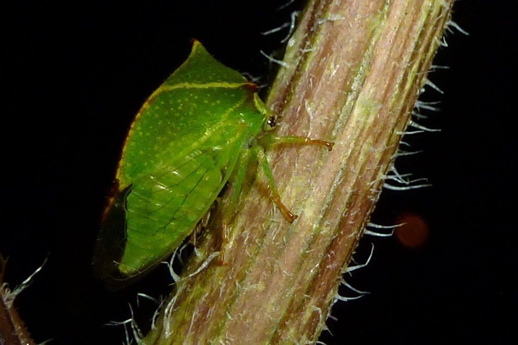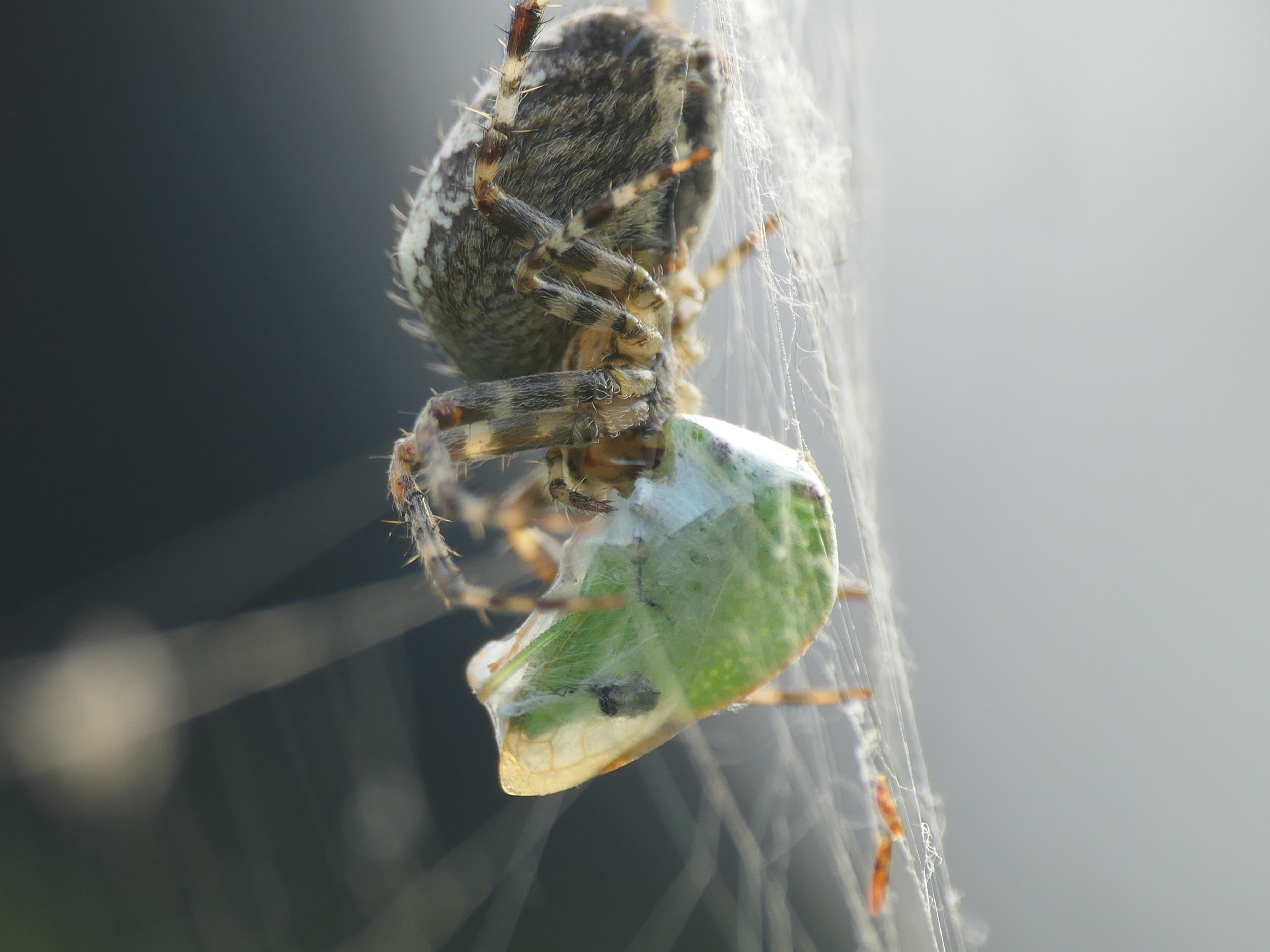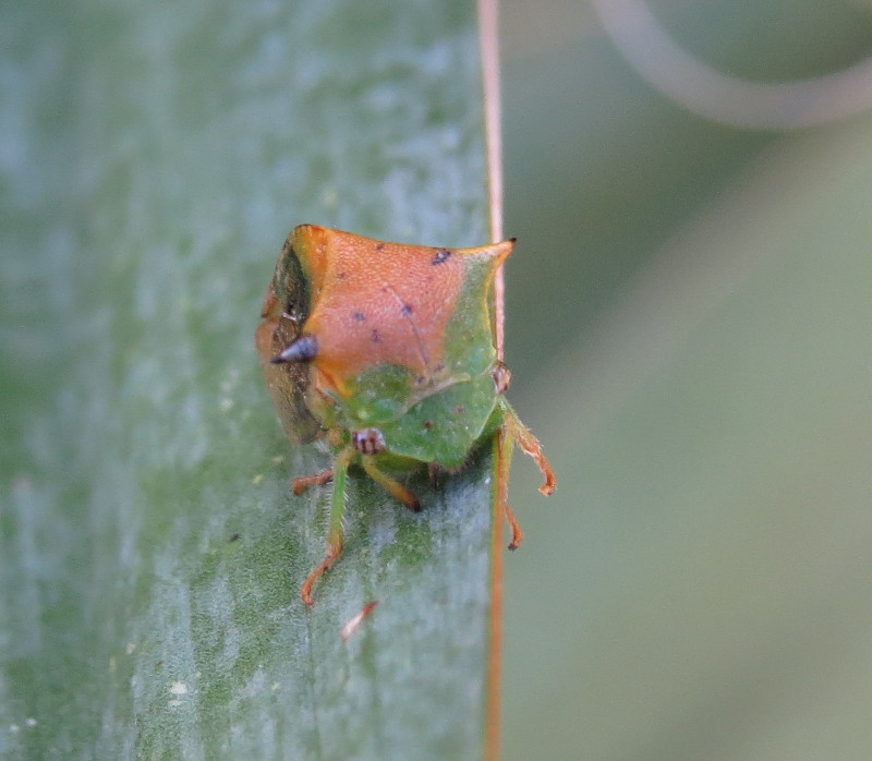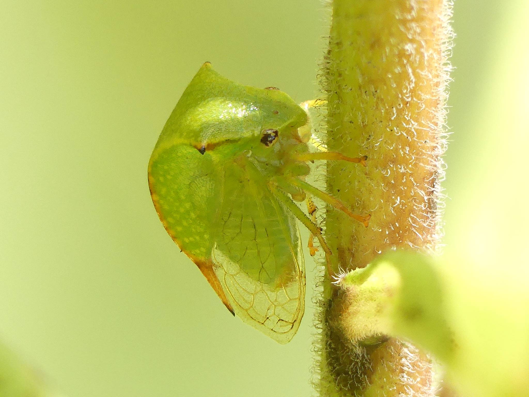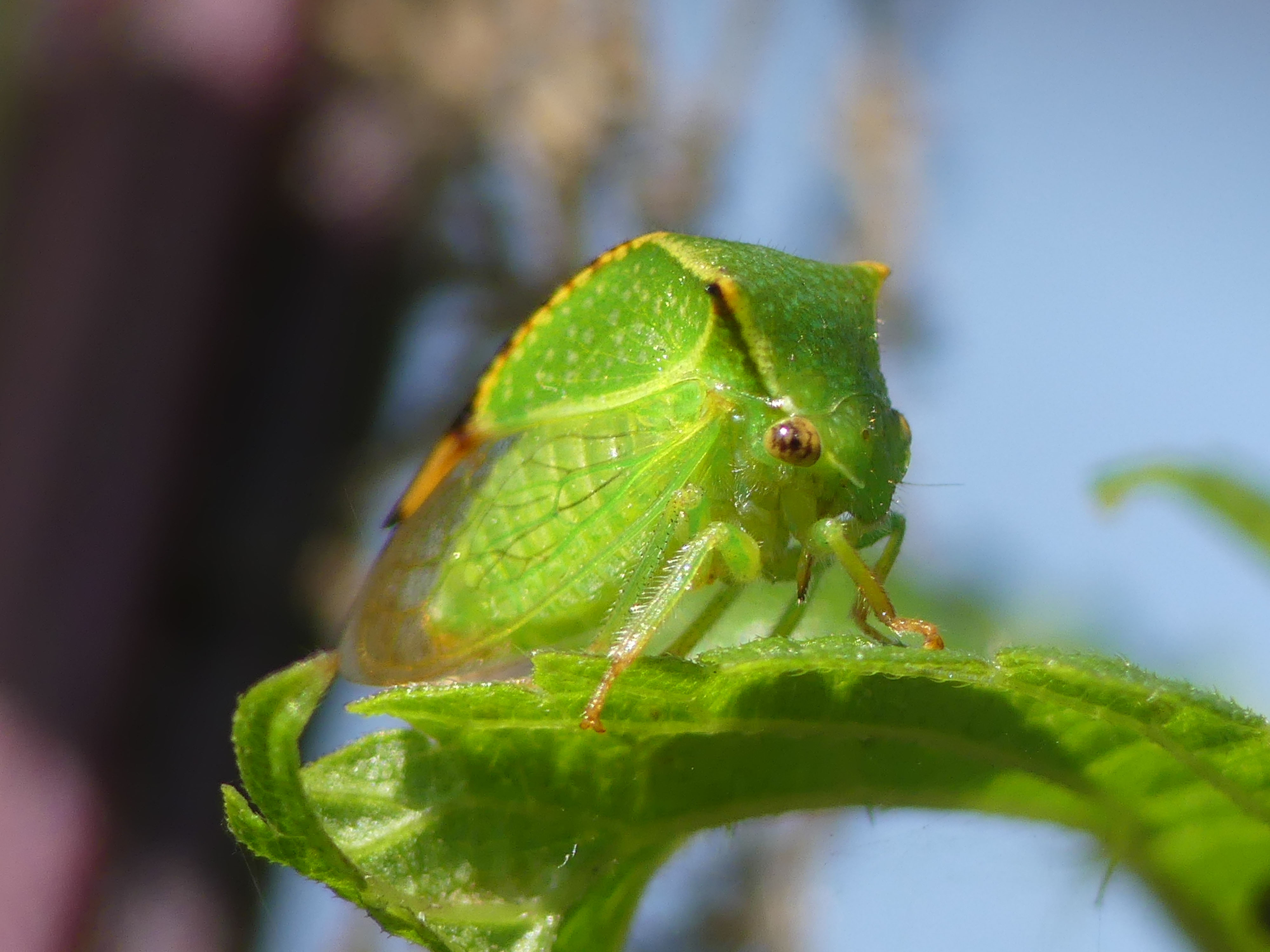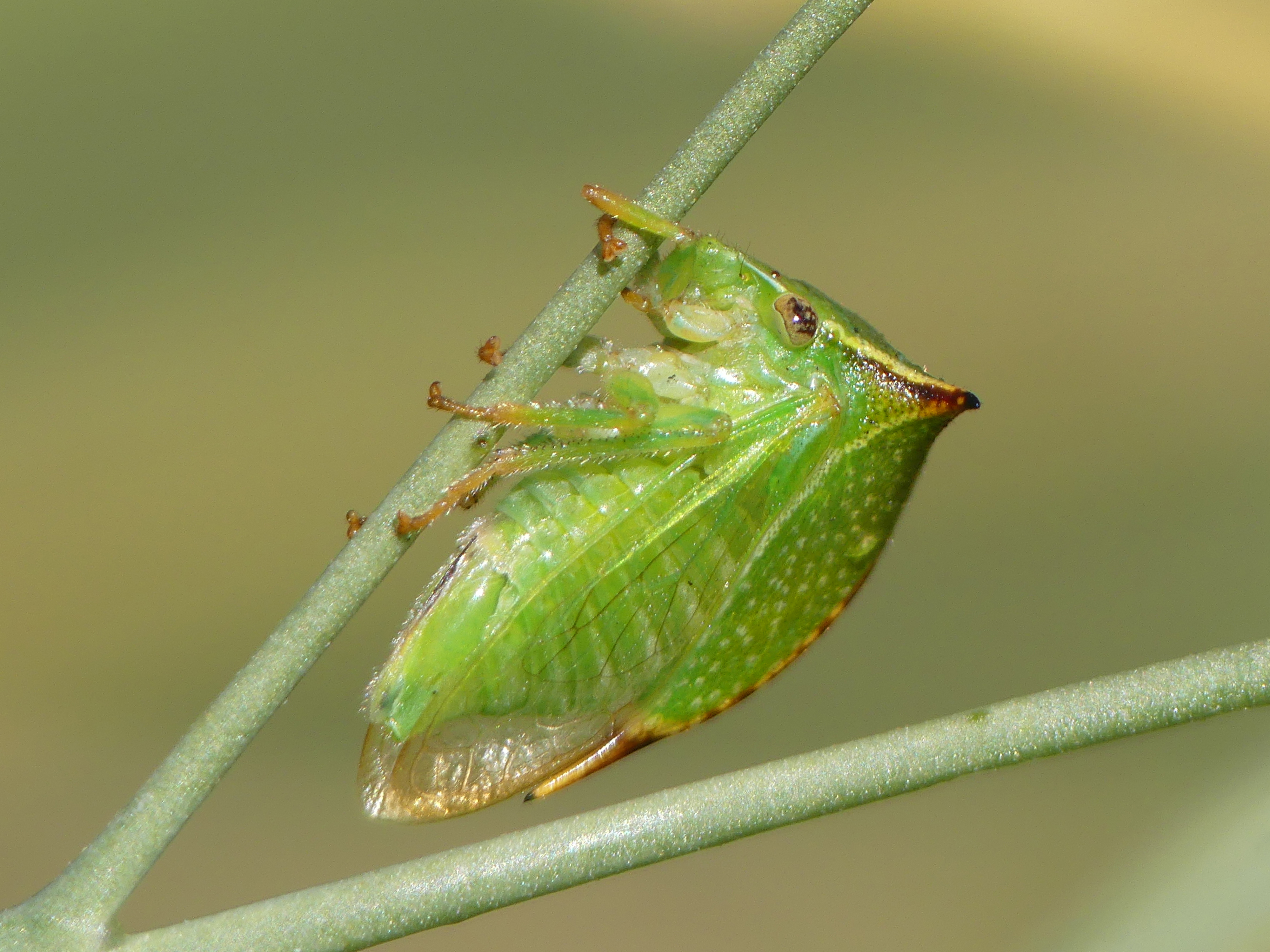 Büffelzikade, Stictocephala bisonia, als Beute einer Spinne auf einem Himbeerstrauch, Leipzig, Ortsteil Thekla, Sep. 2012