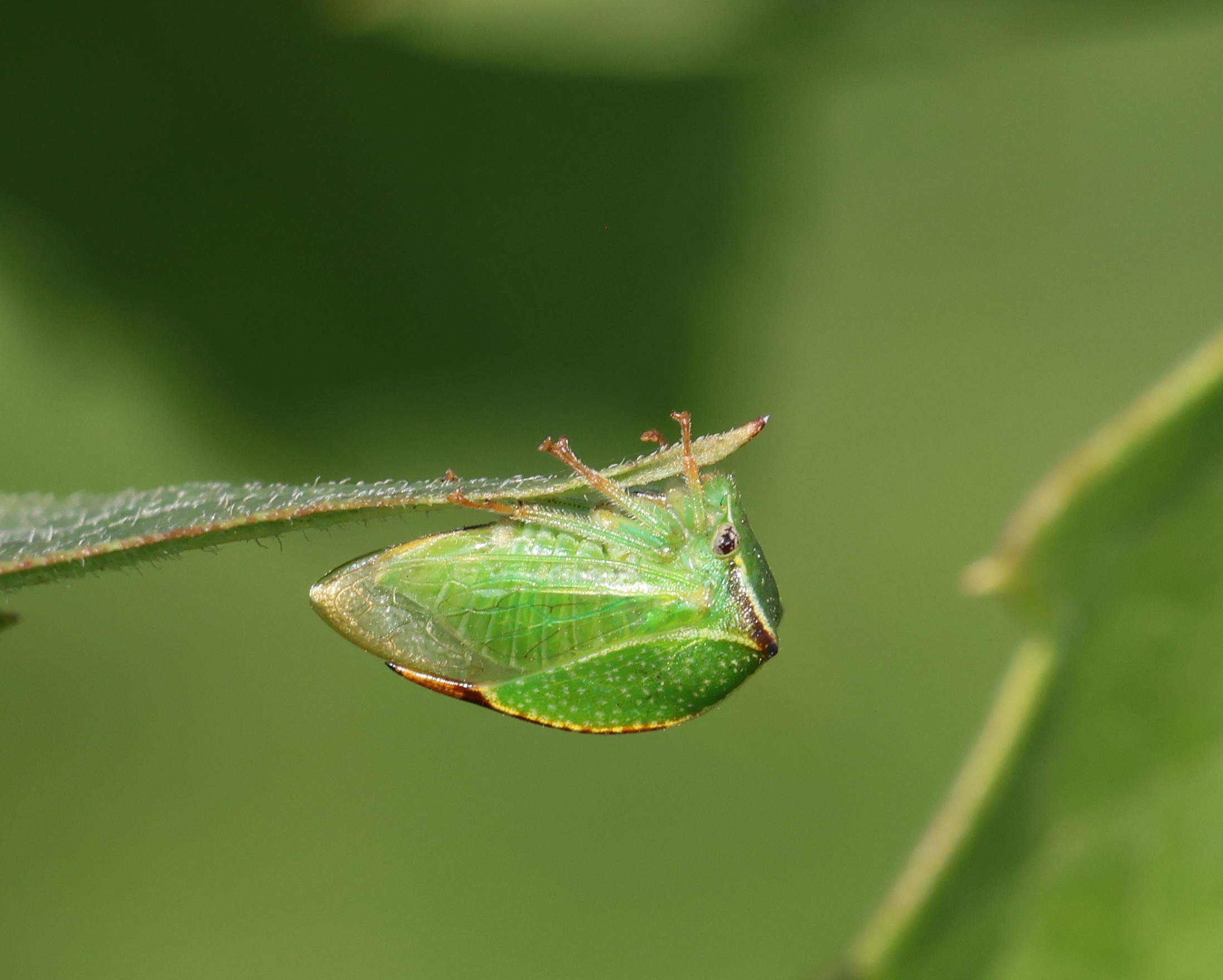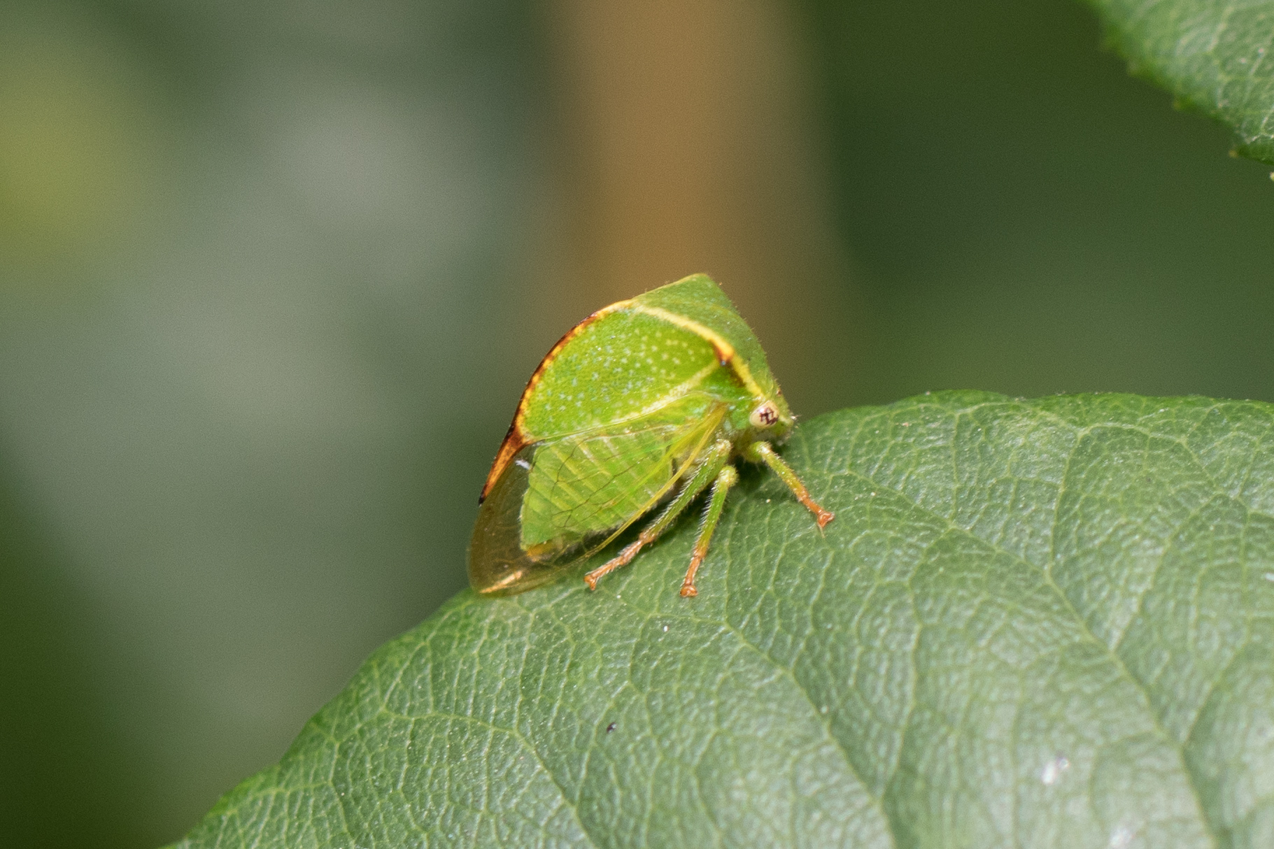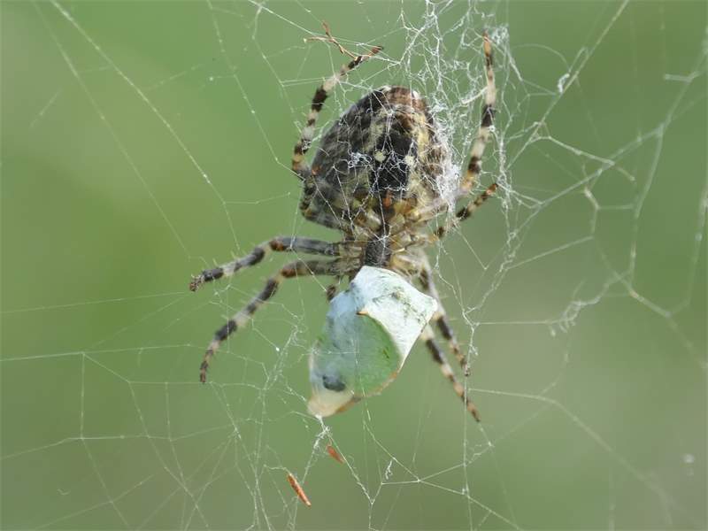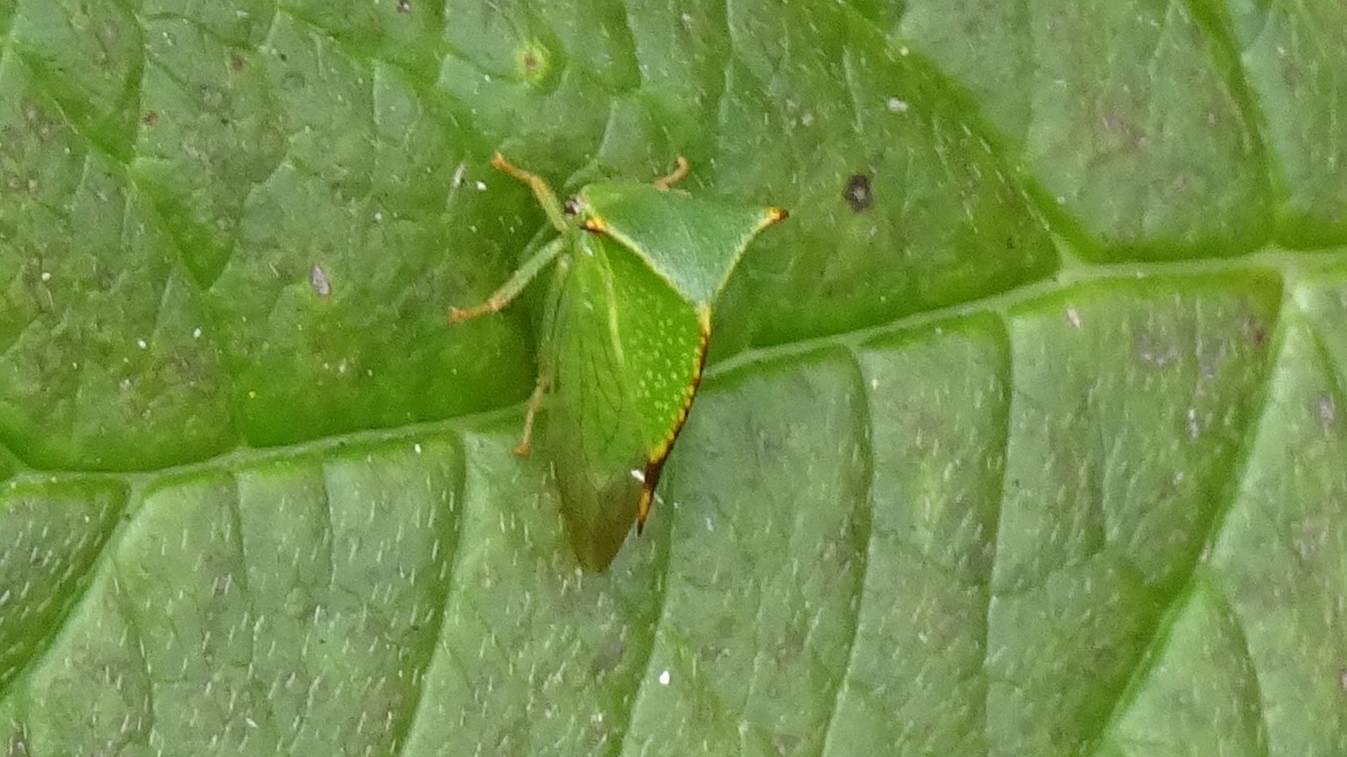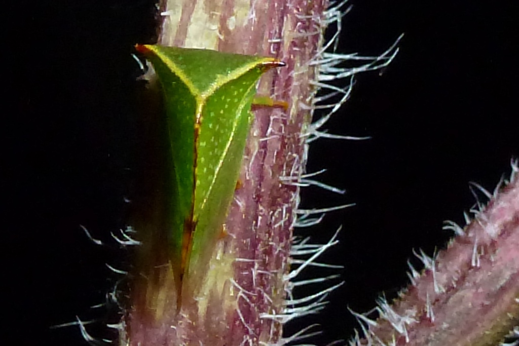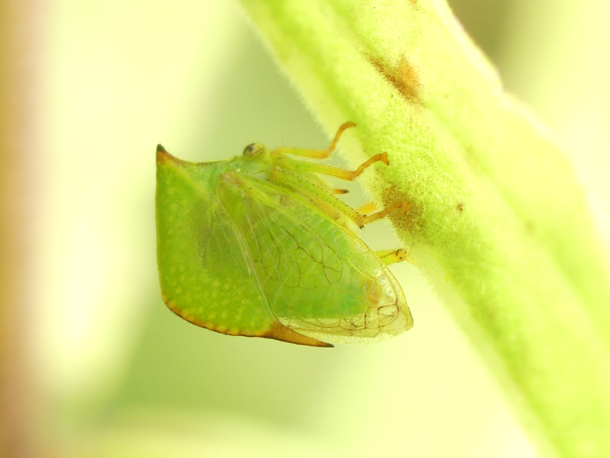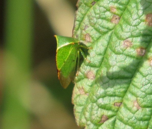 Büffelzikade, Stictocephala bisonia, als Beute einer Spinne auf einem Himbeerstrauch, Leipzig, Ortsteil Thekla, Sep. 2012
