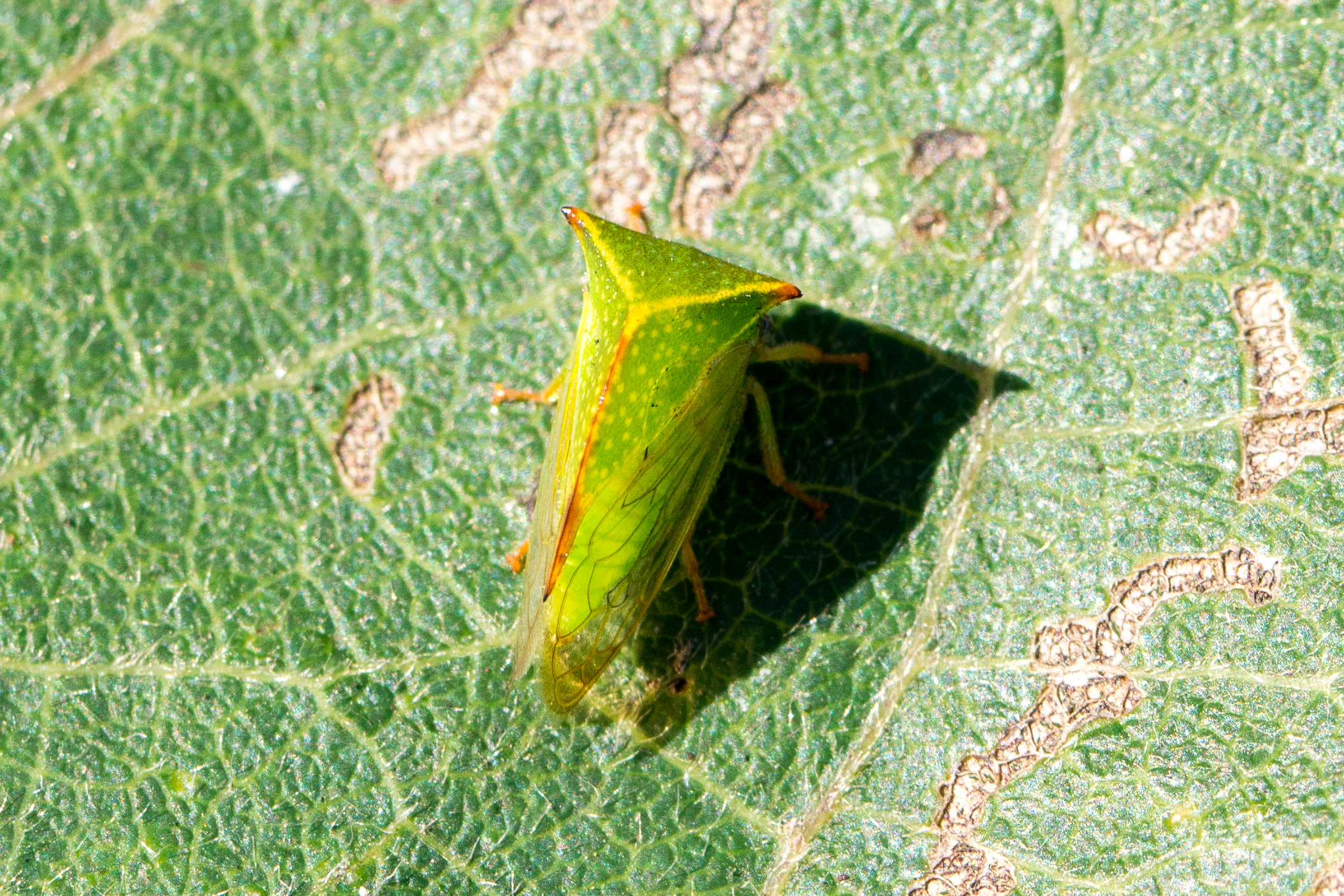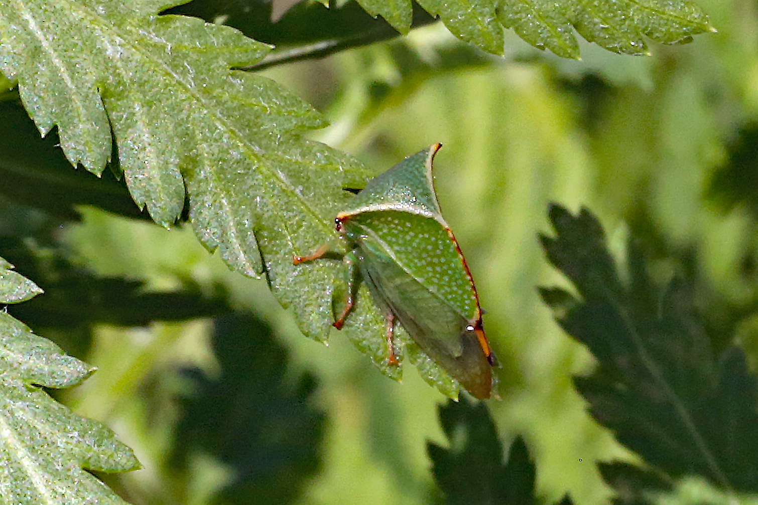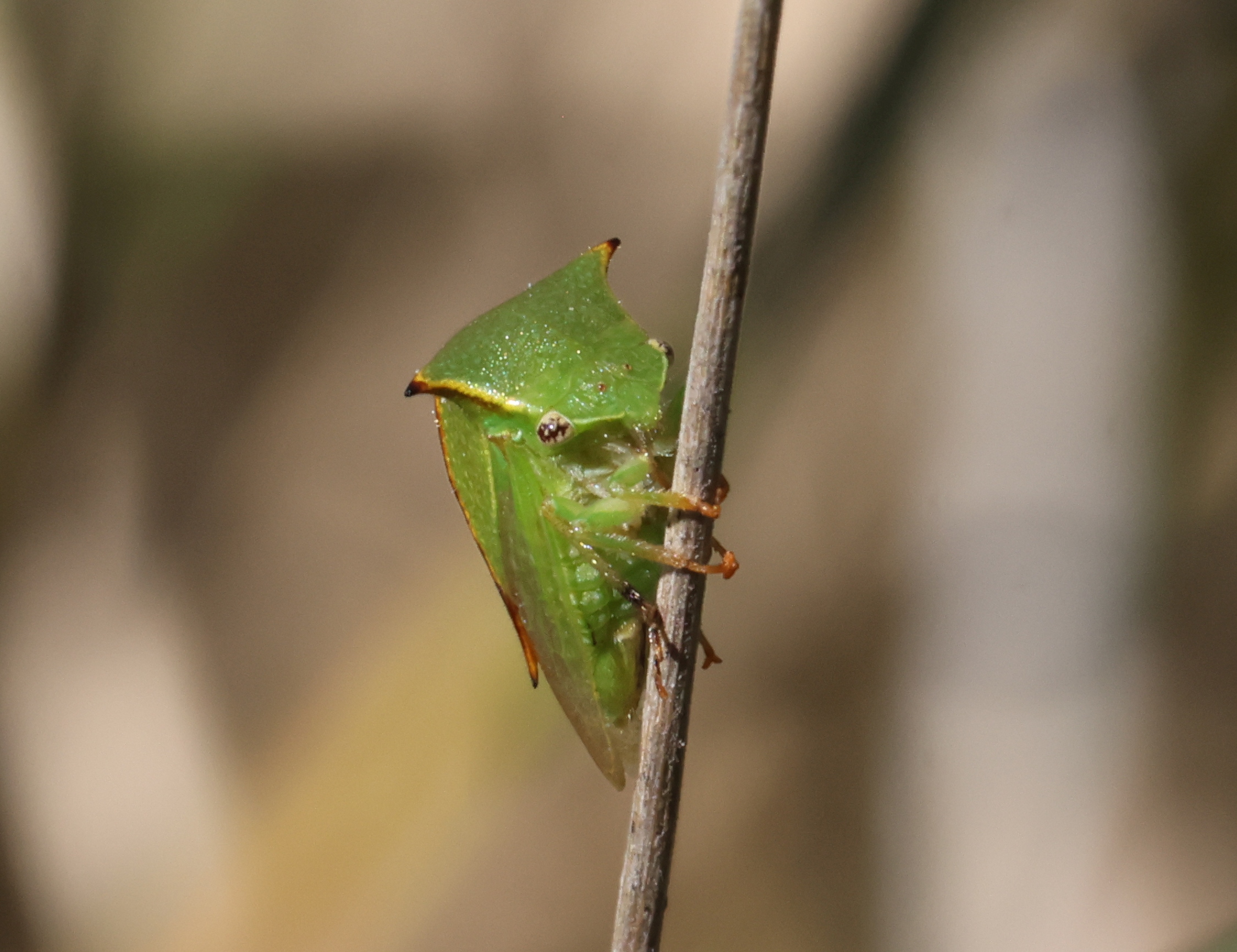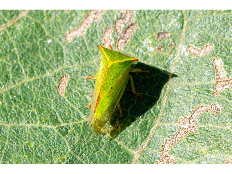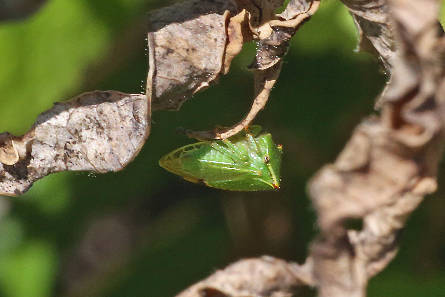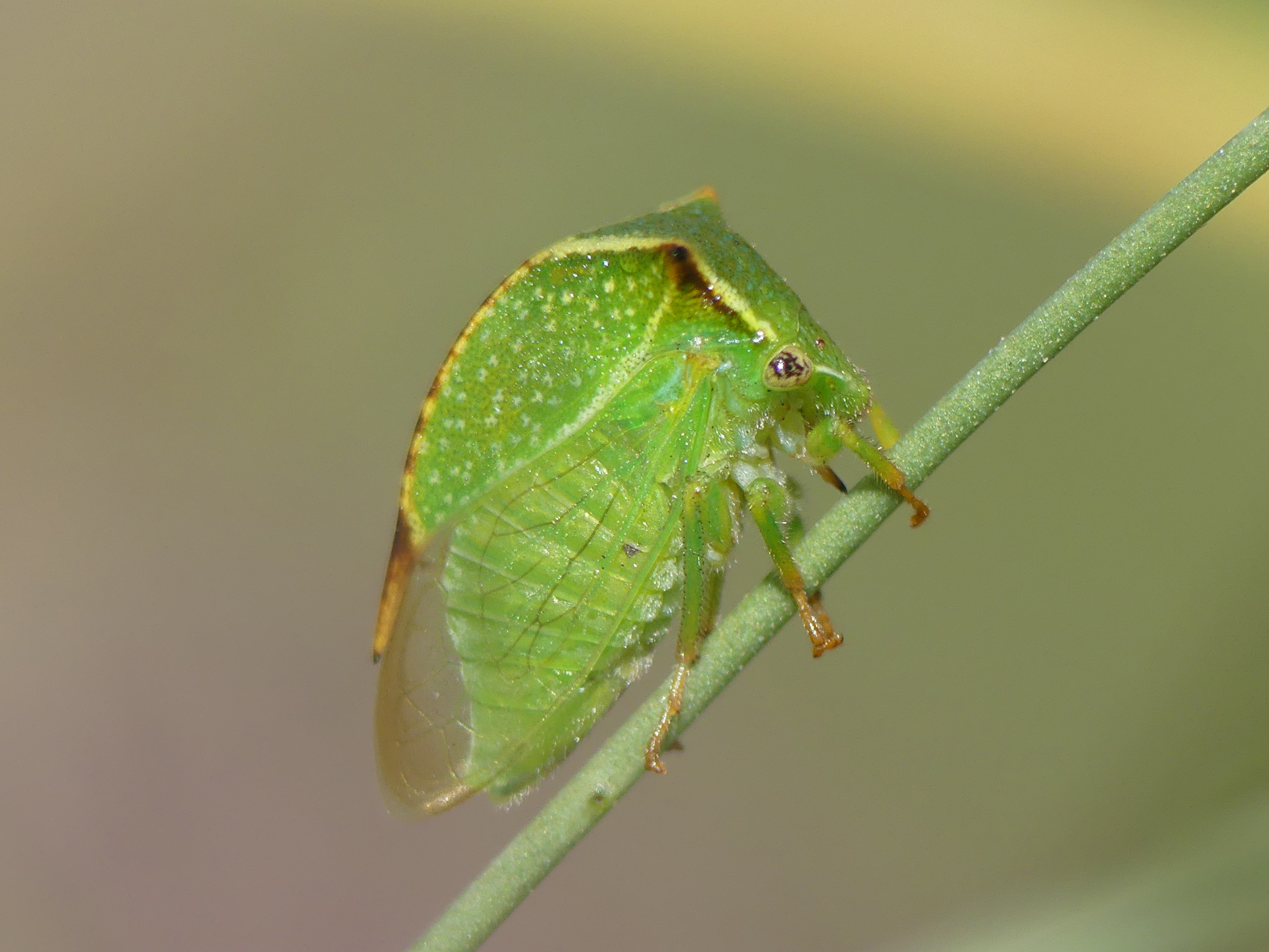 Büffelzikade, Stictocephala bisonia, als Beute einer Spinne auf einem Himbeerstrauch, Leipzig, Ortsteil Thekla, Sep. 2012