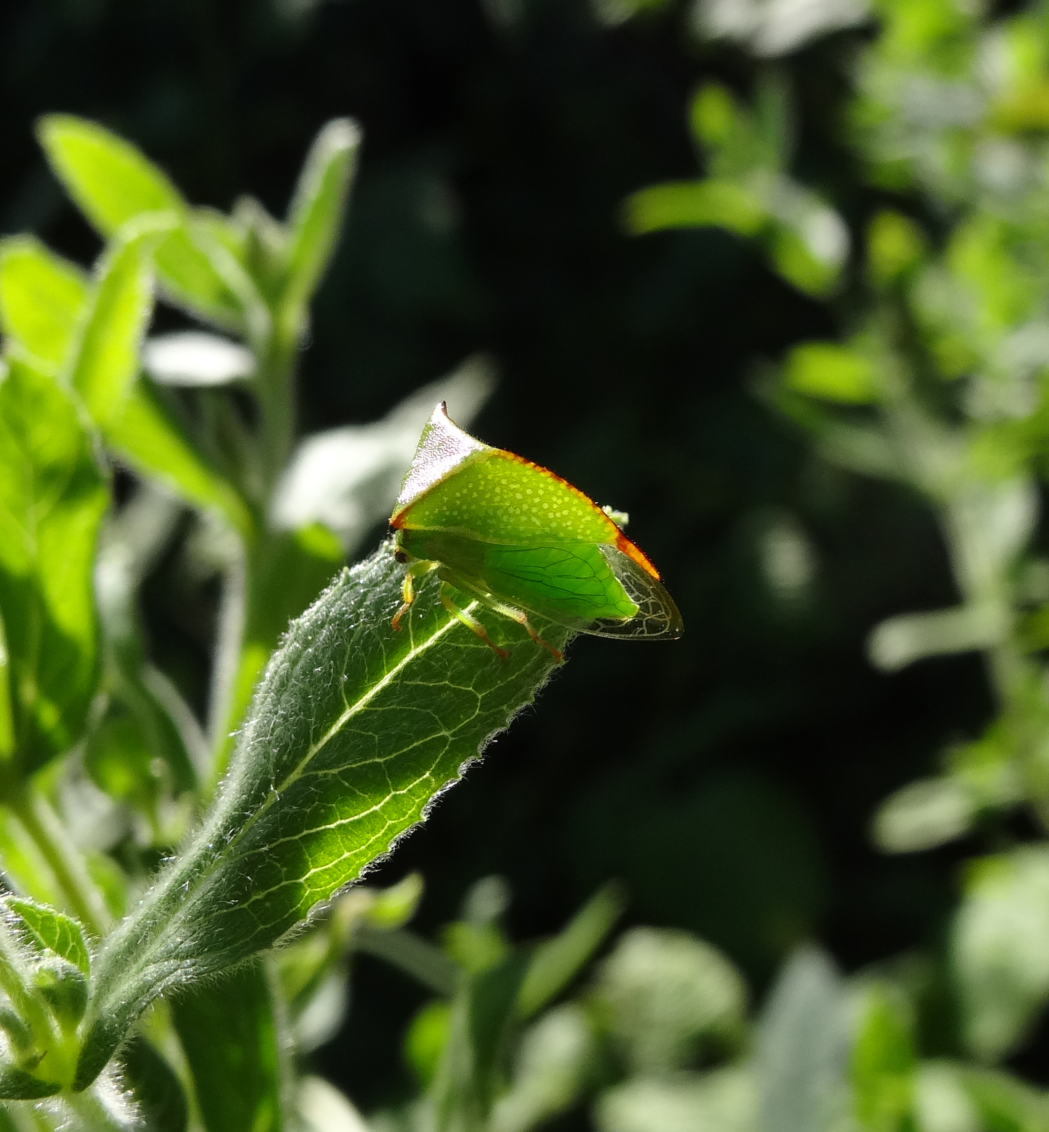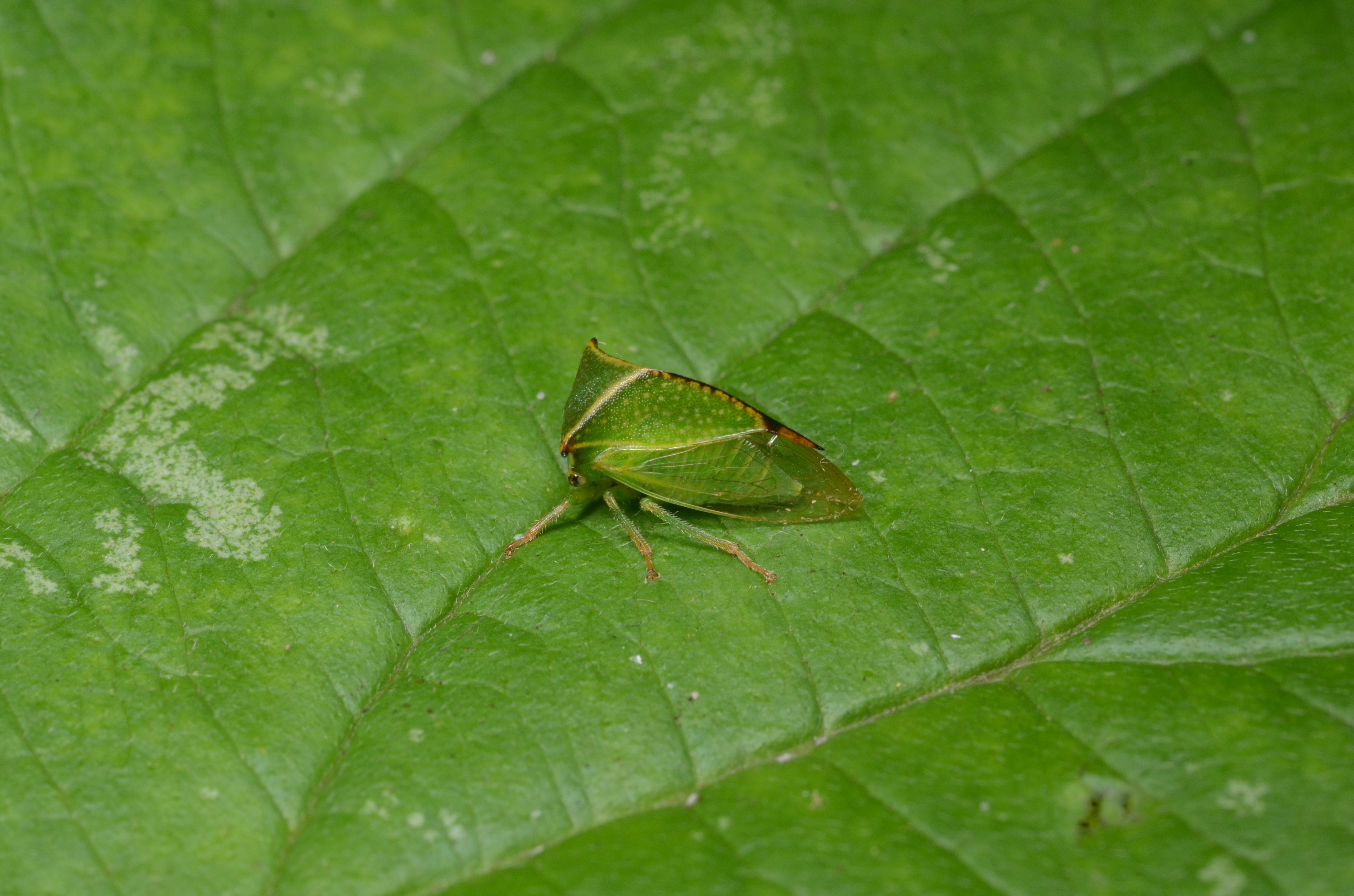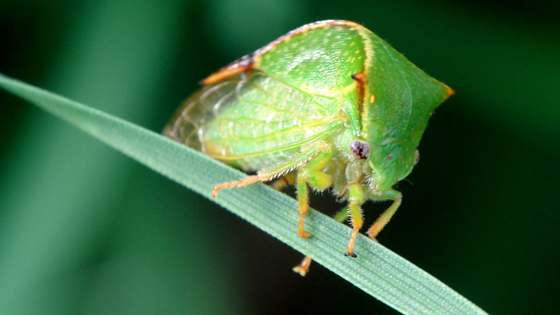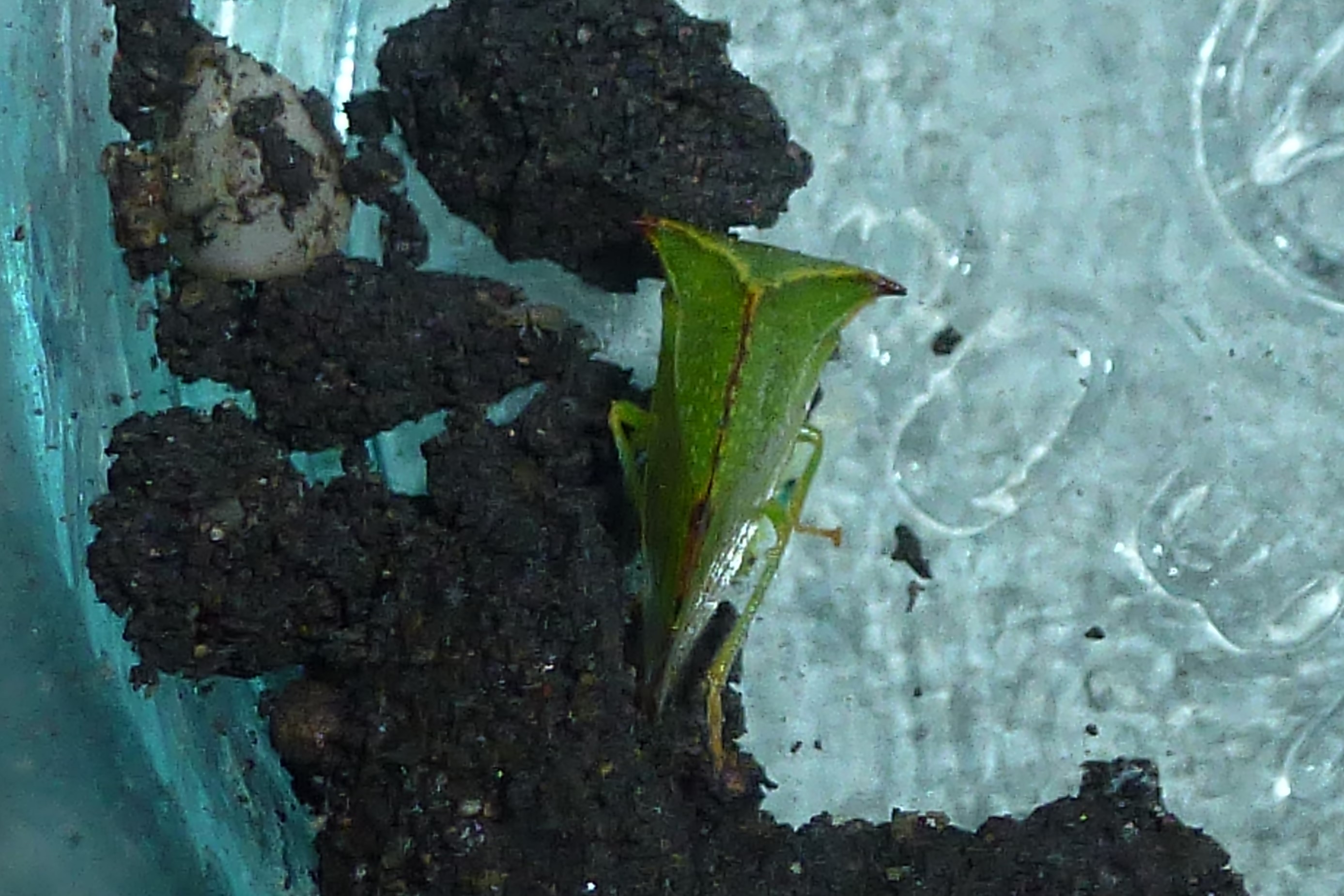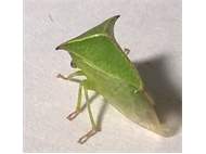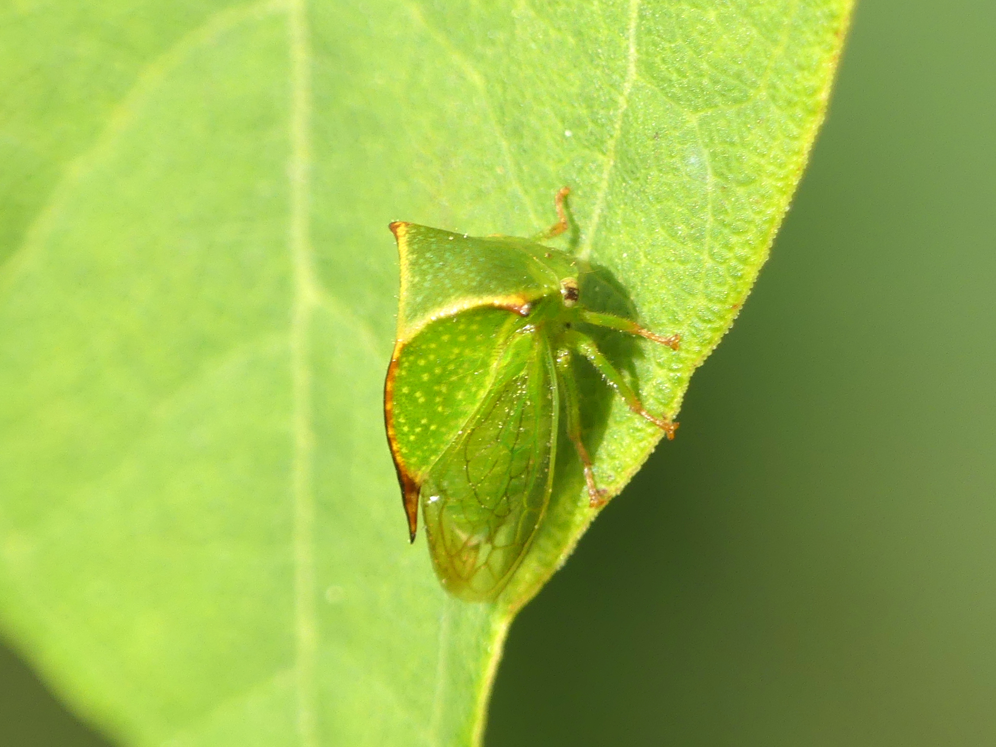 Büffelzikade, Stictocephala bisonia, als Beute einer Spinne auf einem Himbeerstrauch, Leipzig, Ortsteil Thekla, Sep. 2012