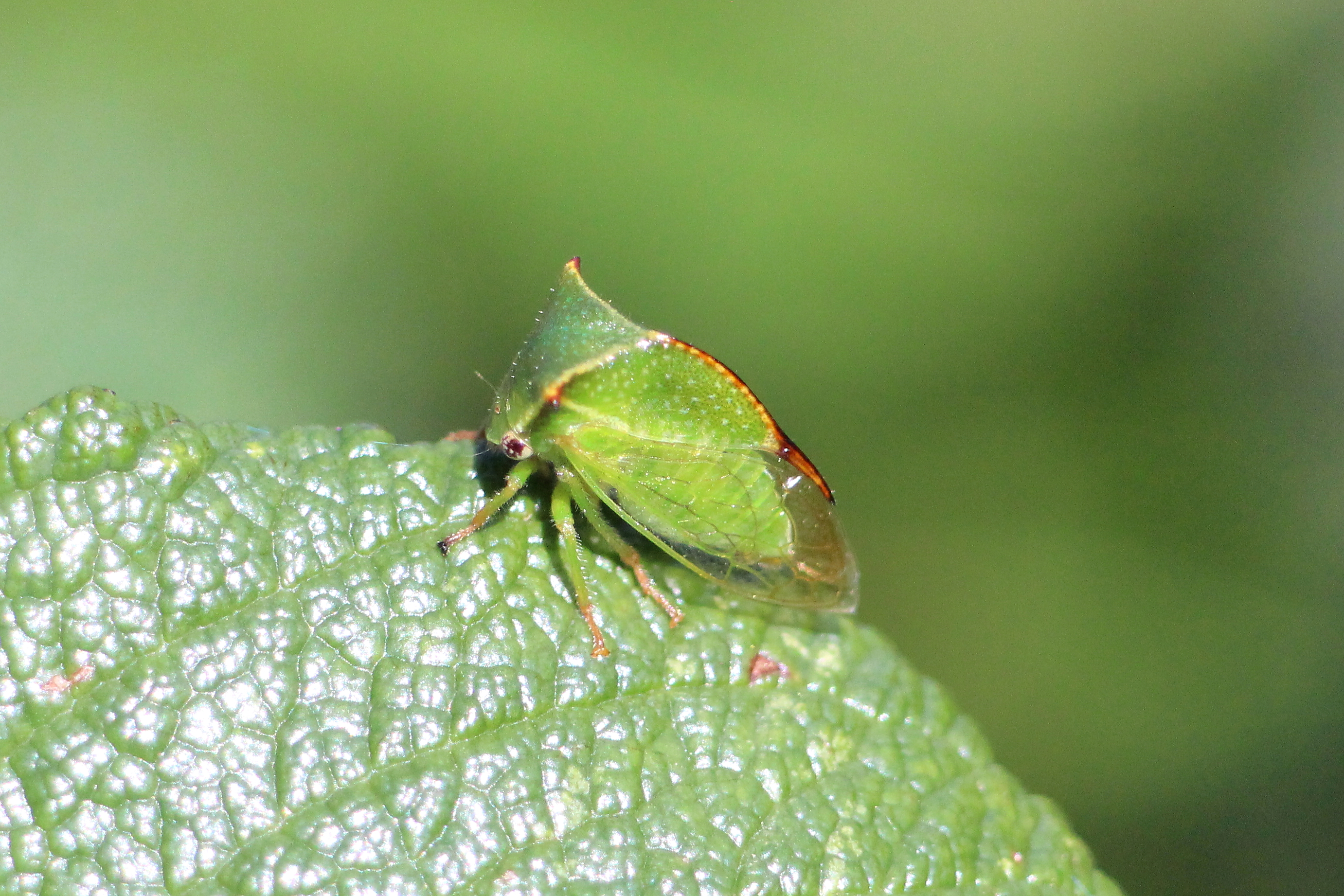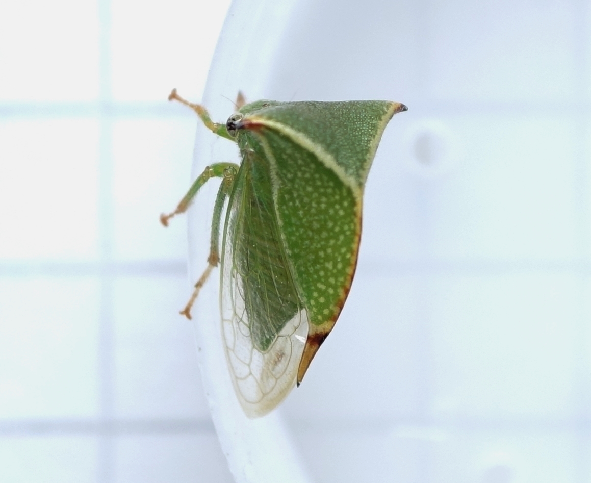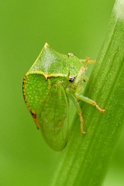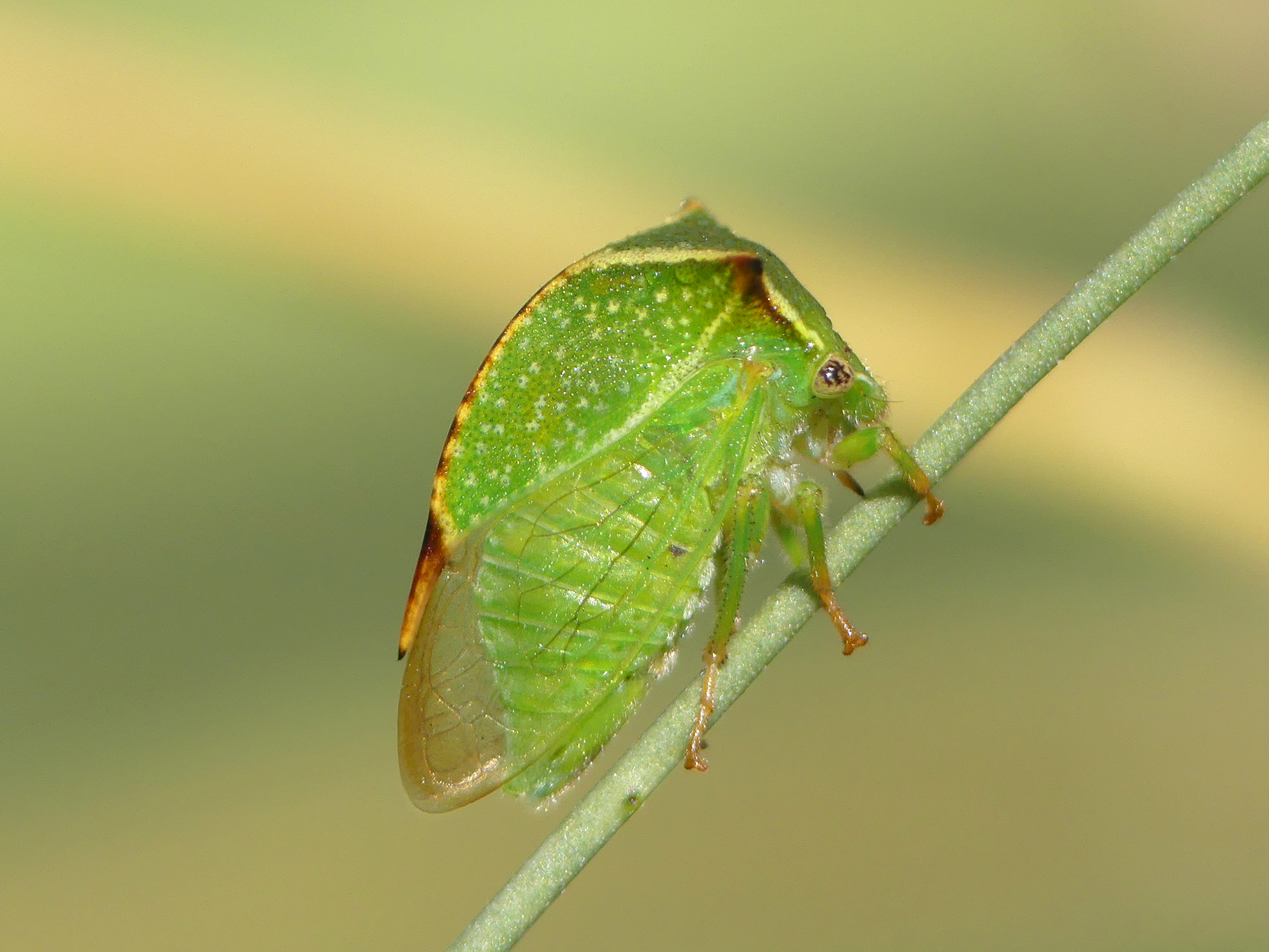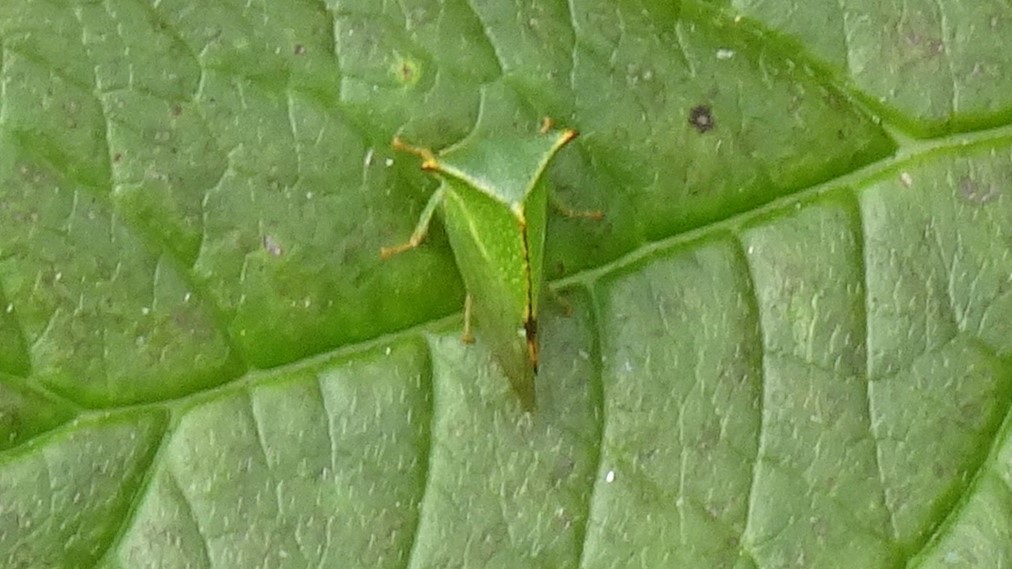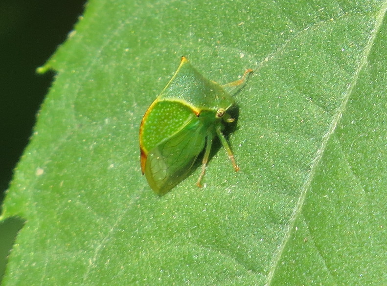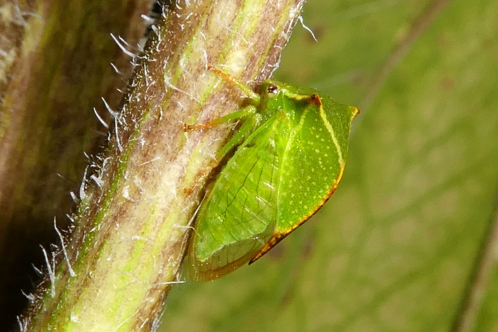 Büffelzikade, Stictocephala bisonia, als Beute einer Spinne auf einem Himbeerstrauch, Leipzig, Ortsteil Thekla, Sep. 2012