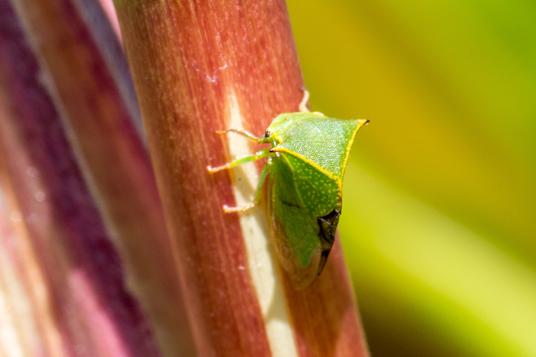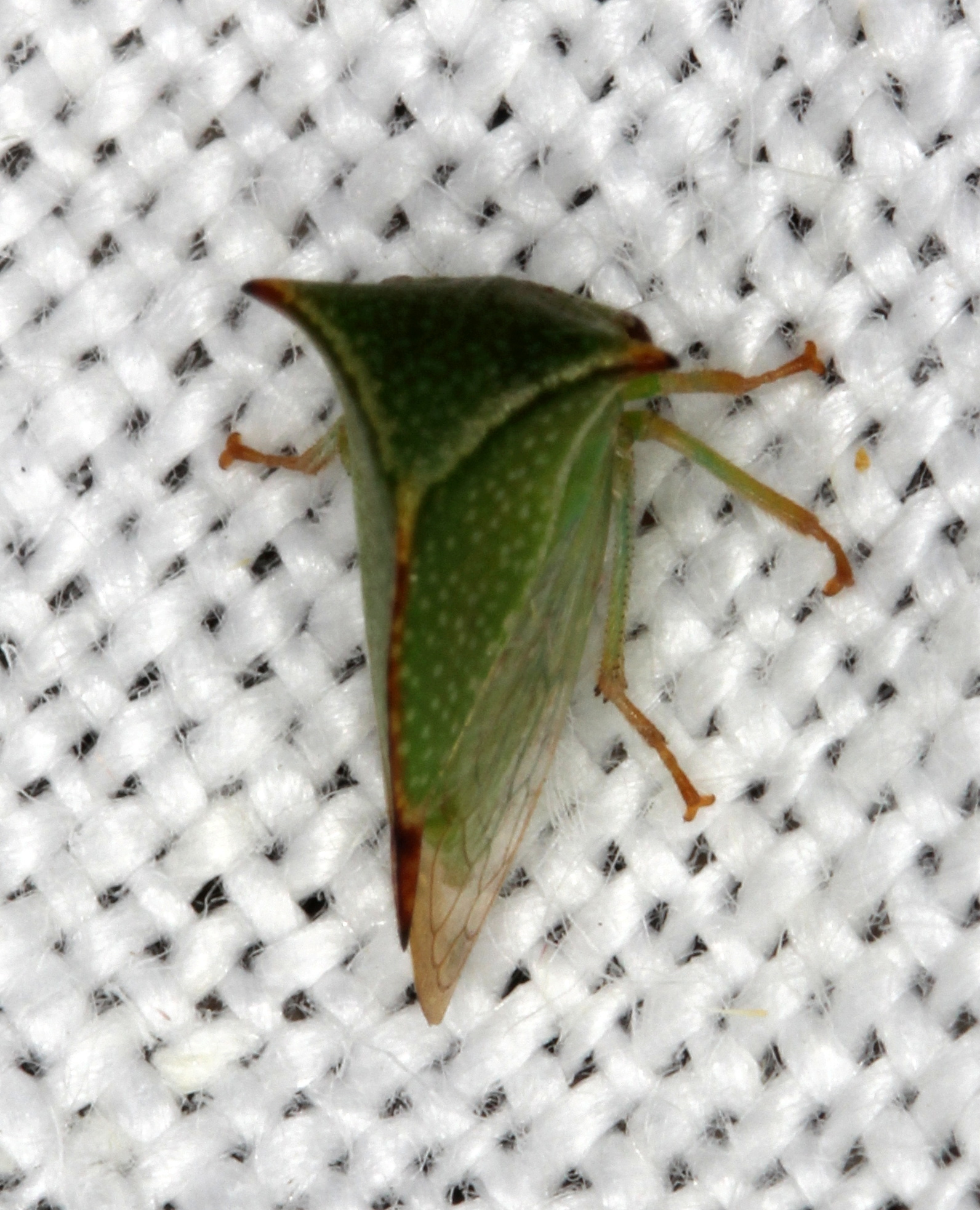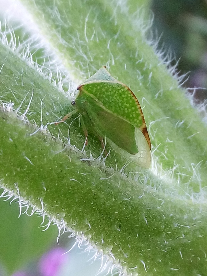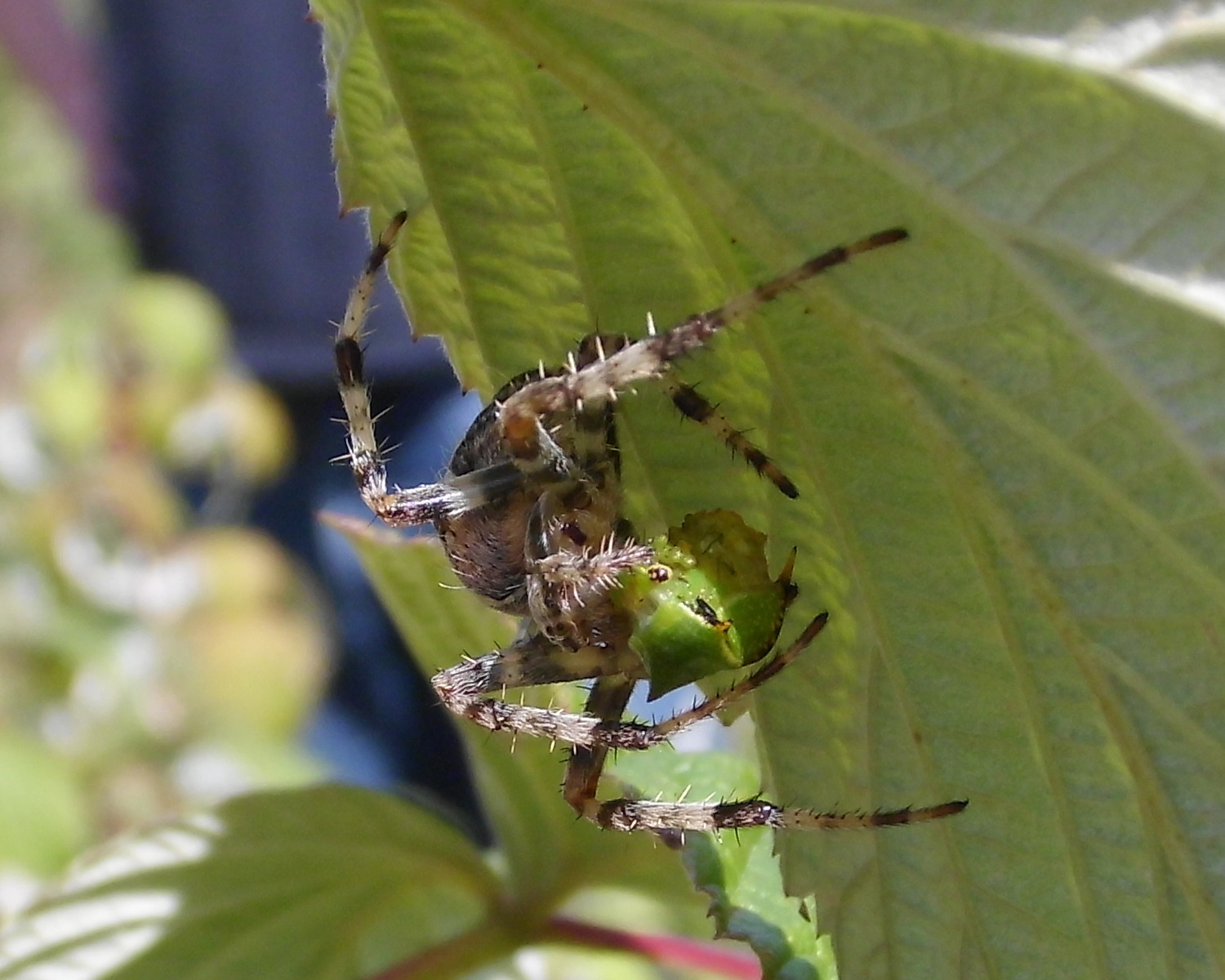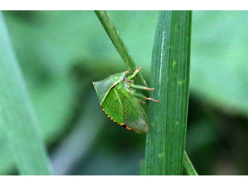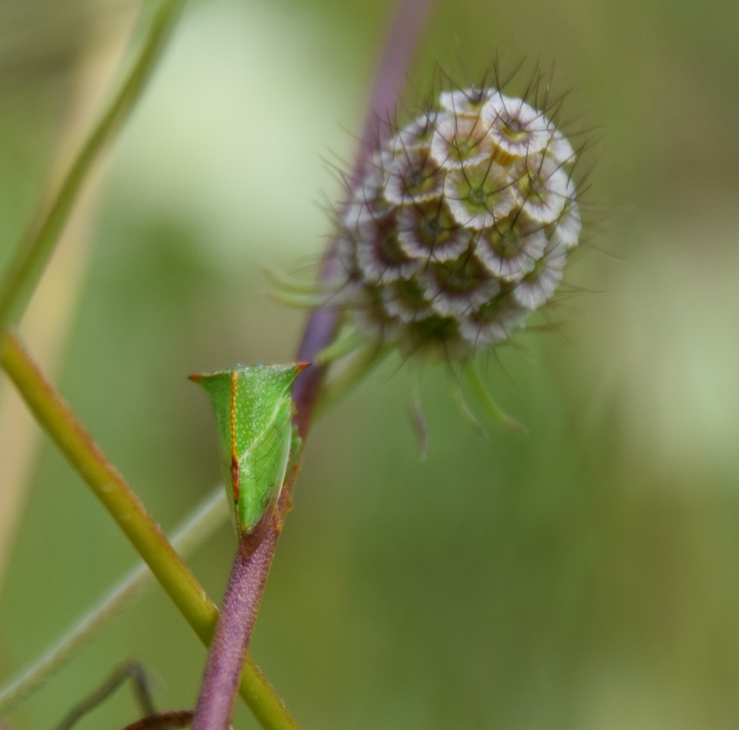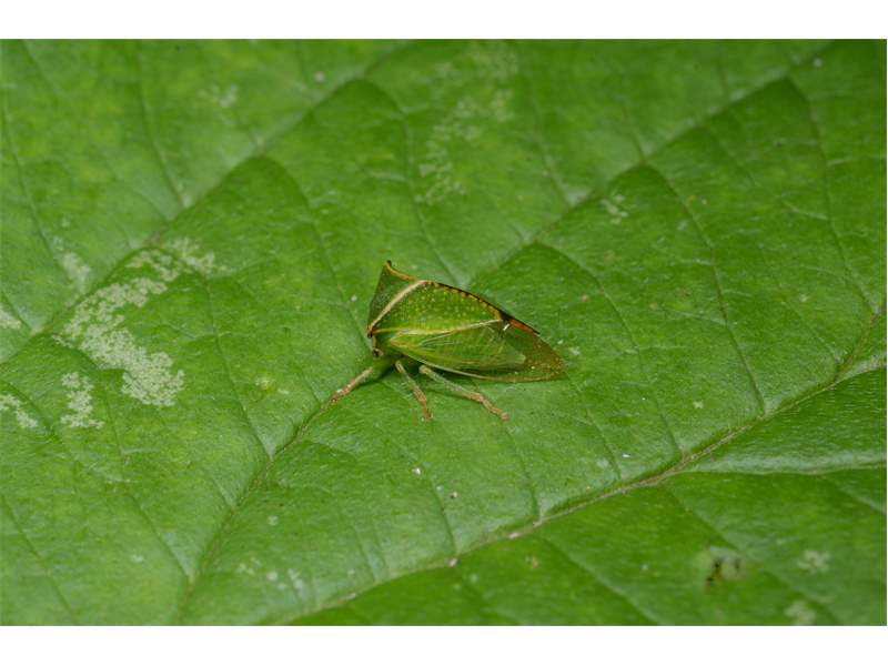 Büffelzikade, Stictocephala bisonia, als Beute einer Spinne auf einem Himbeerstrauch, Leipzig, Ortsteil Thekla, Sep. 2012