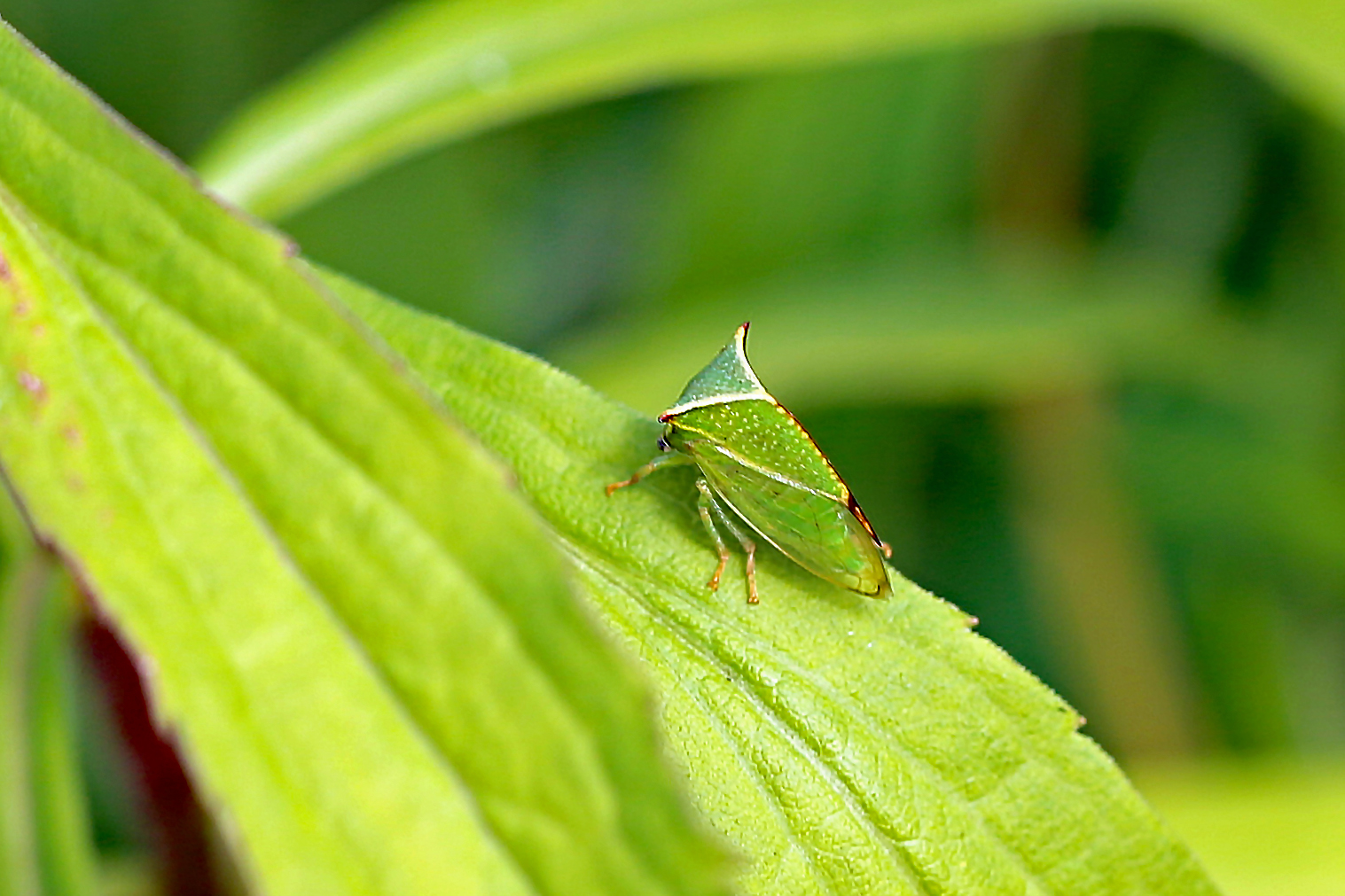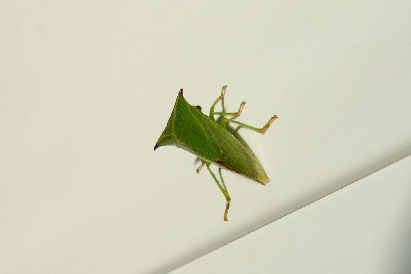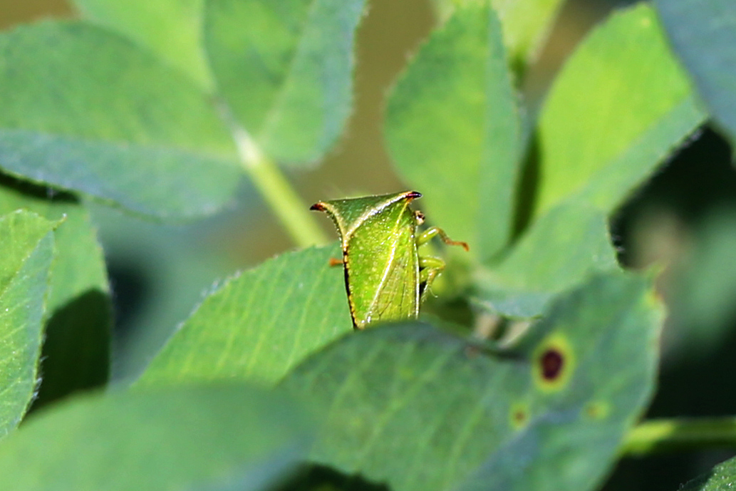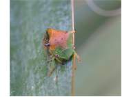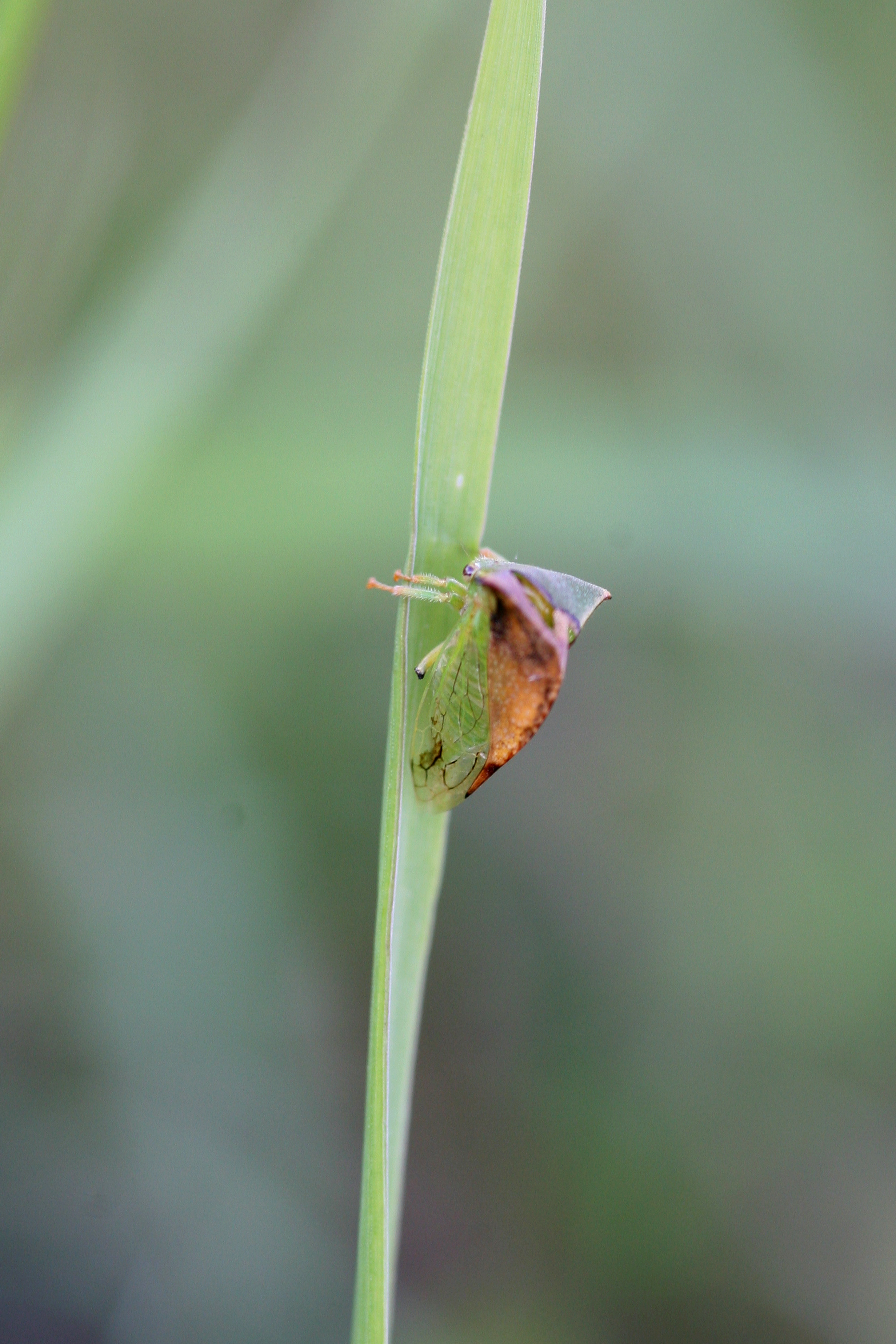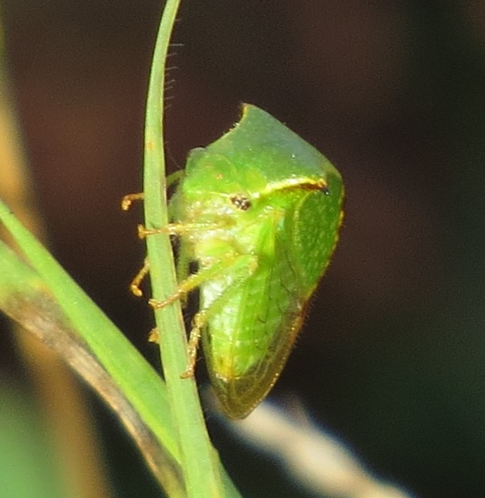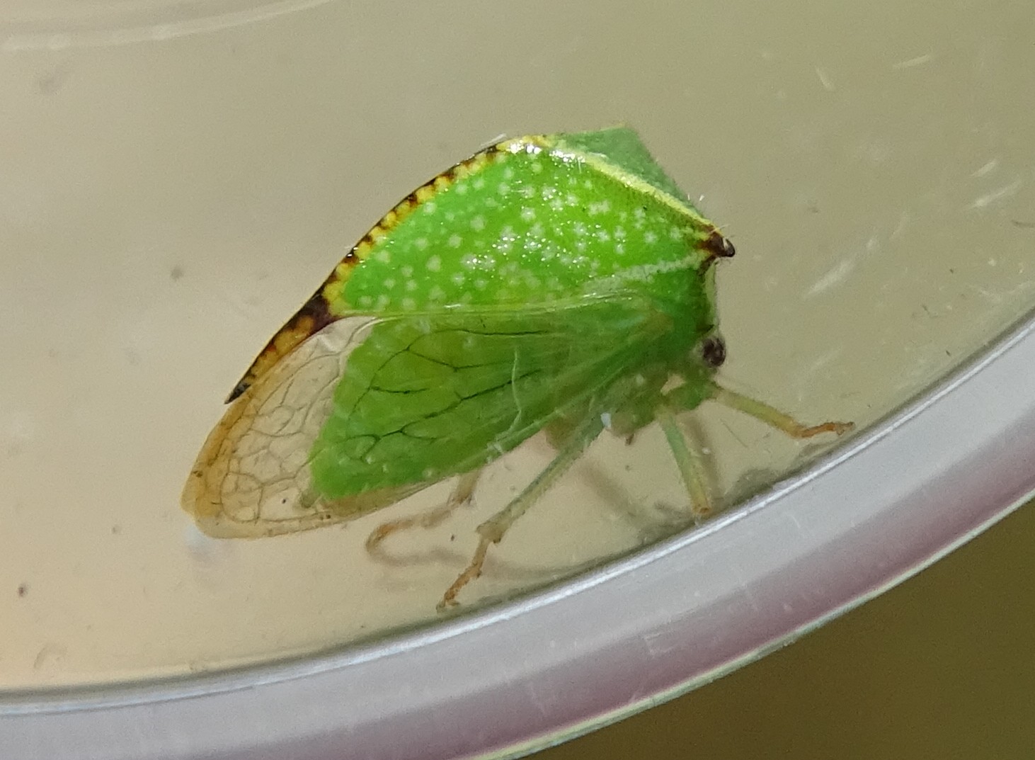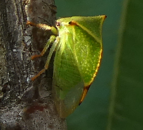Büffelzikade, Stictocephala bisonia, als Beute einer Spinne auf einem Himbeerstrauch, Leipzig, Ortsteil Thekla, Sep. 2012