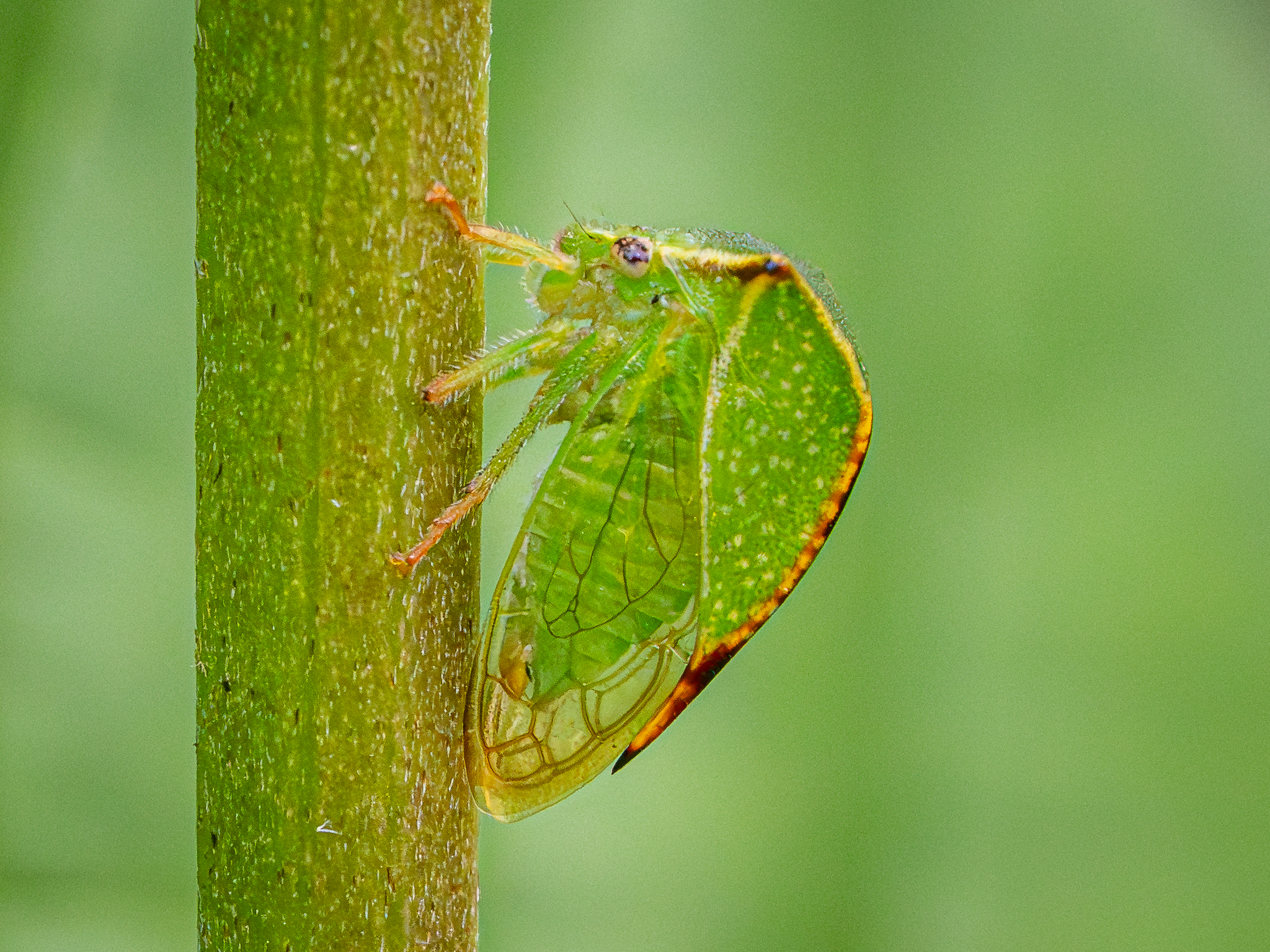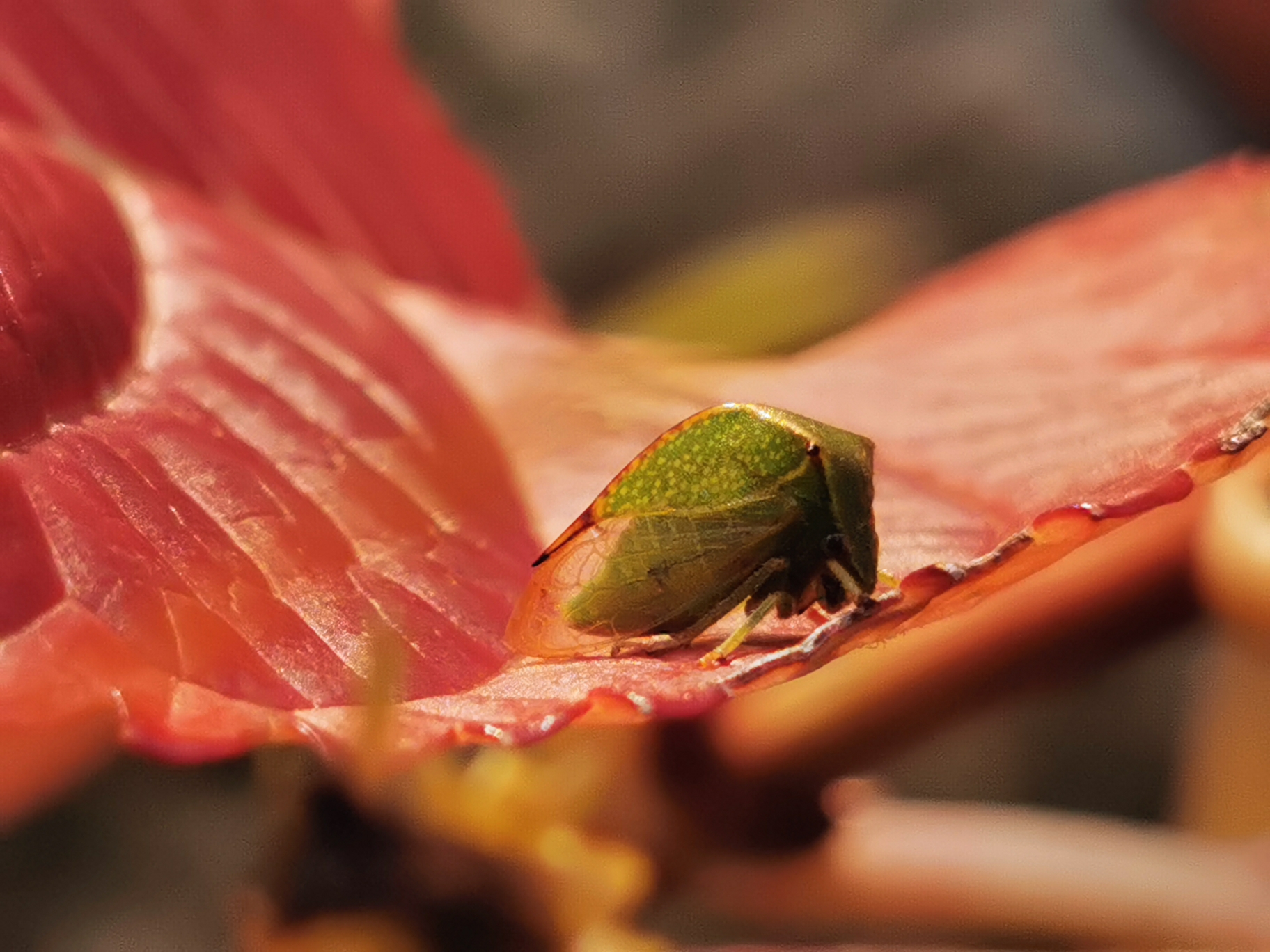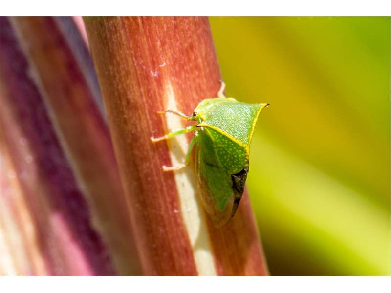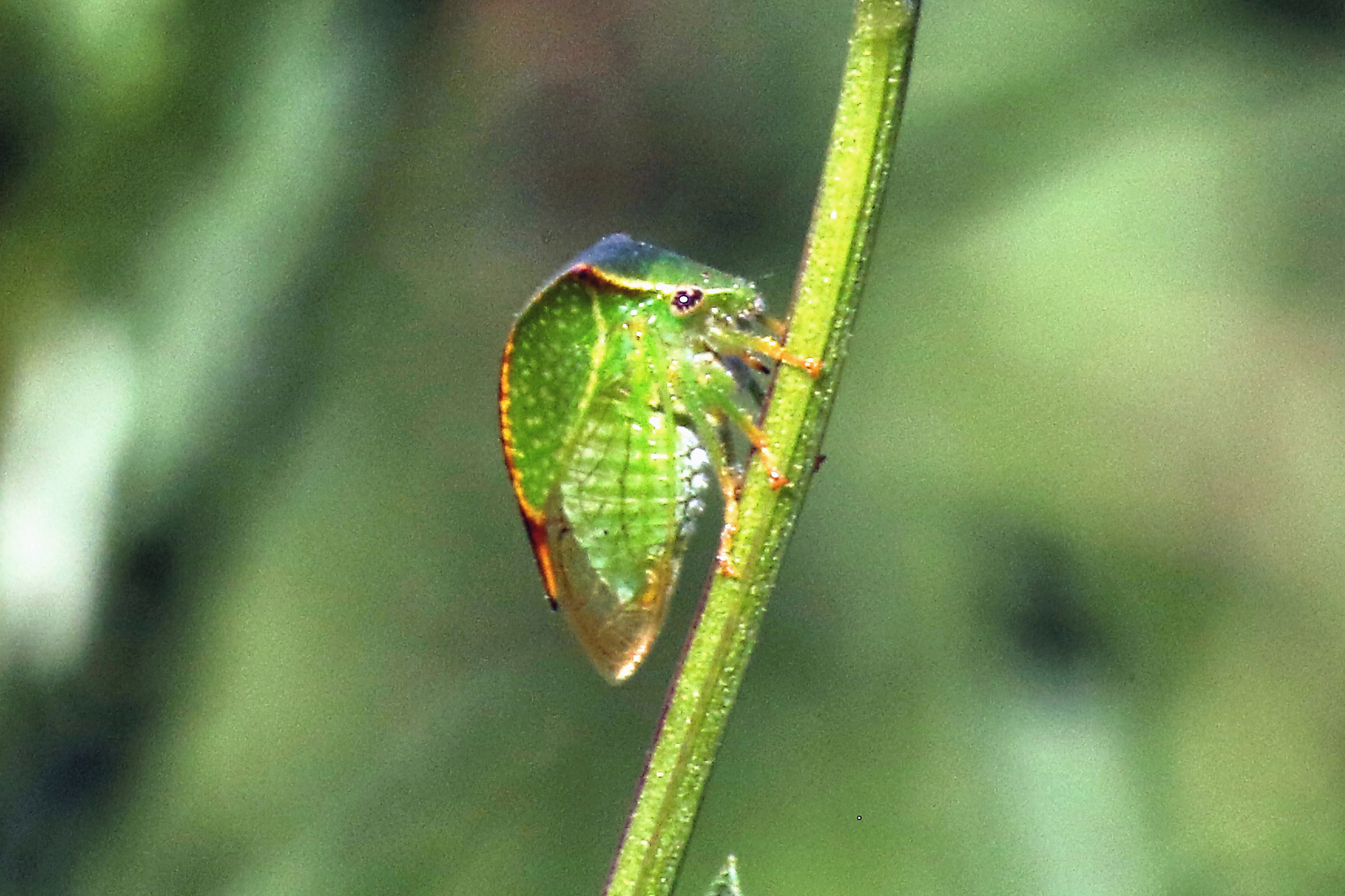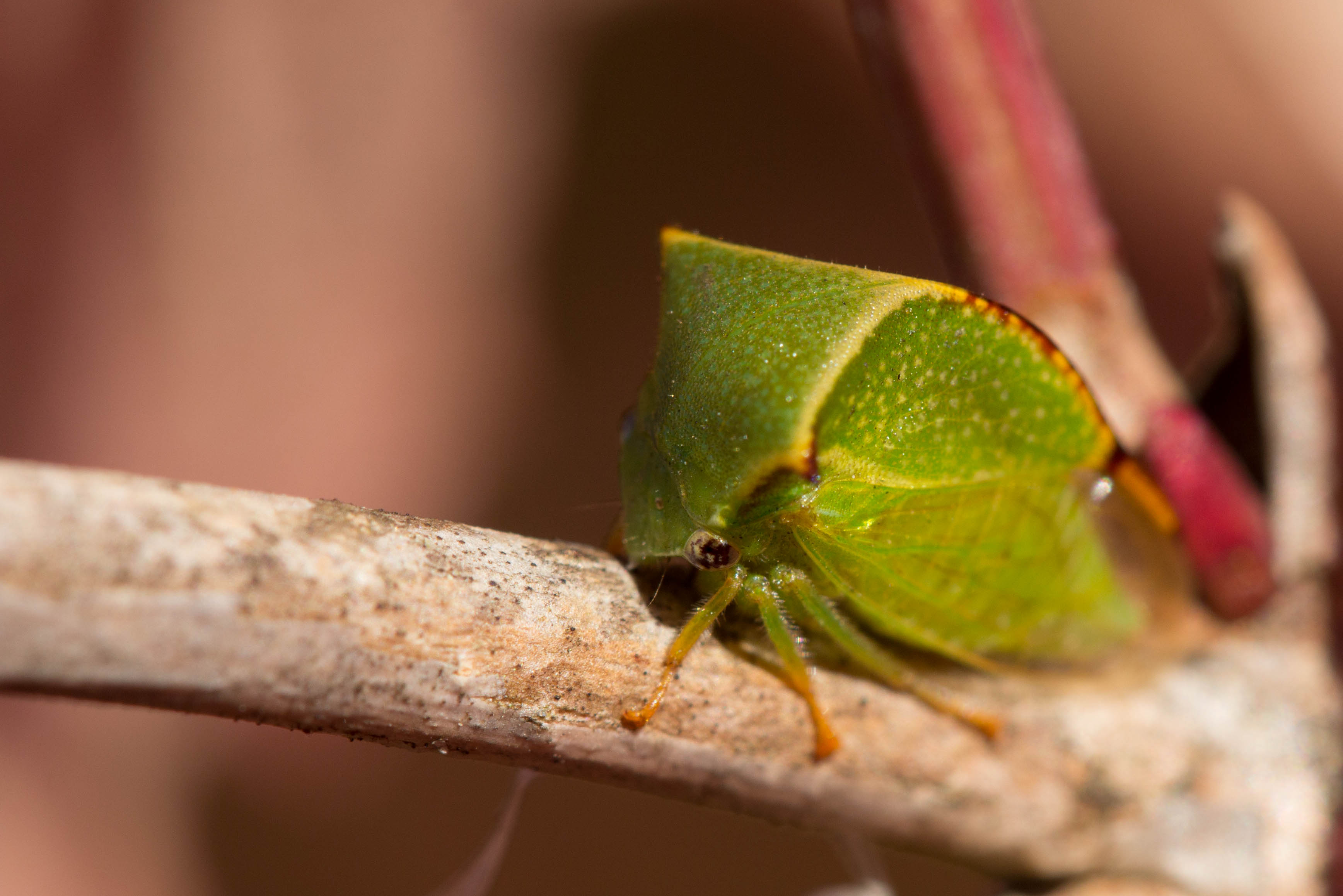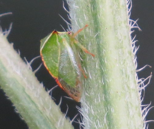 Büffelzikade, Stictocephala bisonia, als Beute einer Spinne auf einem Himbeerstrauch, Leipzig, Ortsteil Thekla, Sep. 2012