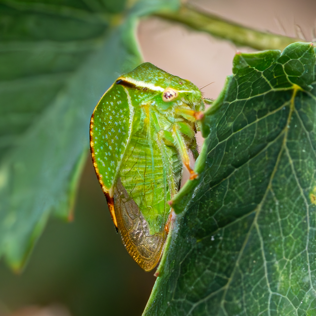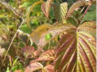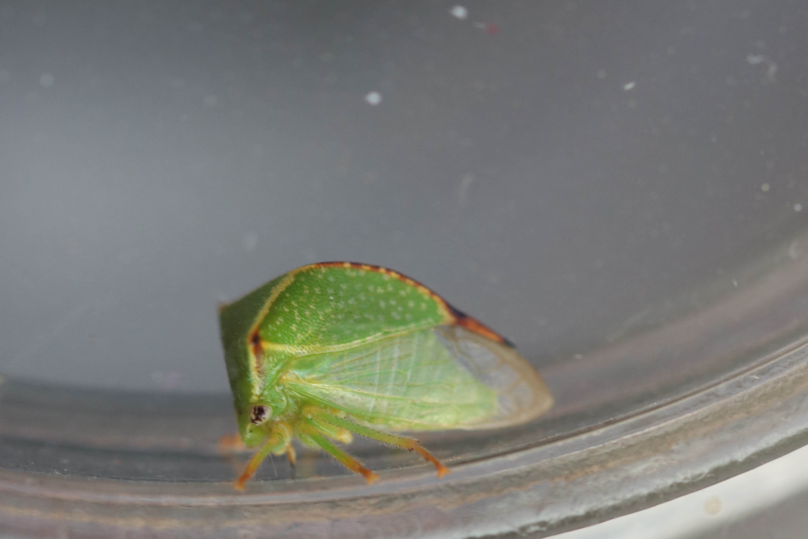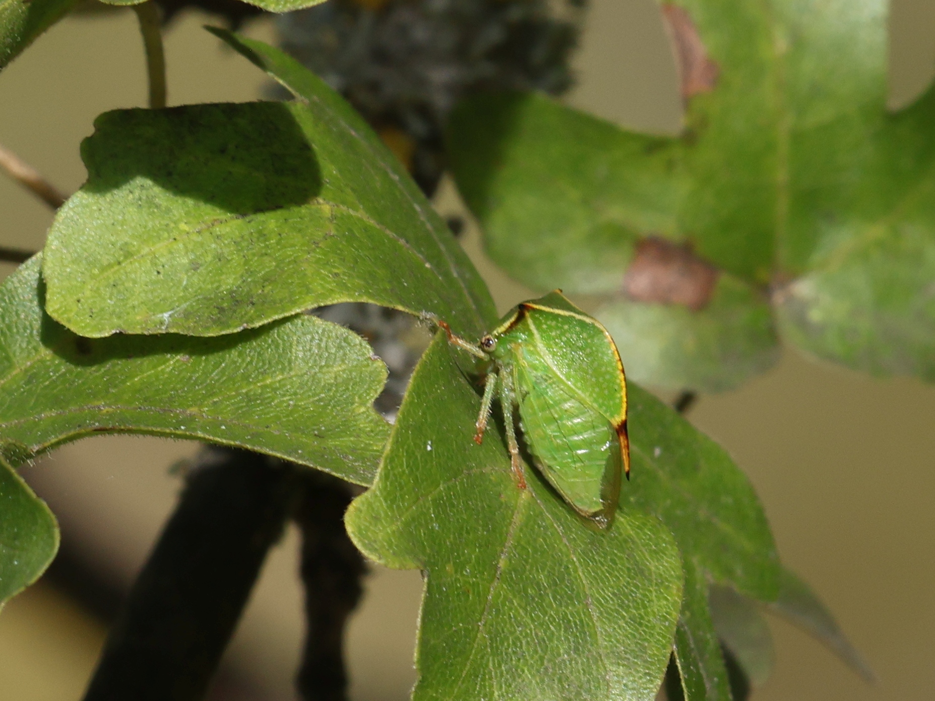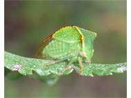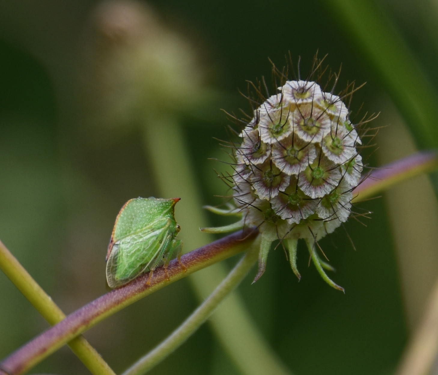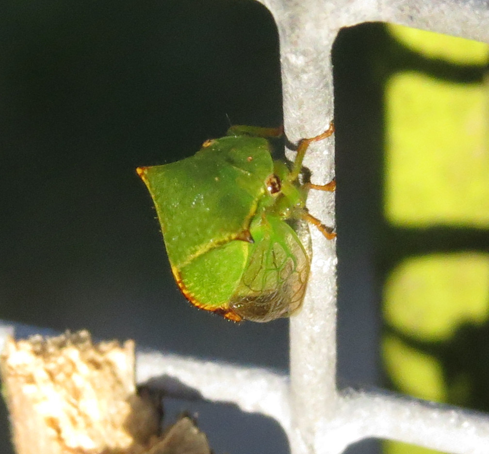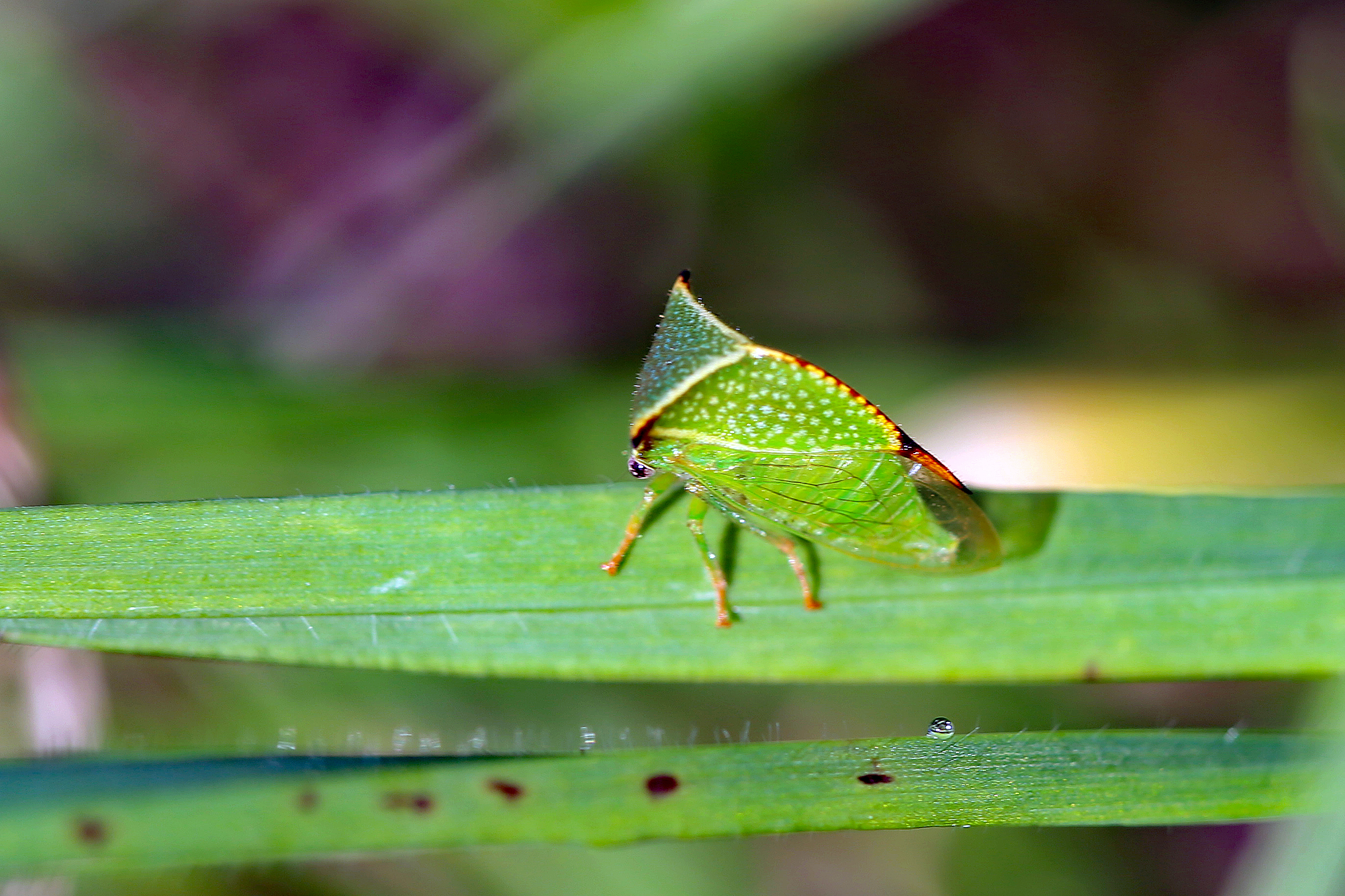 Büffelzikade, Stictocephala bisonia, als Beute einer Spinne auf einem Himbeerstrauch, Leipzig, Ortsteil Thekla, Sep. 2012