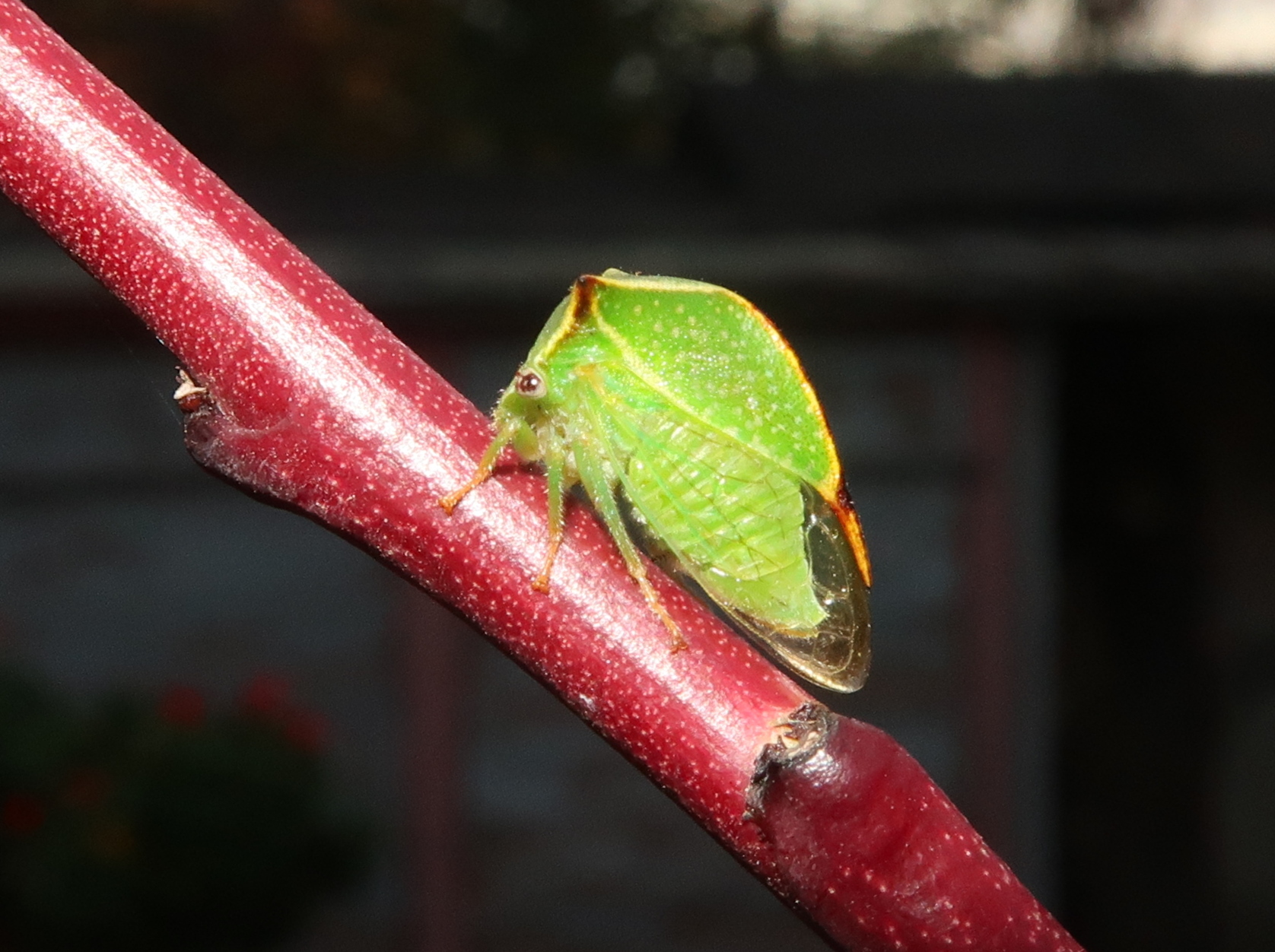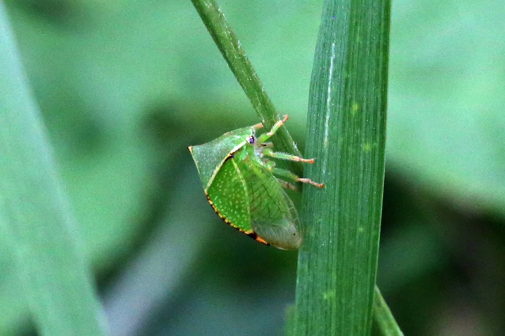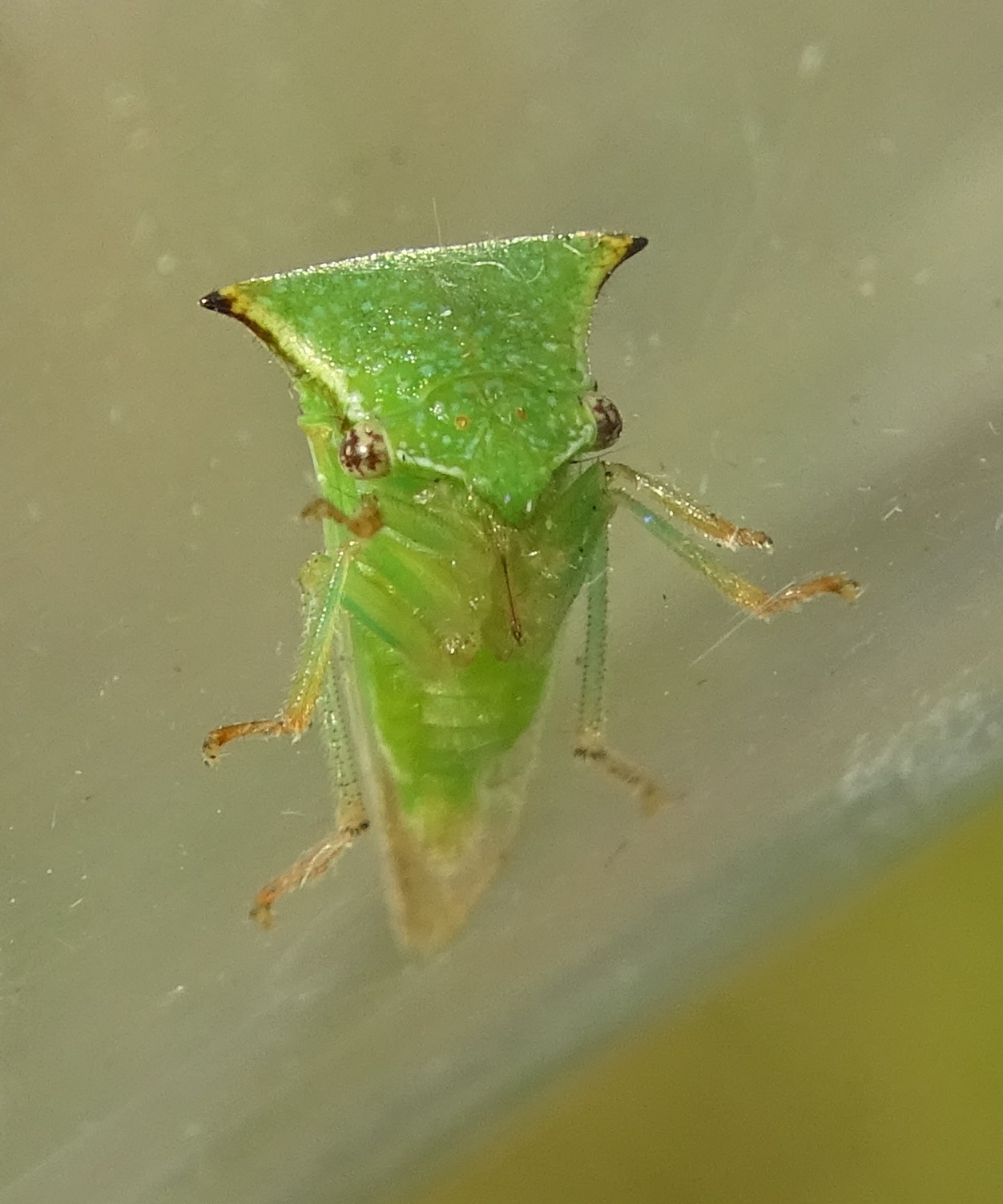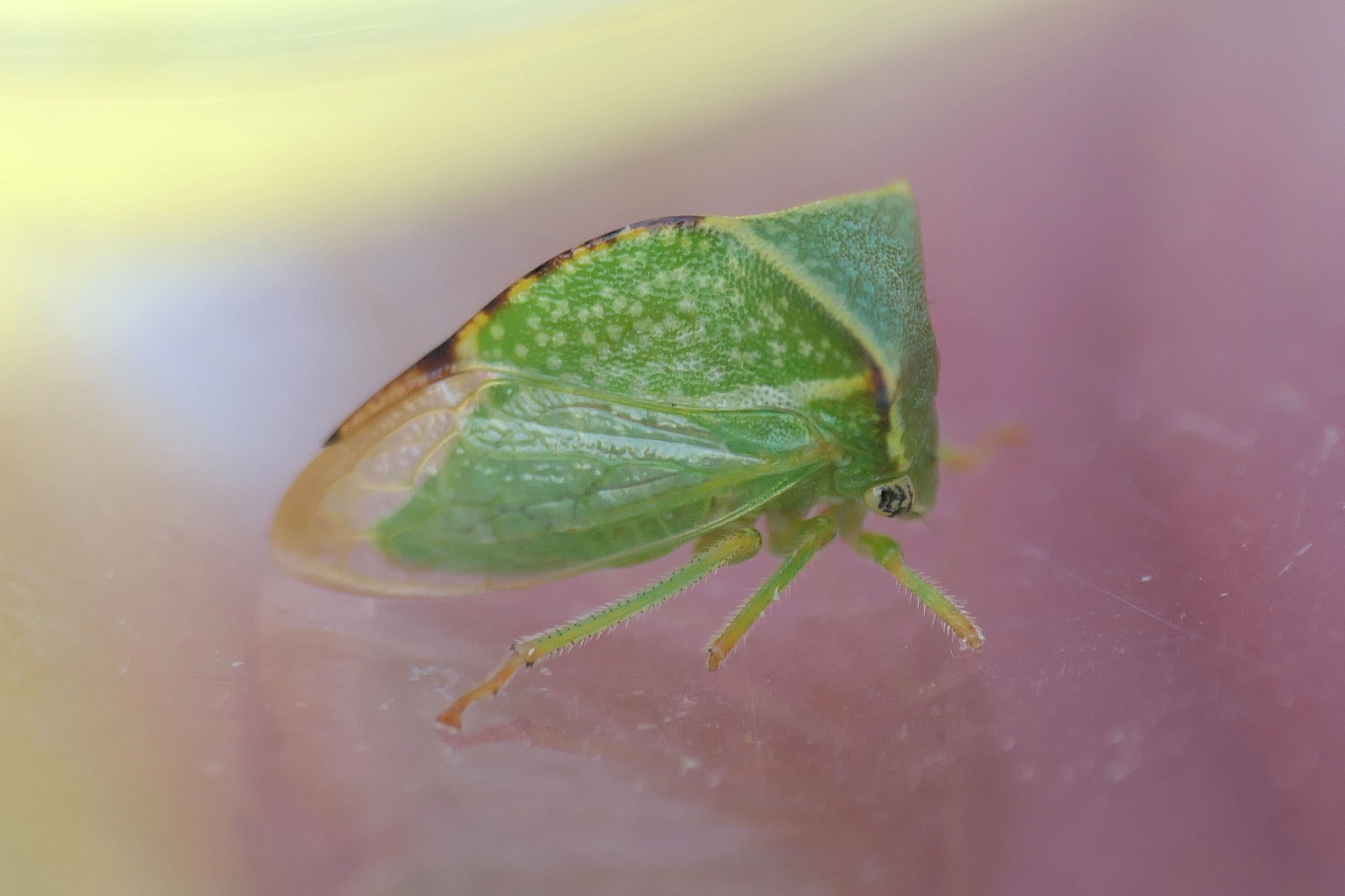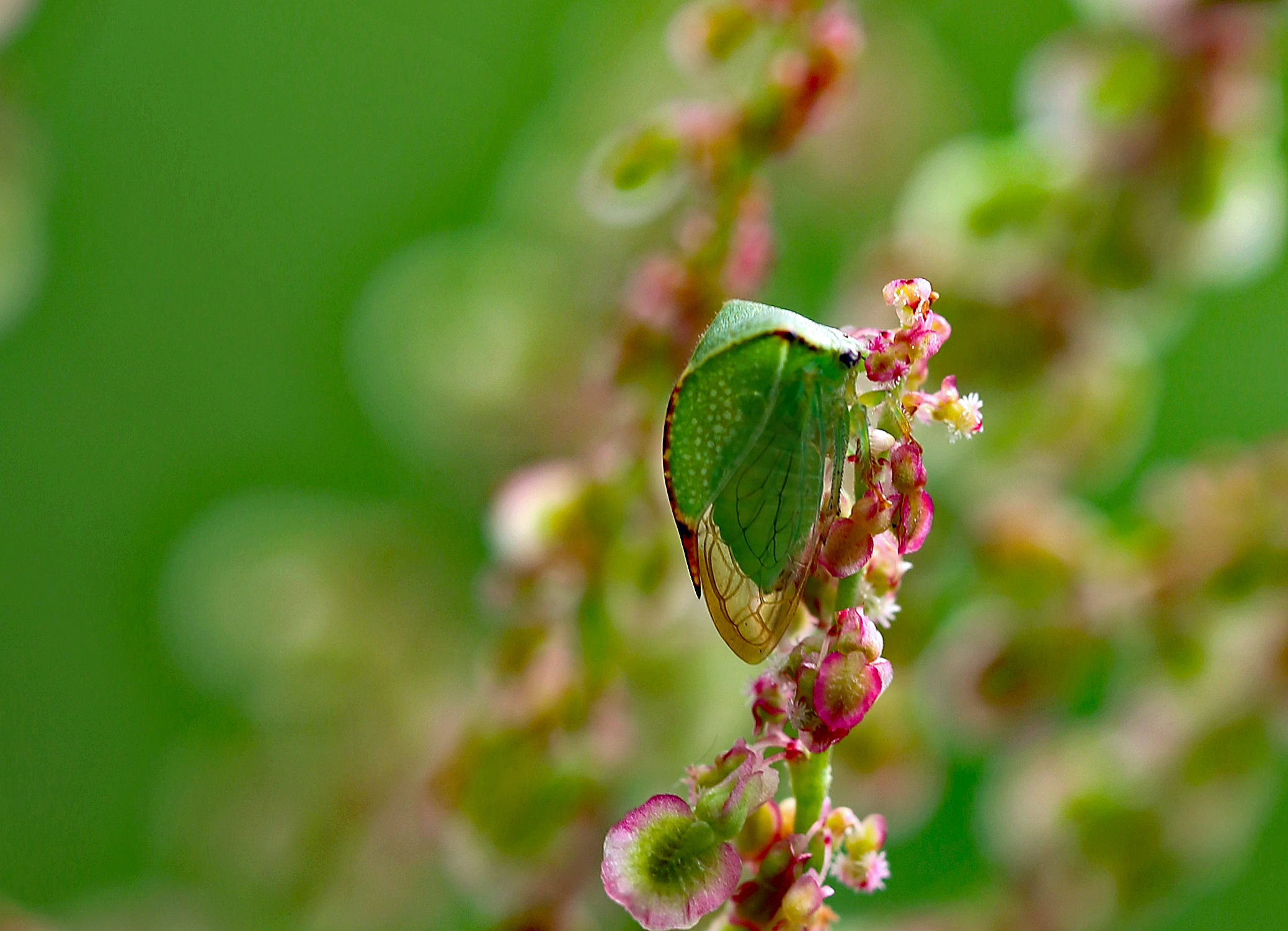 Büffelzikade, Stictocephala bisonia, als Beute einer Spinne auf einem Himbeerstrauch, Leipzig, Ortsteil Thekla, Sep. 2012