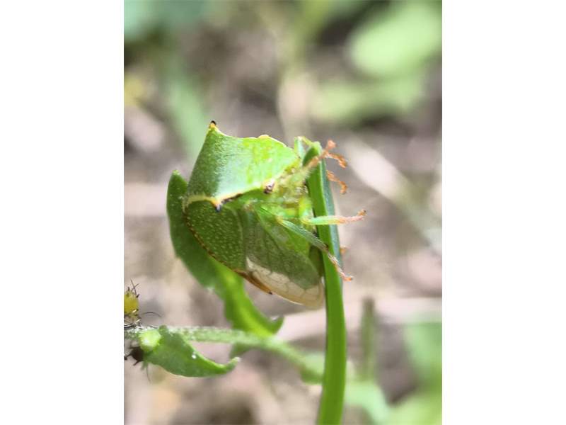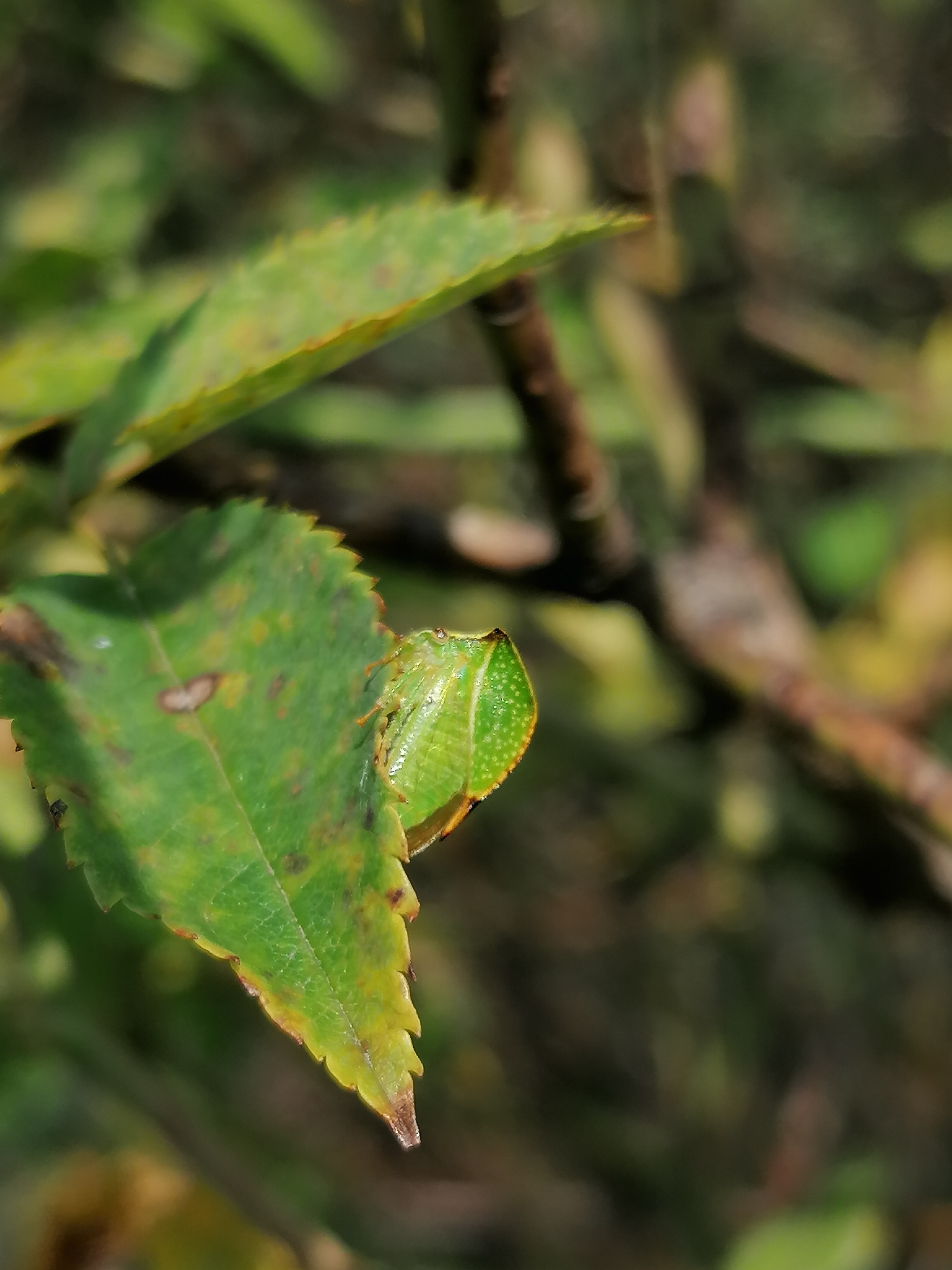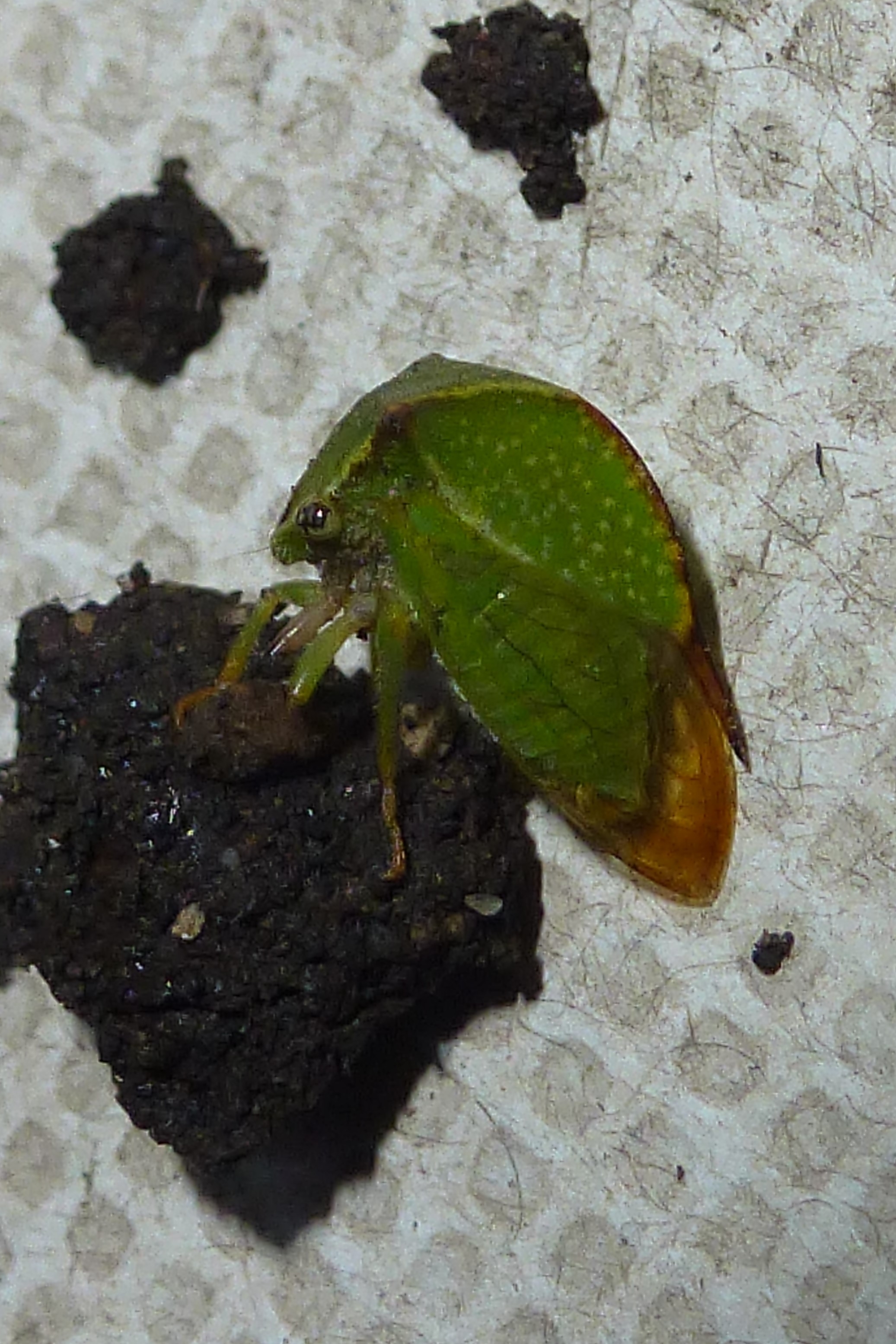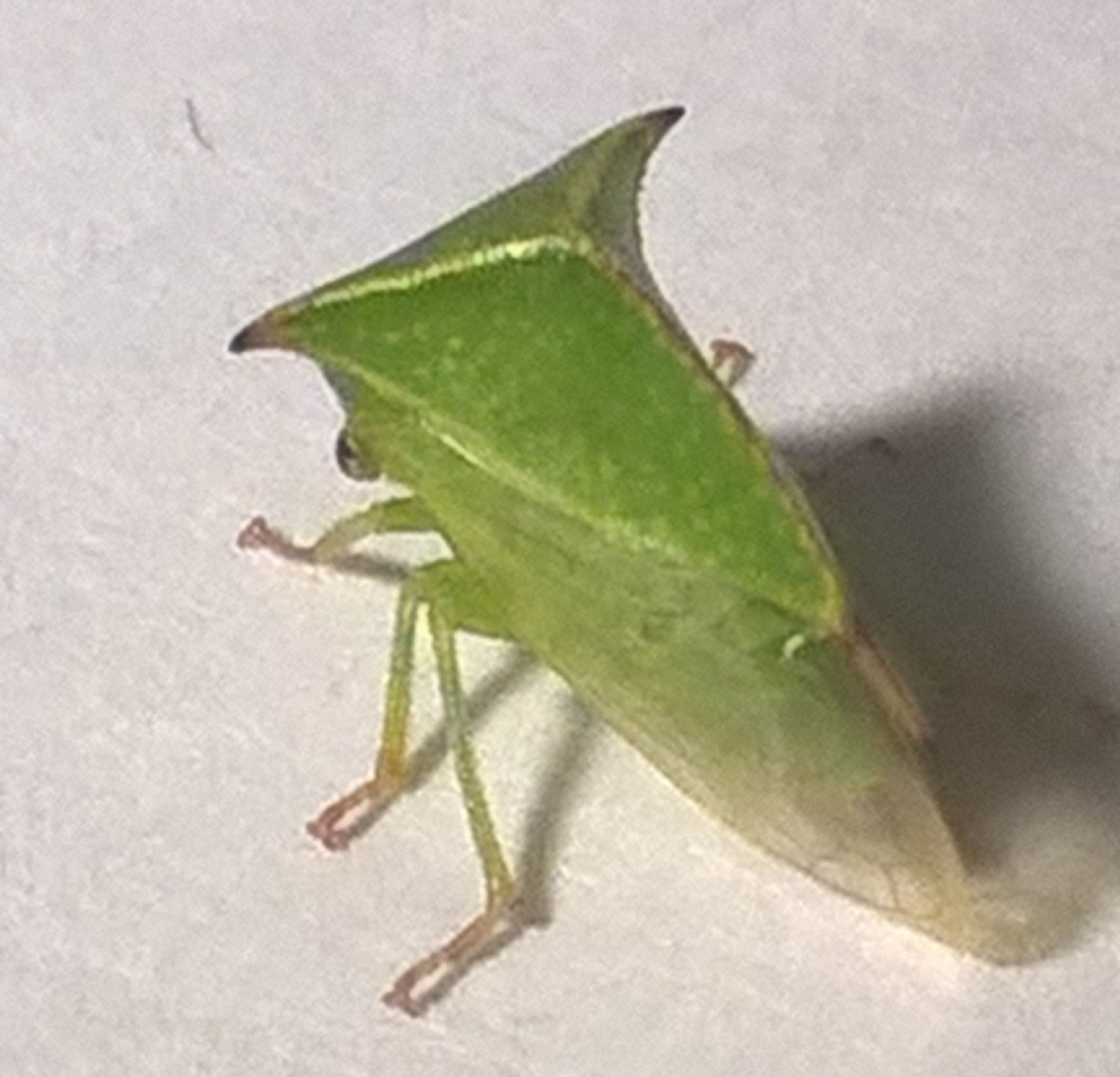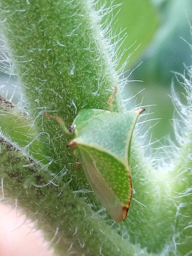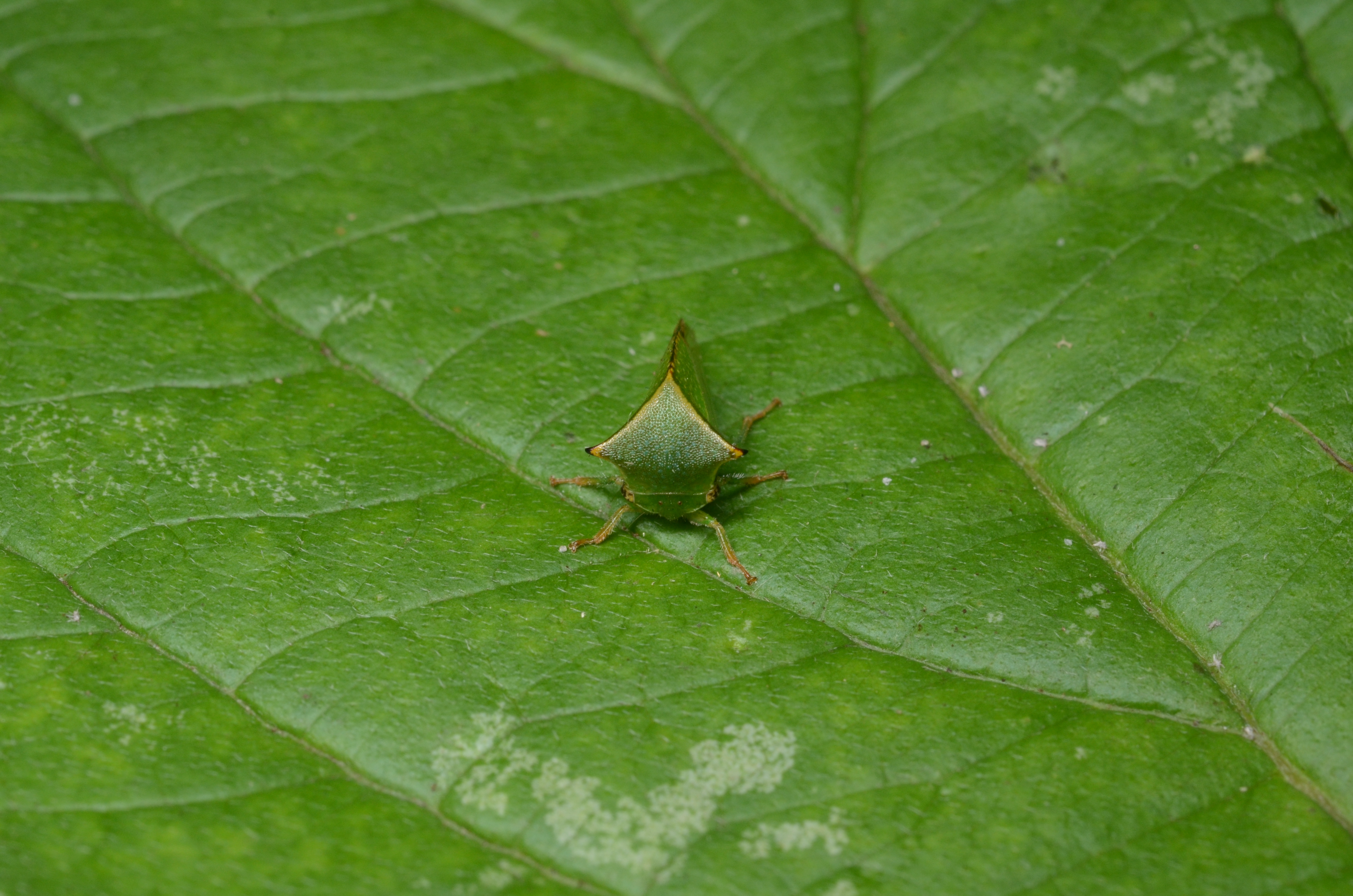 Büffelzikade, Stictocephala bisonia, als Beute einer Spinne auf einem Himbeerstrauch, Leipzig, Ortsteil Thekla, Sep. 2012