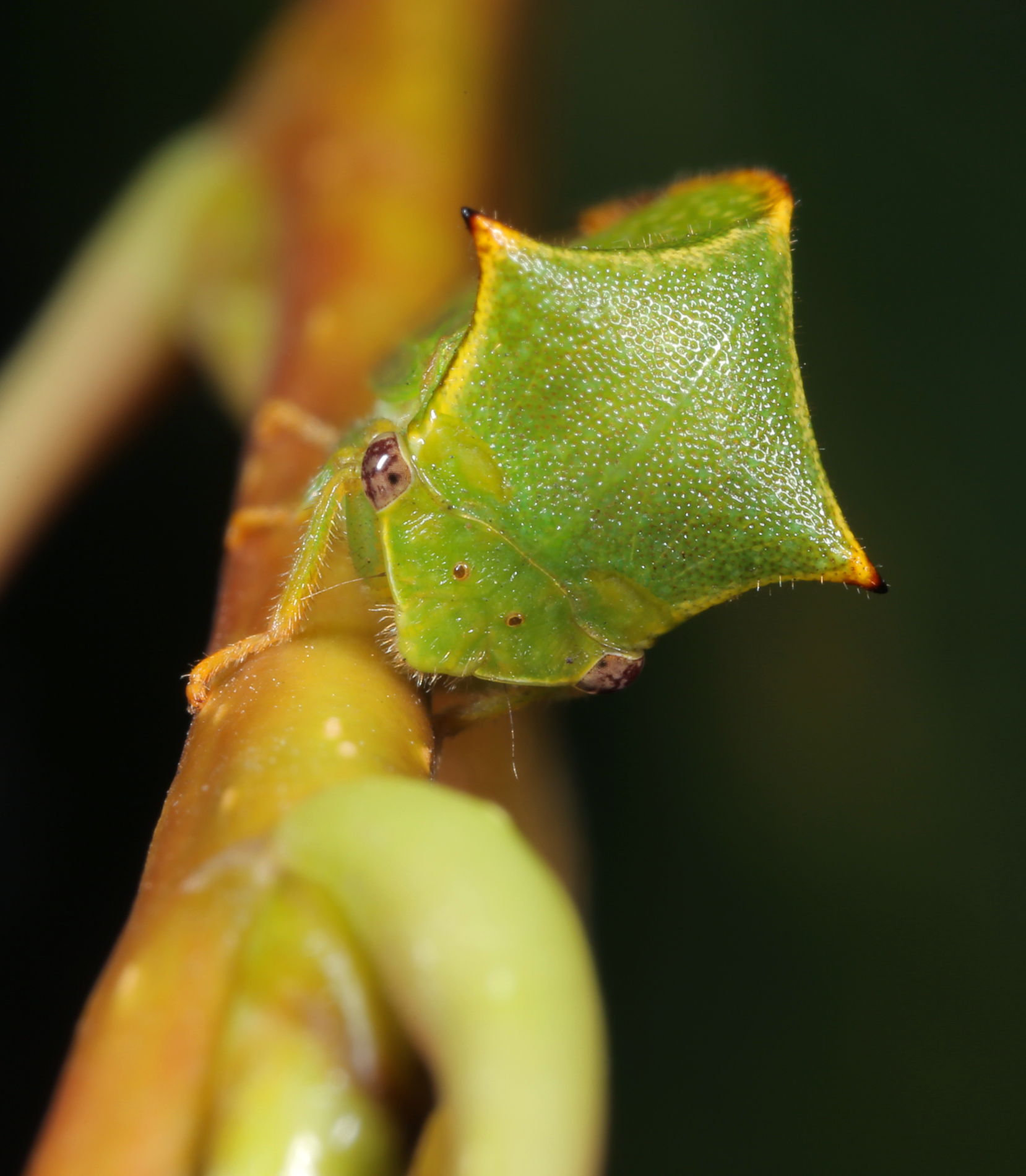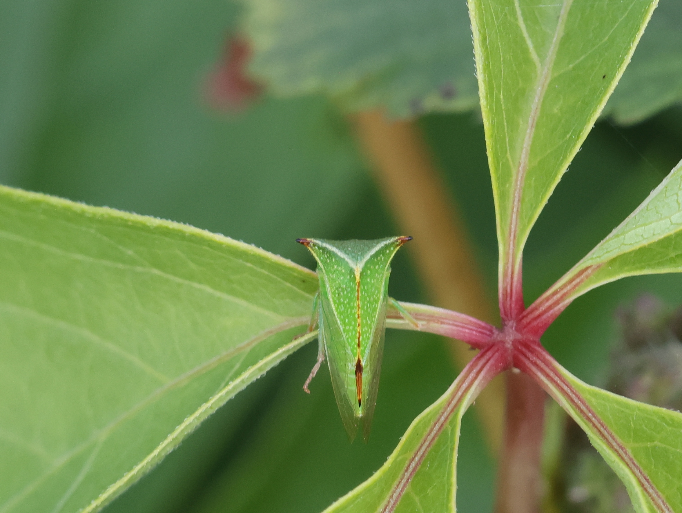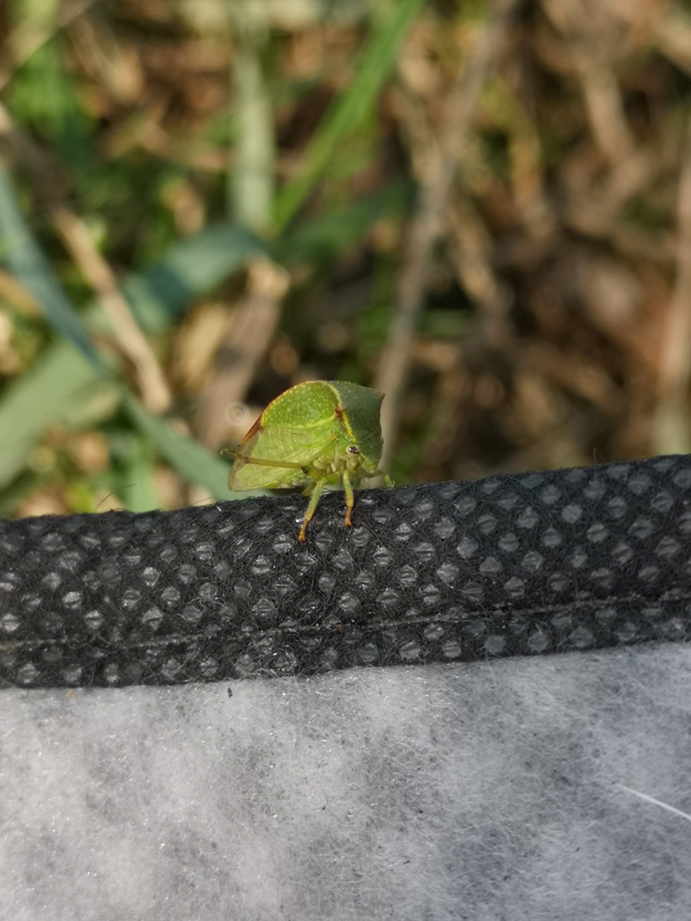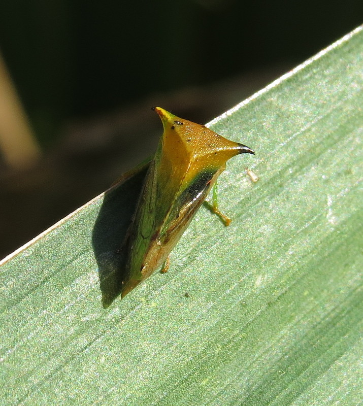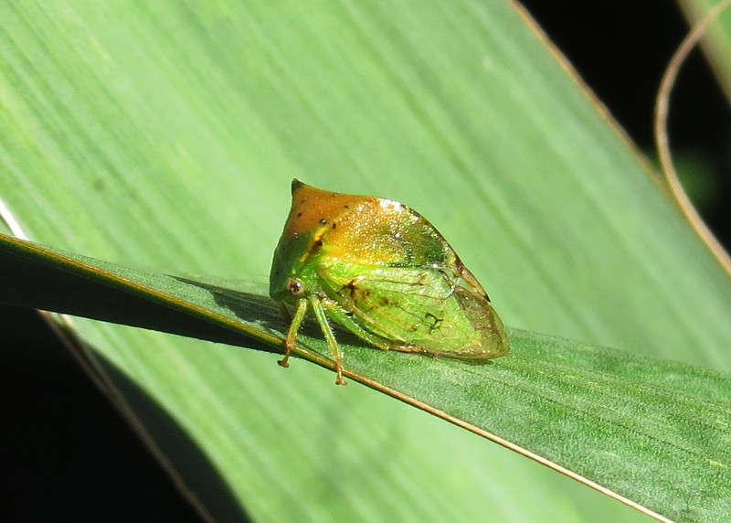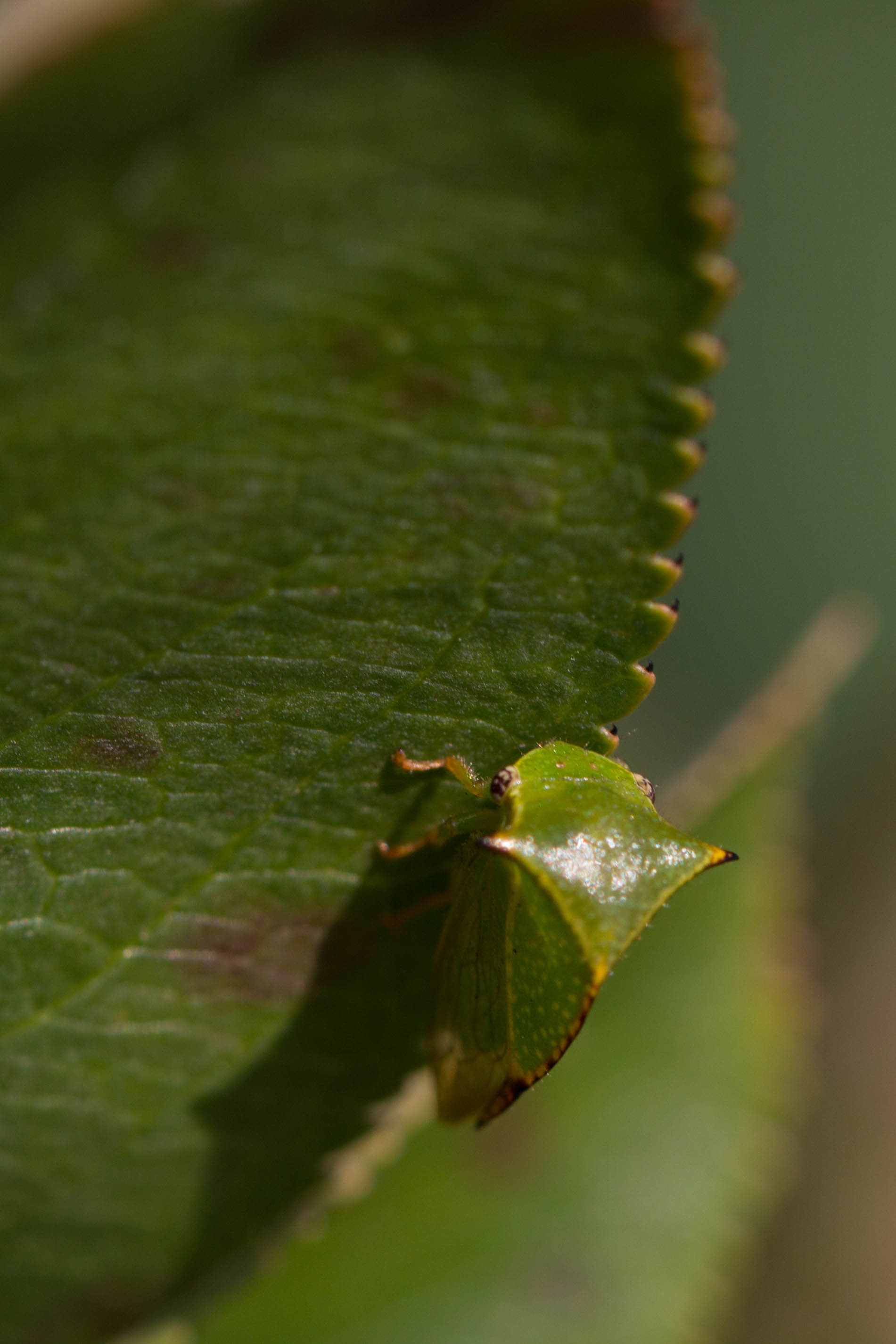 Büffelzikade, Stictocephala bisonia, als Beute einer Spinne auf einem Himbeerstrauch, Leipzig, Ortsteil Thekla, Sep. 2012