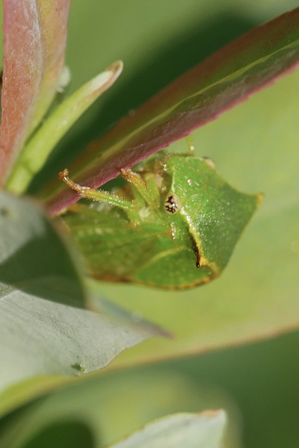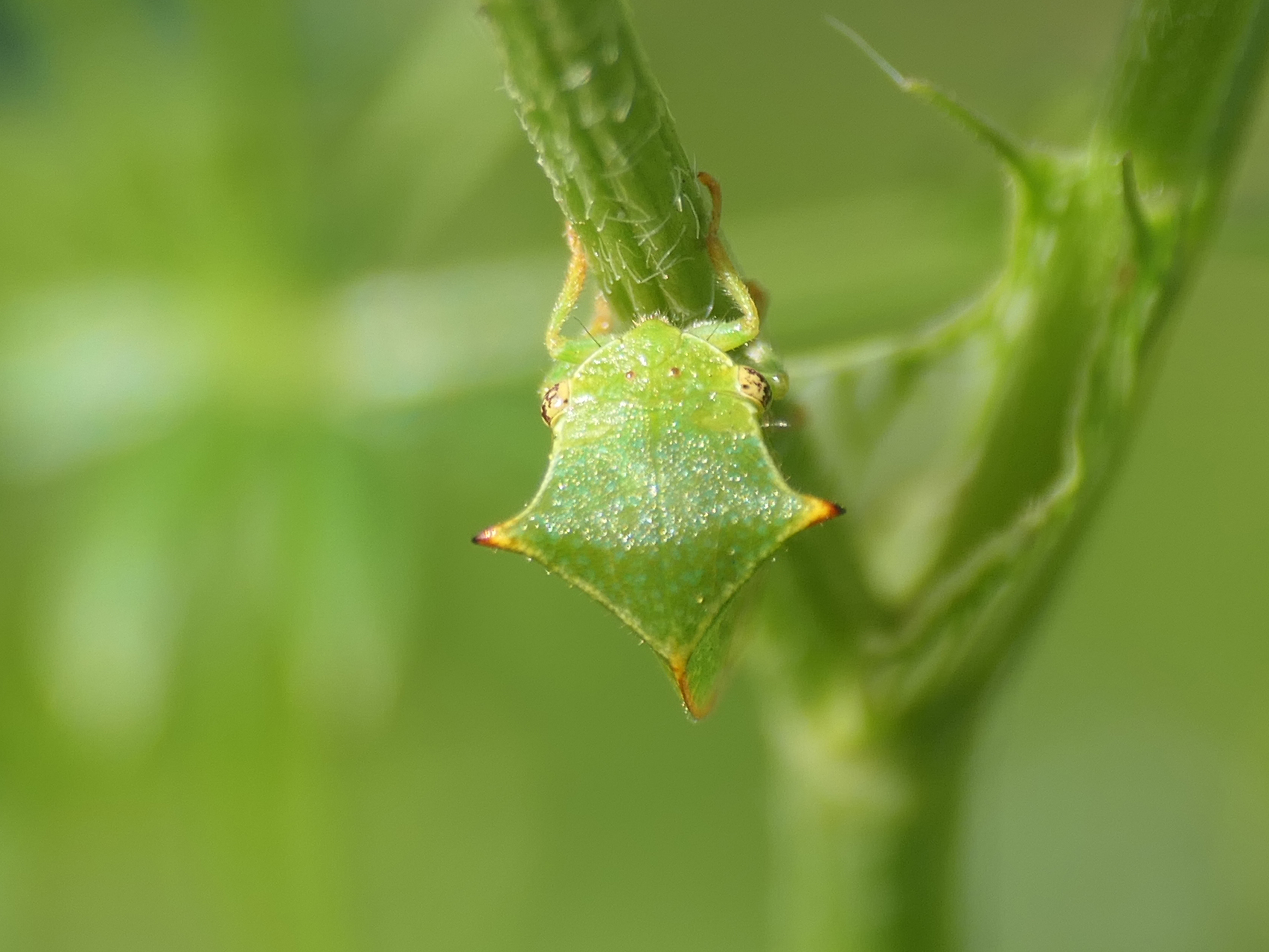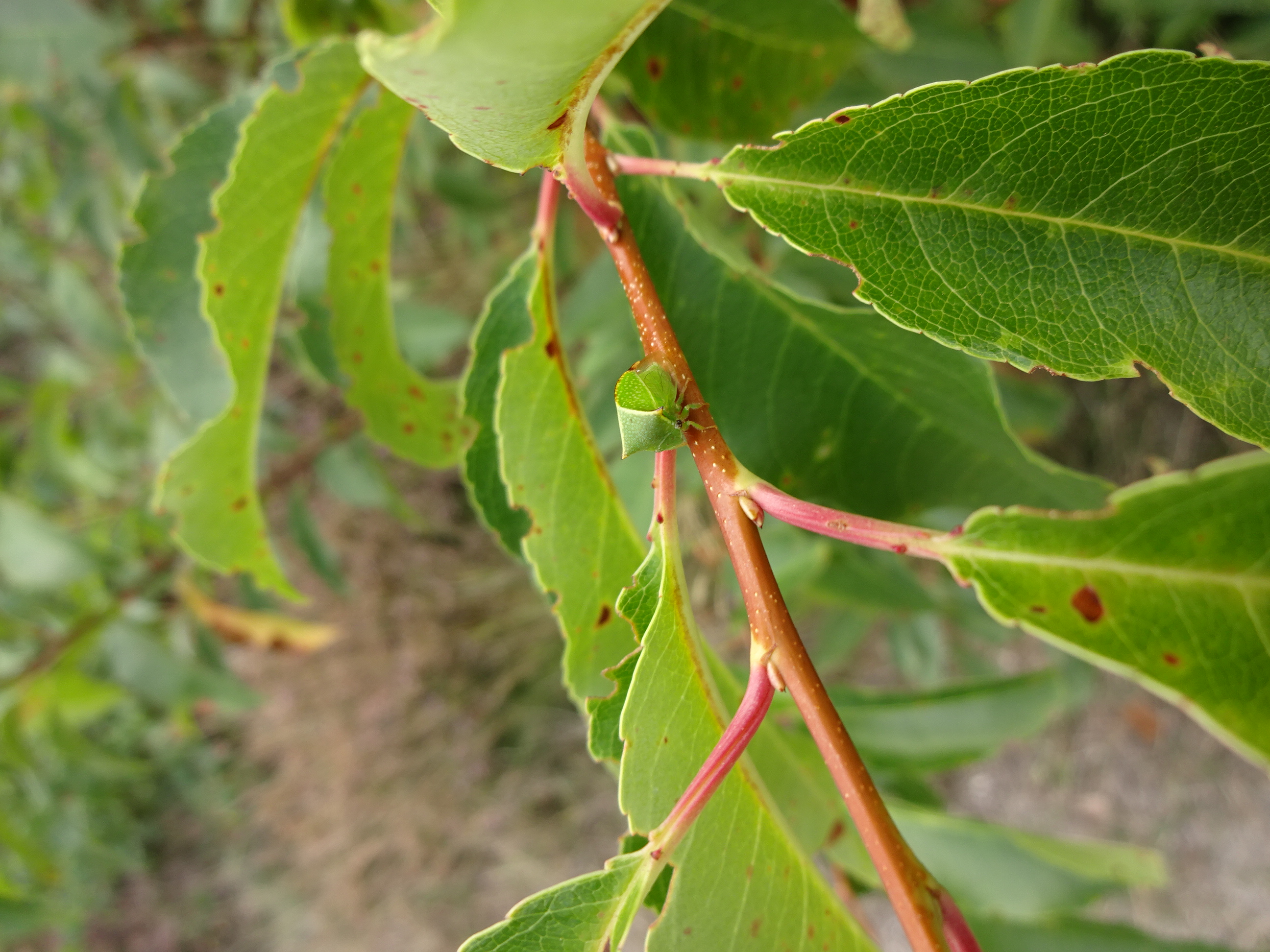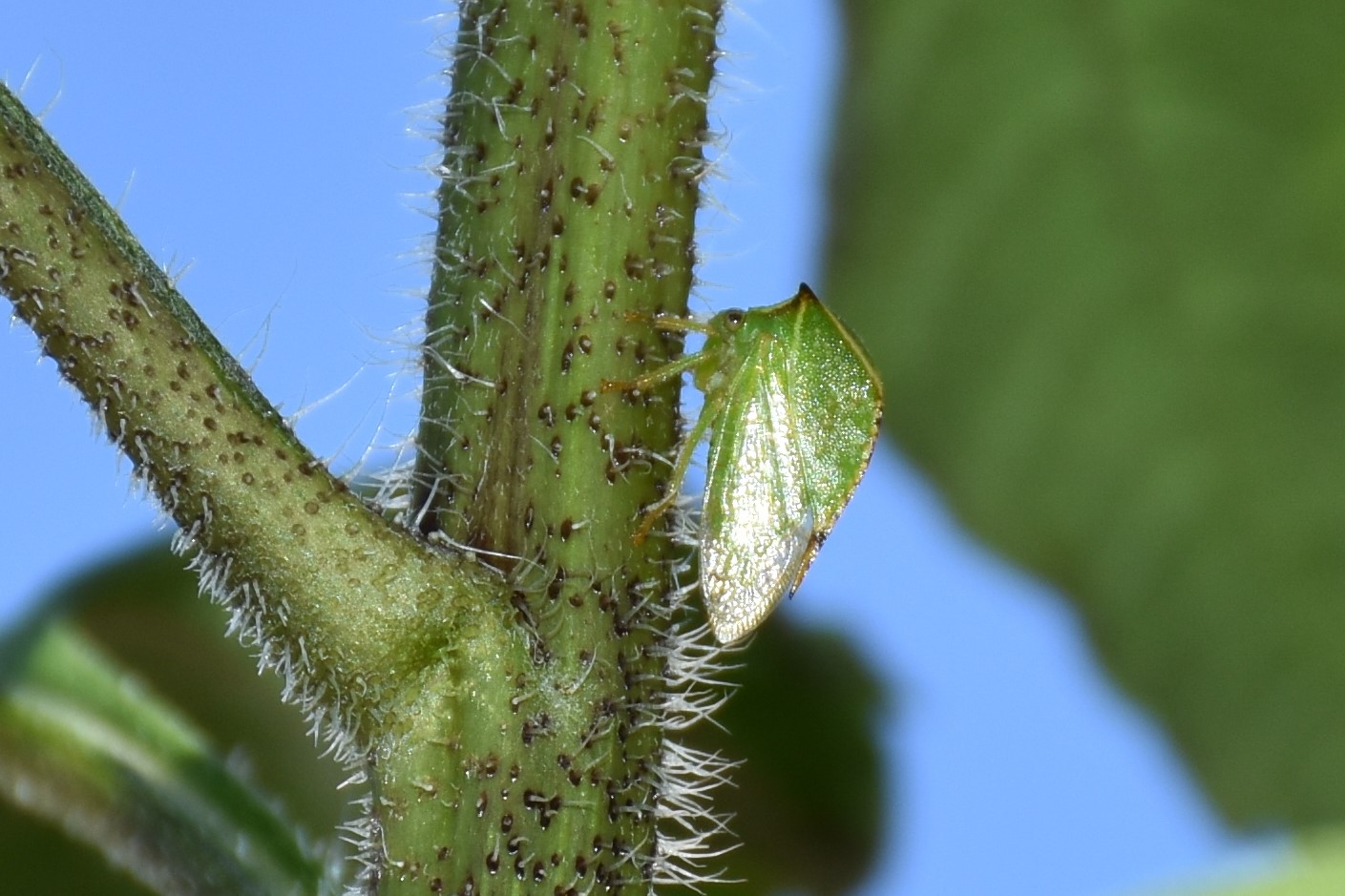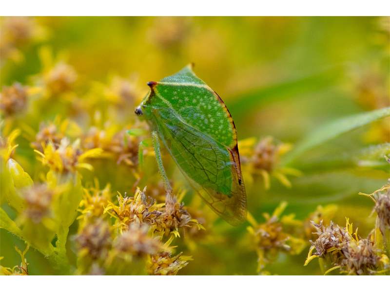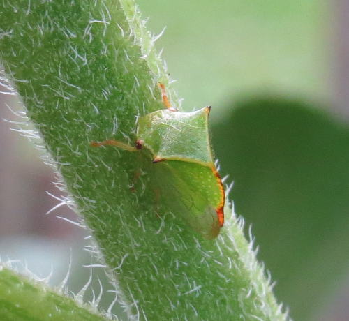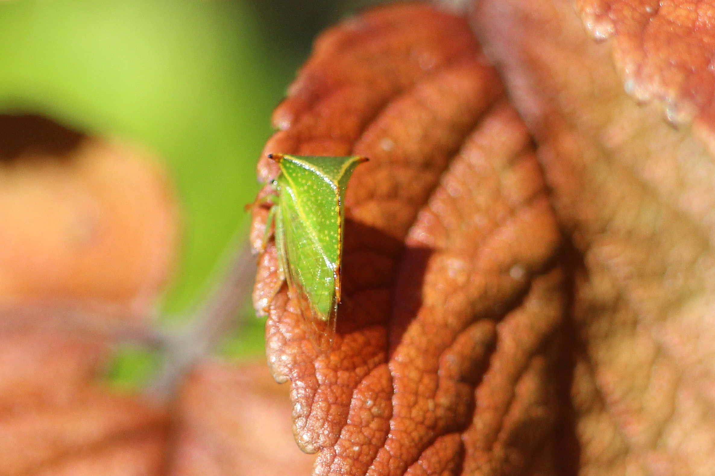 Büffelzikade, Stictocephala bisonia, als Beute einer Spinne auf einem Himbeerstrauch, Leipzig, Ortsteil Thekla, Sep. 2012