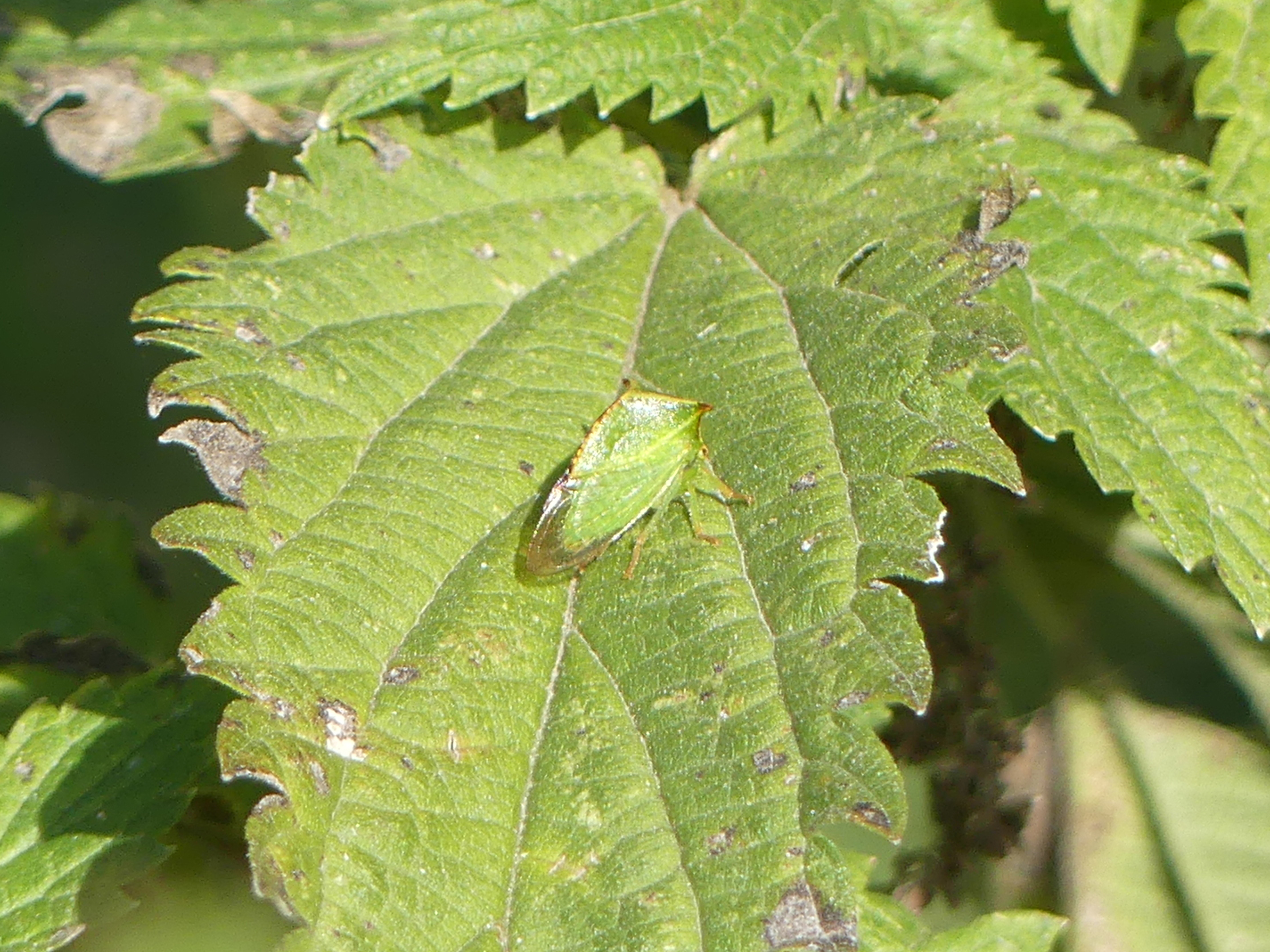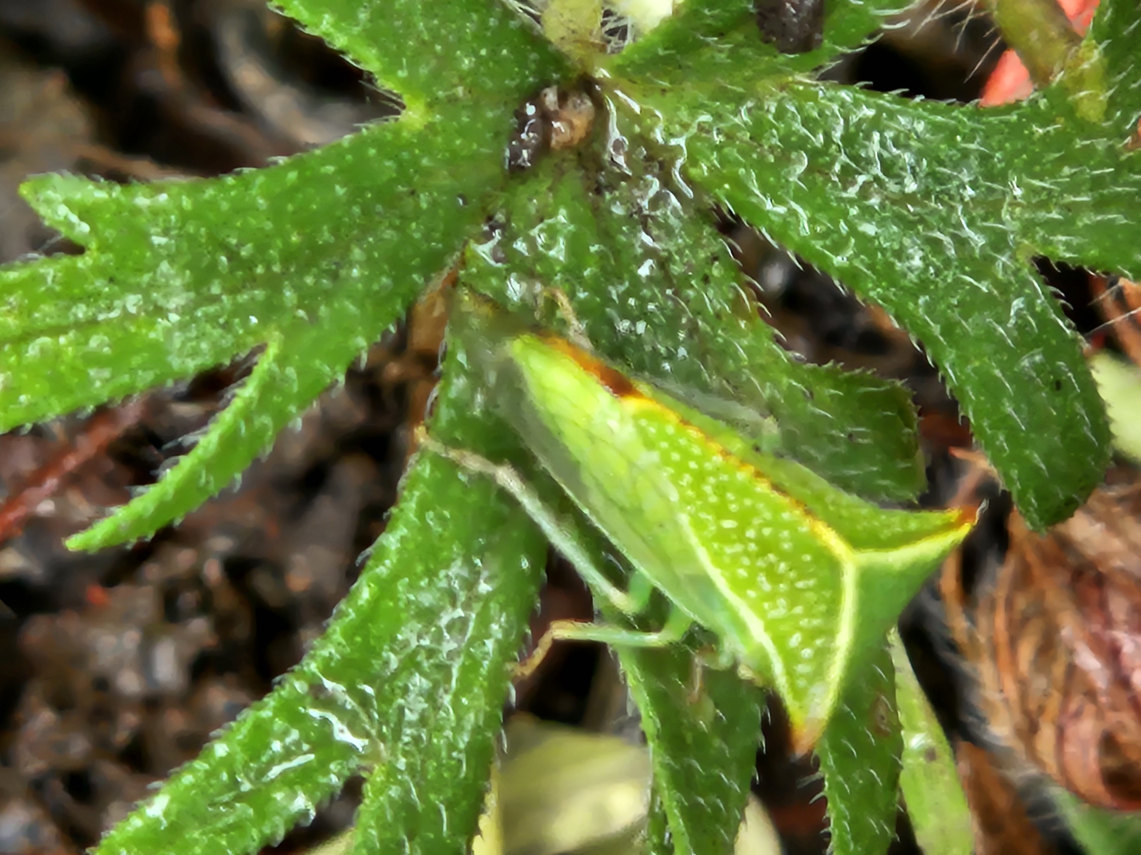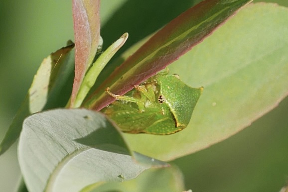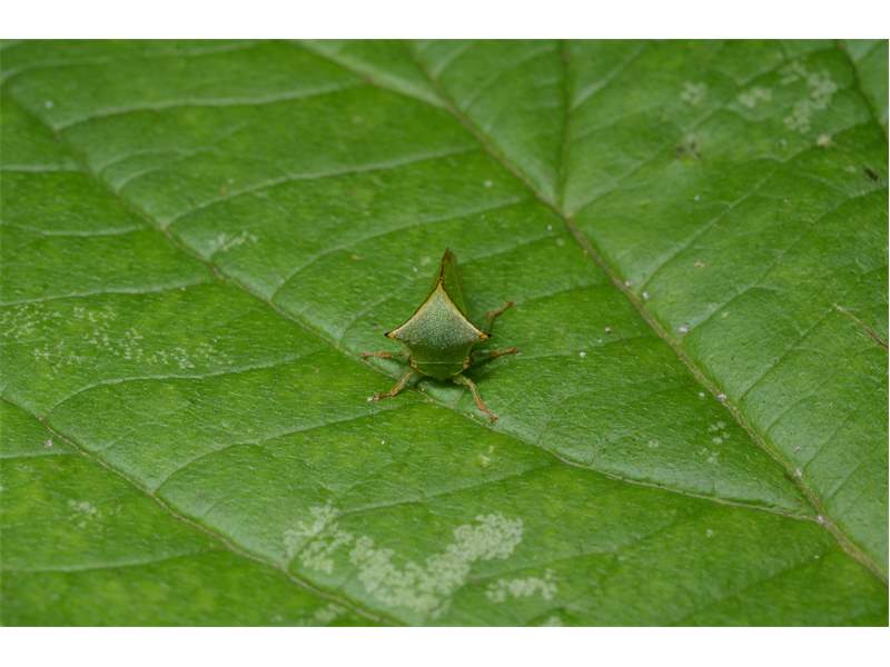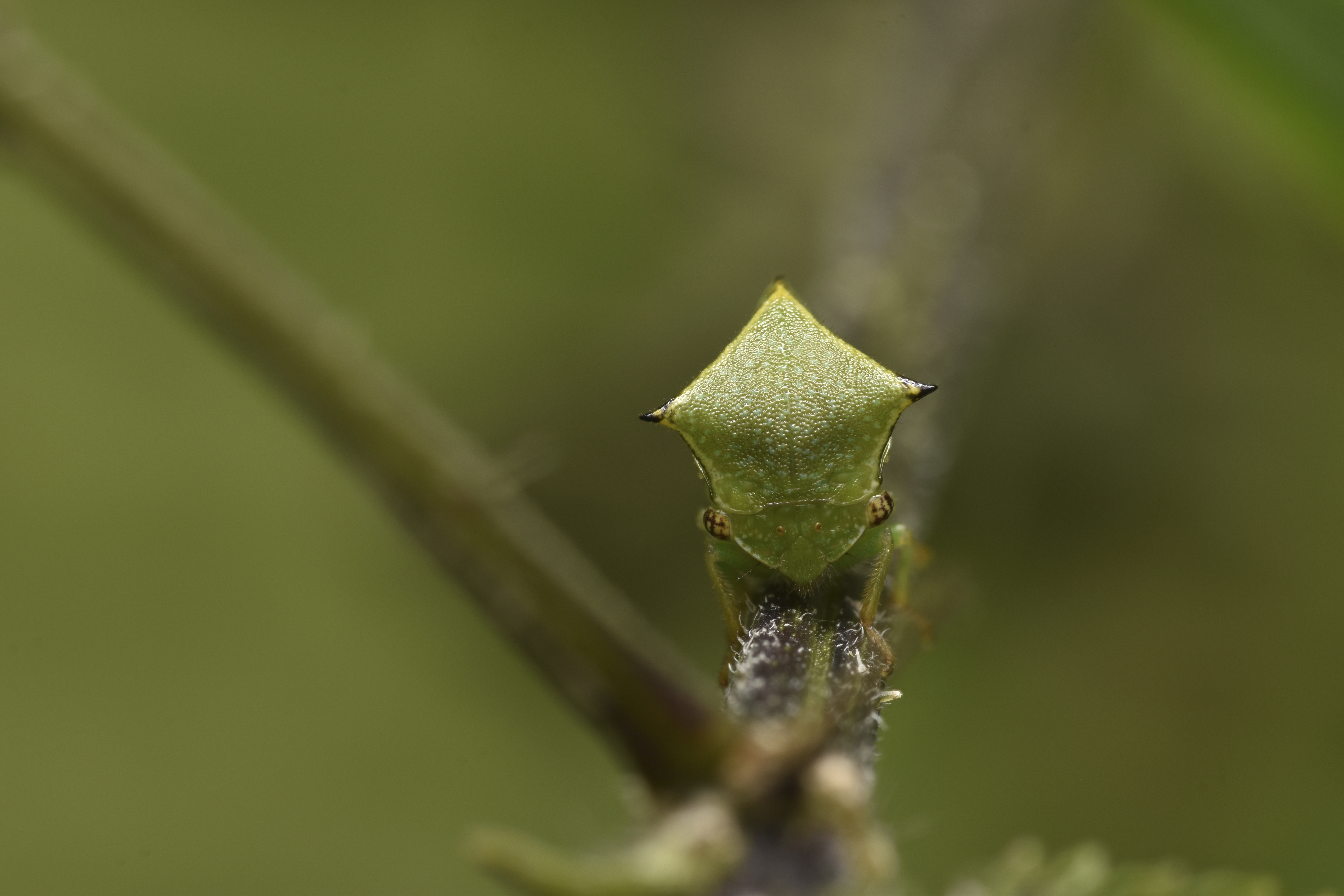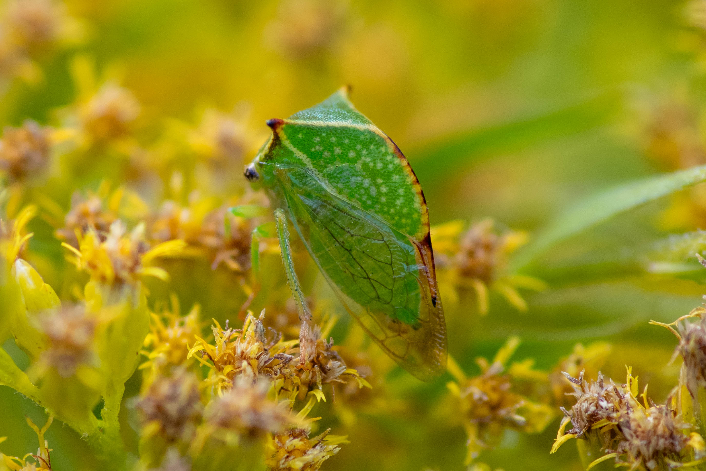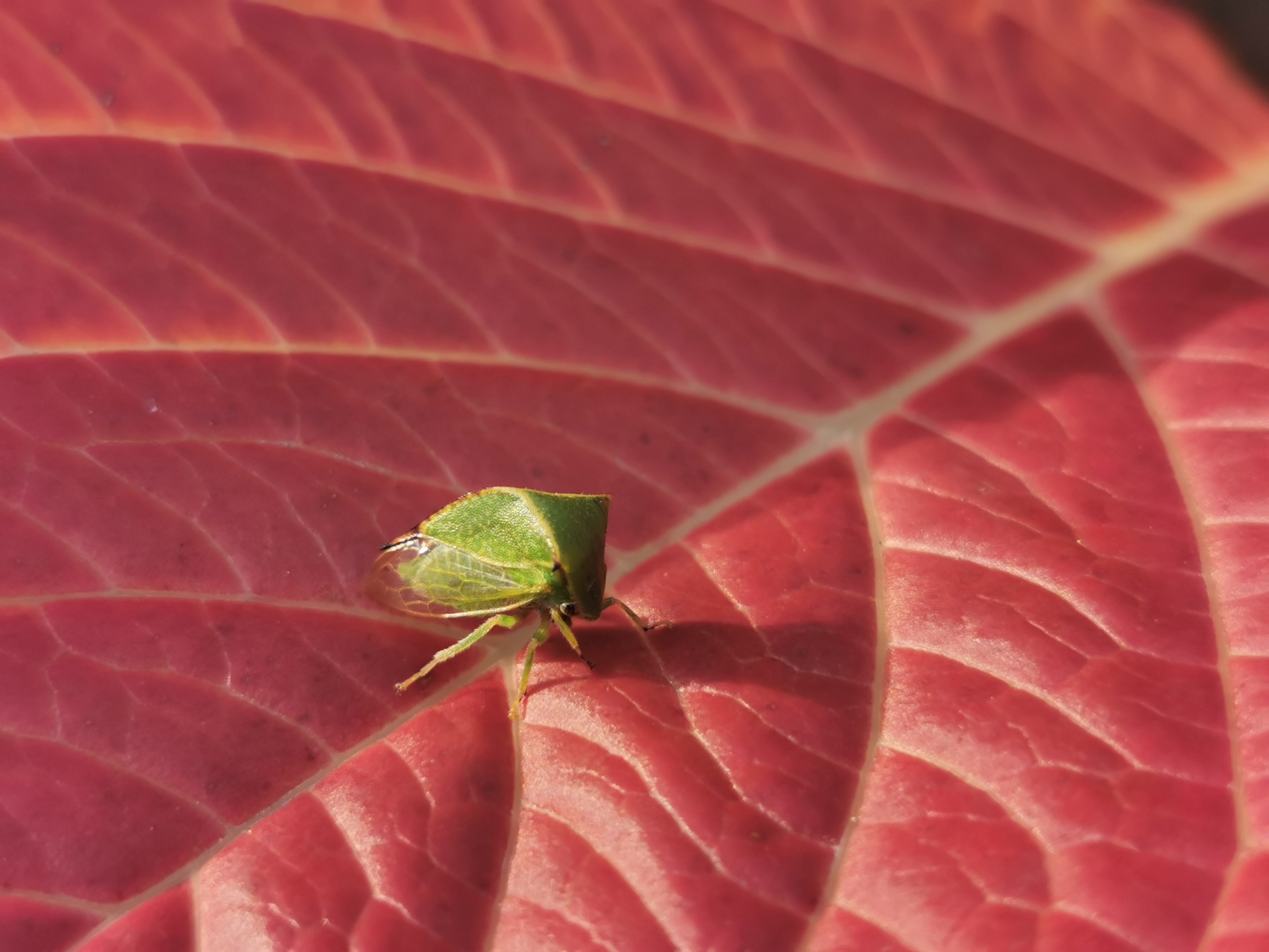 Büffelzikade, Stictocephala bisonia, als Beute einer Spinne auf einem Himbeerstrauch, Leipzig, Ortsteil Thekla, Sep. 2012