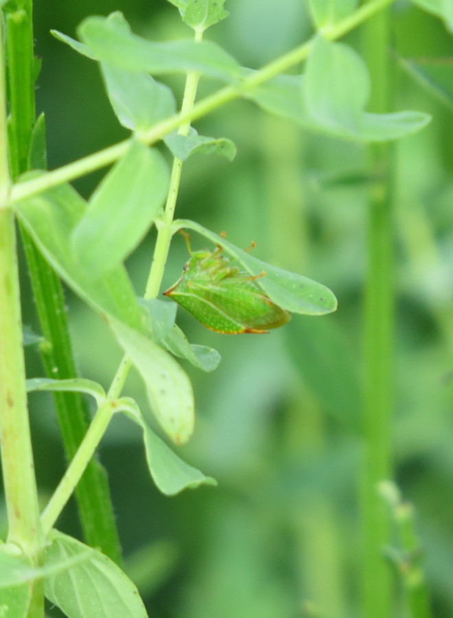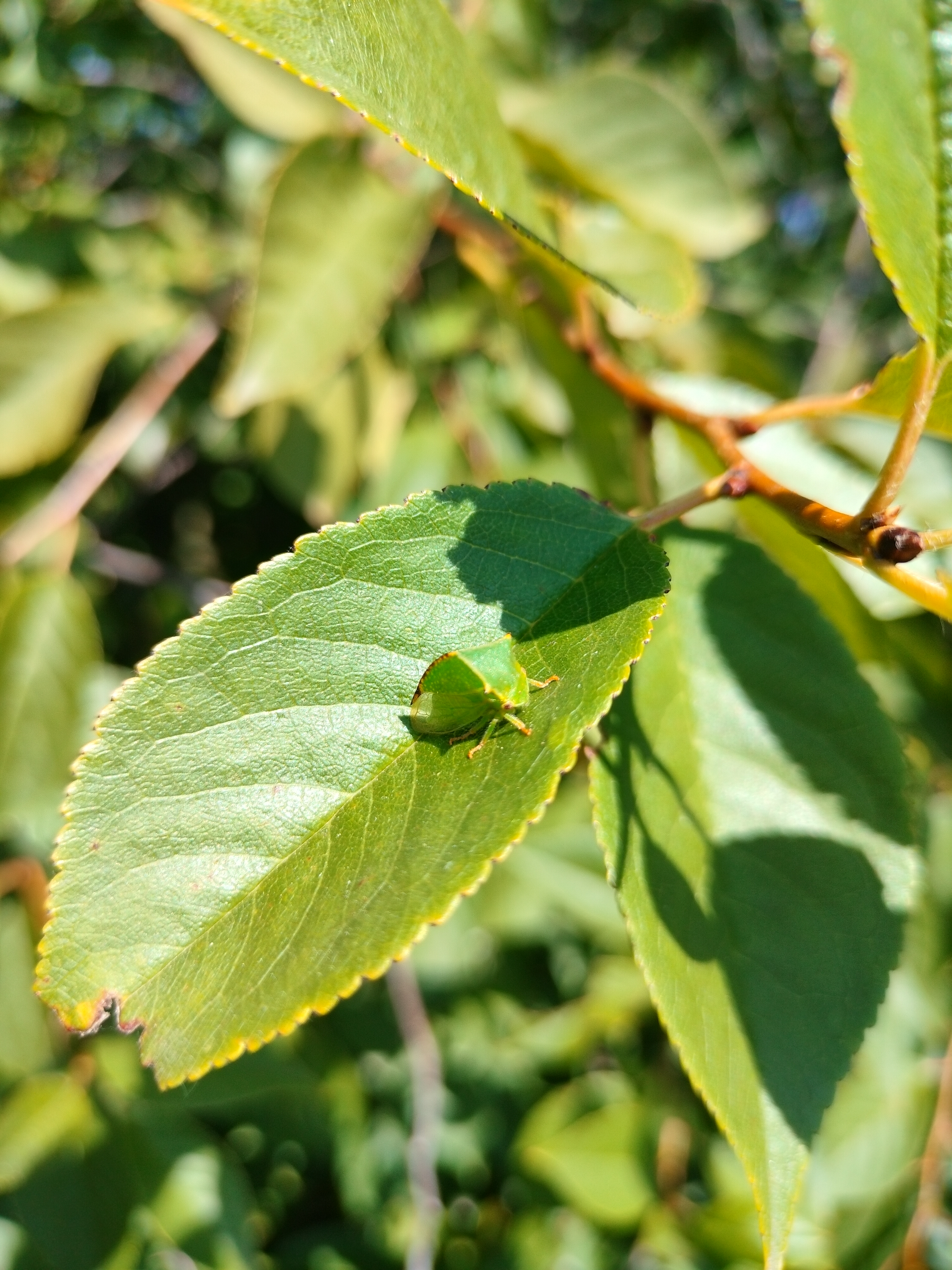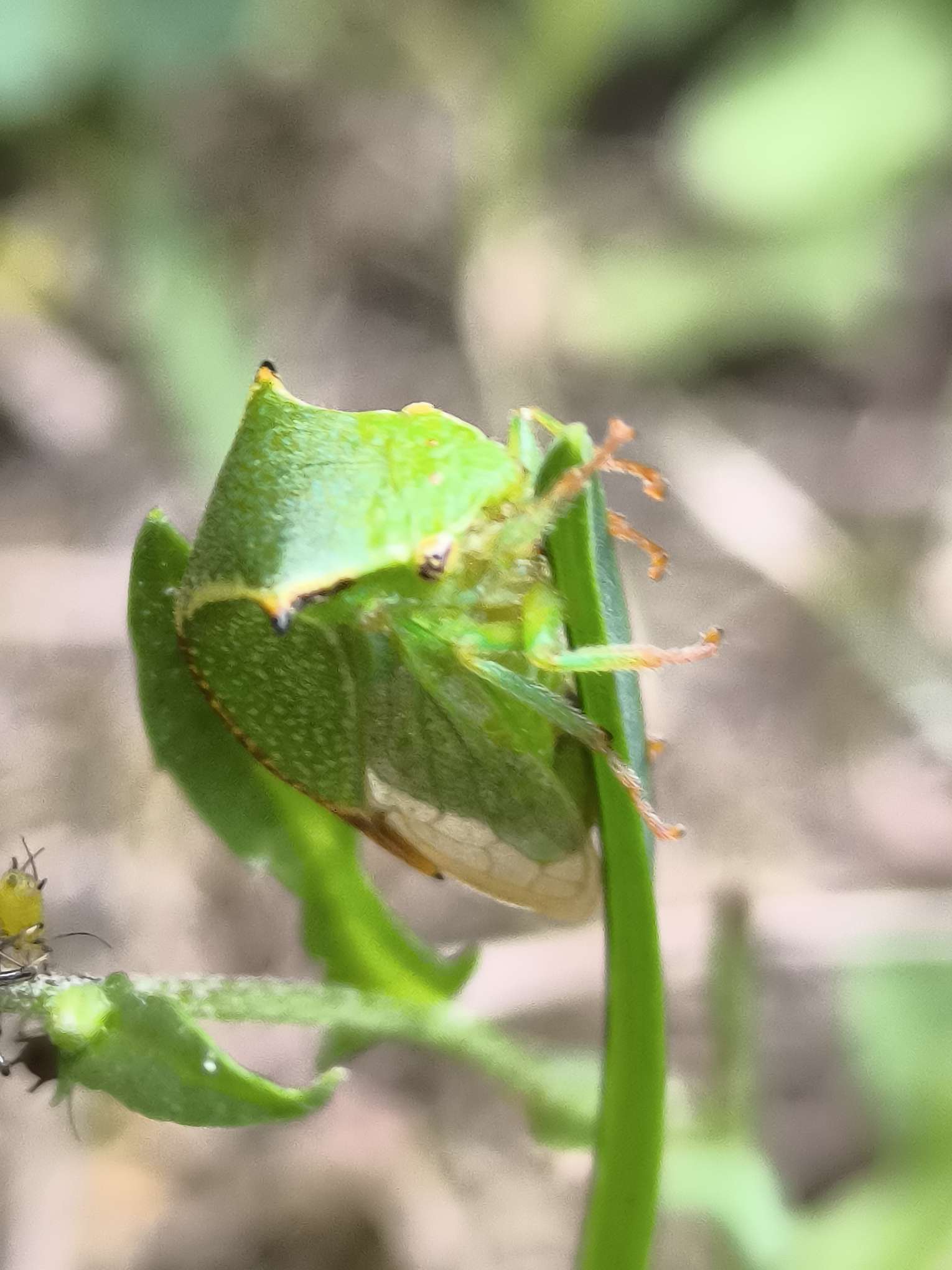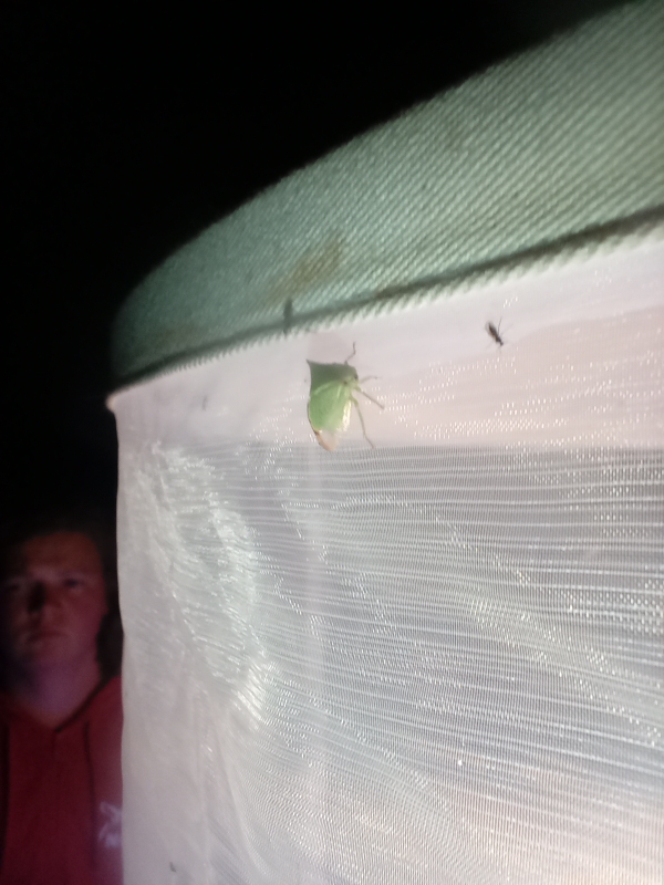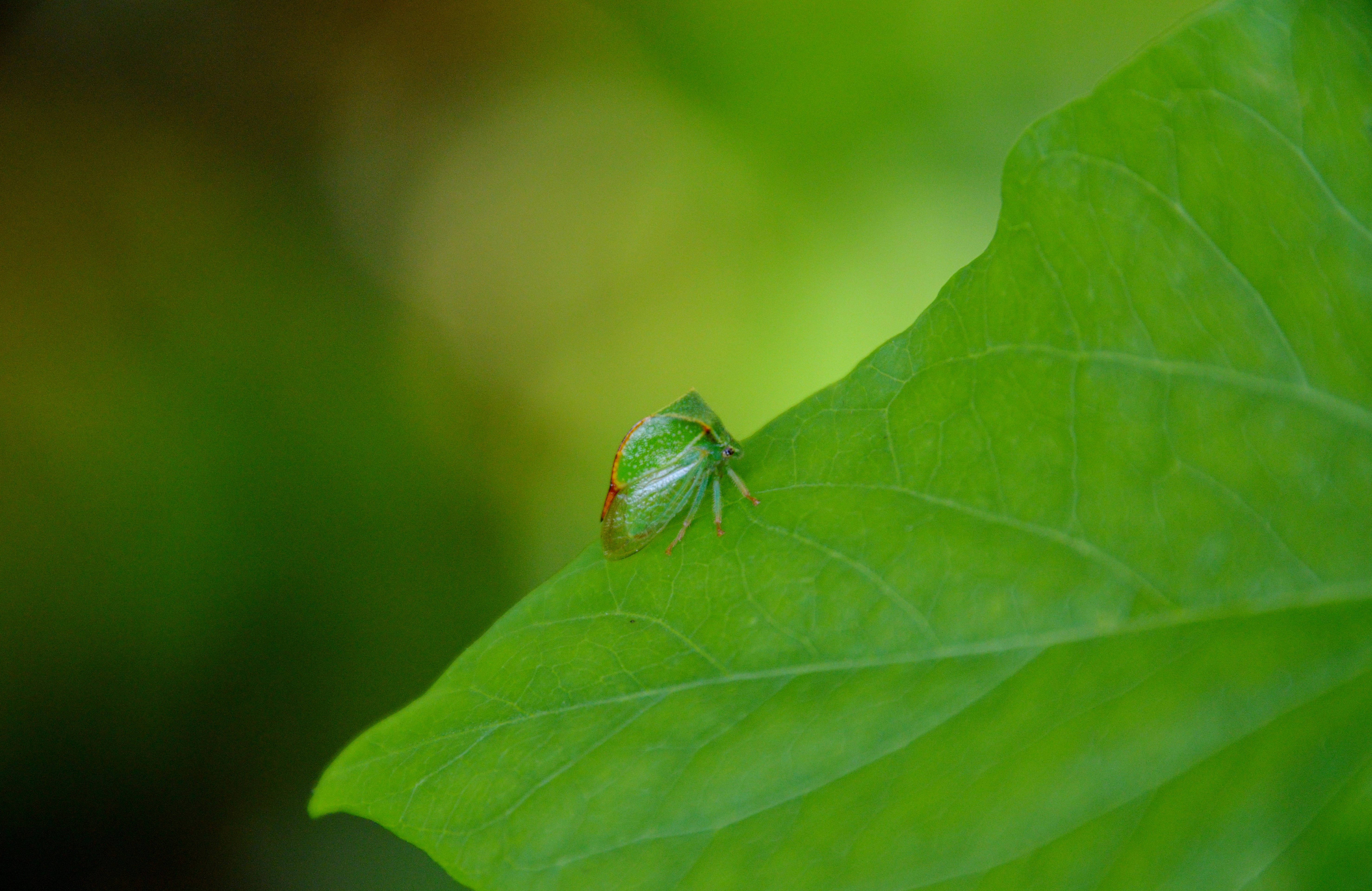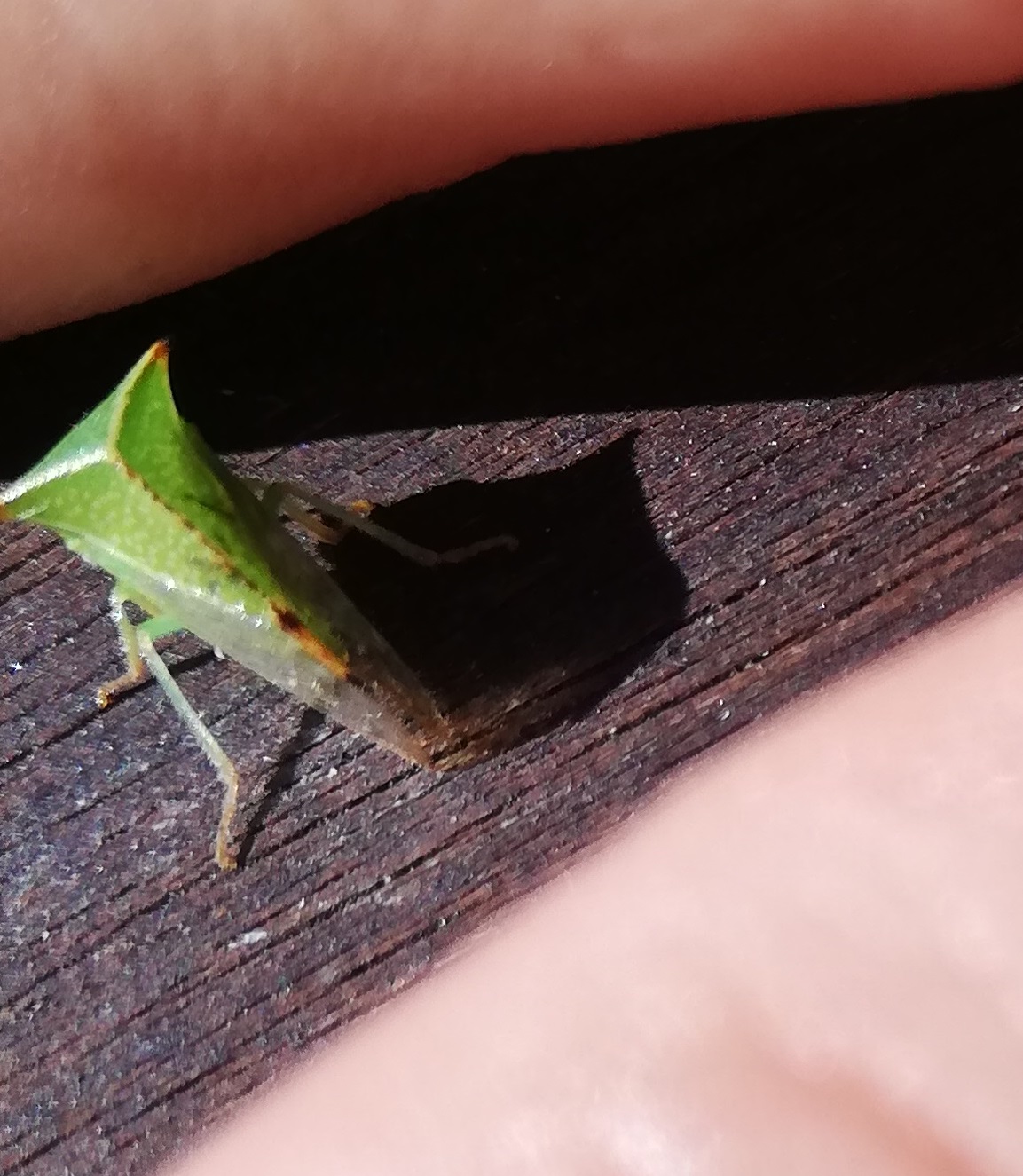 Büffelzikade, Stictocephala bisonia, als Beute einer Spinne auf einem Himbeerstrauch, Leipzig, Ortsteil Thekla, Sep. 2012