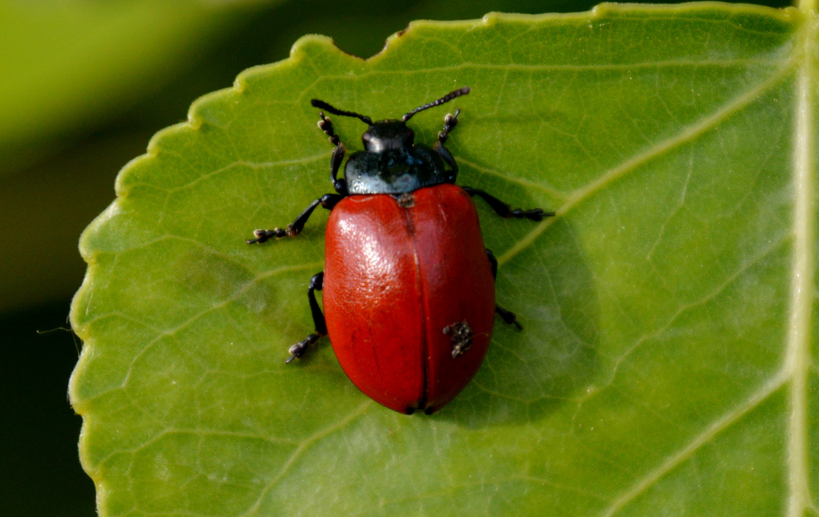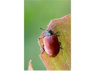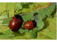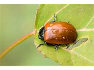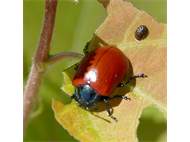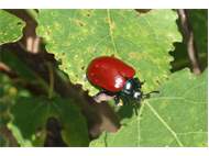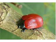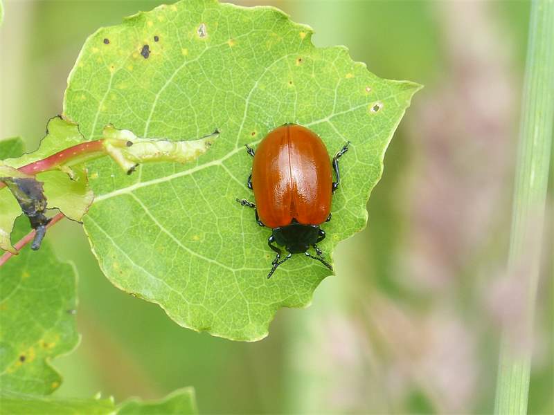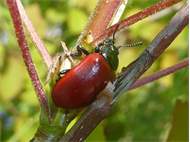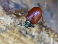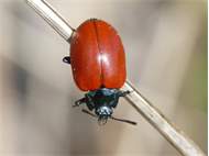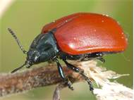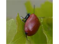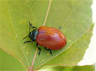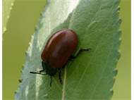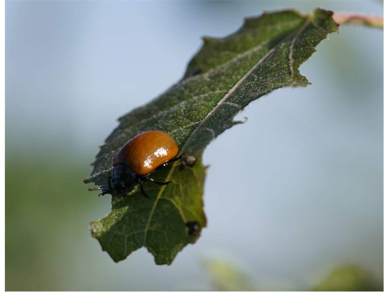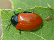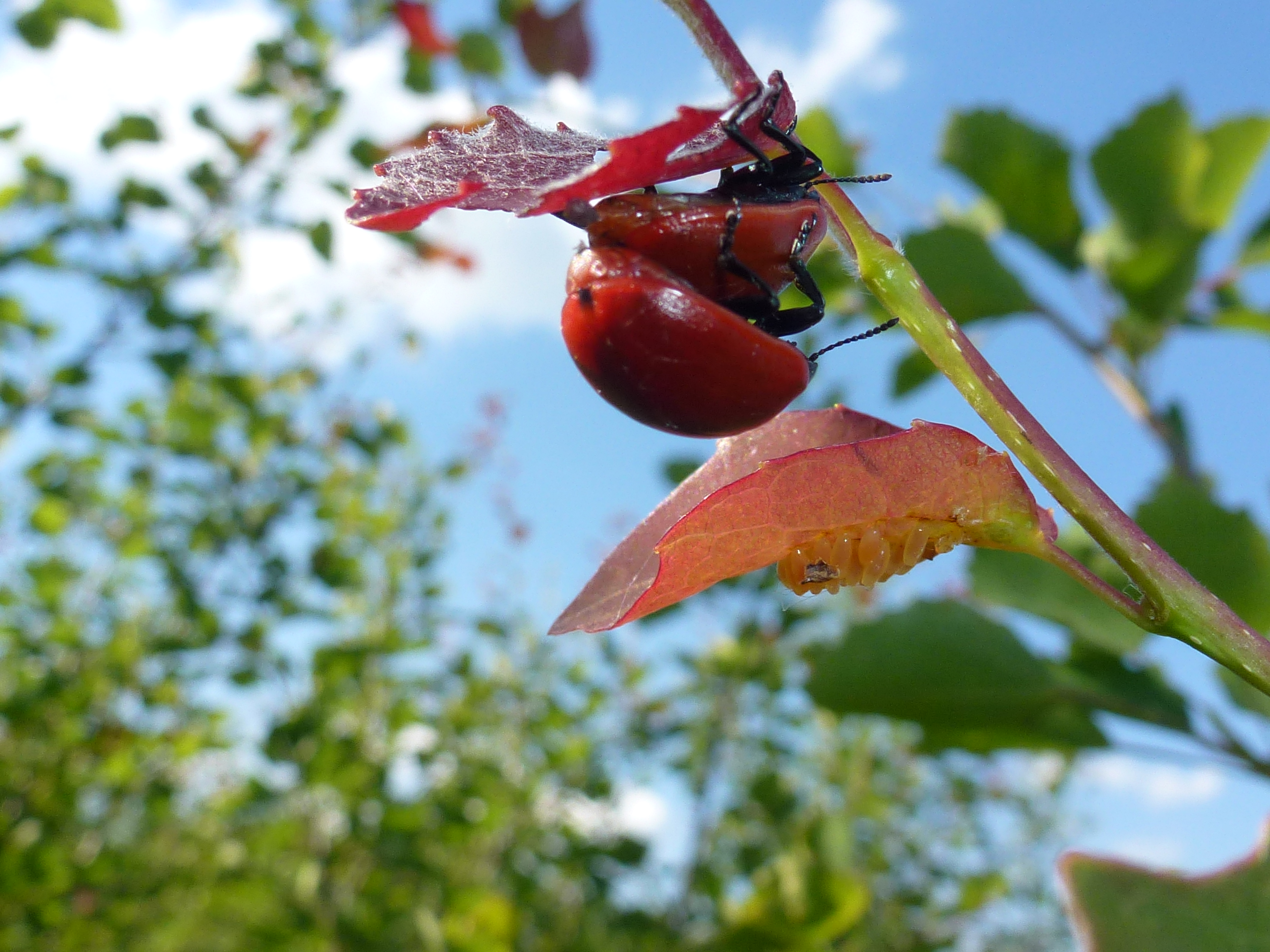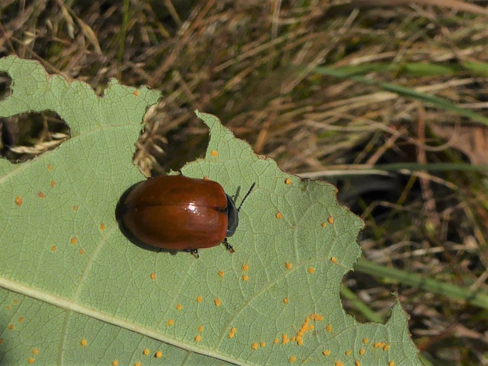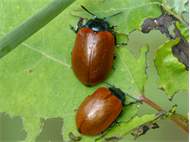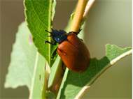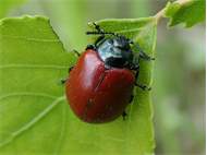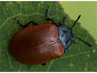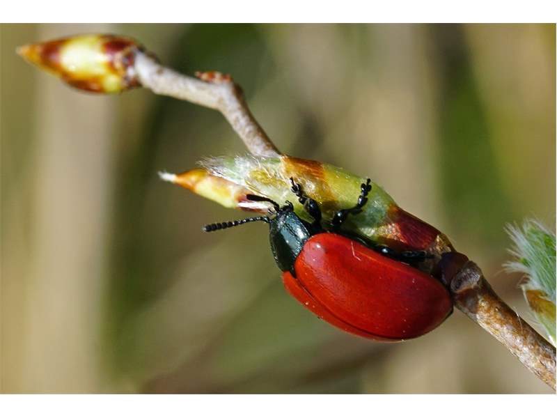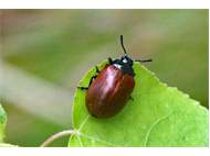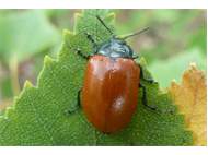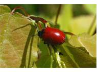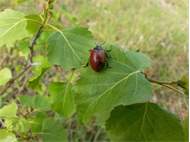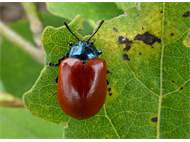 Pappelblattkäfer (Chrysomela populi) in der Gemarkung Hohenprießnitz, Sportplatz, nördlicher Waldrand, auf einer Espe (Populus tremula), April 2014 (© Michael Happ)( Bild vergrößern)