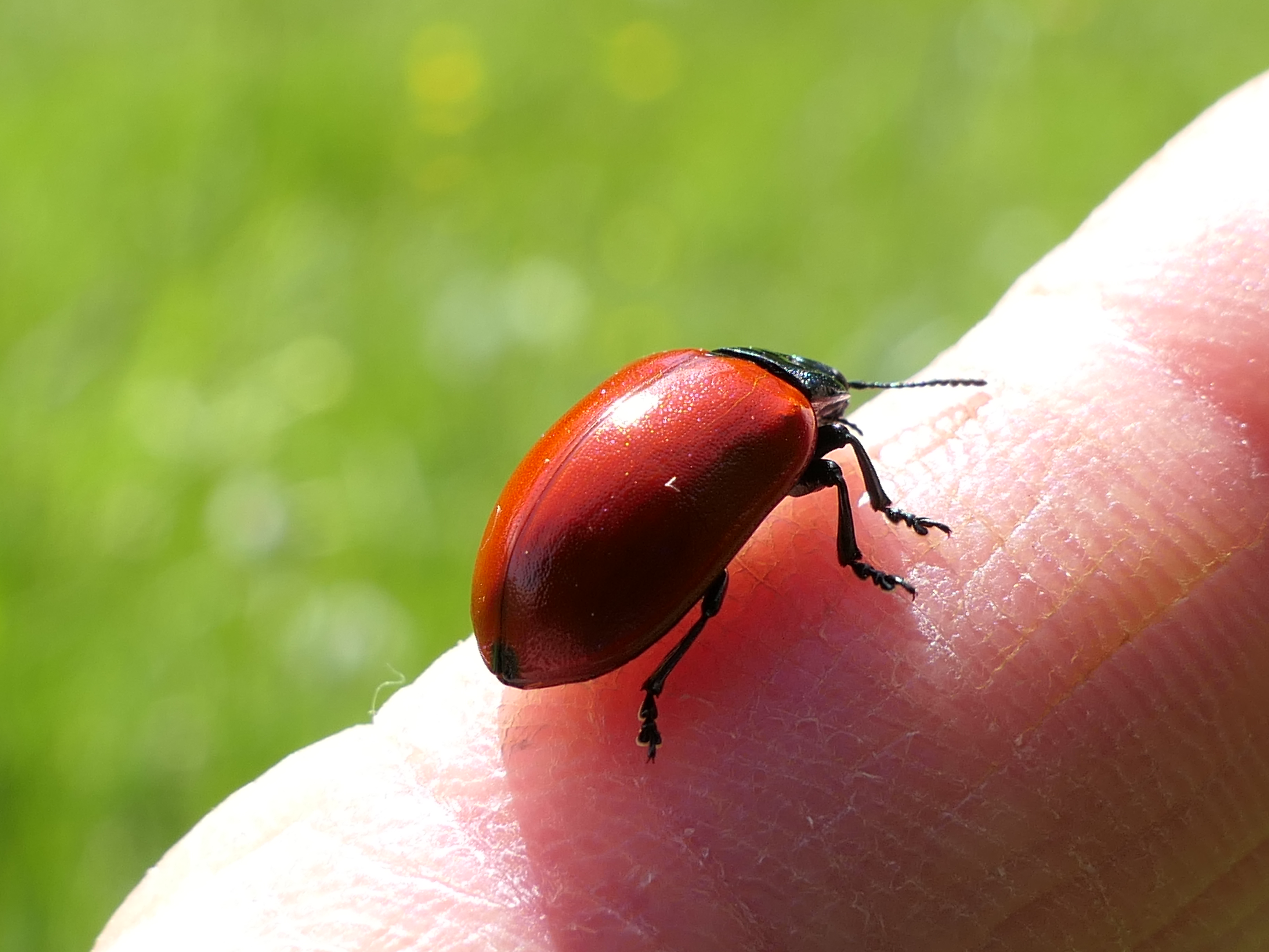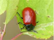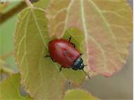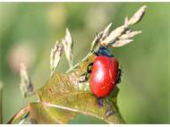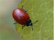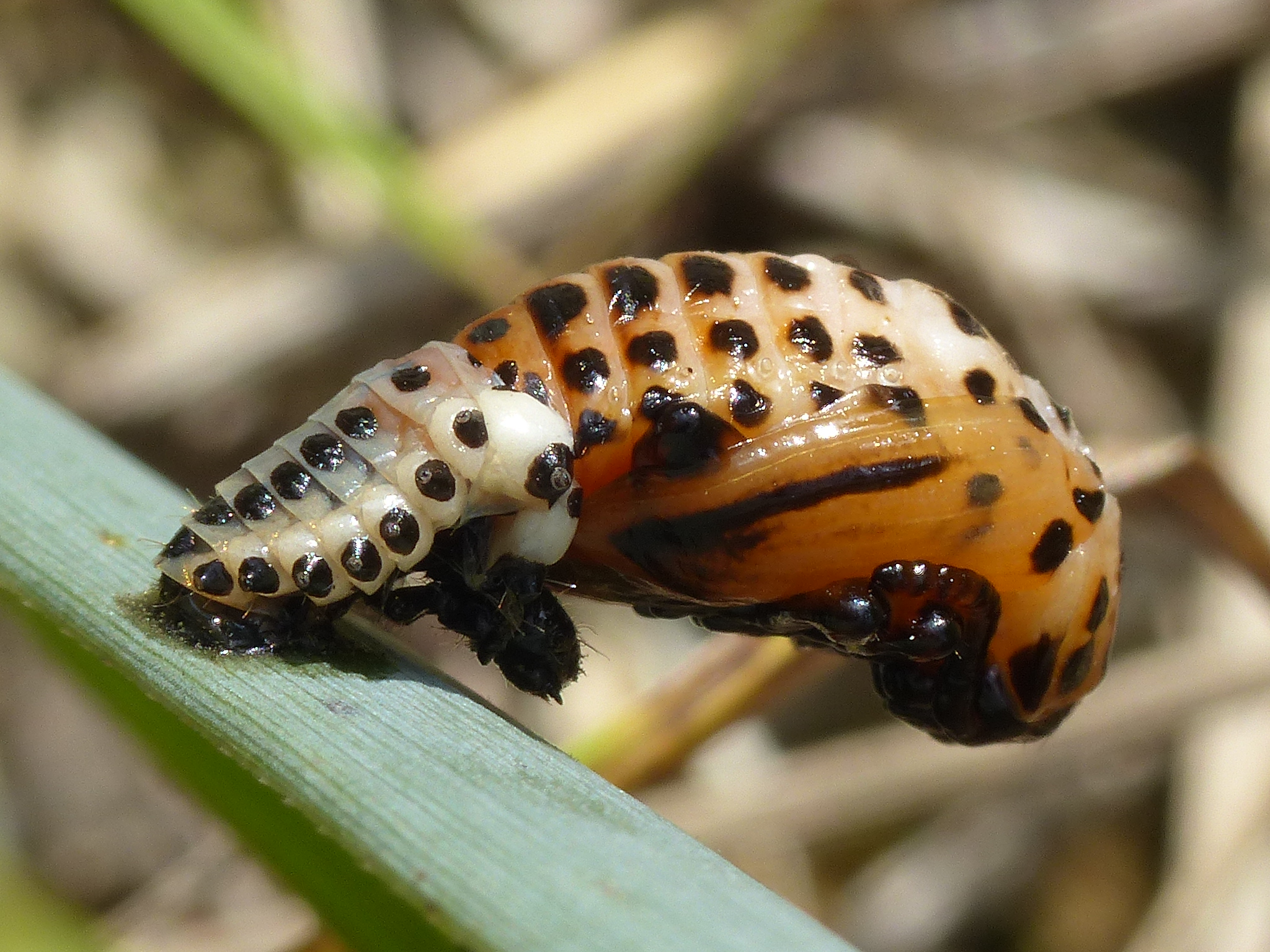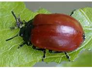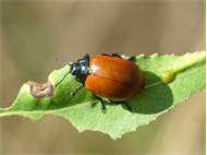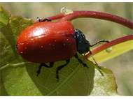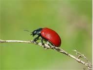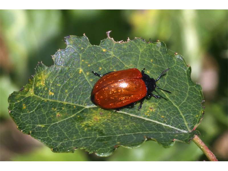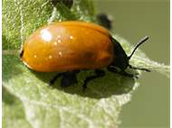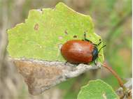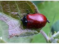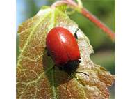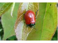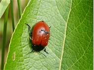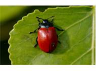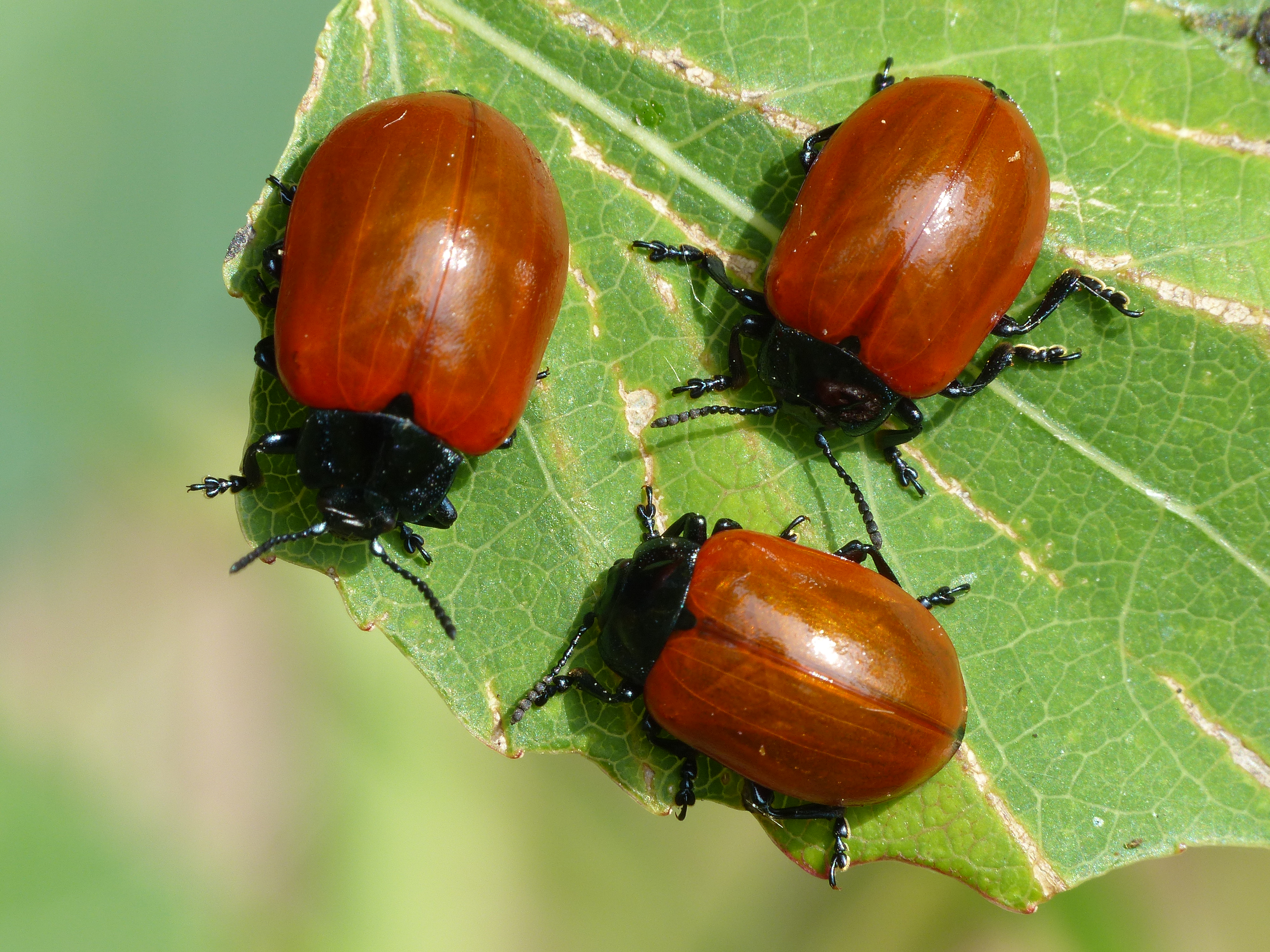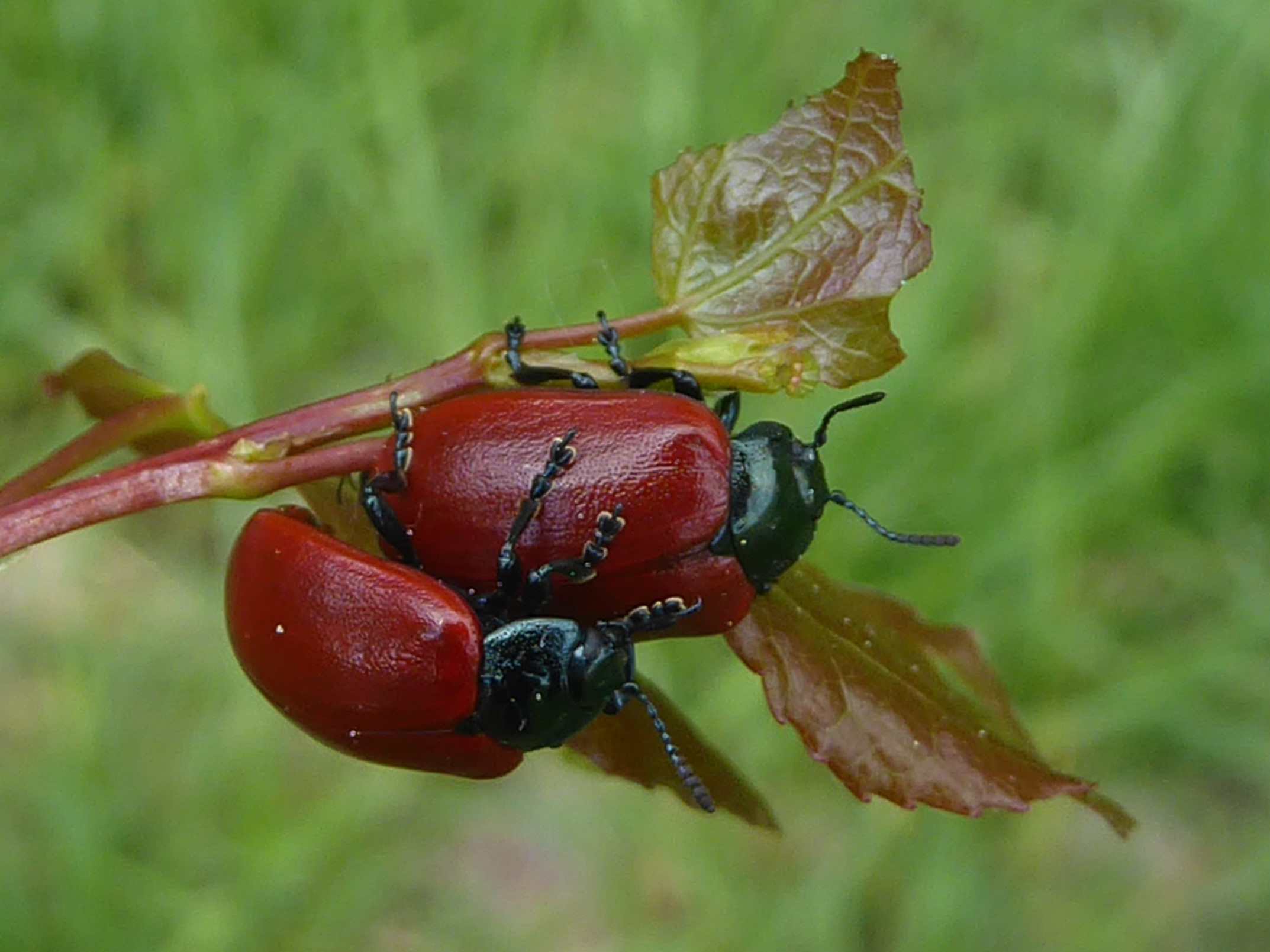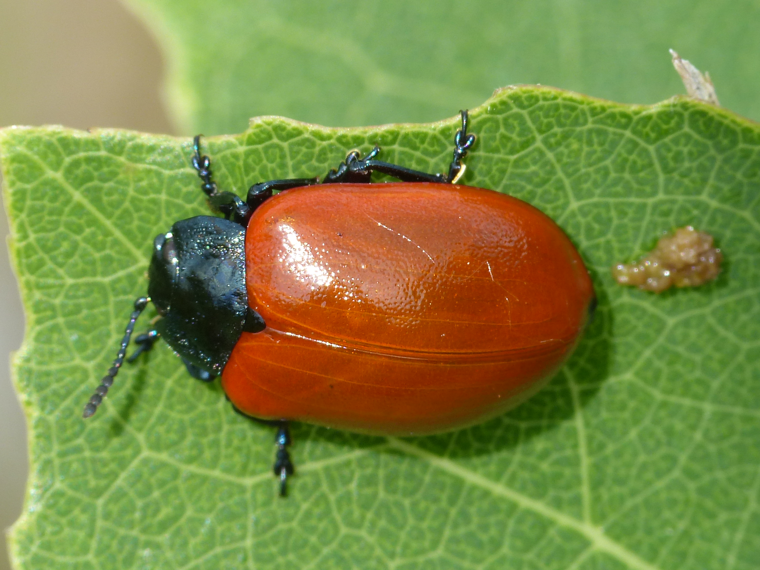 Pappelblattkäfer (Chrysomela populi) in der Gemarkung Hohenprießnitz, Sportplatz, nördlicher Waldrand, auf einer Espe (Populus tremula), April 2014 (© Michael Happ)( Bild vergrößern)