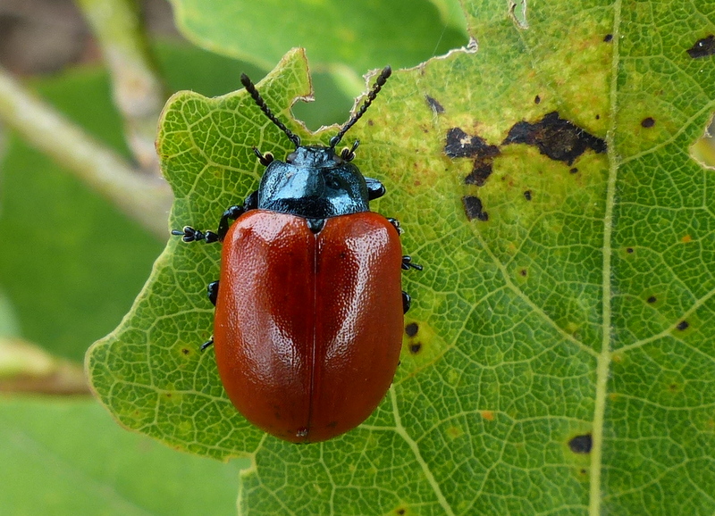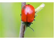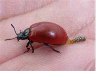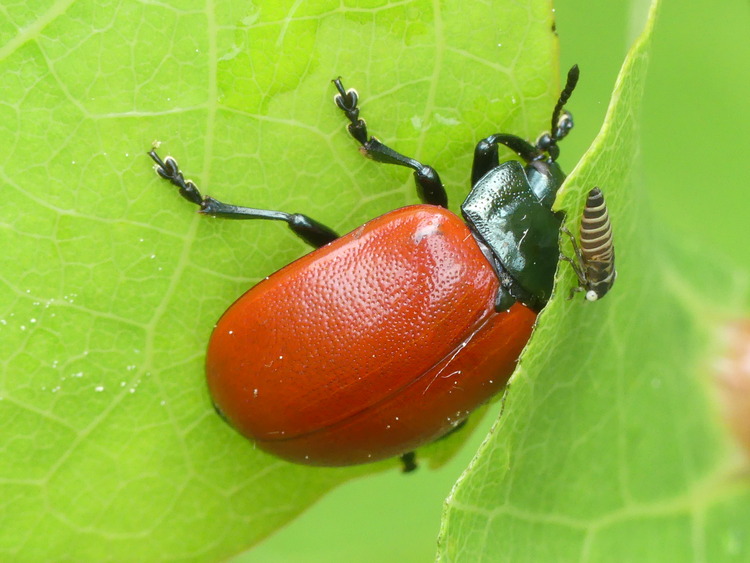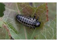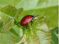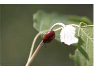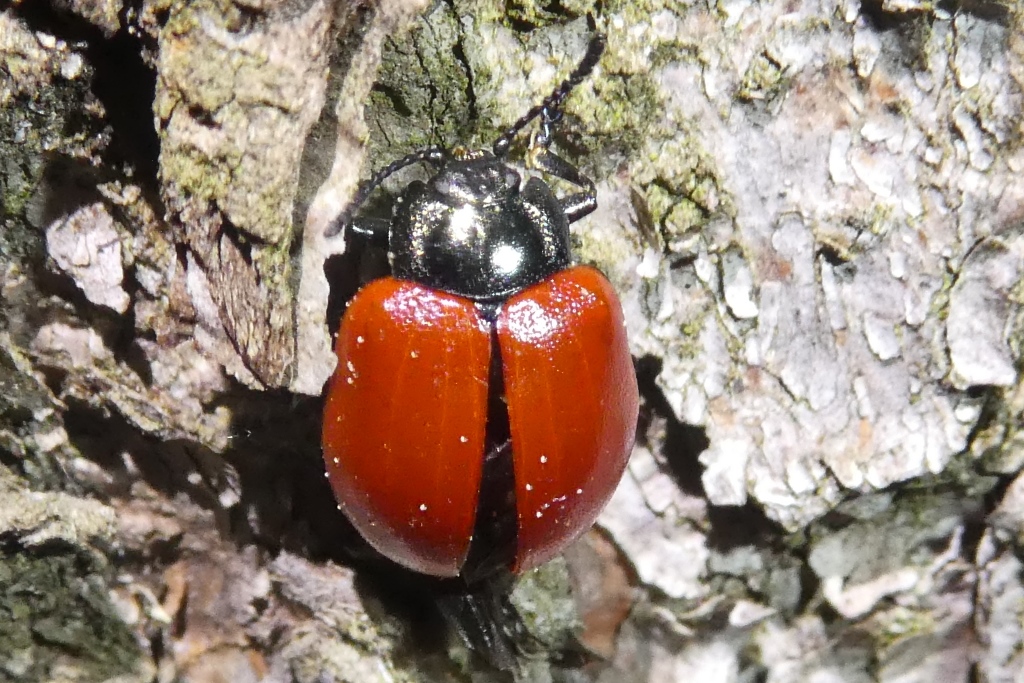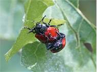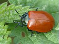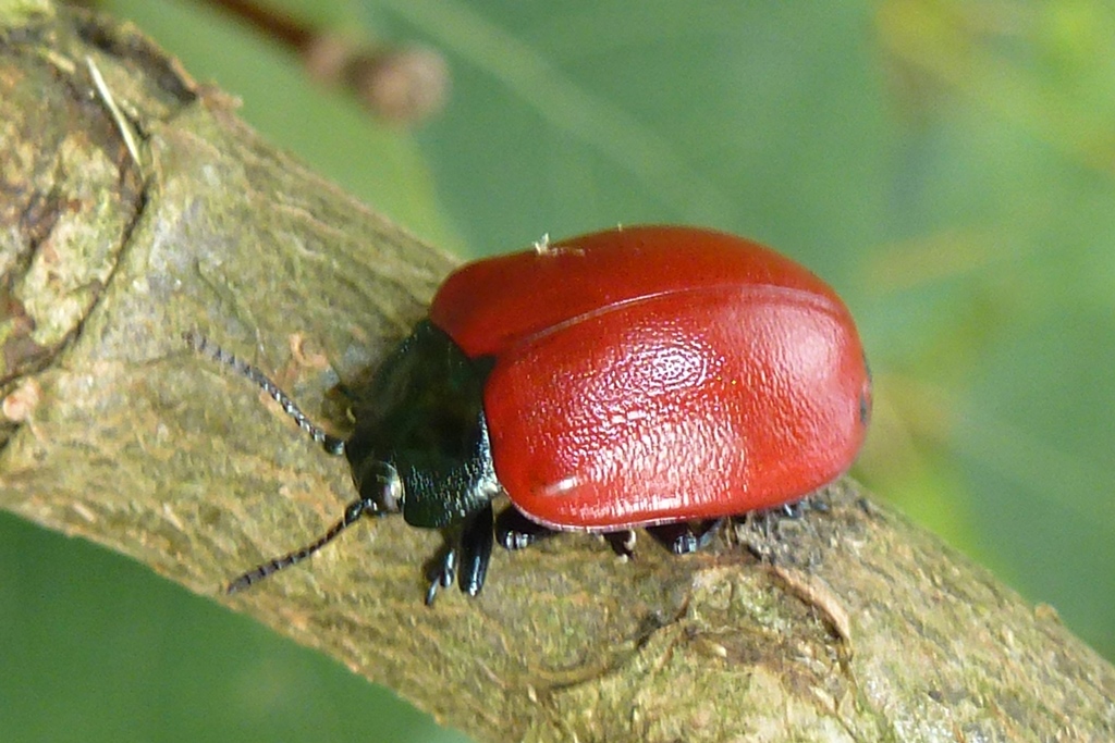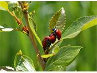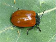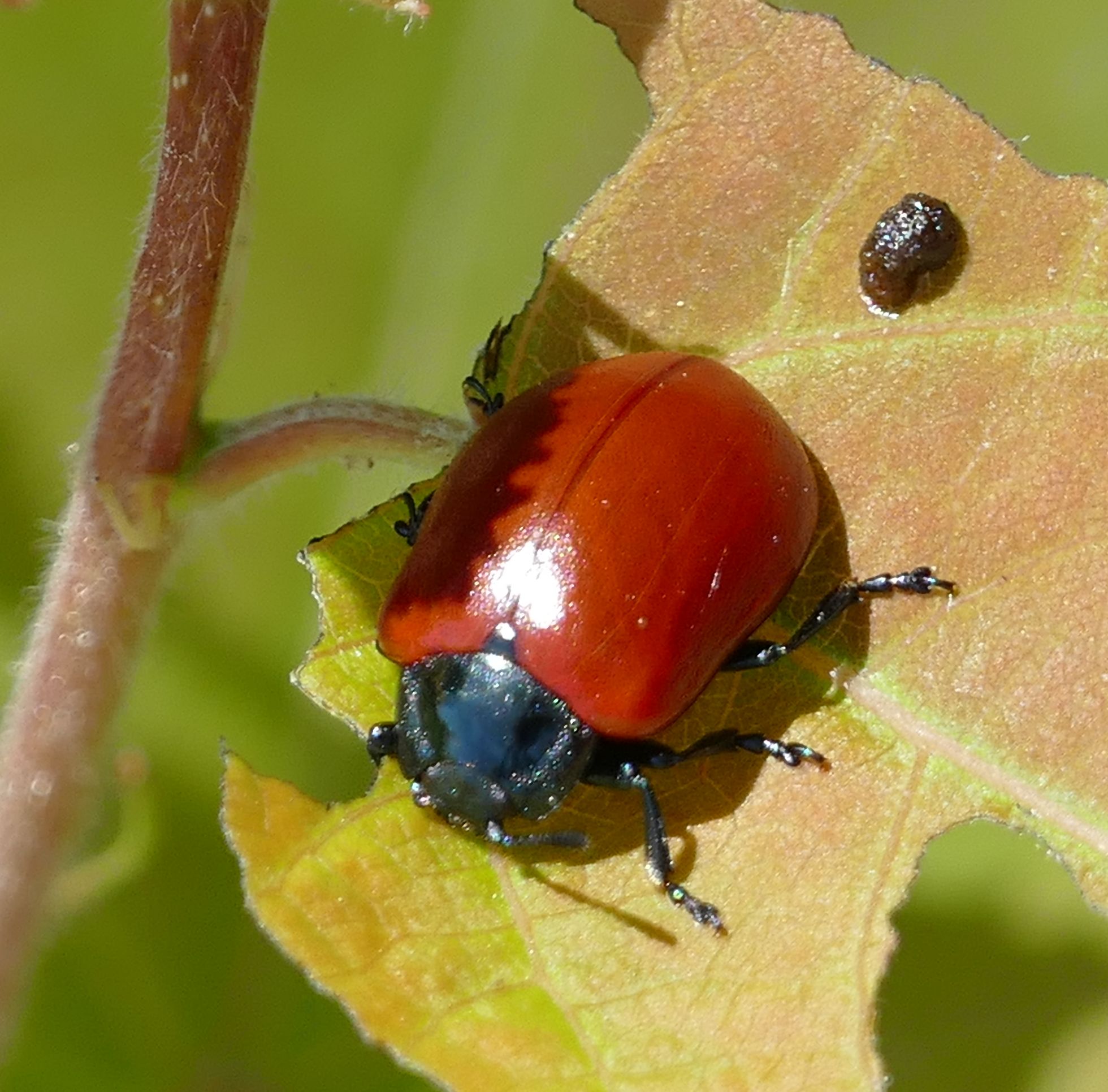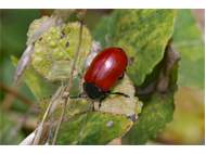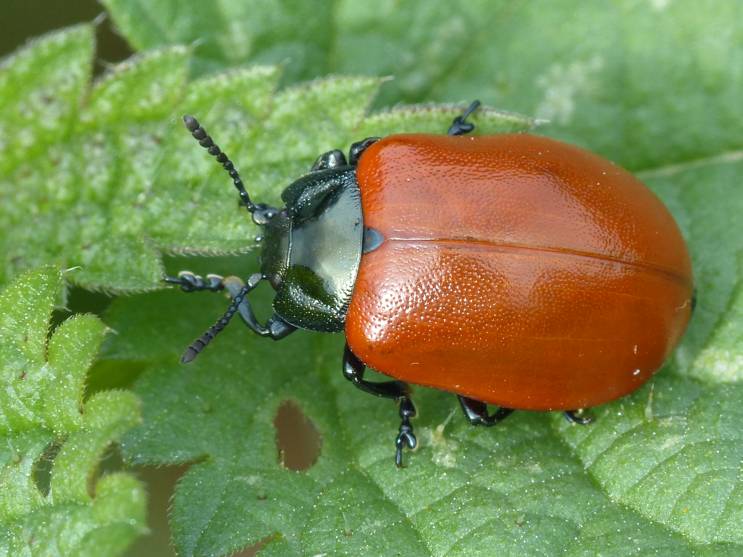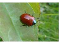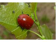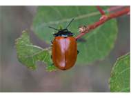 Pappelblattkäfer (Chrysomela populi) in der Gemarkung Hohenprießnitz, Sportplatz, nördlicher Waldrand, auf einer Espe (Populus tremula), April 2014 (© Michael Happ)( Bild vergrößern)
