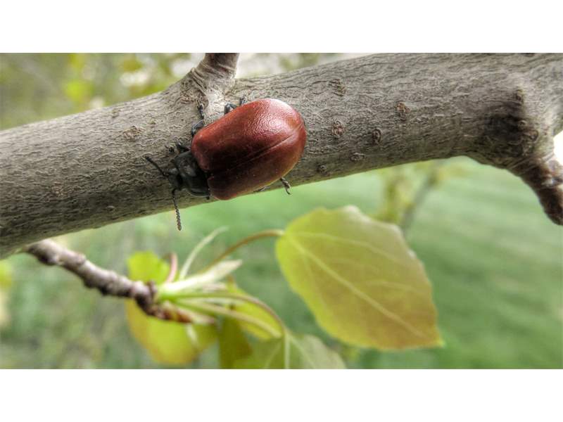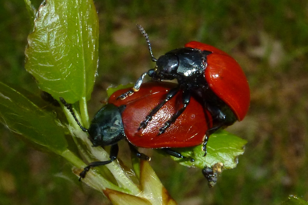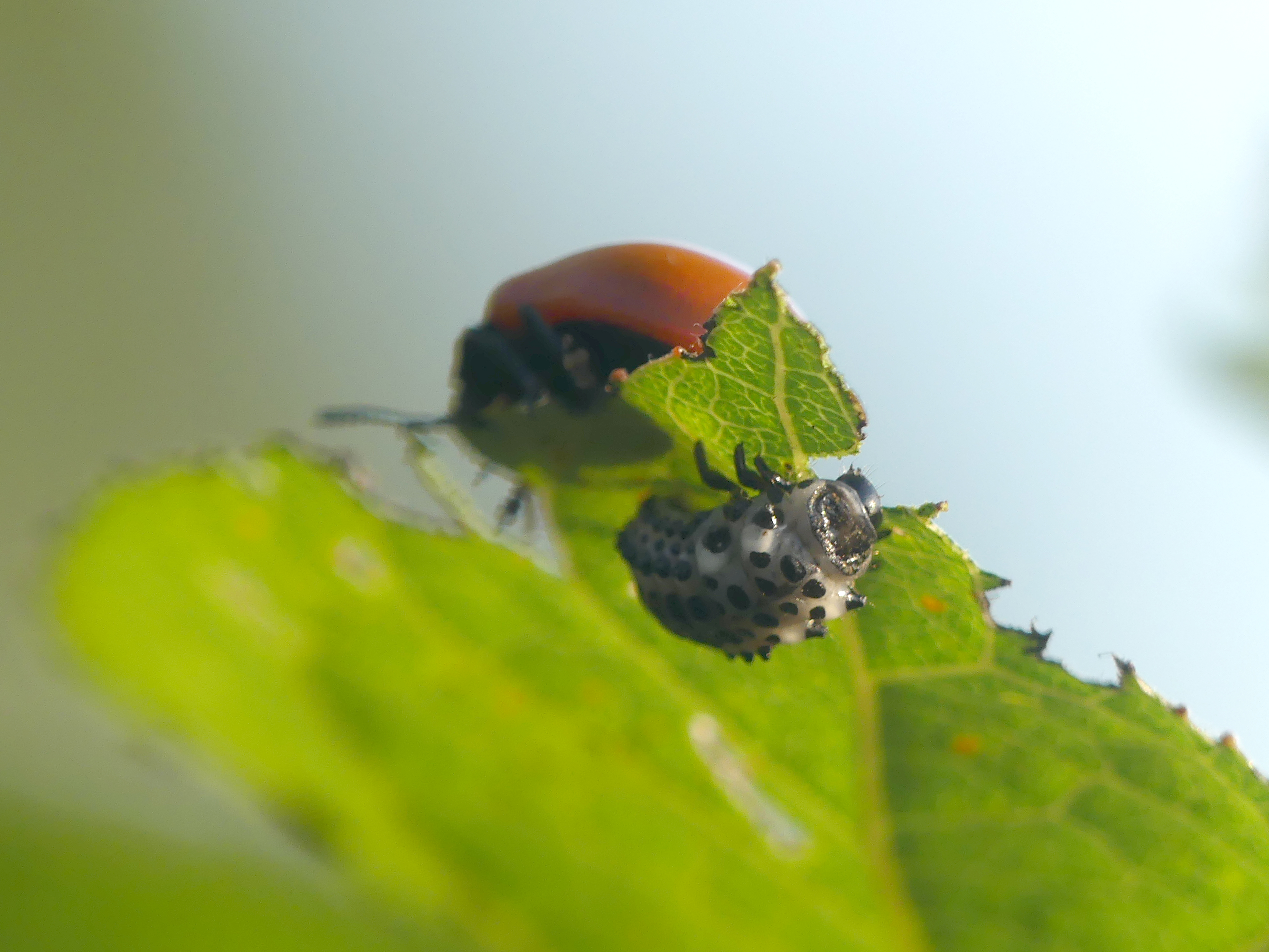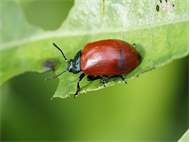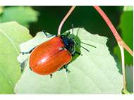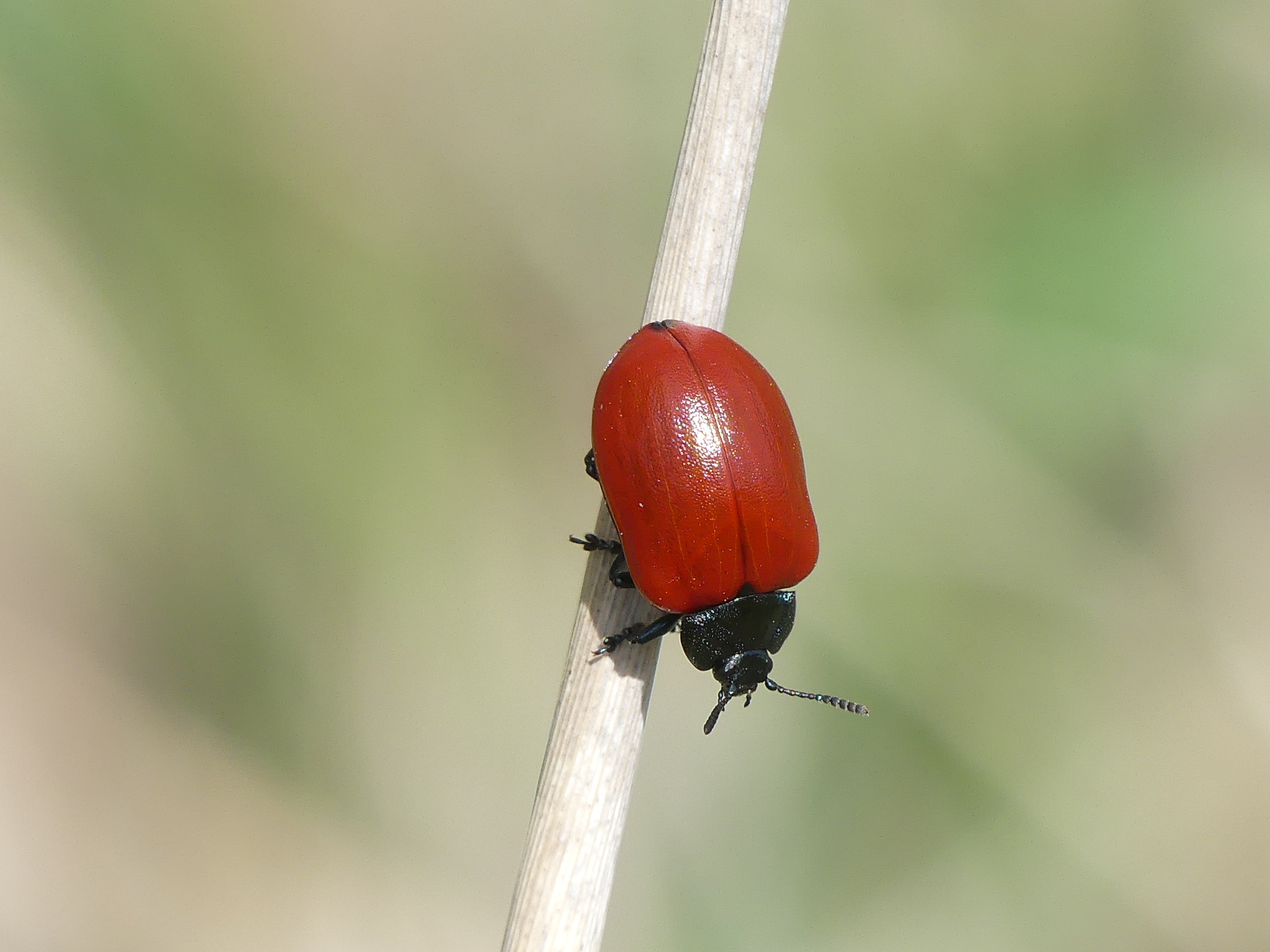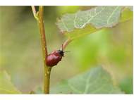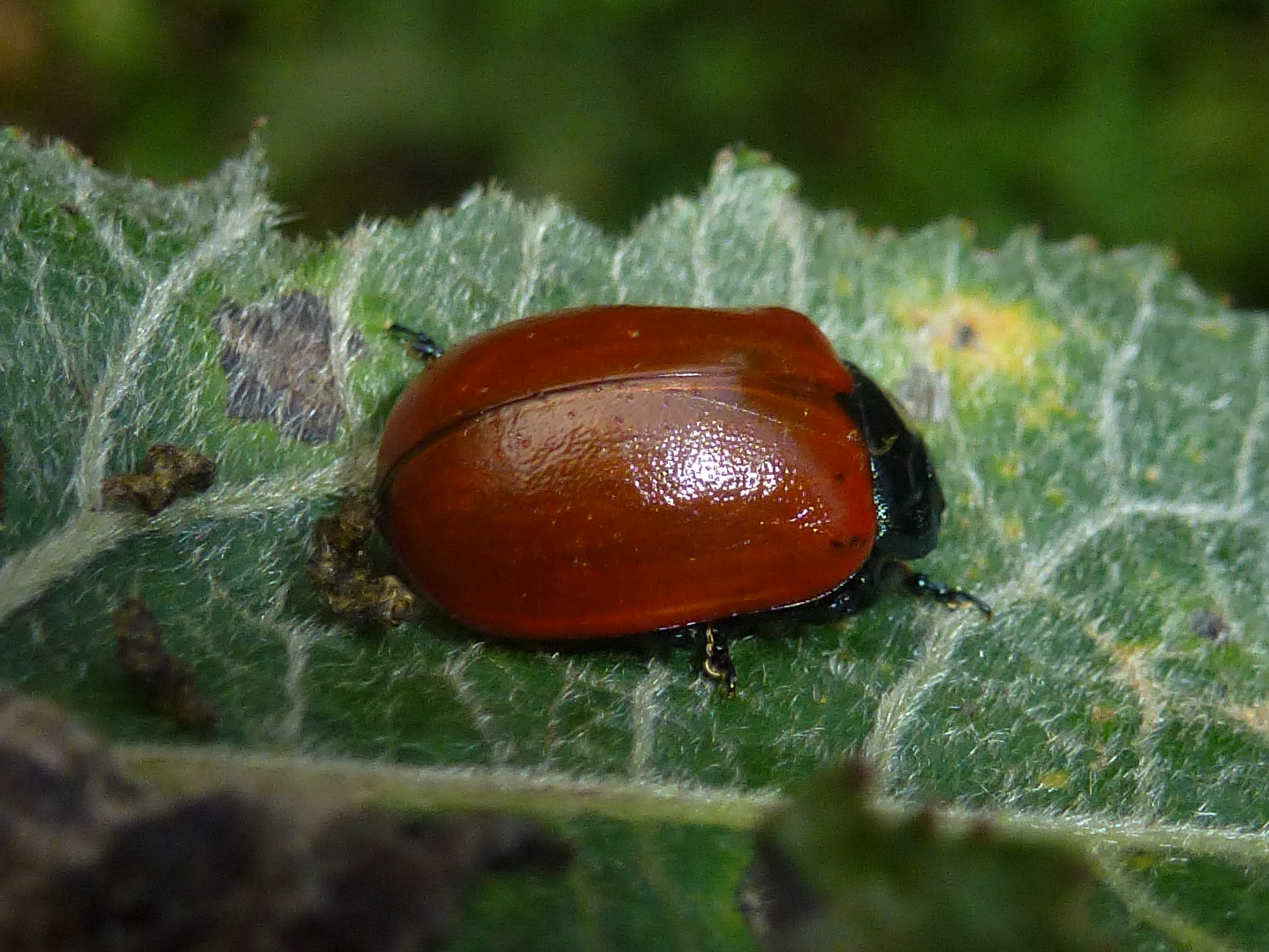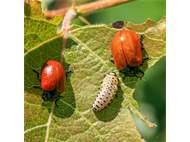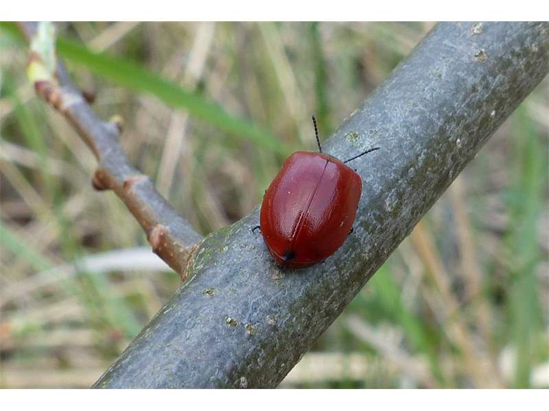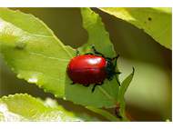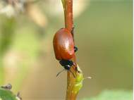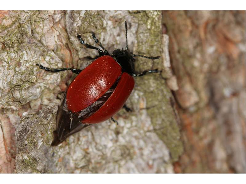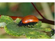 Pappelblattkäfer (Chrysomela populi) in der Gemarkung Hohenprießnitz, Sportplatz, nördlicher Waldrand, auf einer Espe (Populus tremula), April 2014 (© Michael Happ)( Bild vergrößern)