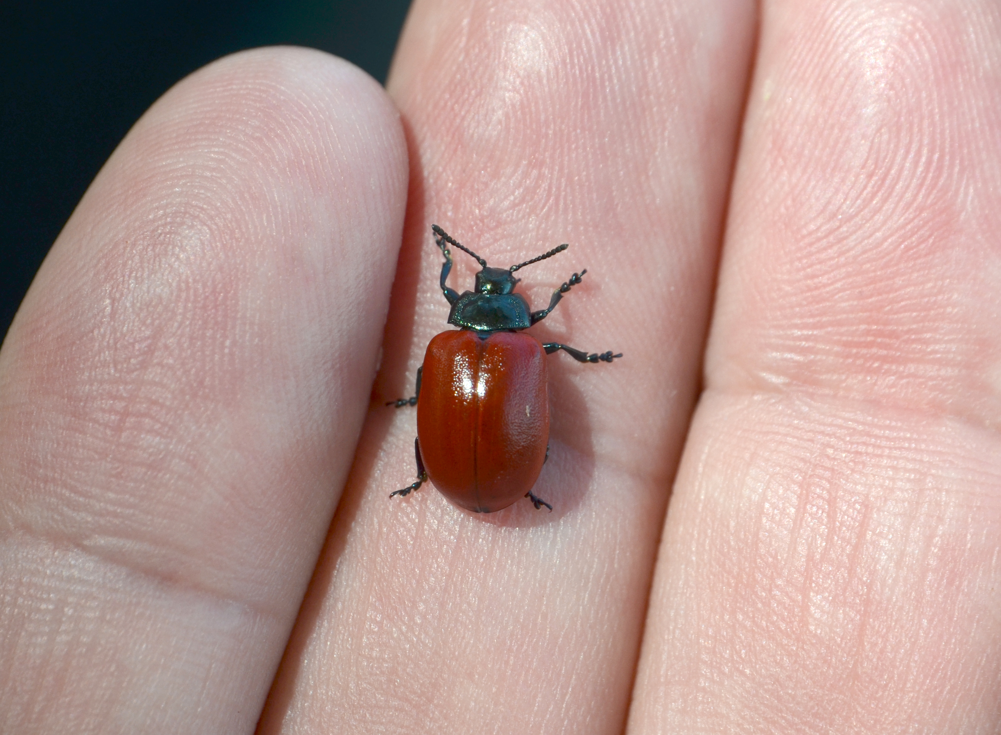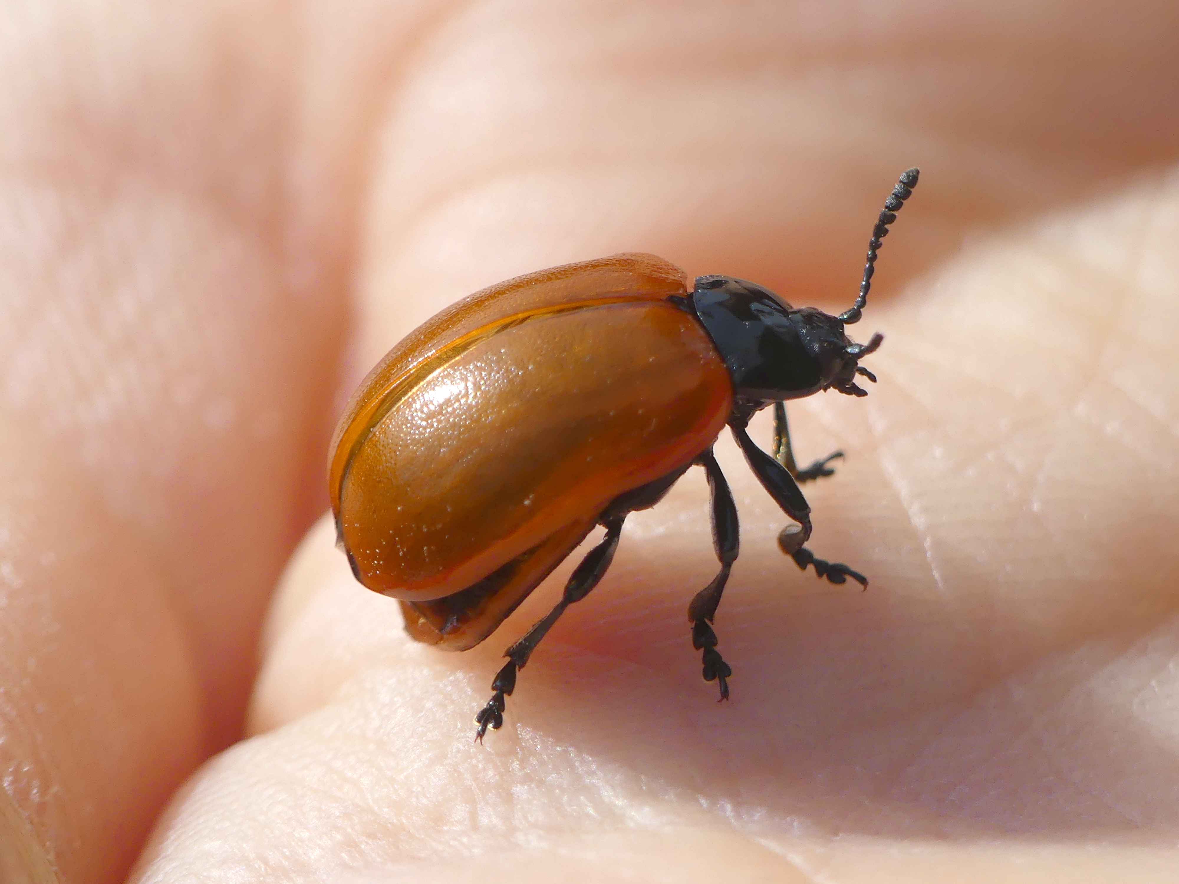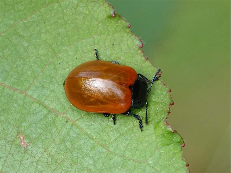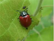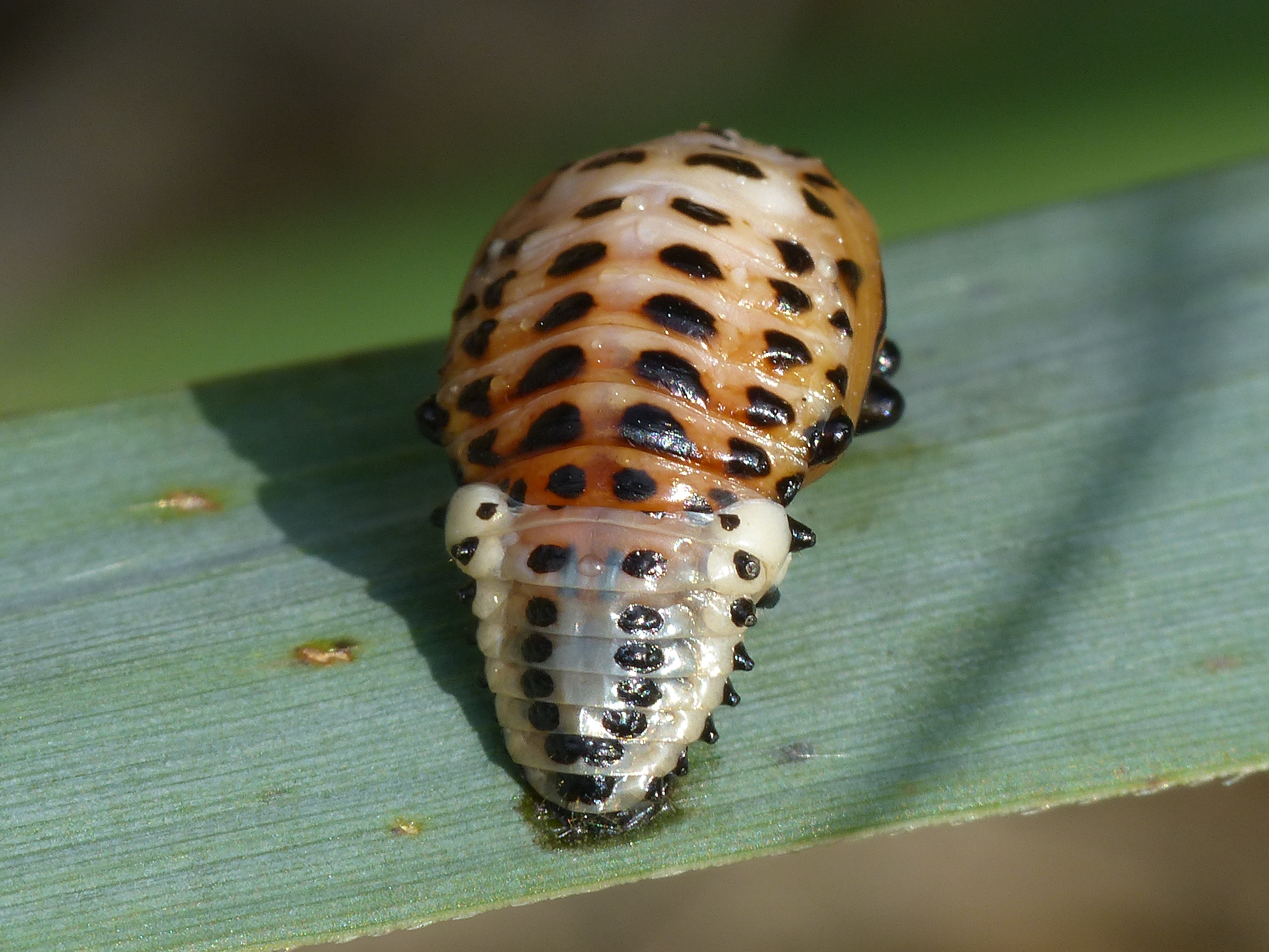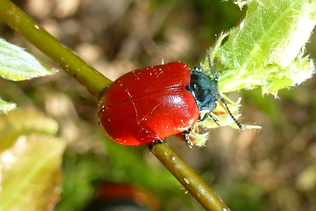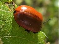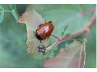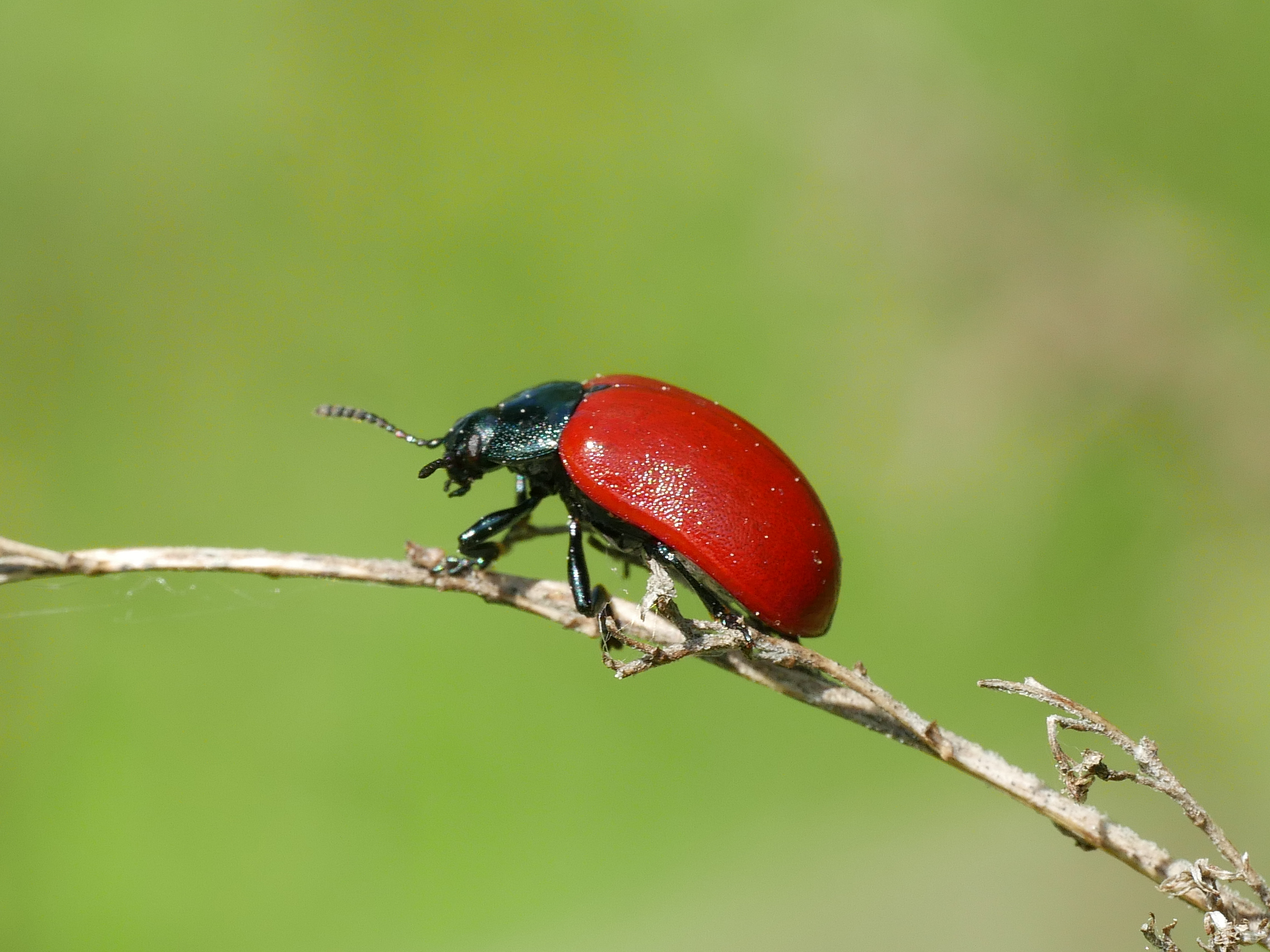 Pappelblattkäfer (Chrysomela populi) in der Gemarkung Hohenprießnitz, Sportplatz, nördlicher Waldrand, auf einer Espe (Populus tremula), April 2014 (© Michael Happ)( Bild vergrößern)