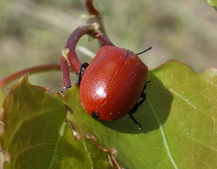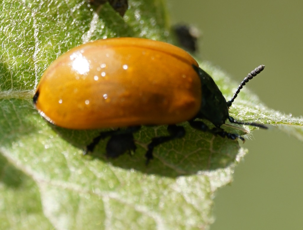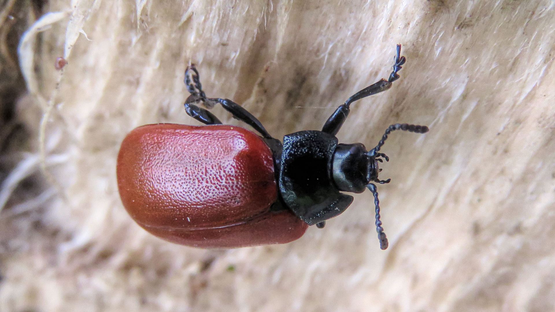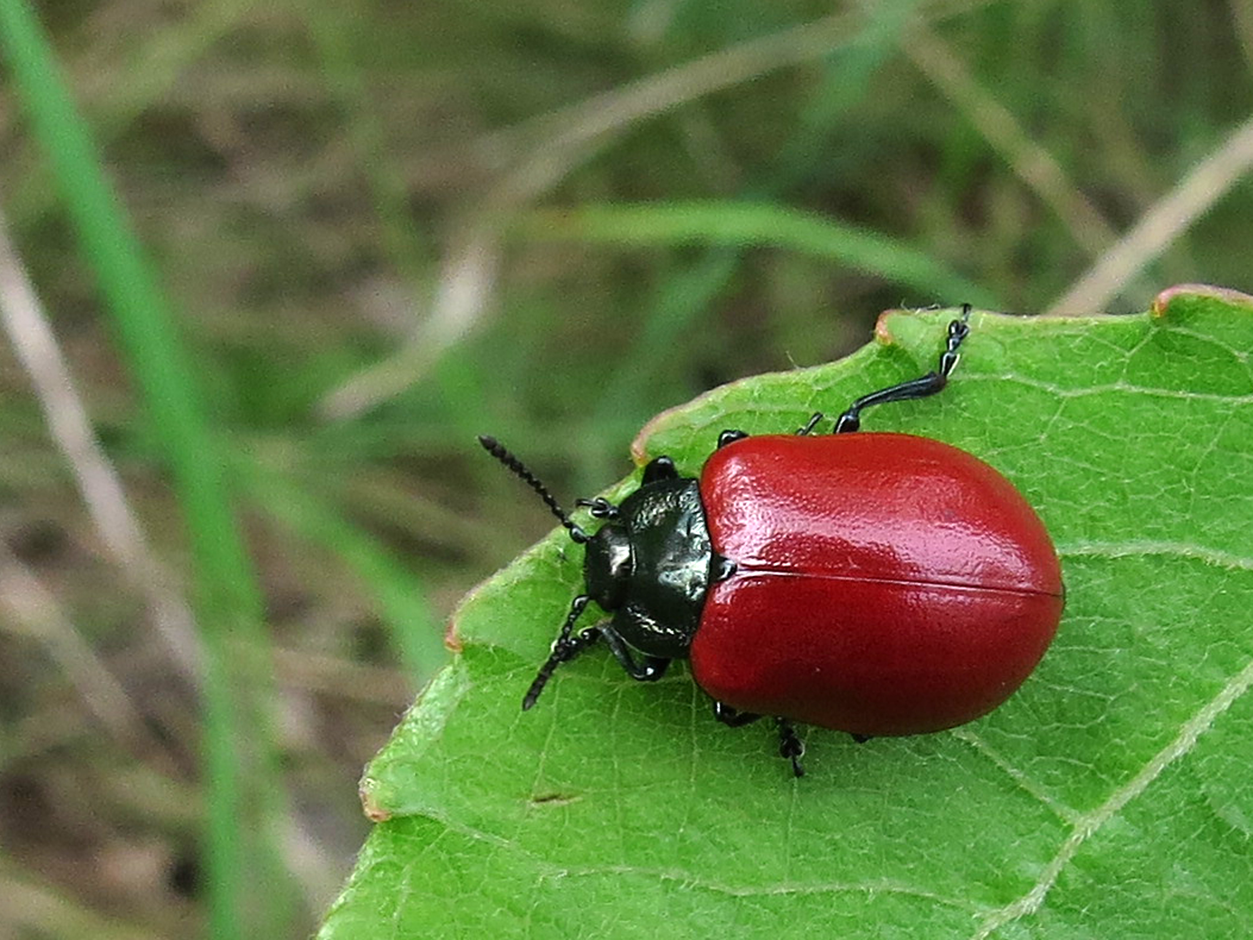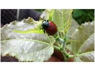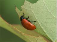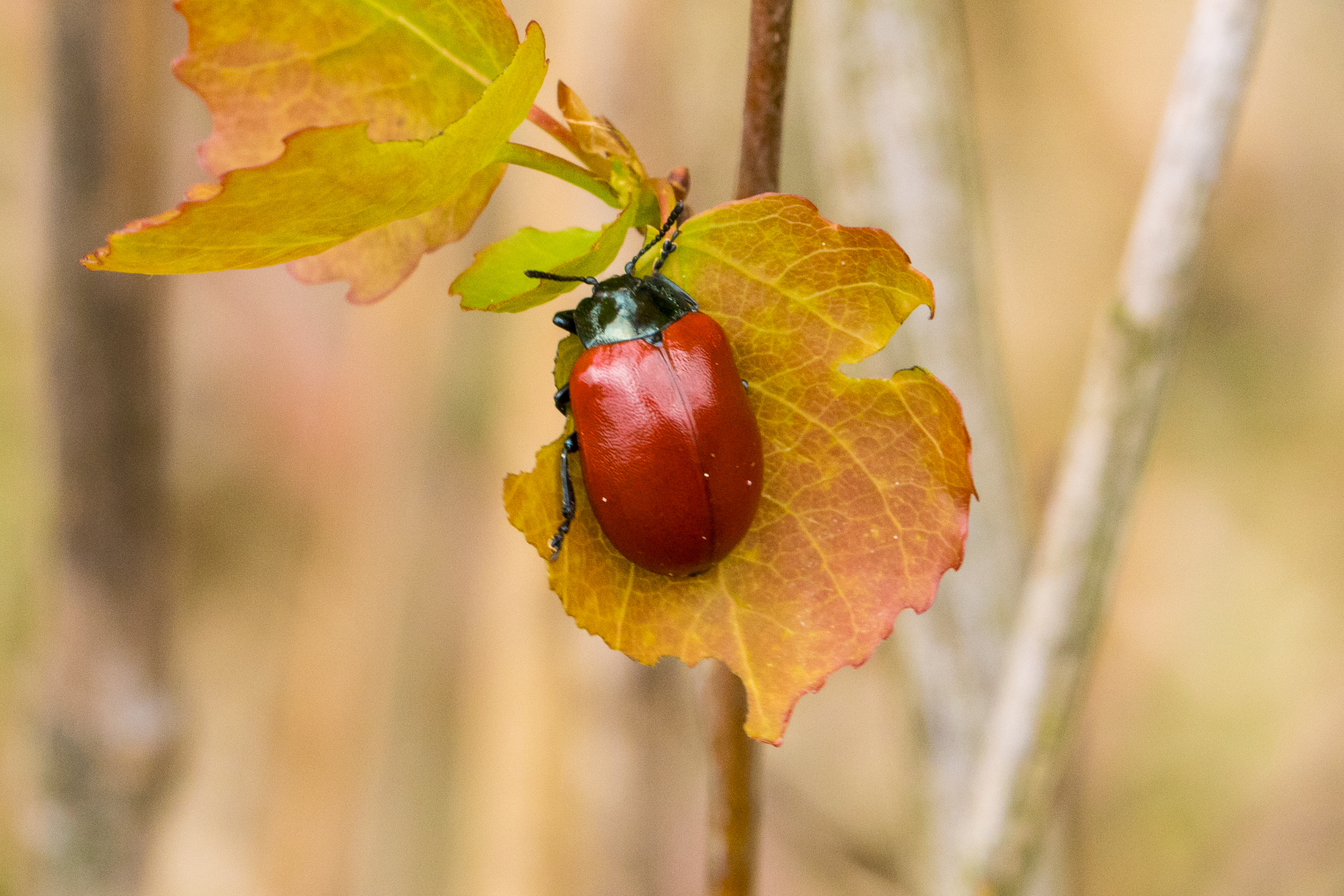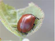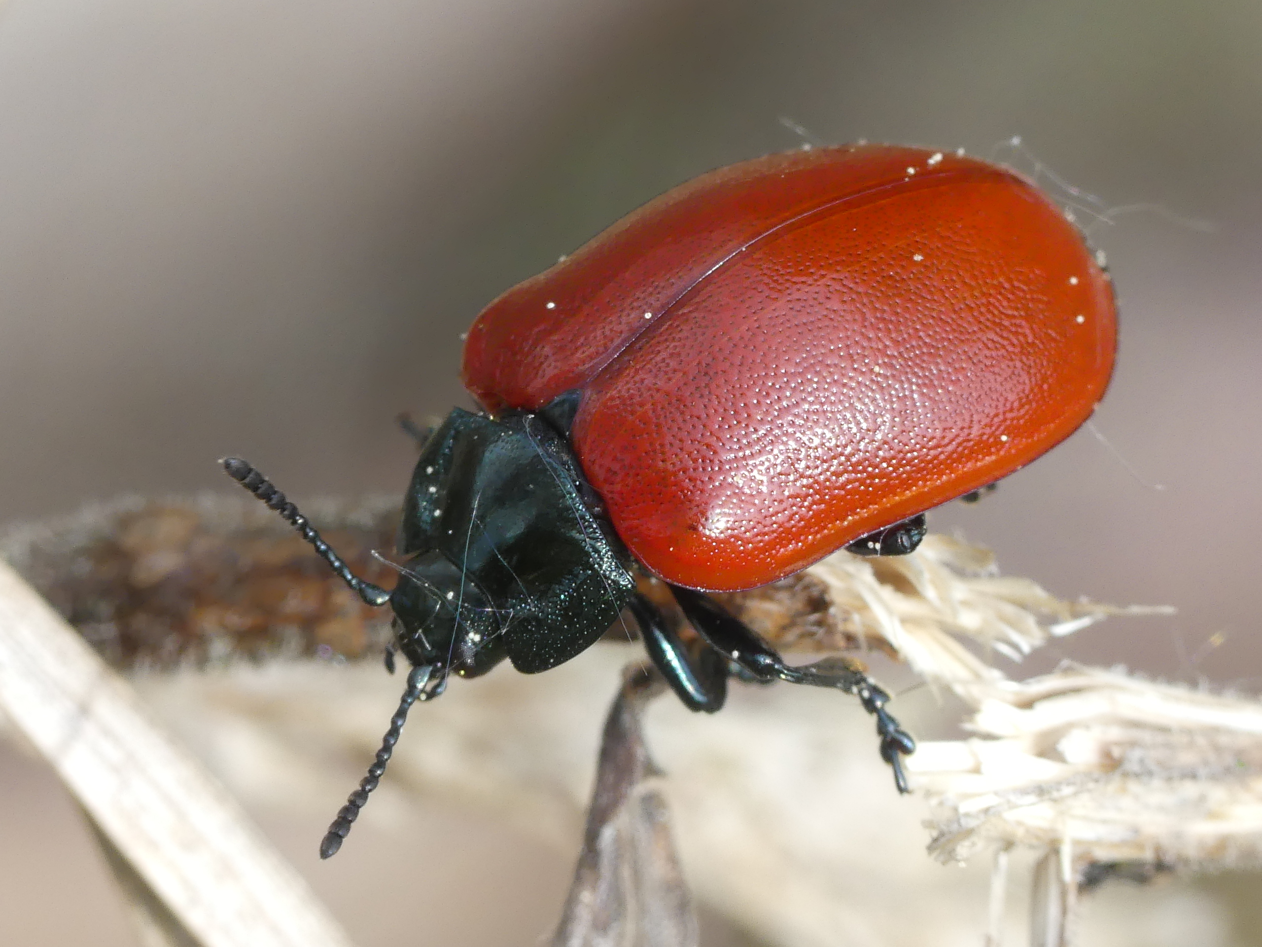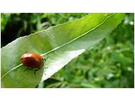 Pappelblattkäfer (Chrysomela populi) in der Gemarkung Hohenprießnitz, Sportplatz, nördlicher Waldrand, auf einer Espe (Populus tremula), April 2014 (© Michael Happ)( Bild vergrößern)