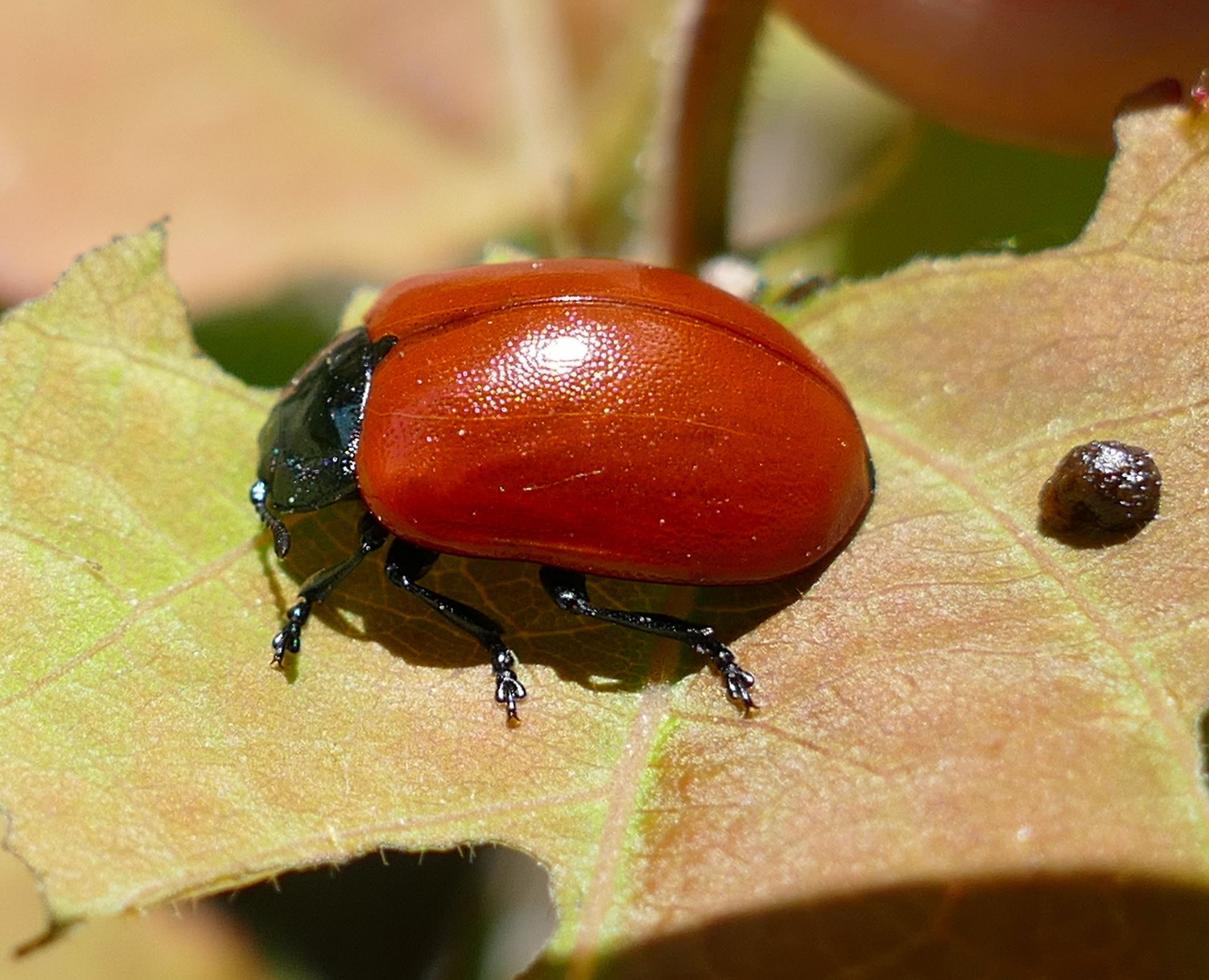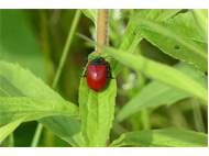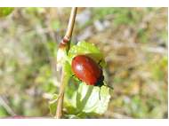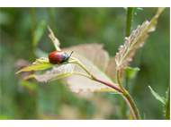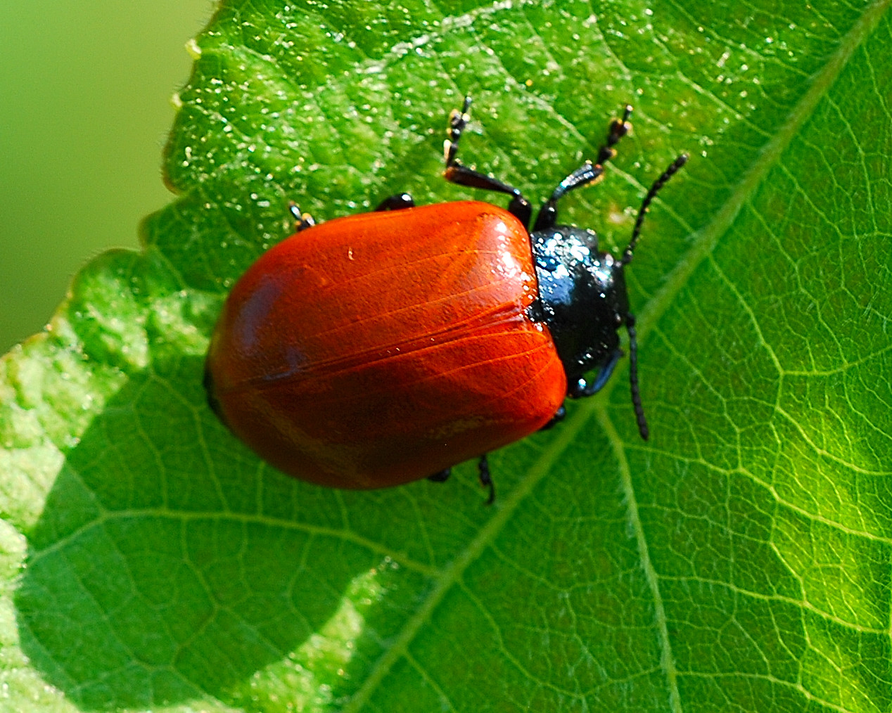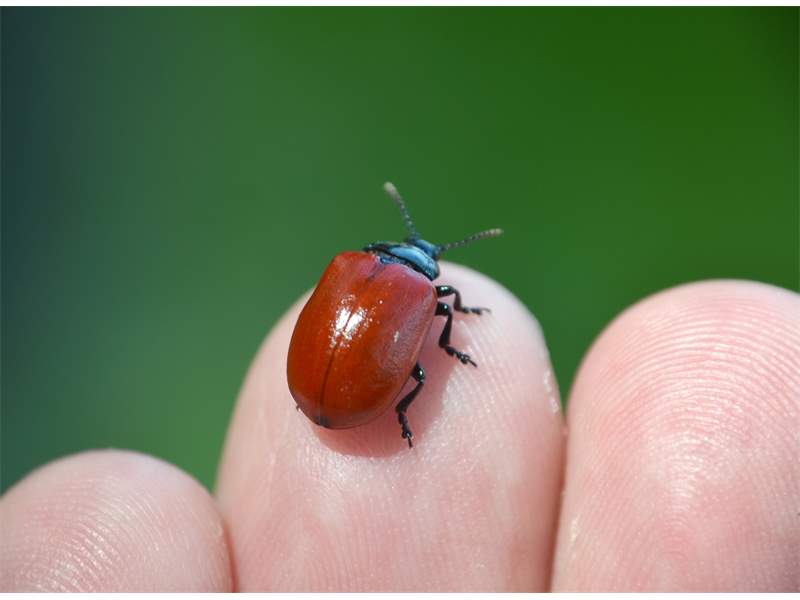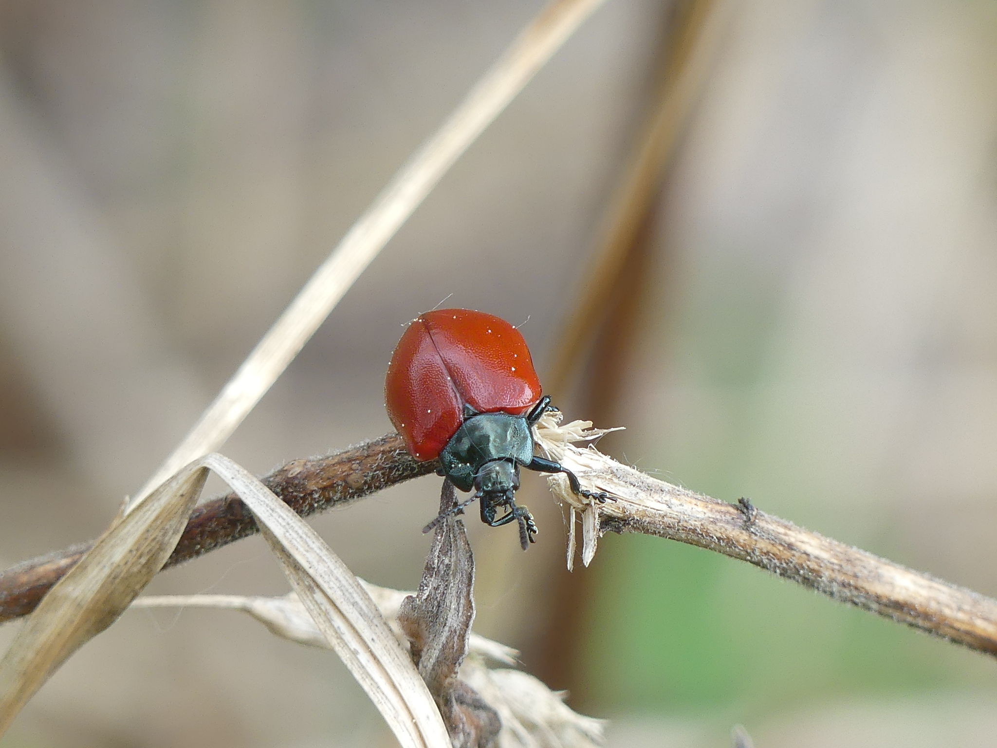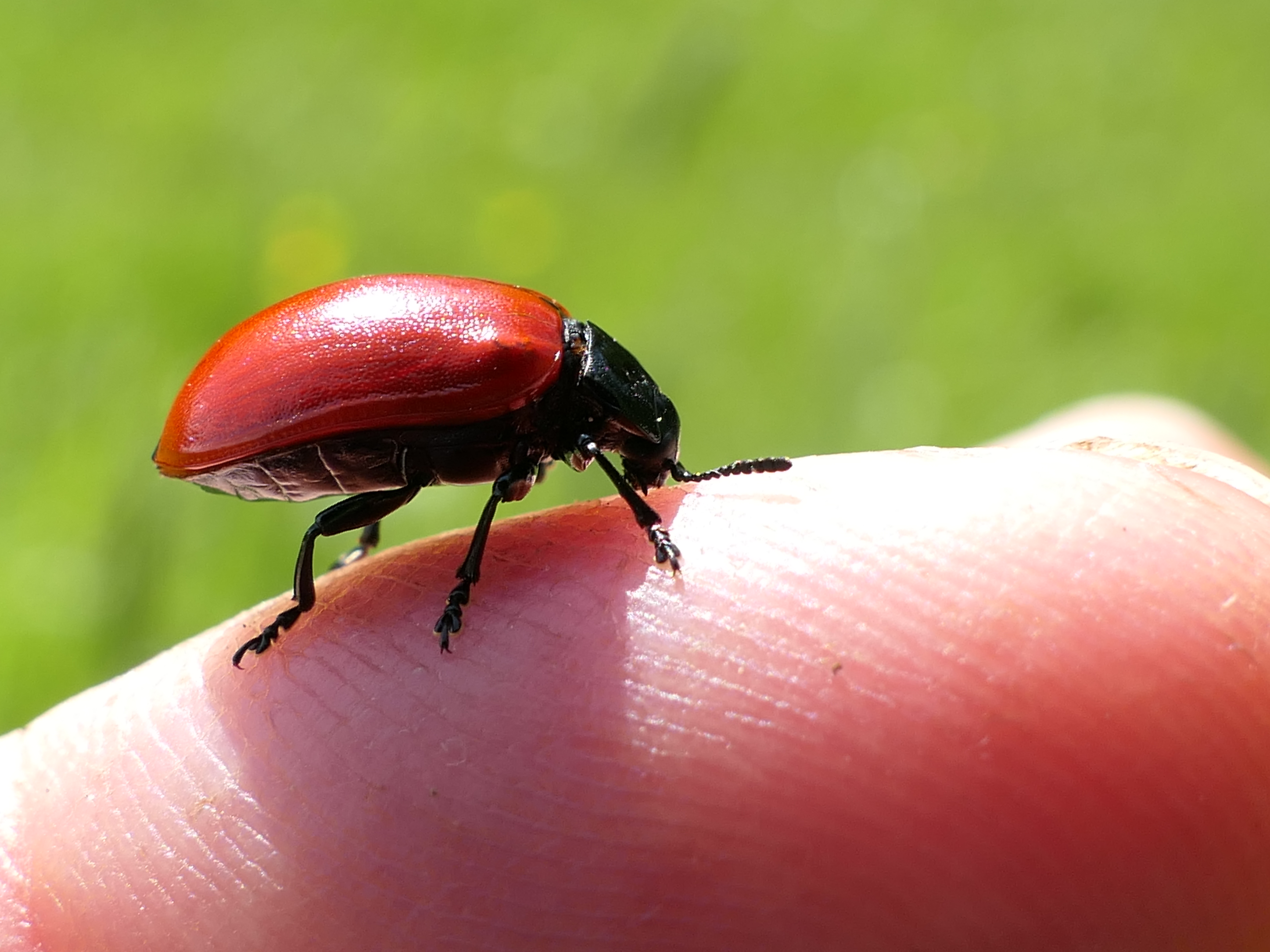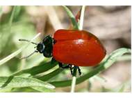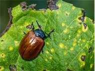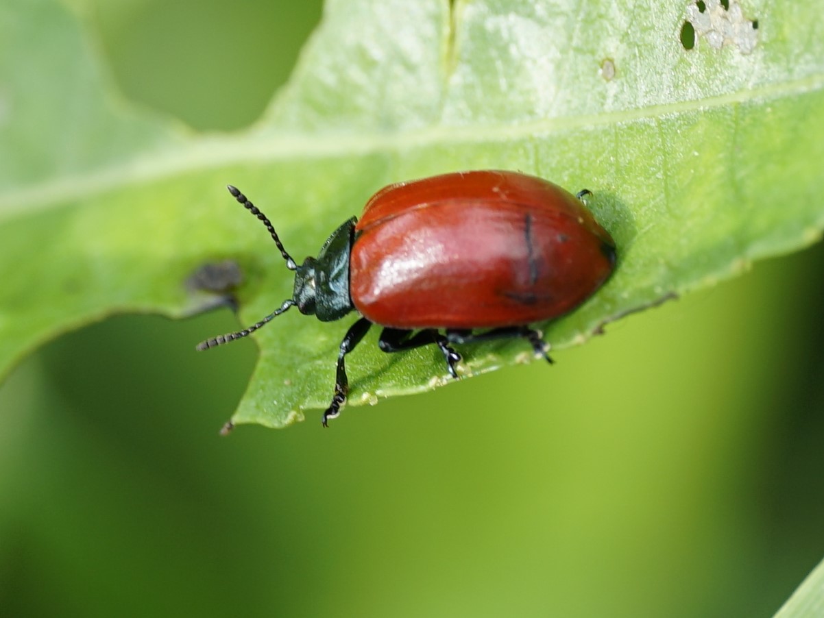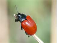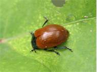 Pappelblattkäfer (Chrysomela populi) in der Gemarkung Hohenprießnitz, Sportplatz, nördlicher Waldrand, auf einer Espe (Populus tremula), April 2014 (© Michael Happ)( Bild vergrößern)