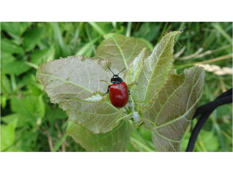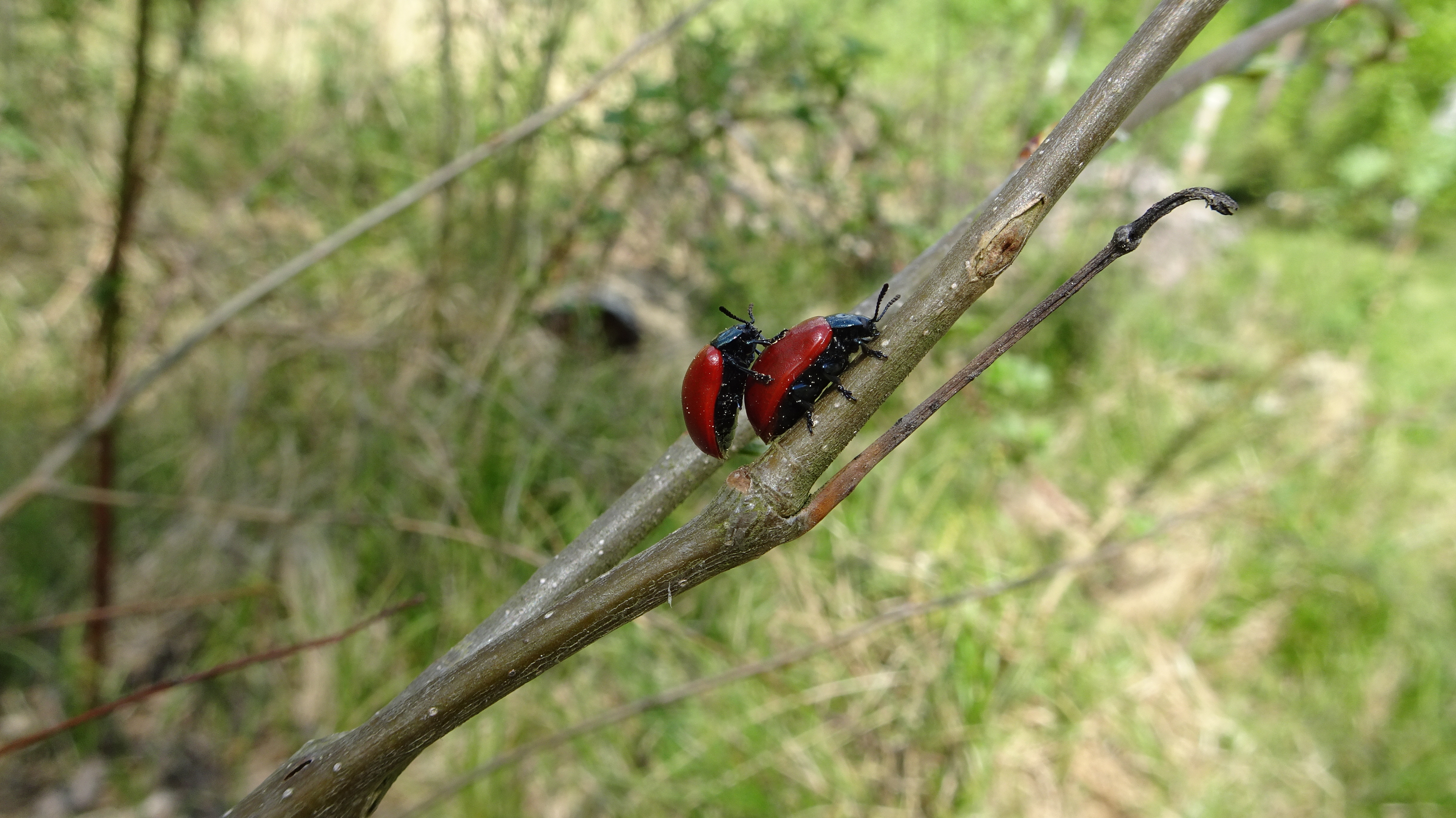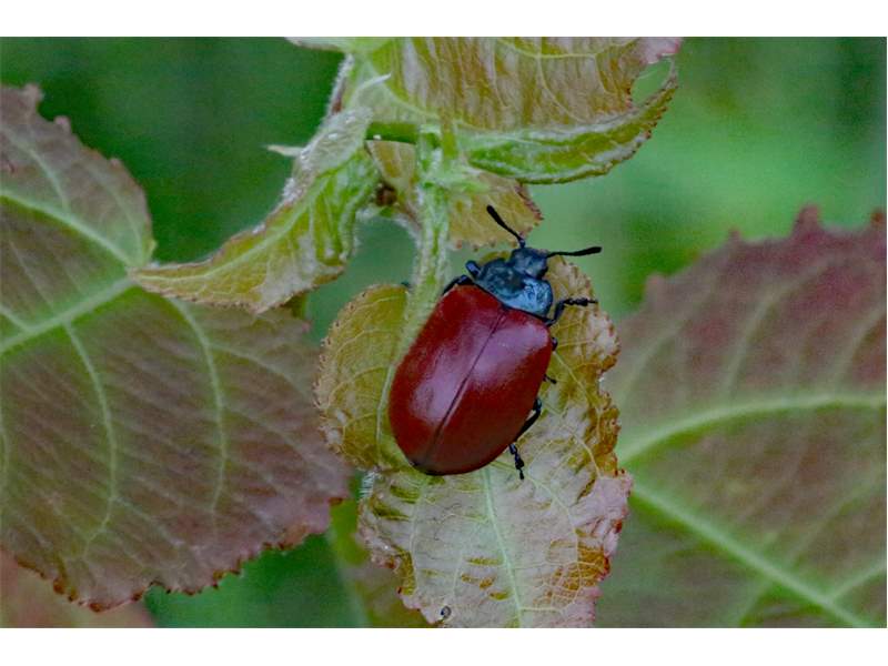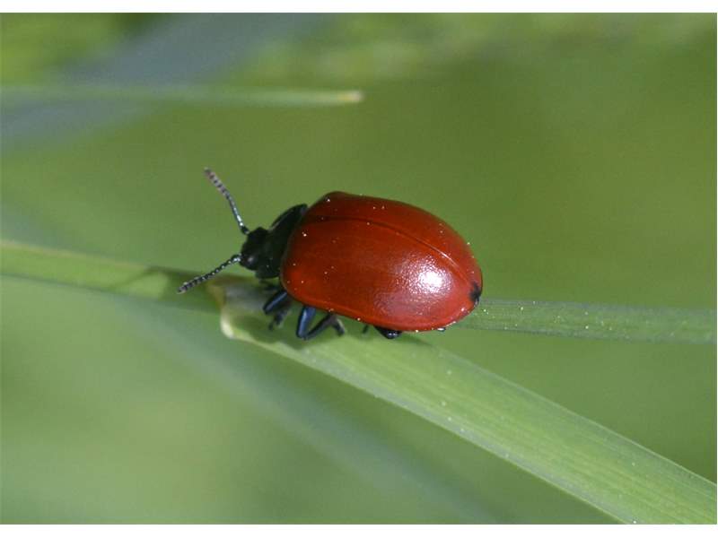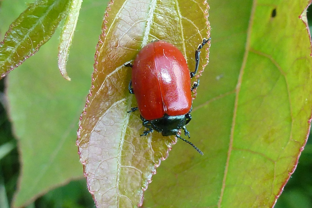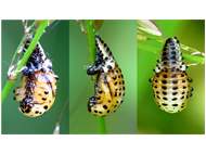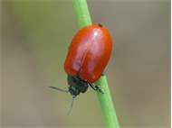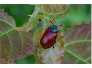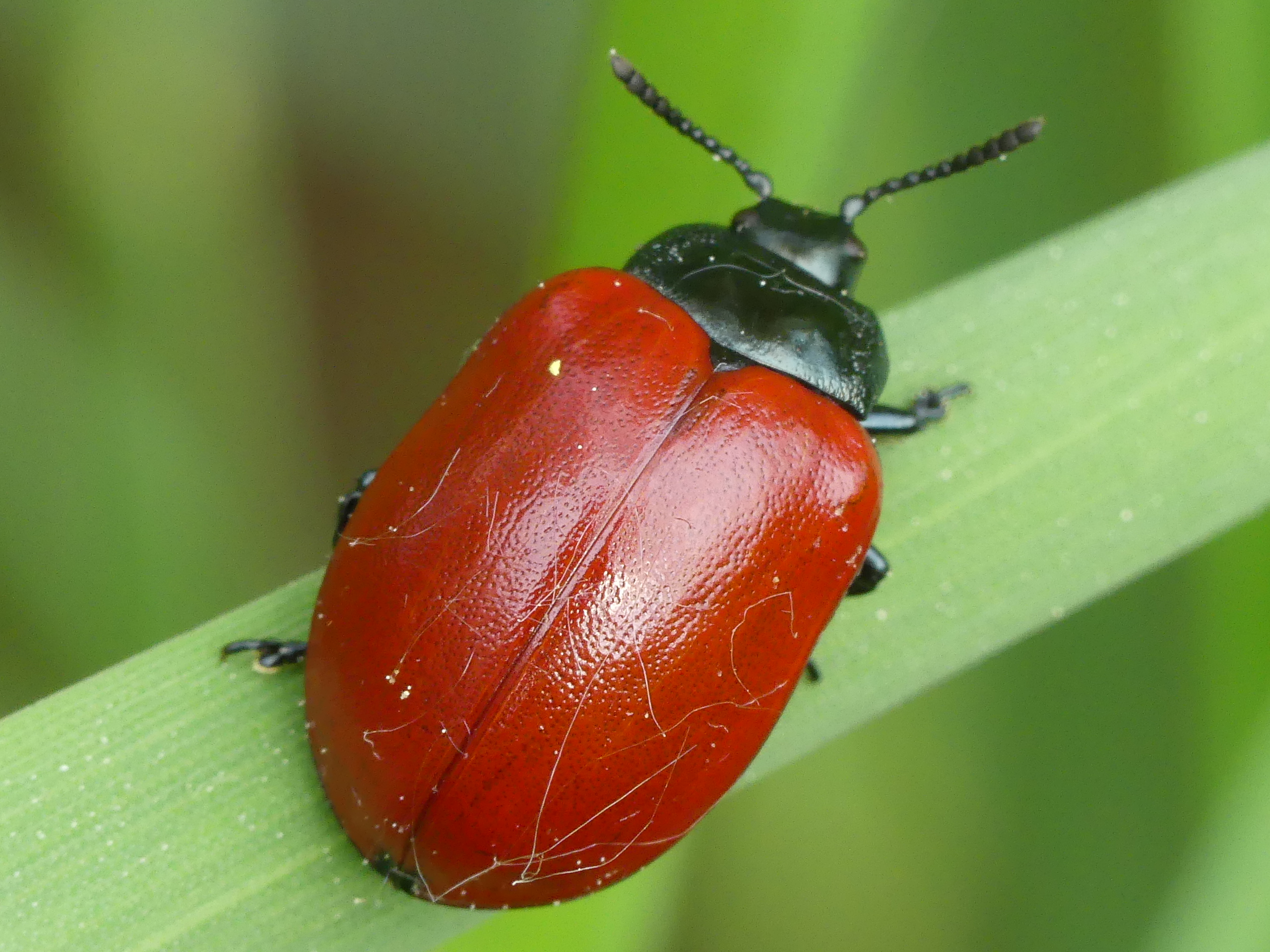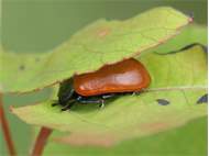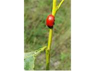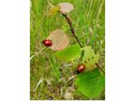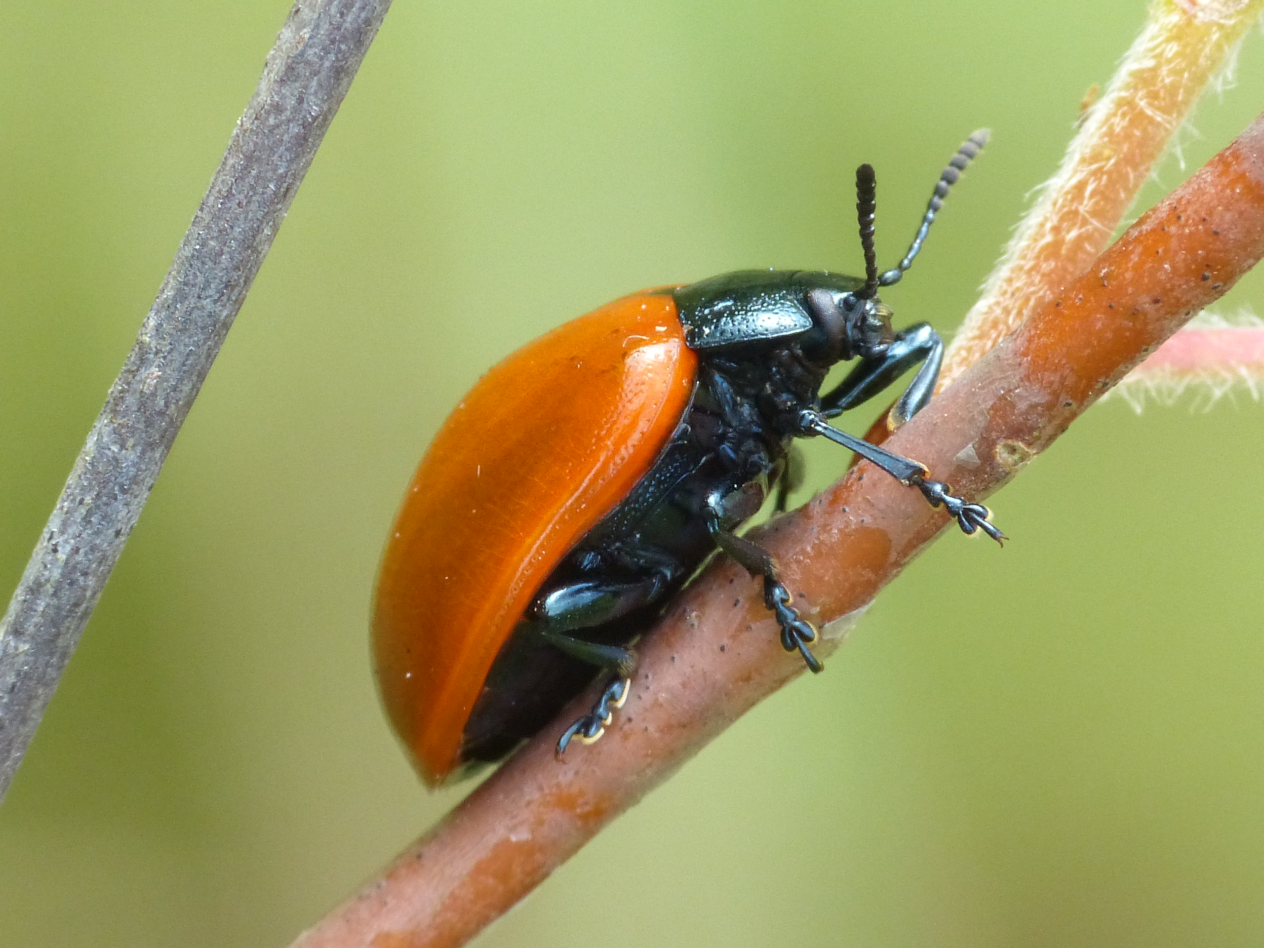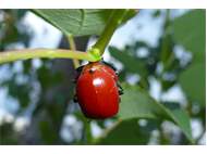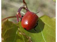 Pappelblattkäfer (Chrysomela populi) in der Gemarkung Hohenprießnitz, Sportplatz, nördlicher Waldrand, auf einer Espe (Populus tremula), April 2014 (© Michael Happ)( Bild vergrößern)