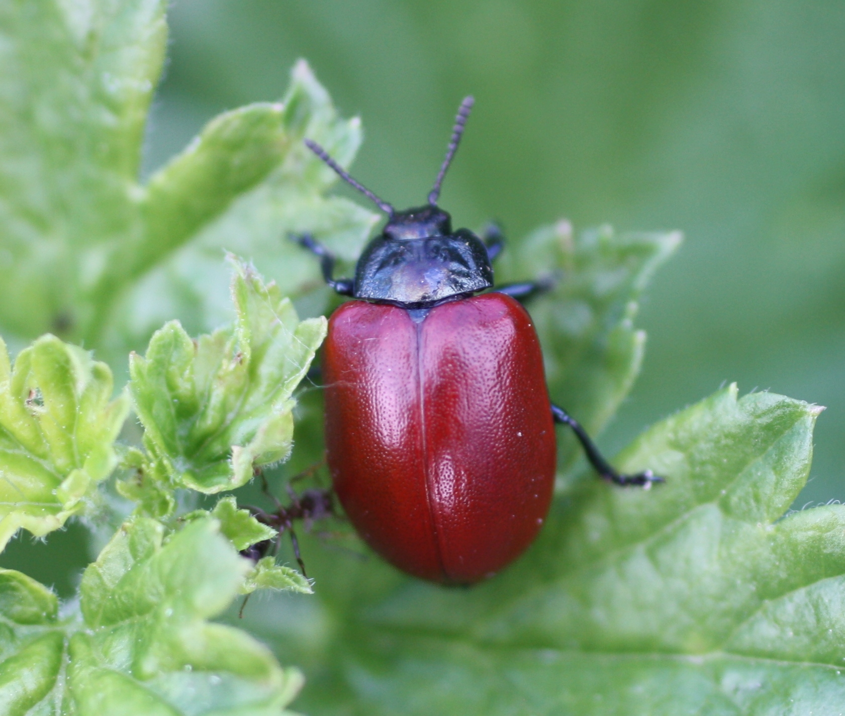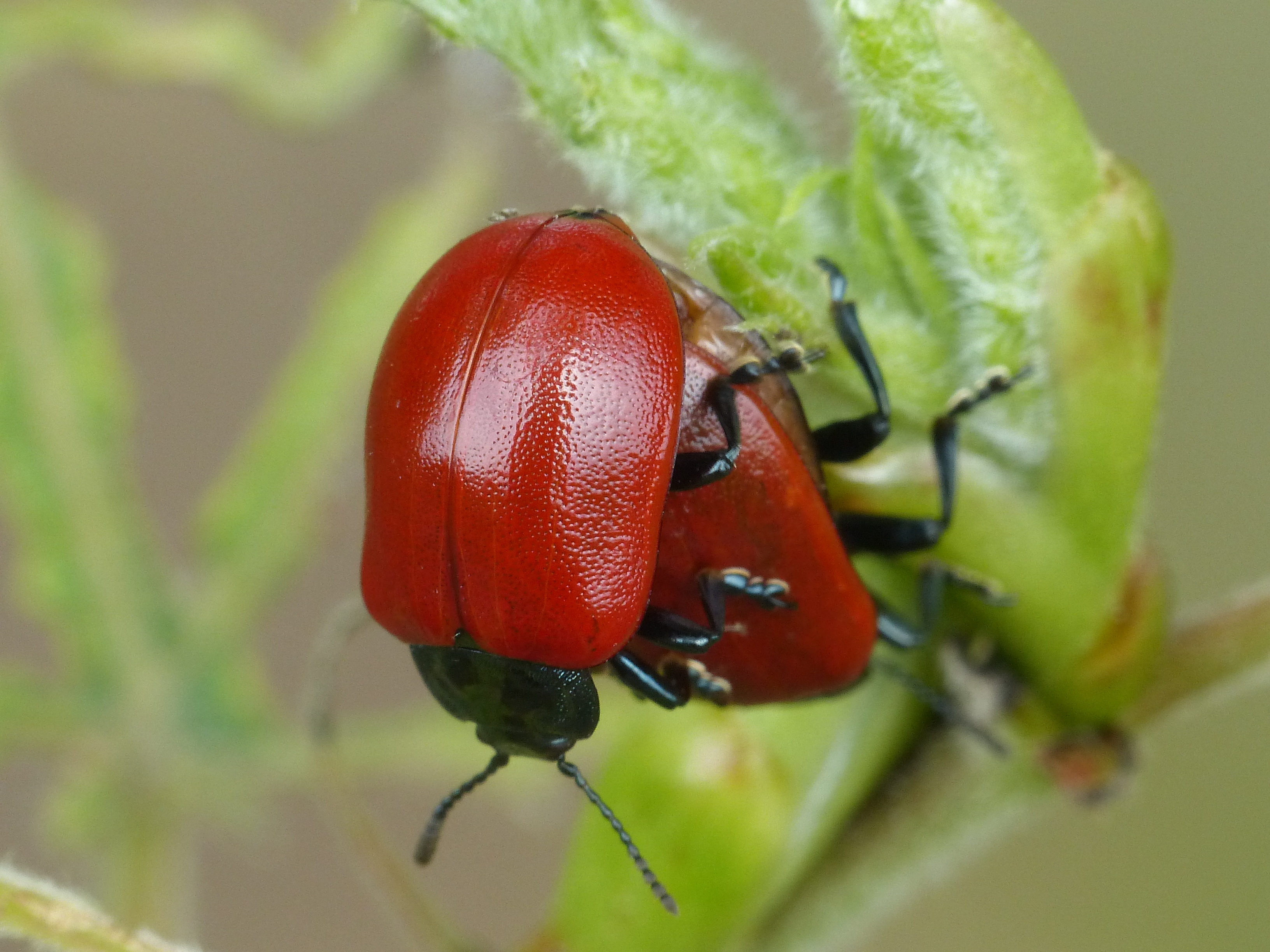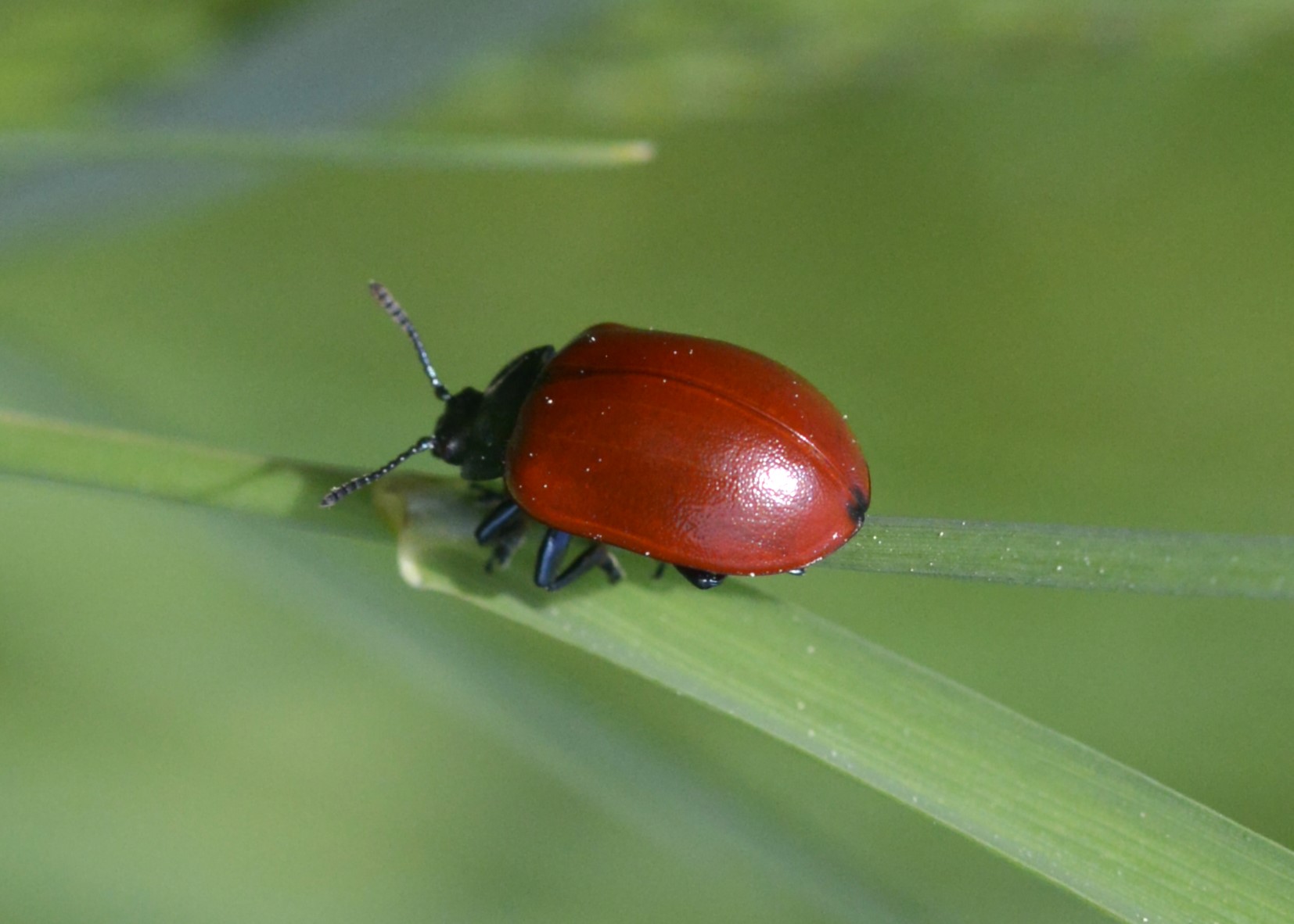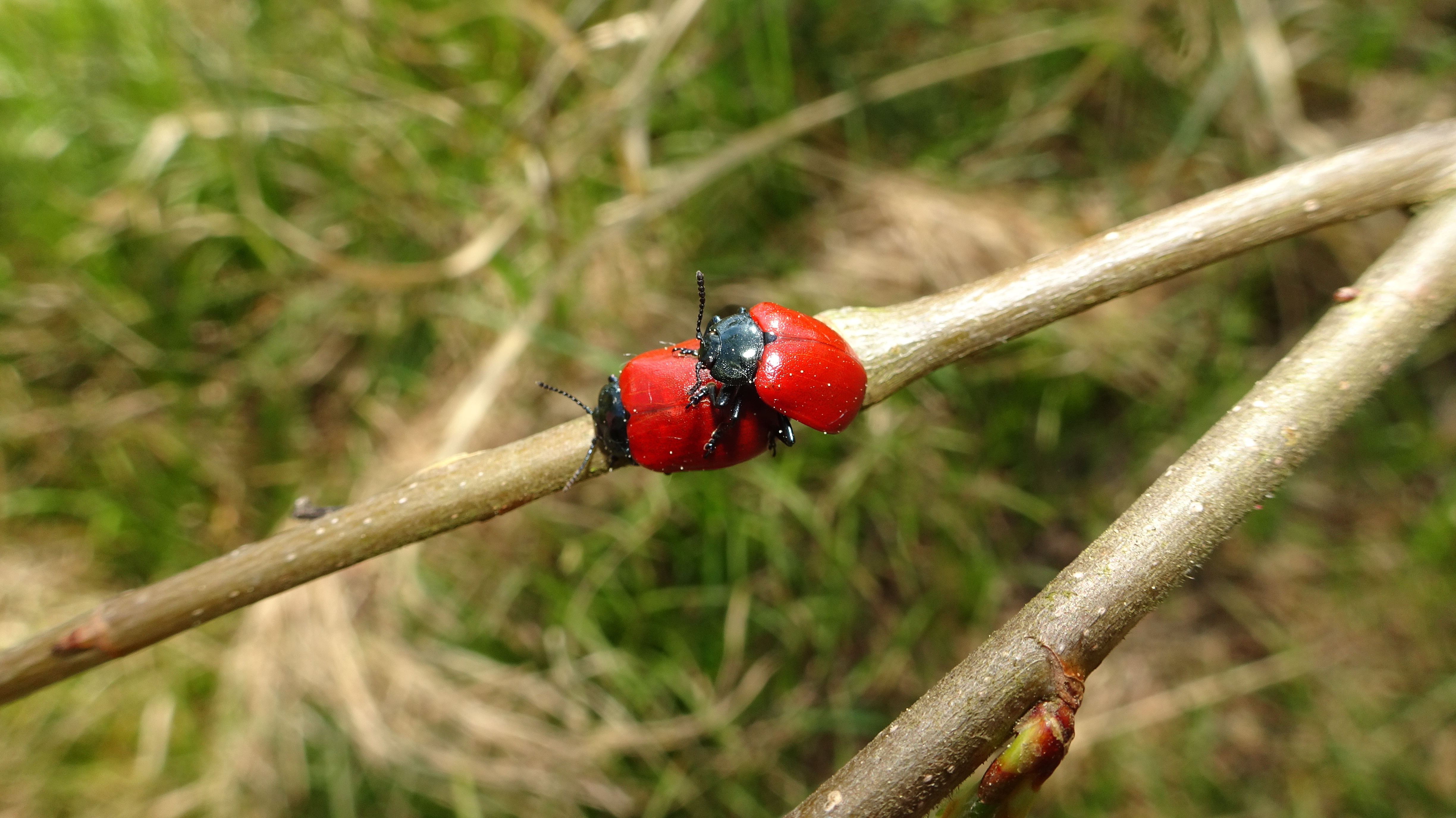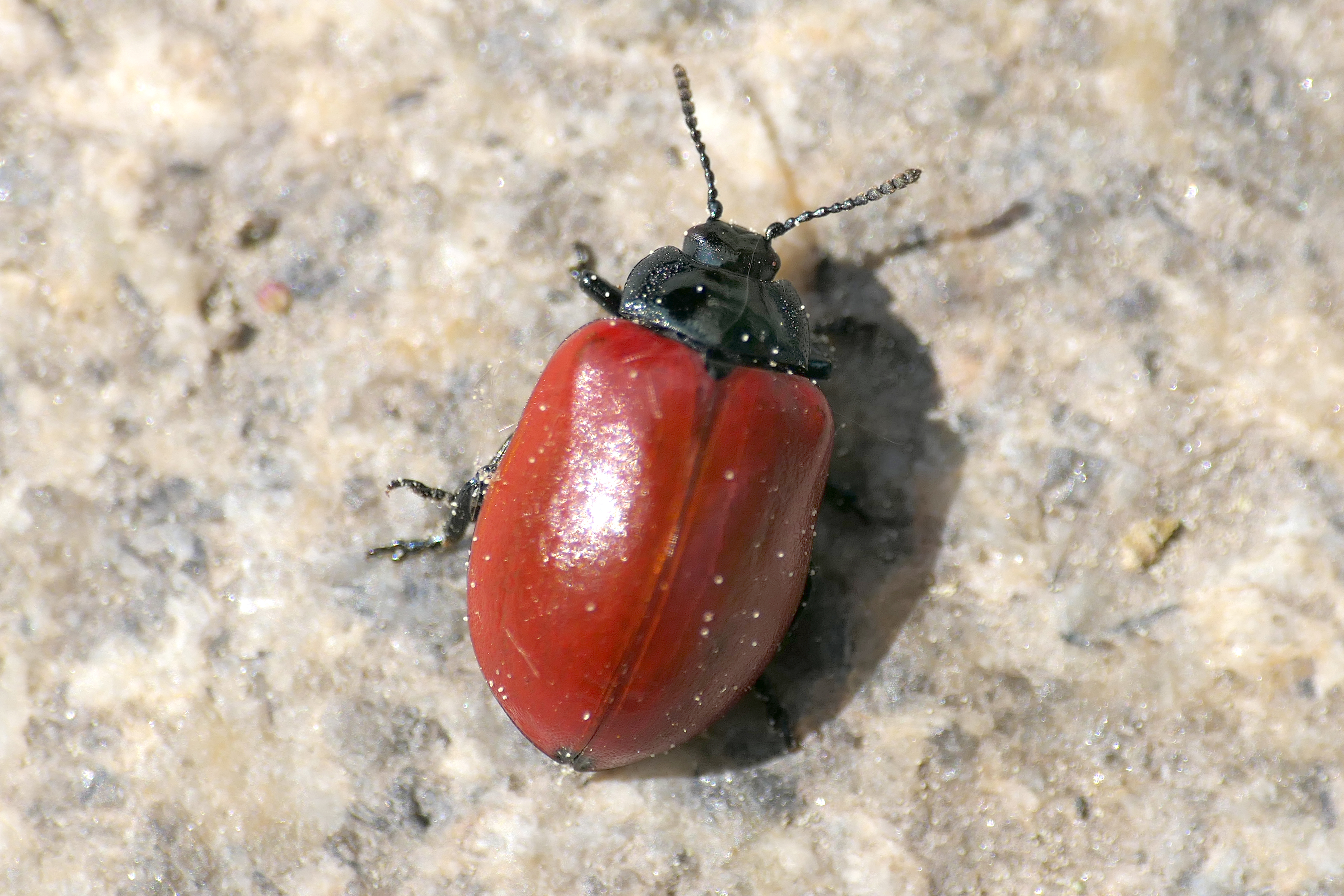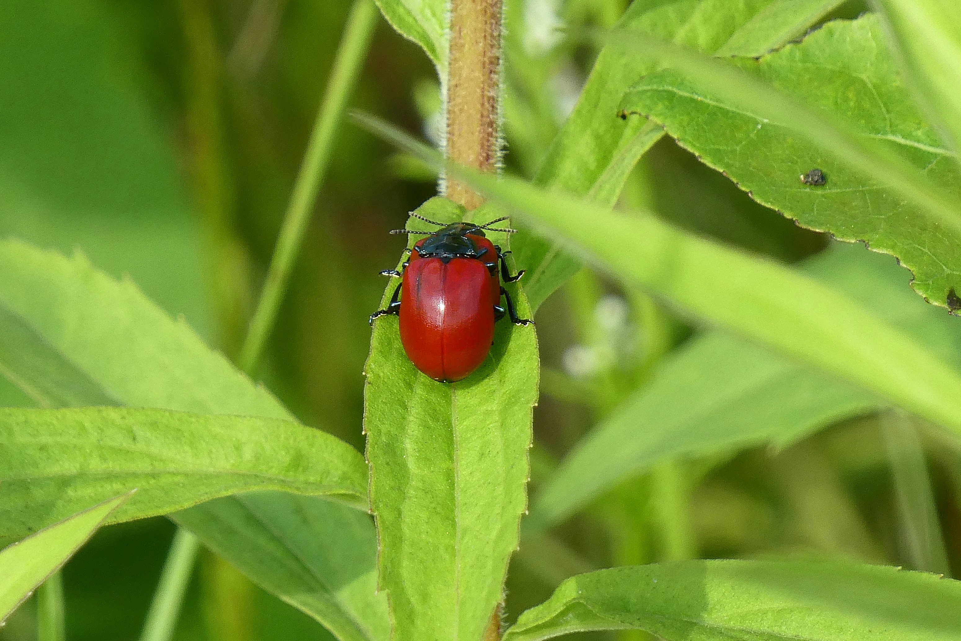 Pappelblattkäfer (Chrysomela populi) in der Gemarkung Hohenprießnitz, Sportplatz, nördlicher Waldrand, auf einer Espe (Populus tremula), April 2014 (© Michael Happ)( Bild vergrößern)