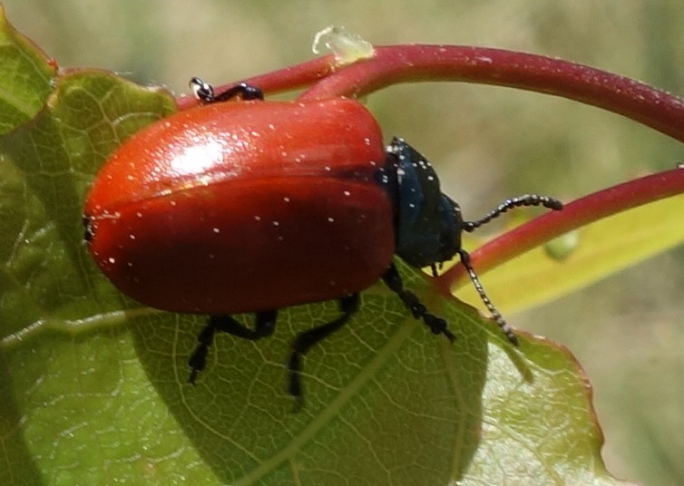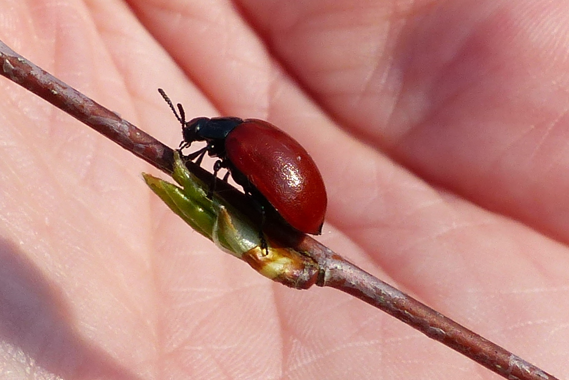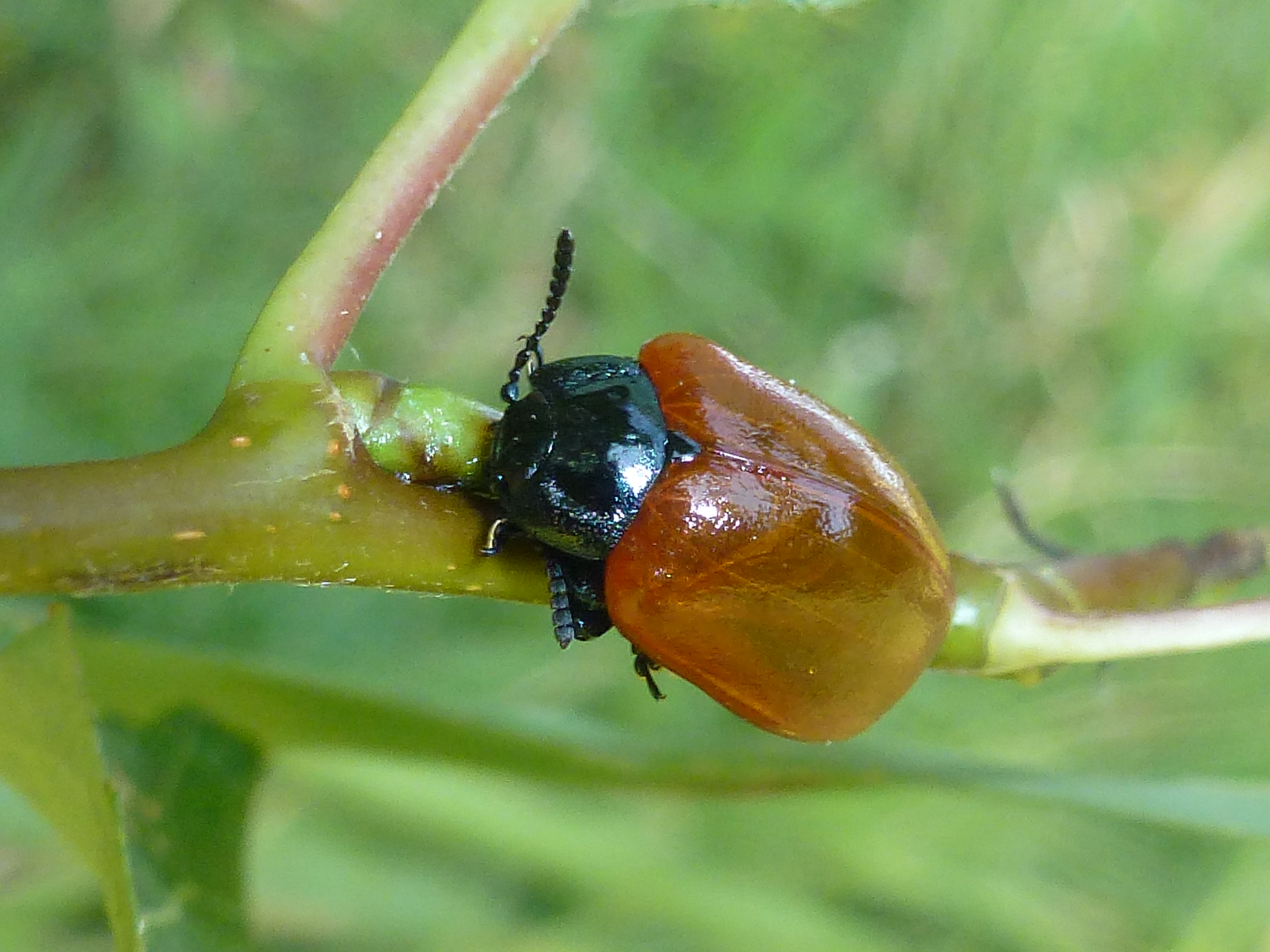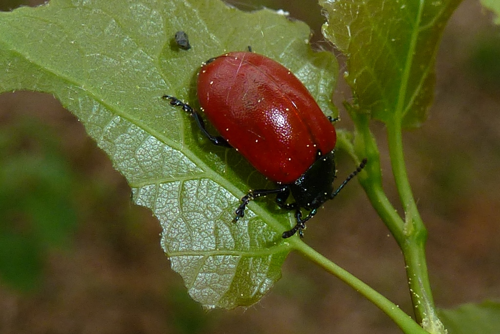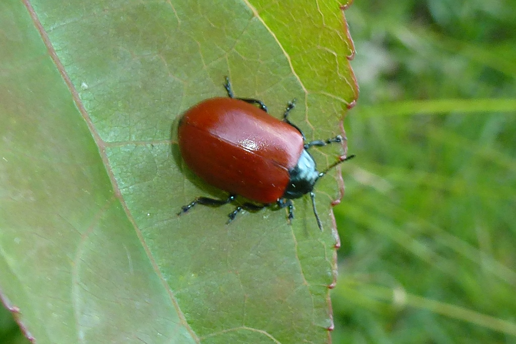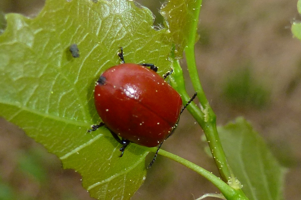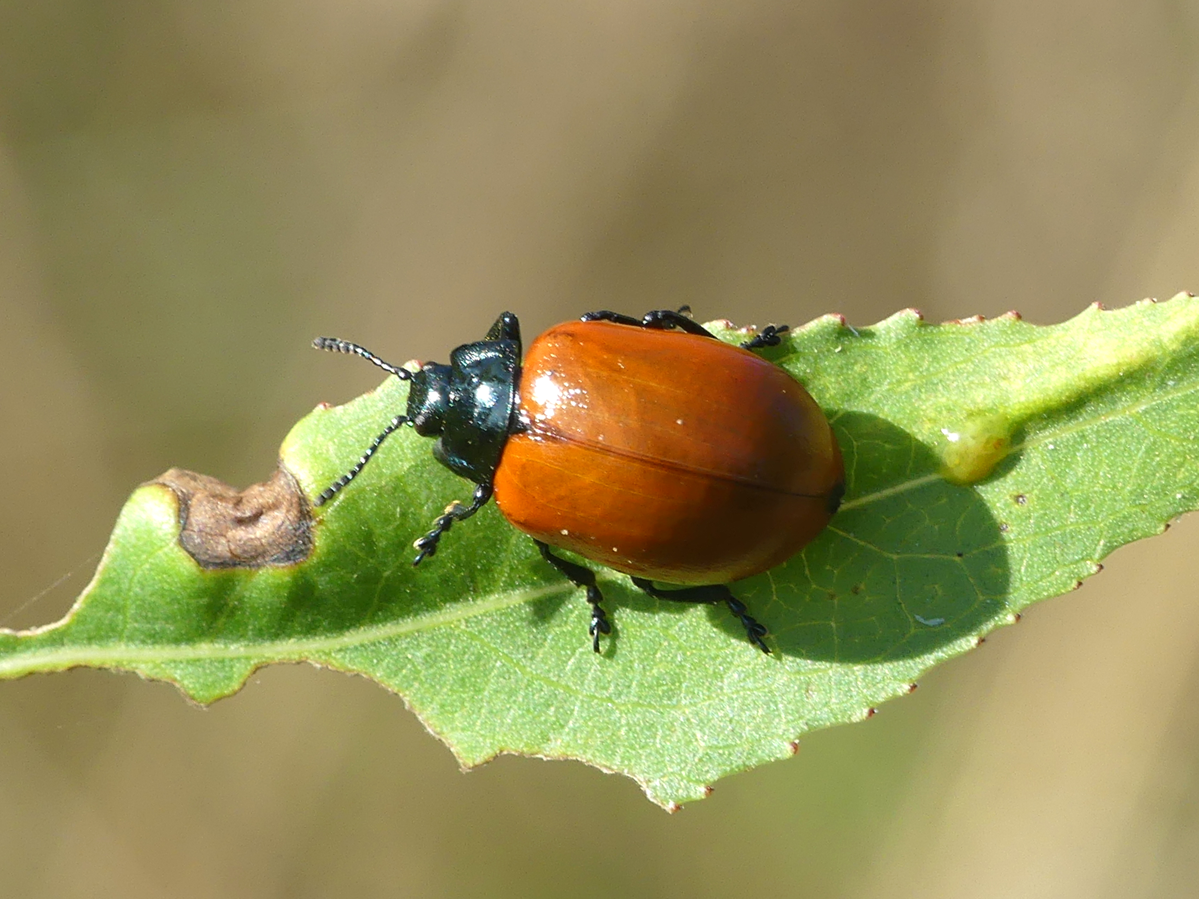 Pappelblattkäfer (Chrysomela populi) in der Gemarkung Hohenprießnitz, Sportplatz, nördlicher Waldrand, auf einer Espe (Populus tremula), April 2014