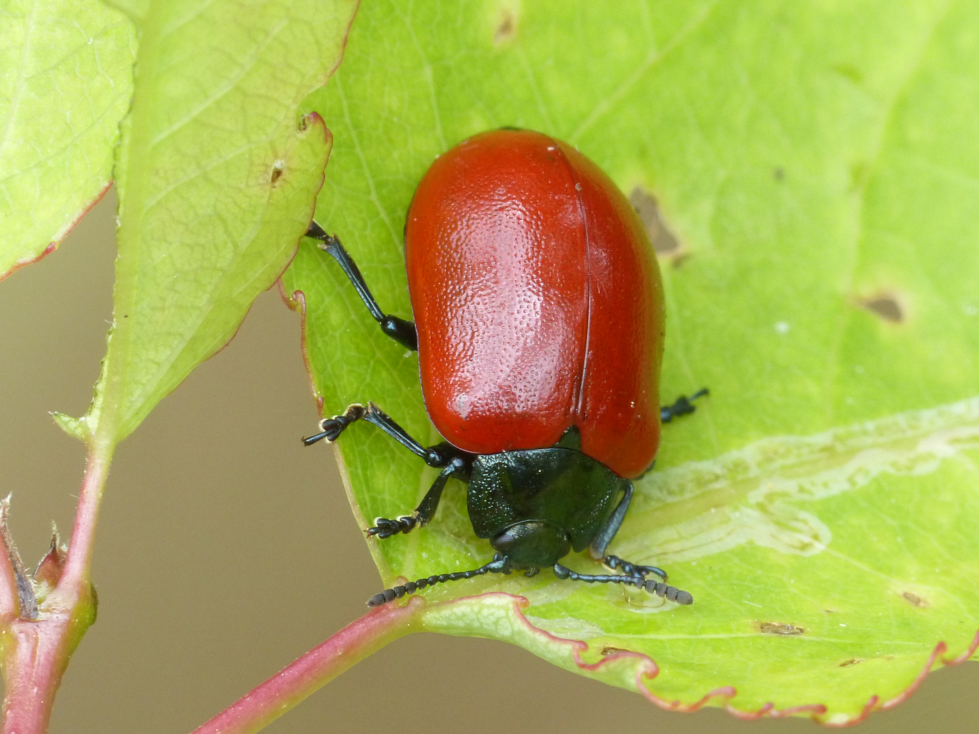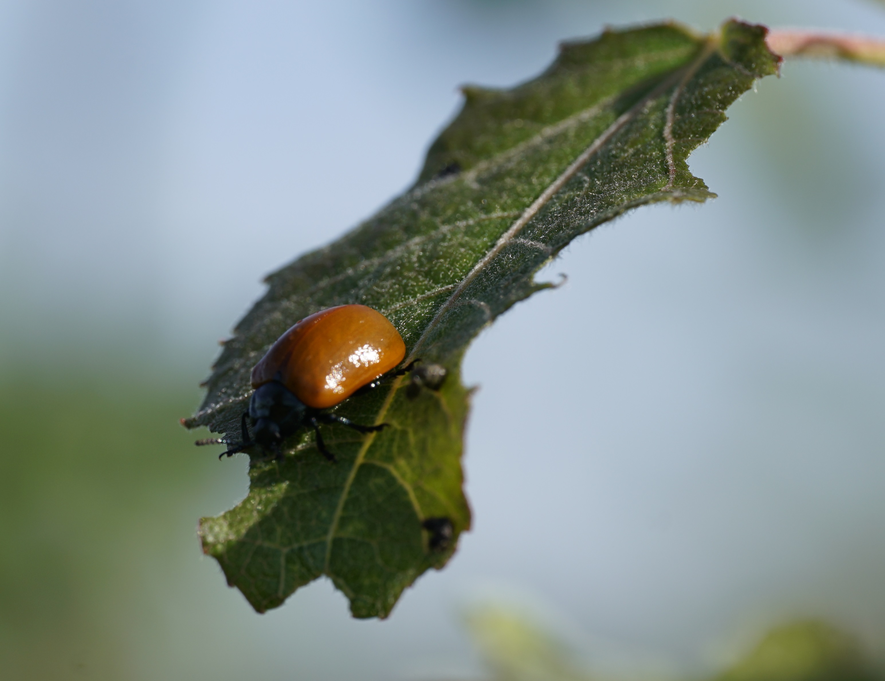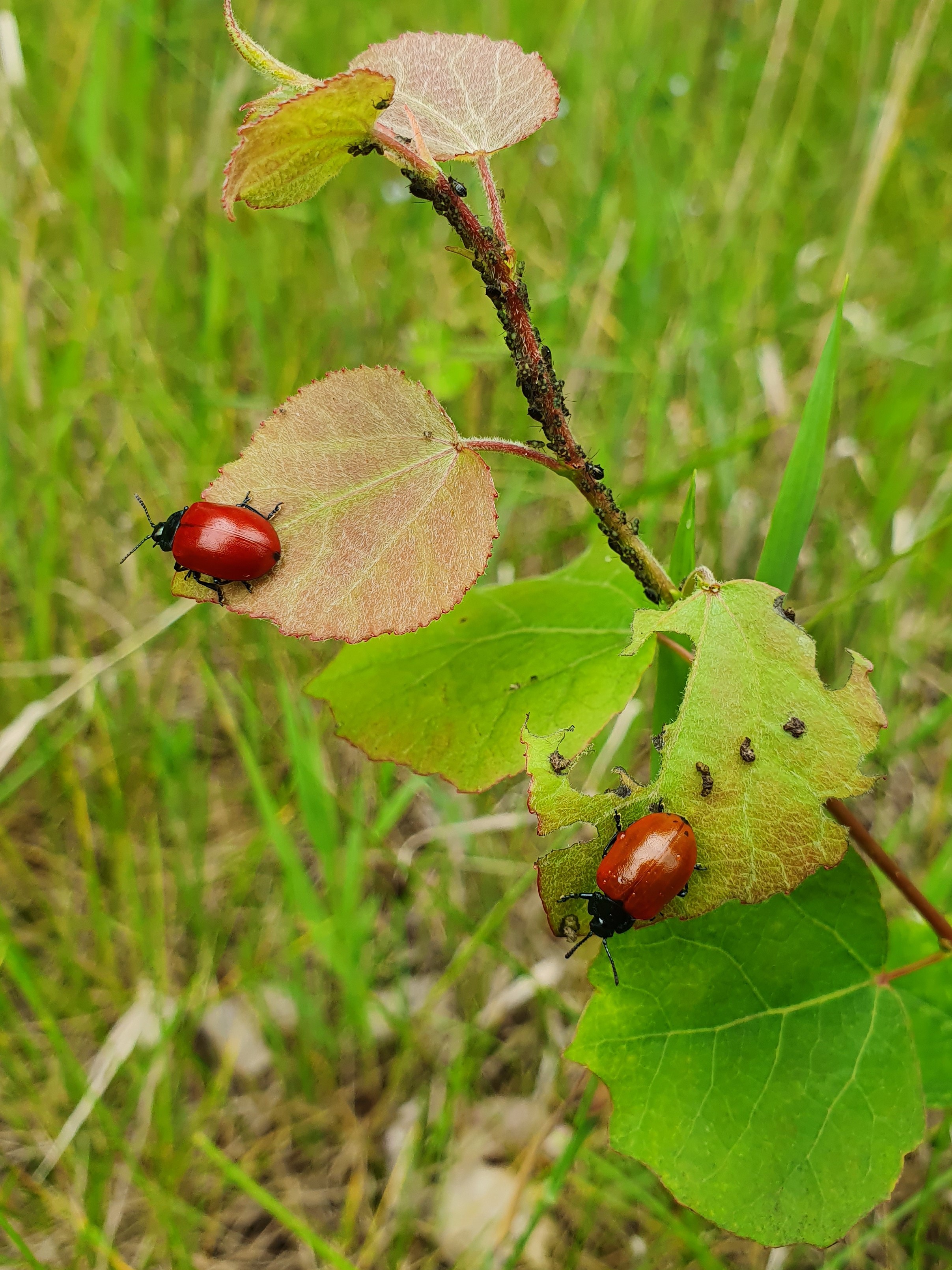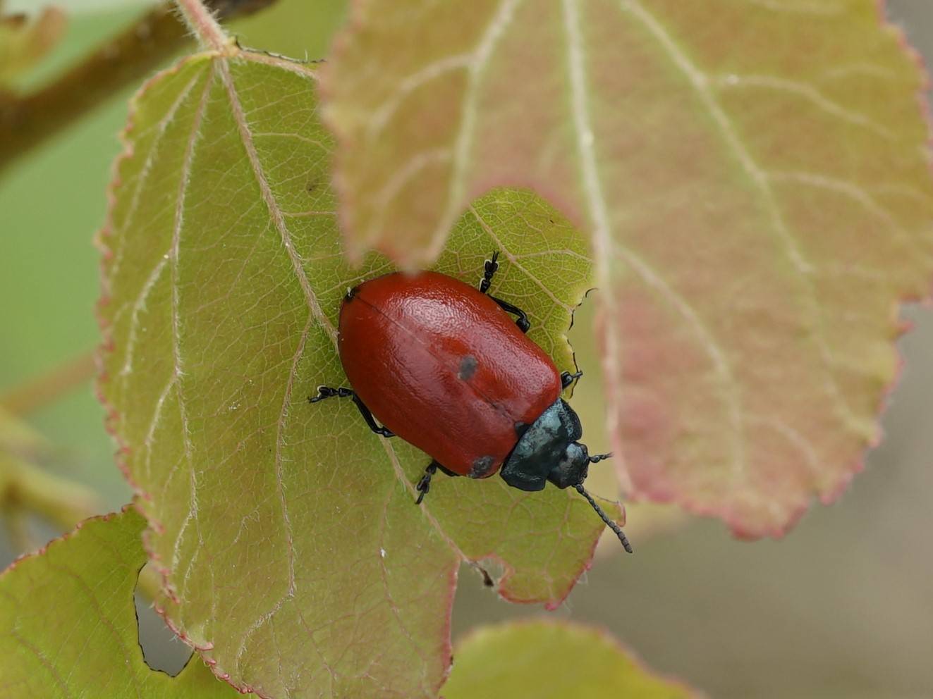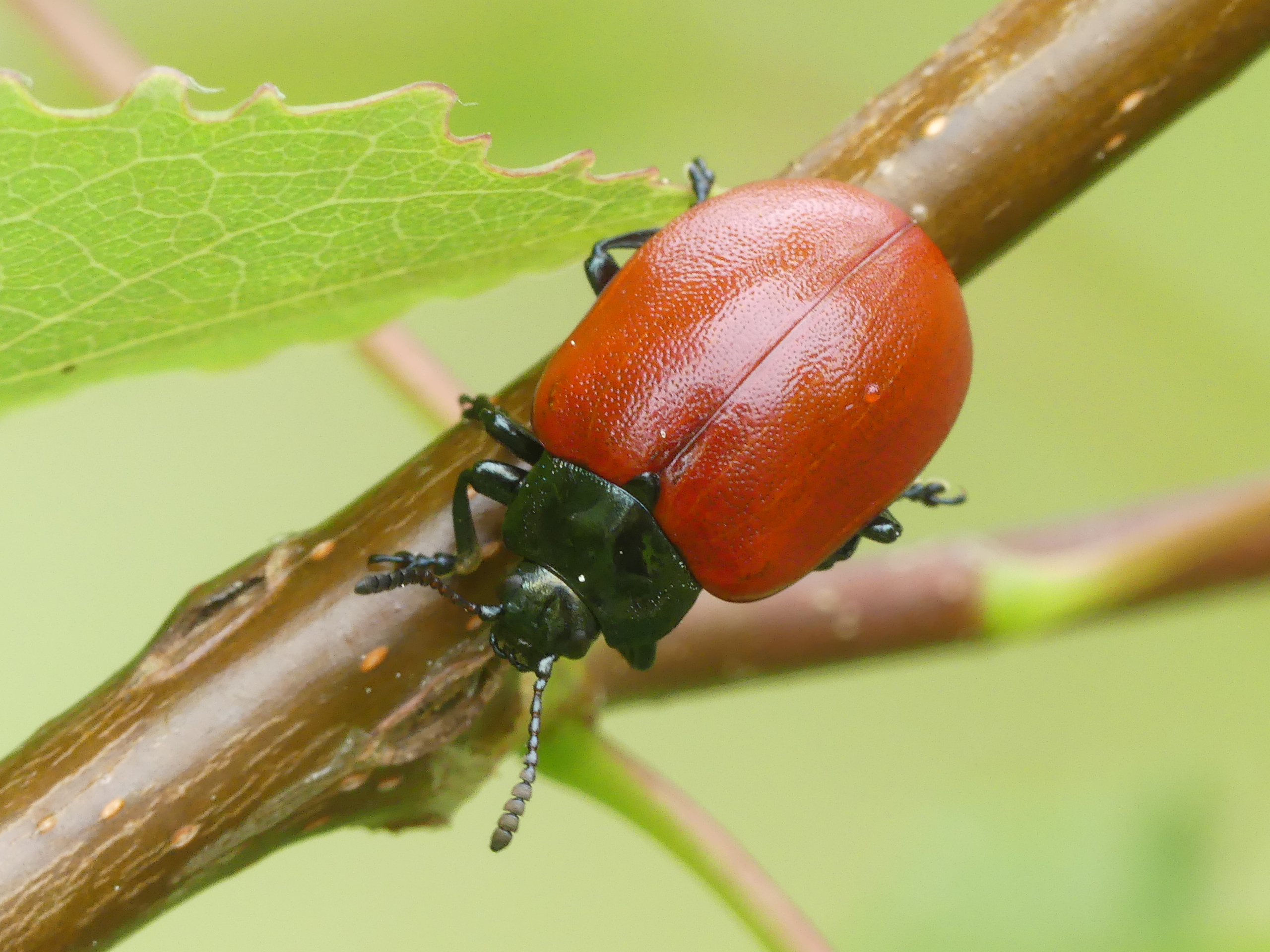 Pappelblattkäfer (Chrysomela populi) in der Gemarkung Hohenprießnitz, Sportplatz, nördlicher Waldrand, auf einer Espe (Populus tremula), April 2014