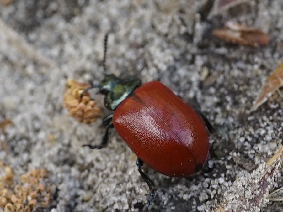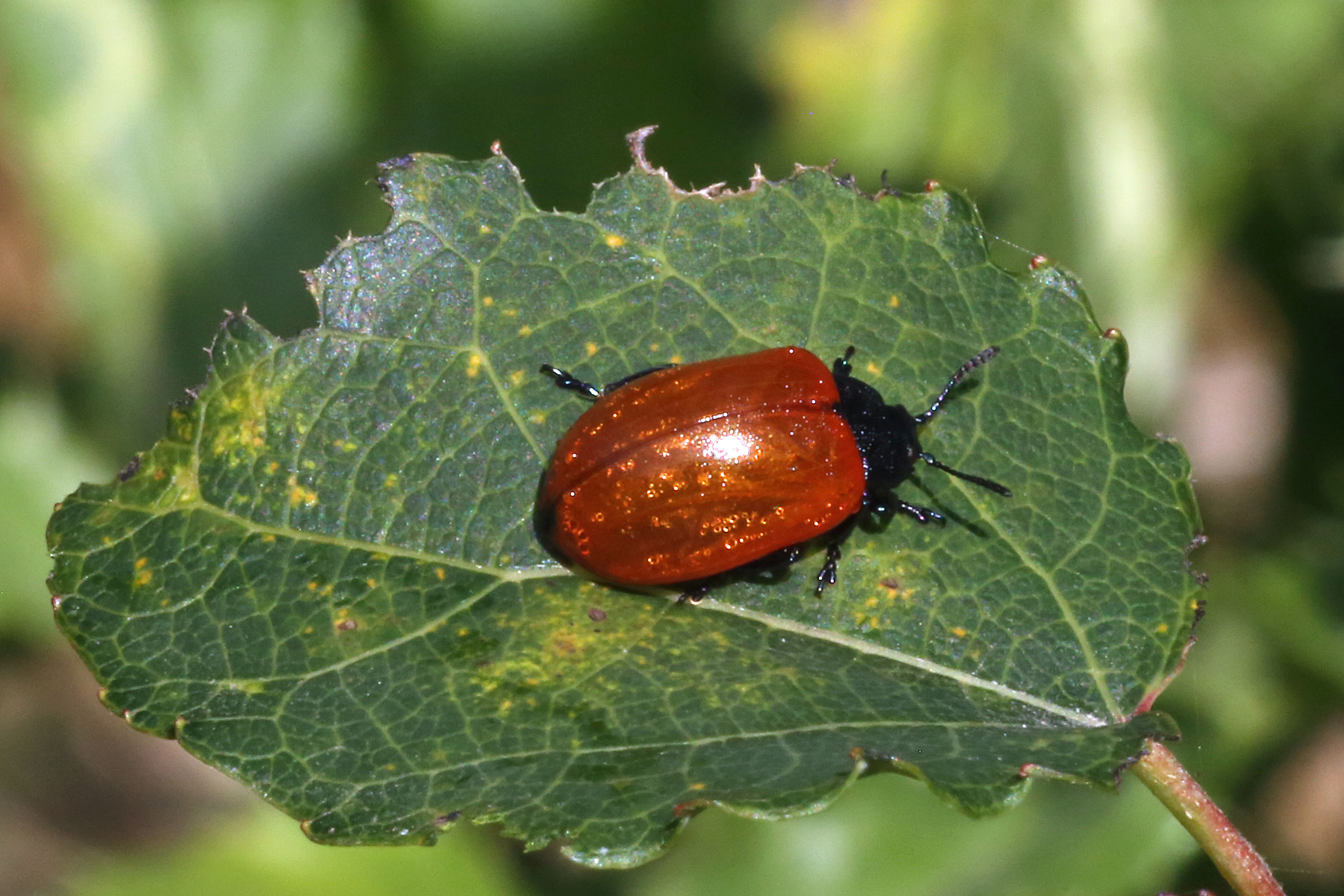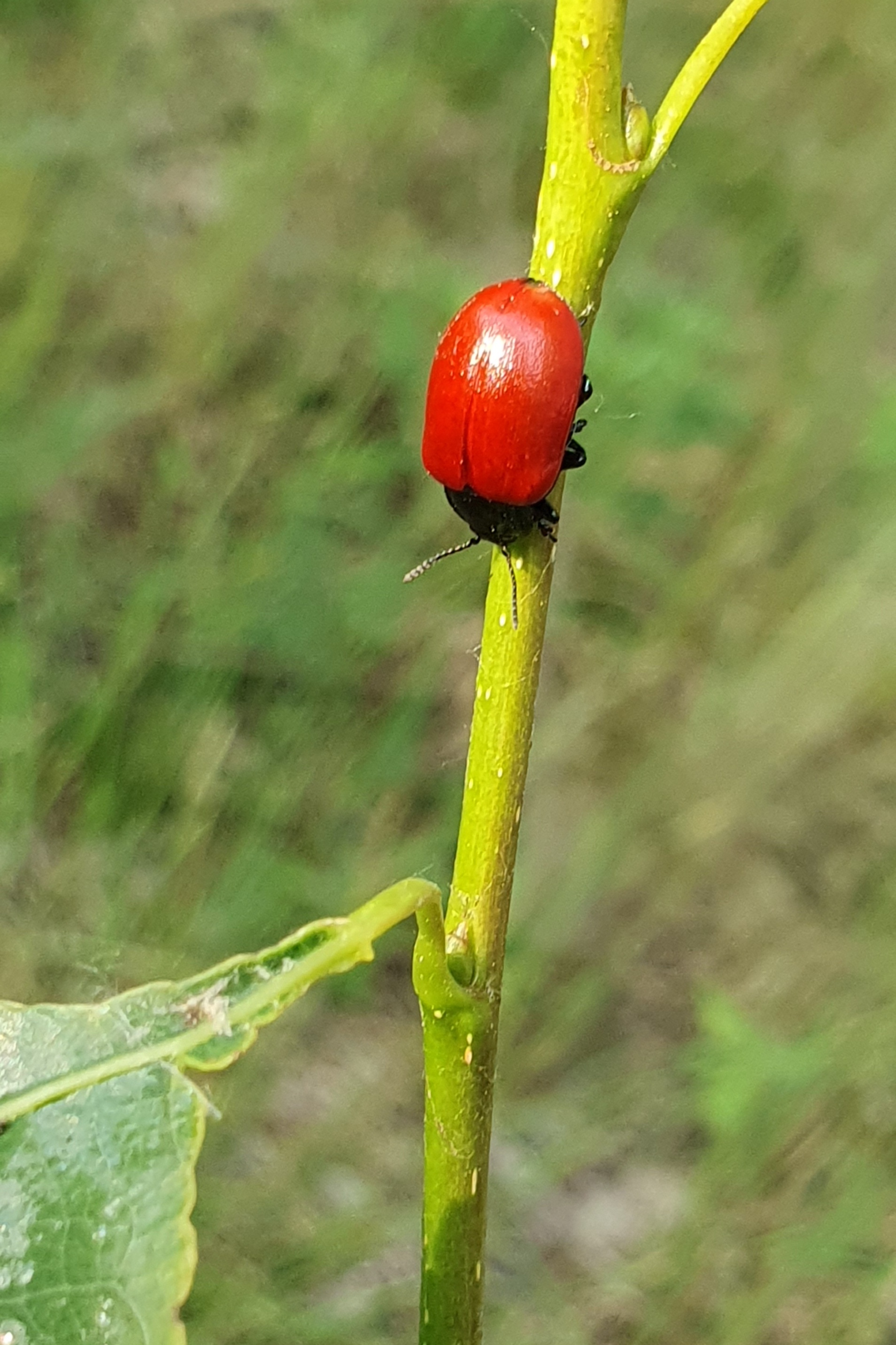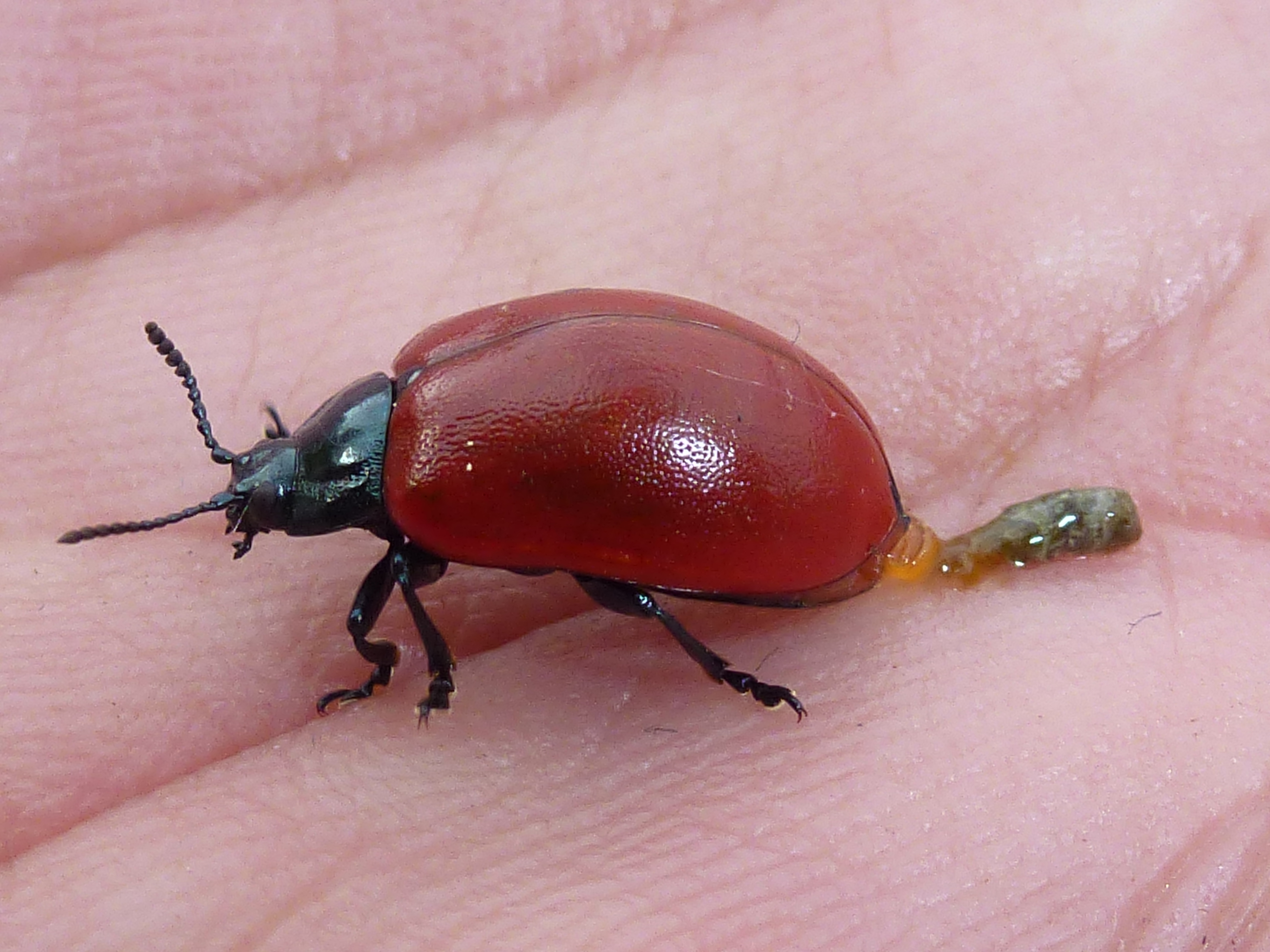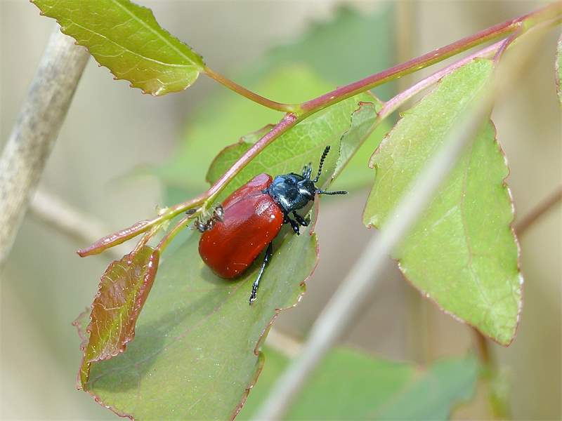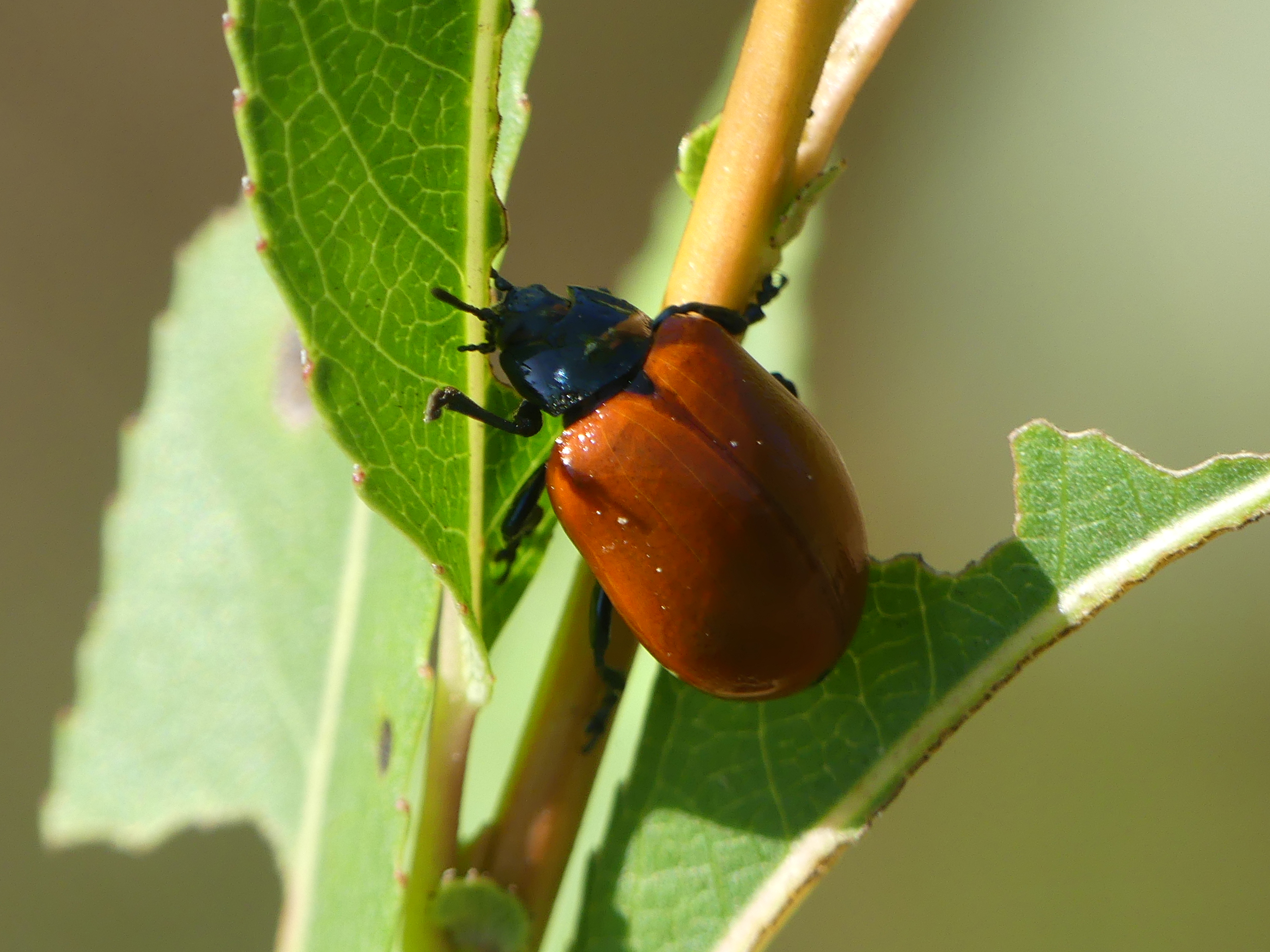Pappelblattkäfer (Chrysomela populi) in der Gemarkung Hohenprießnitz, Sportplatz, nördlicher Waldrand, auf einer Espe (Populus tremula), April 2014