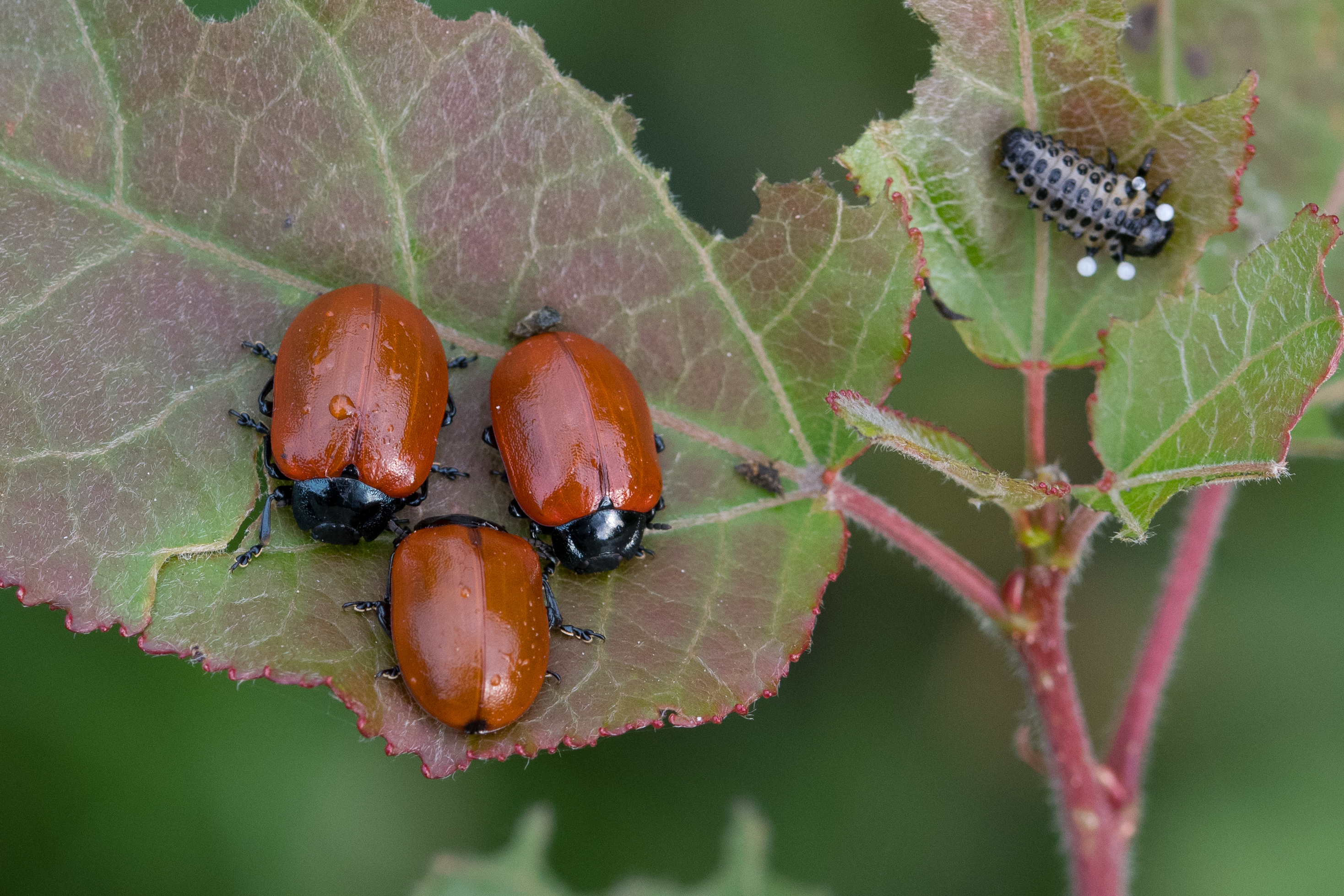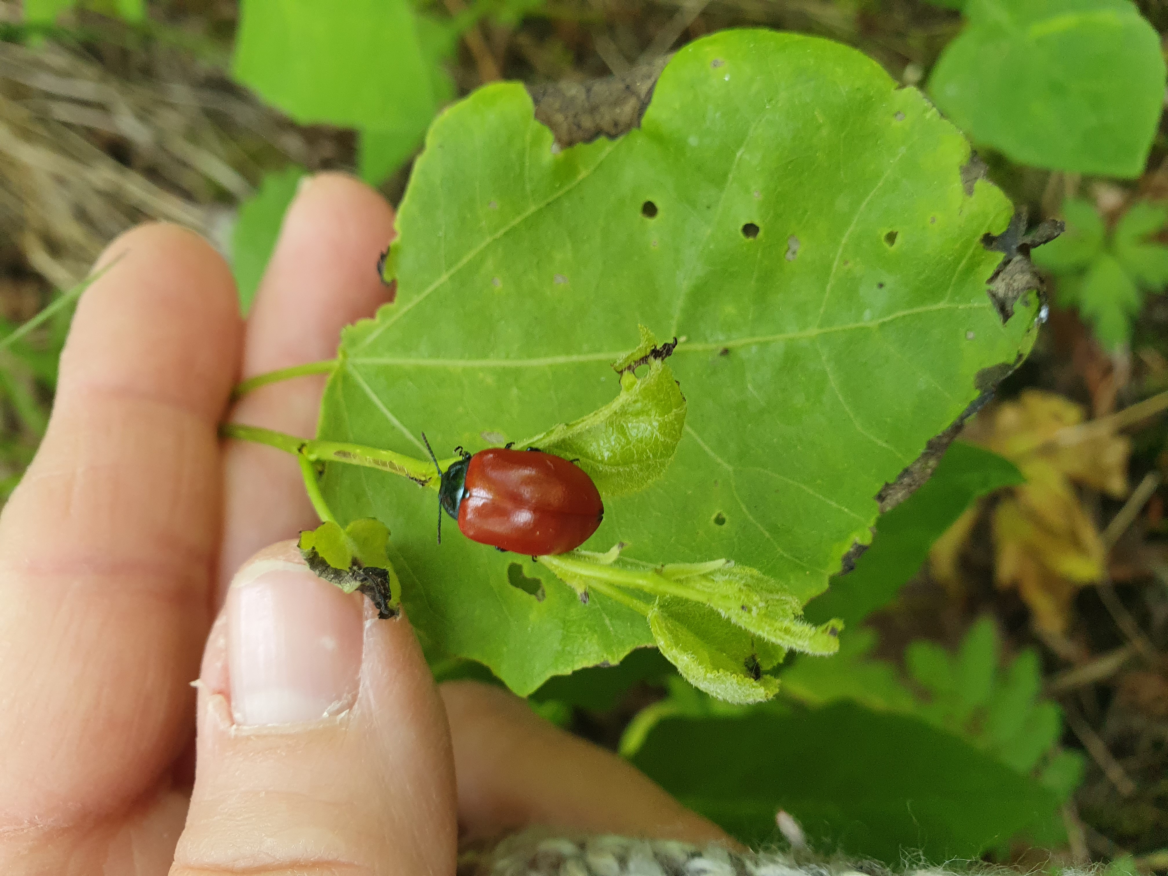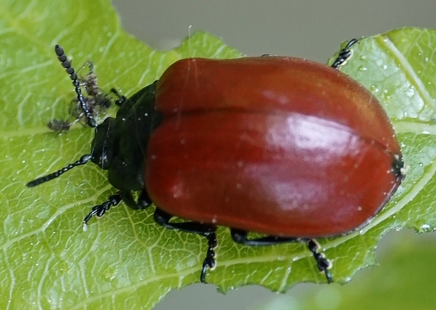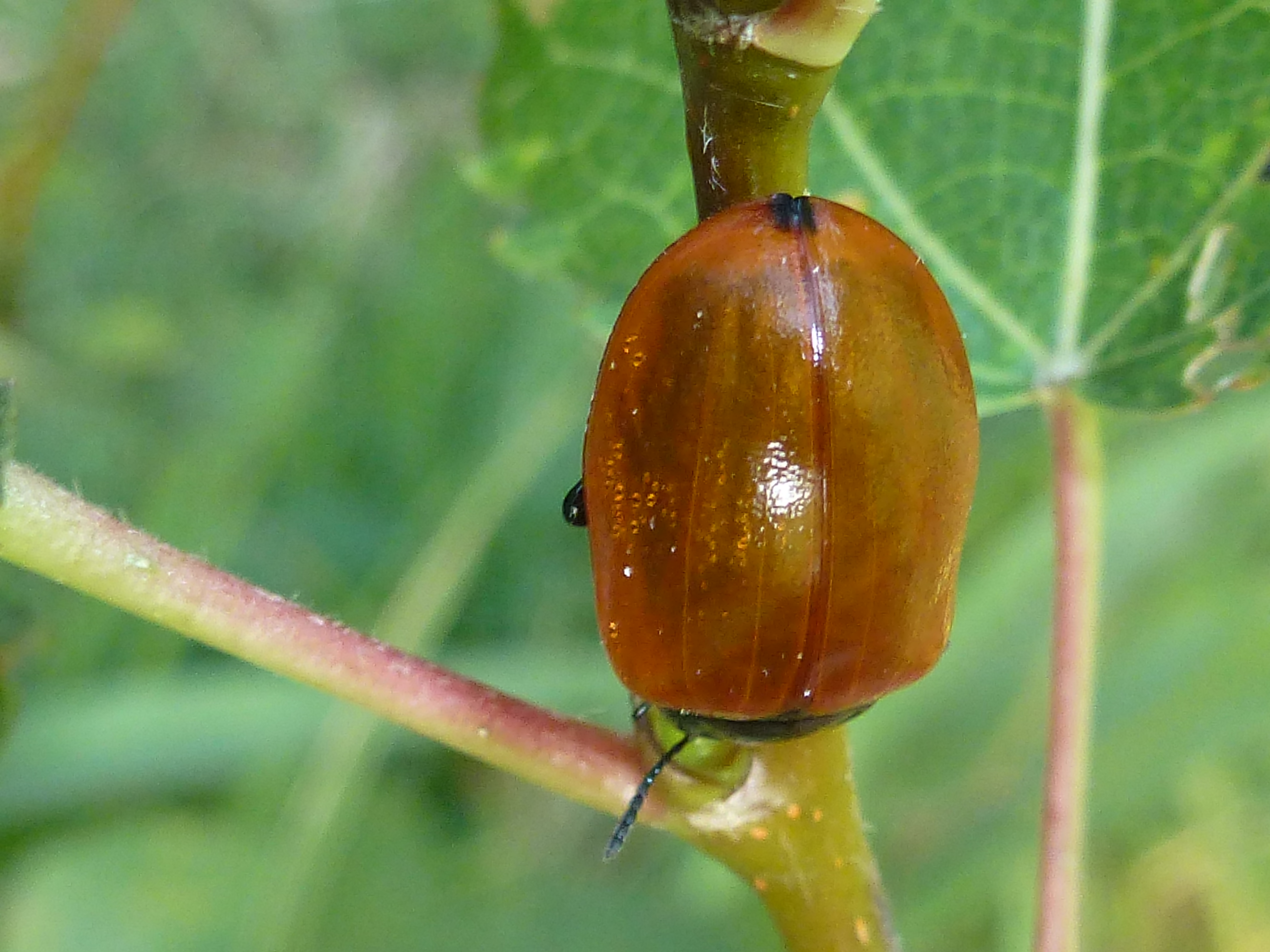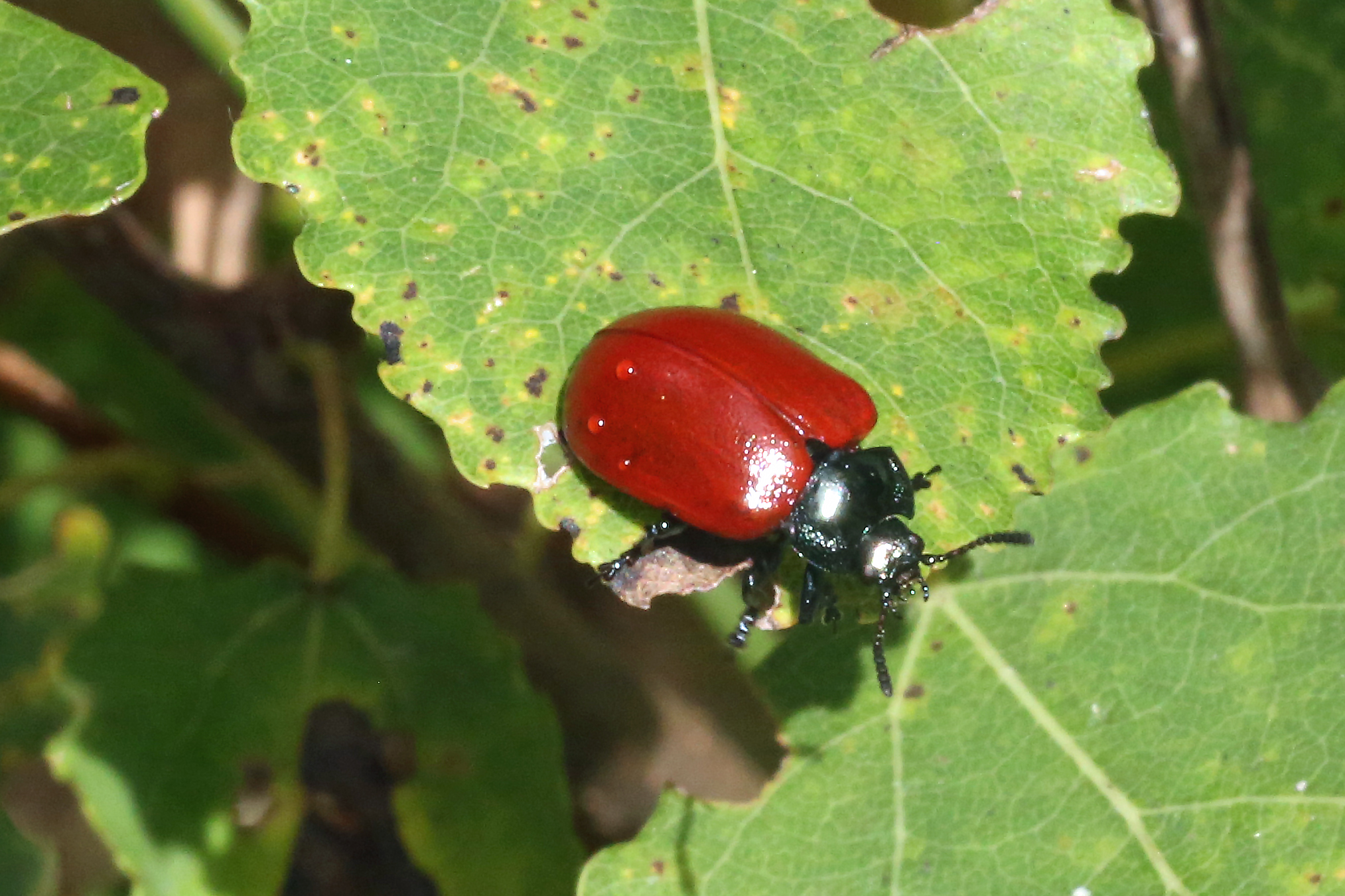 Pappelblattkäfer (Chrysomela populi) in der Gemarkung Hohenprießnitz, Sportplatz, nördlicher Waldrand, auf einer Espe (Populus tremula), April 2014