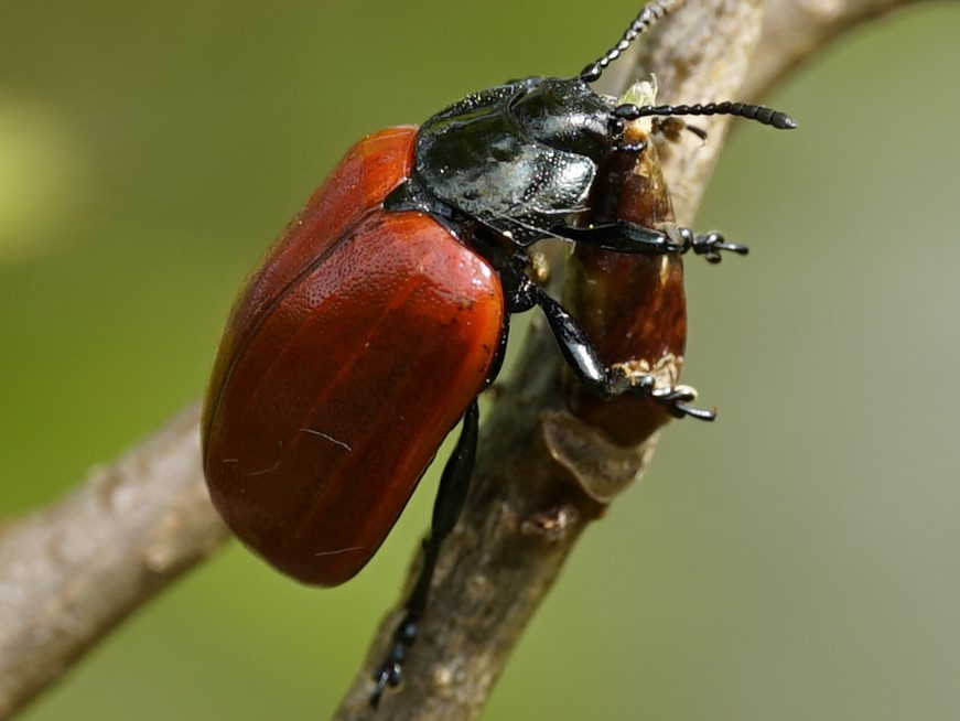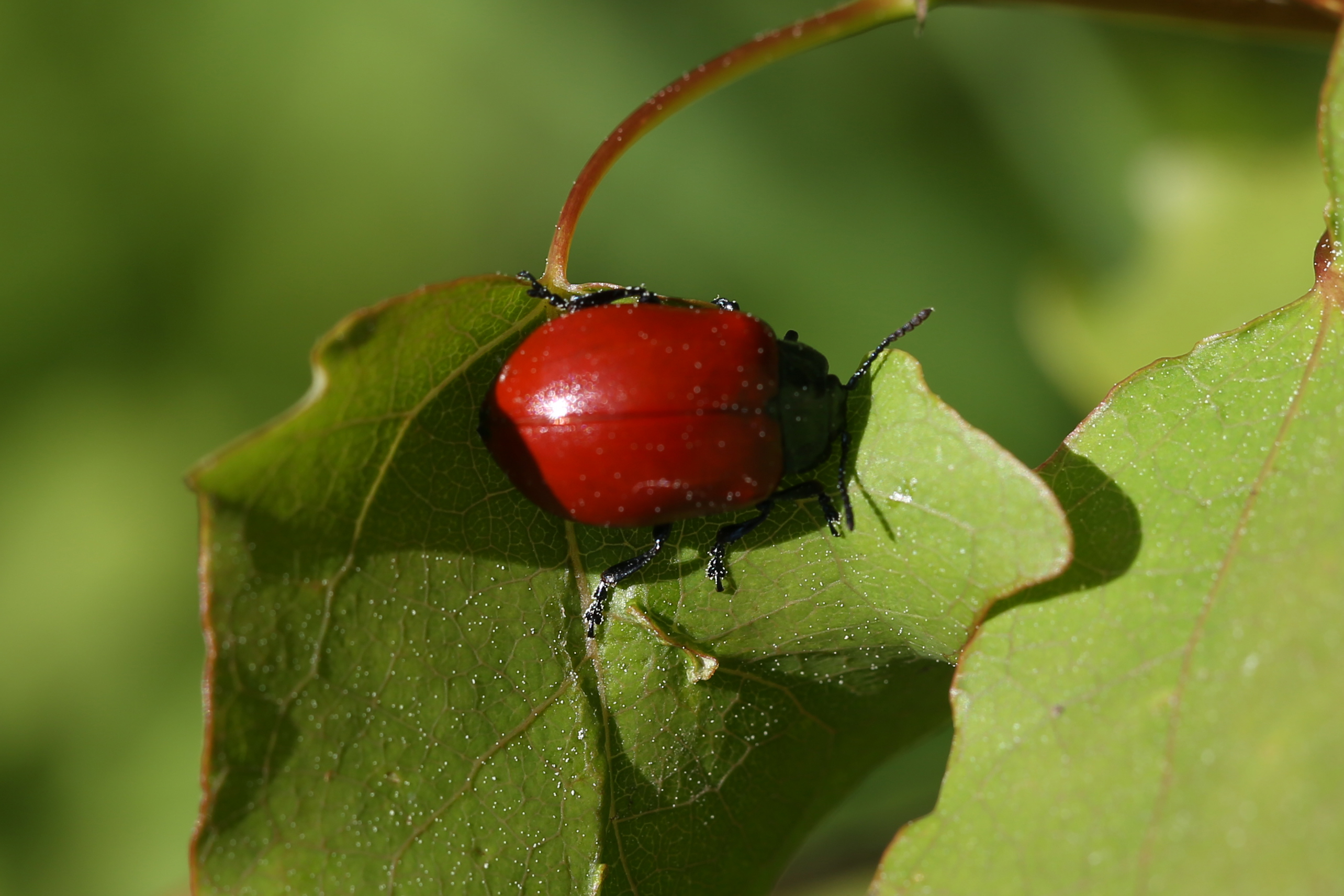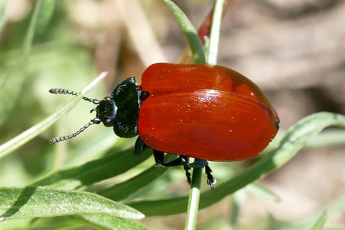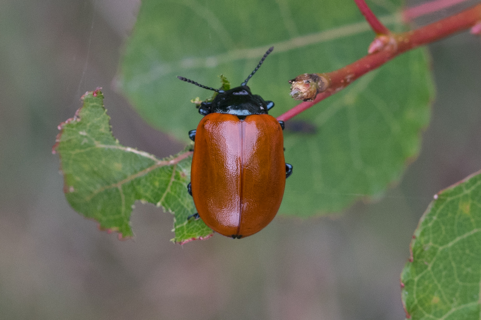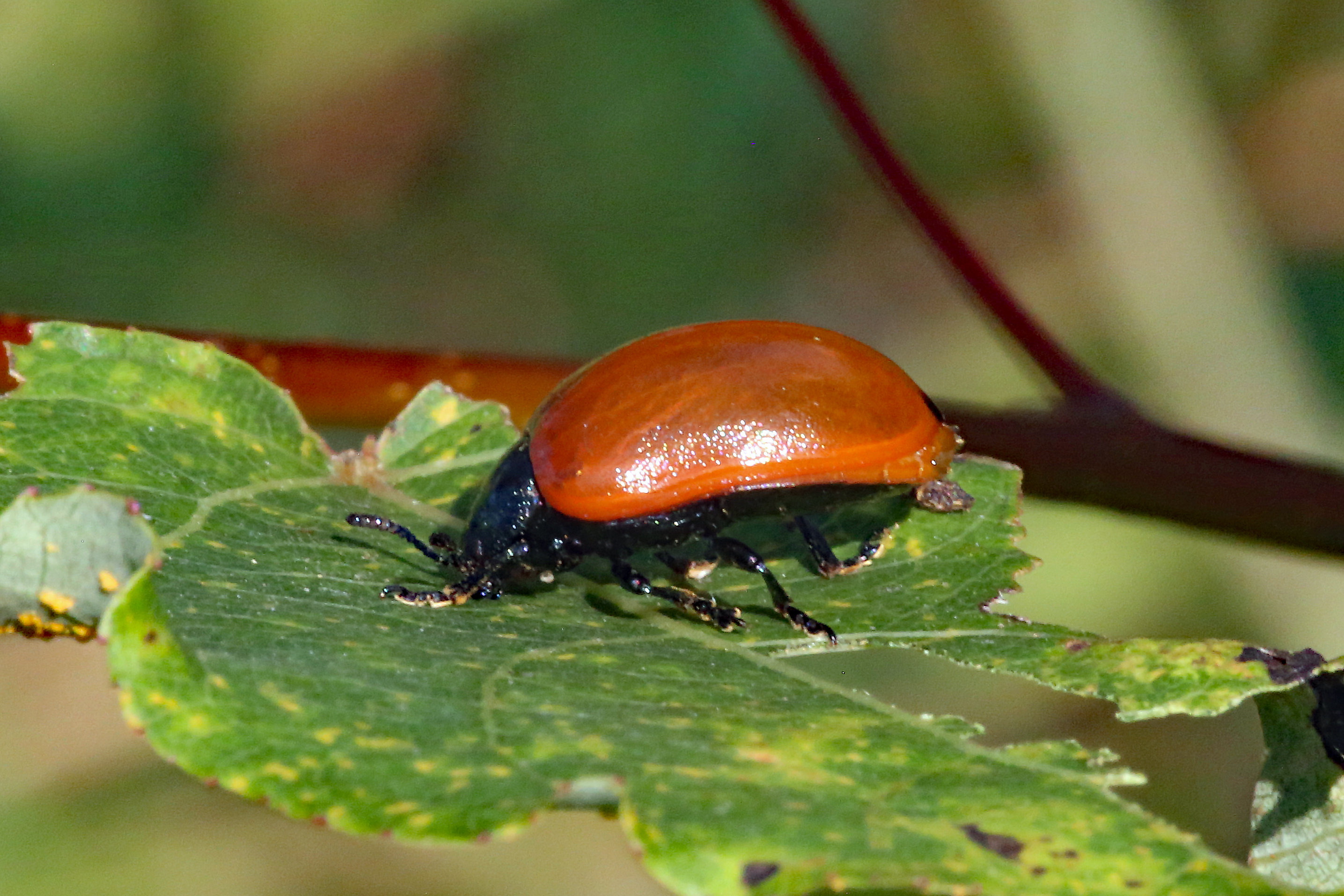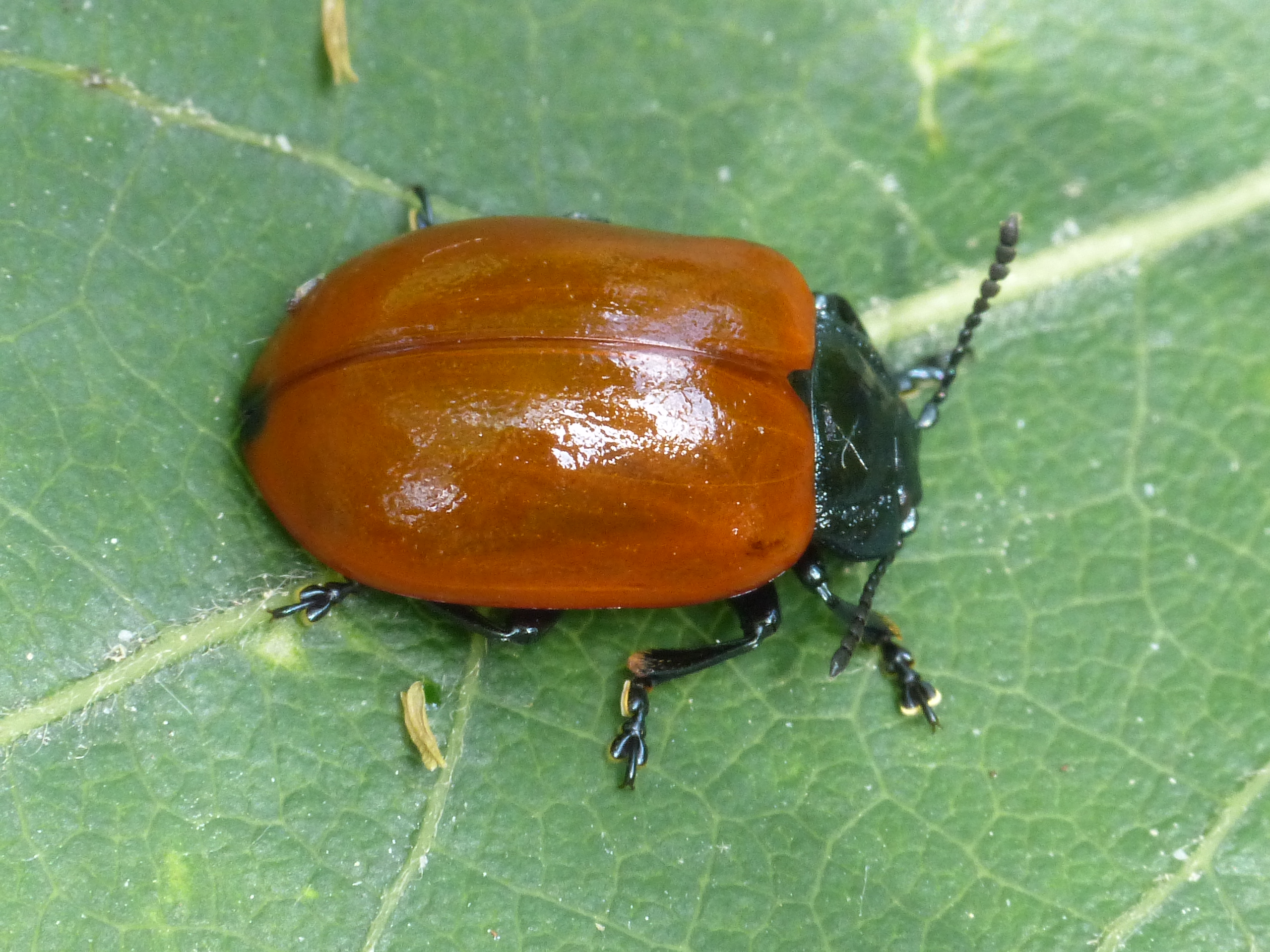 Pappelblattkäfer (Chrysomela populi) in der Gemarkung Hohenprießnitz, Sportplatz, nördlicher Waldrand, auf einer Espe (Populus tremula), April 2014