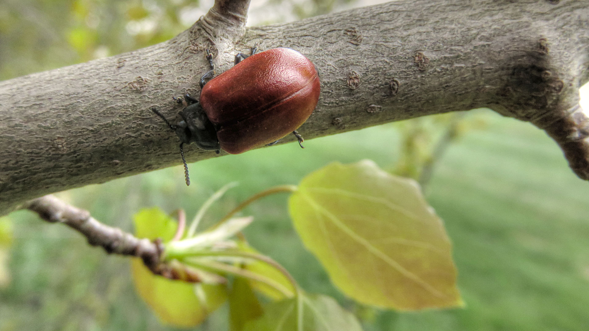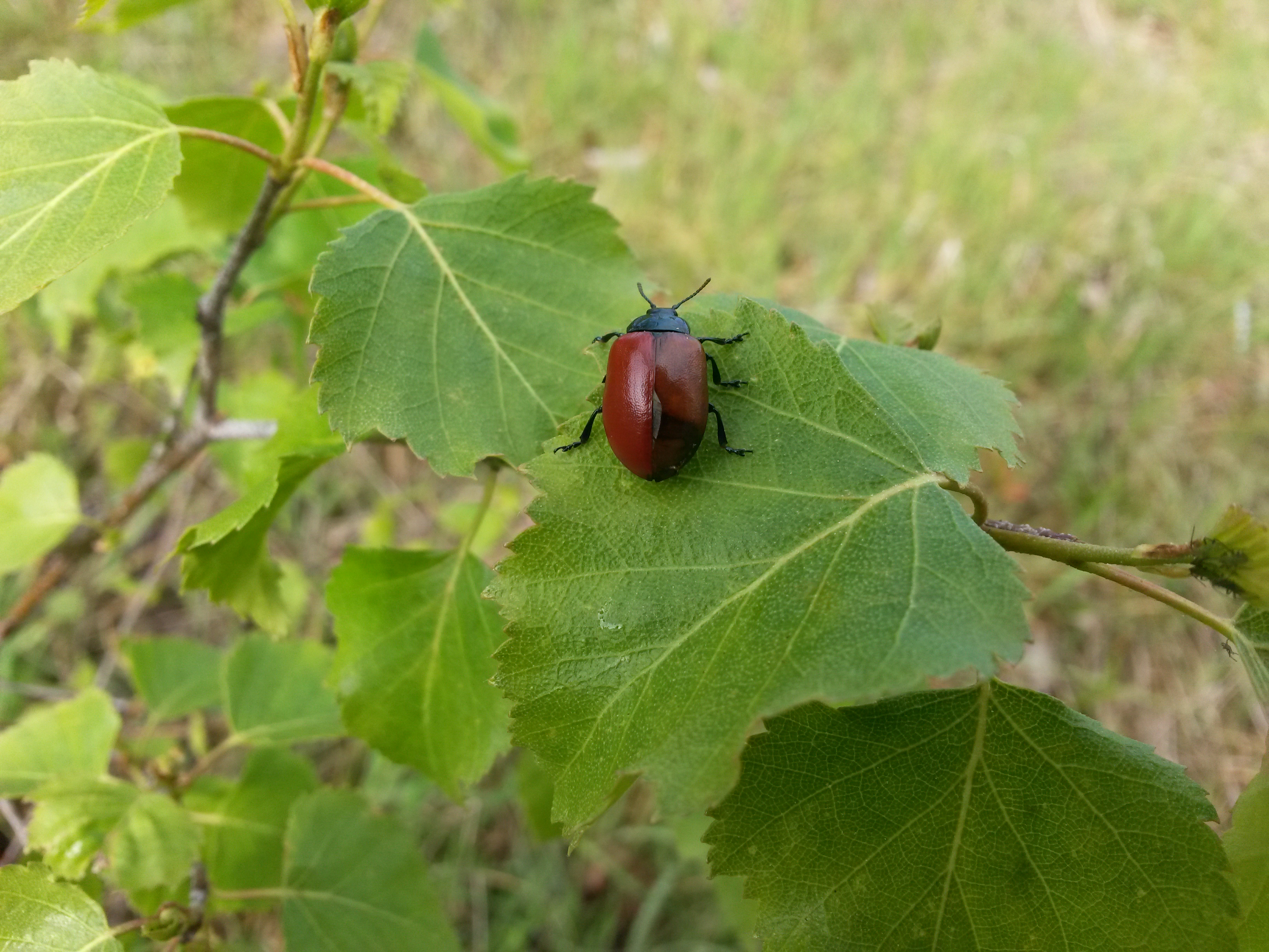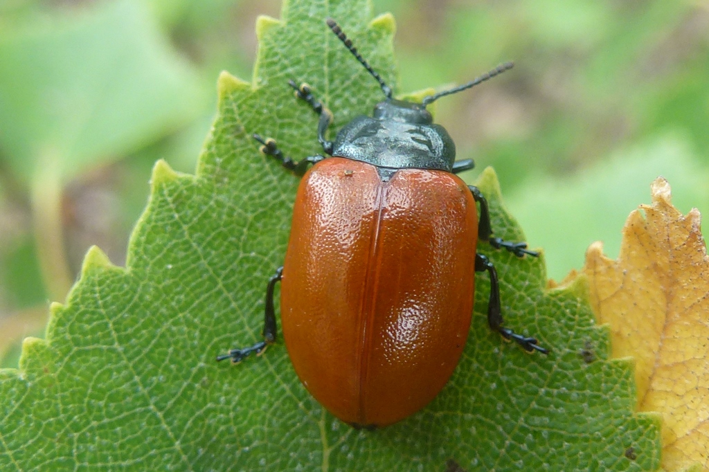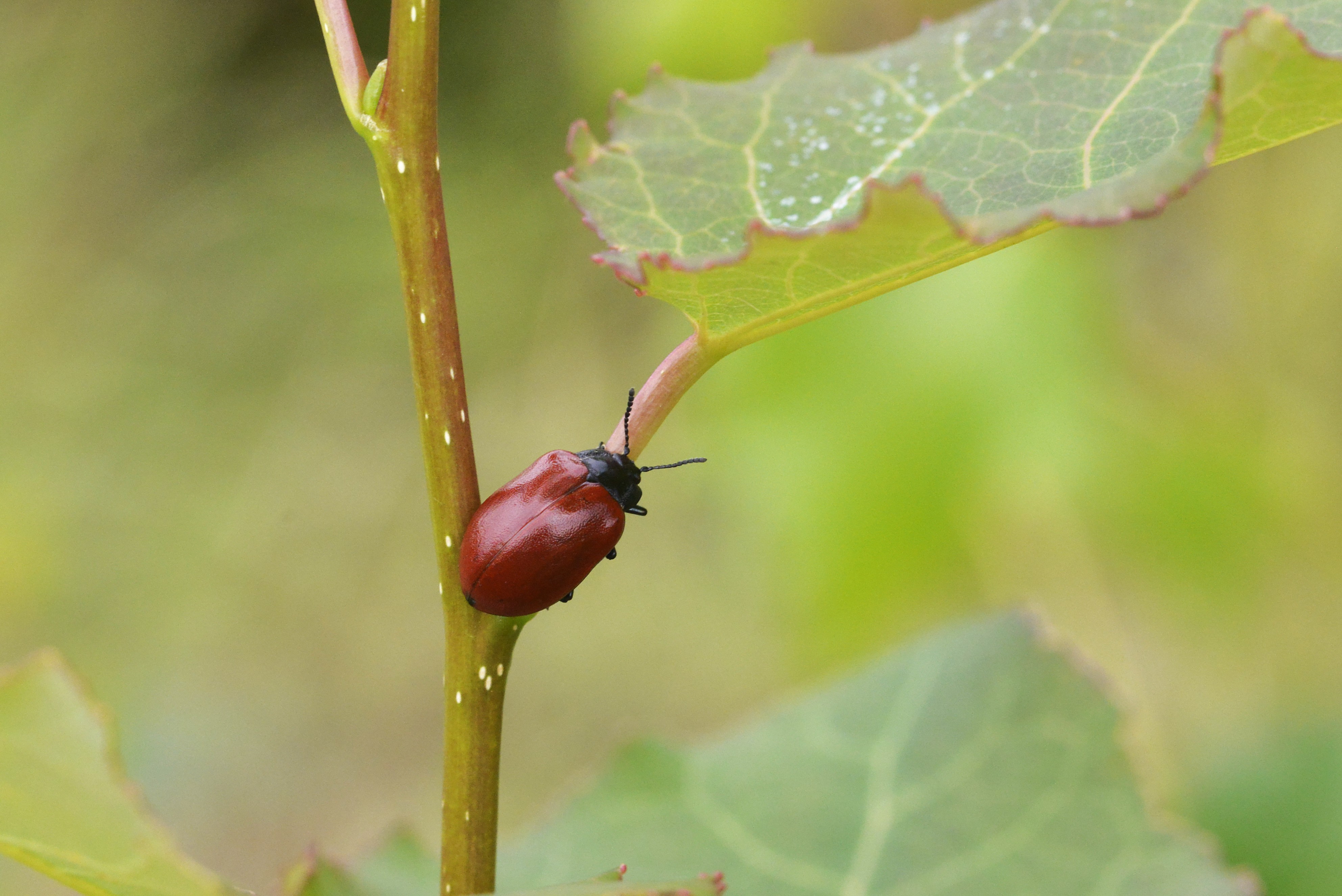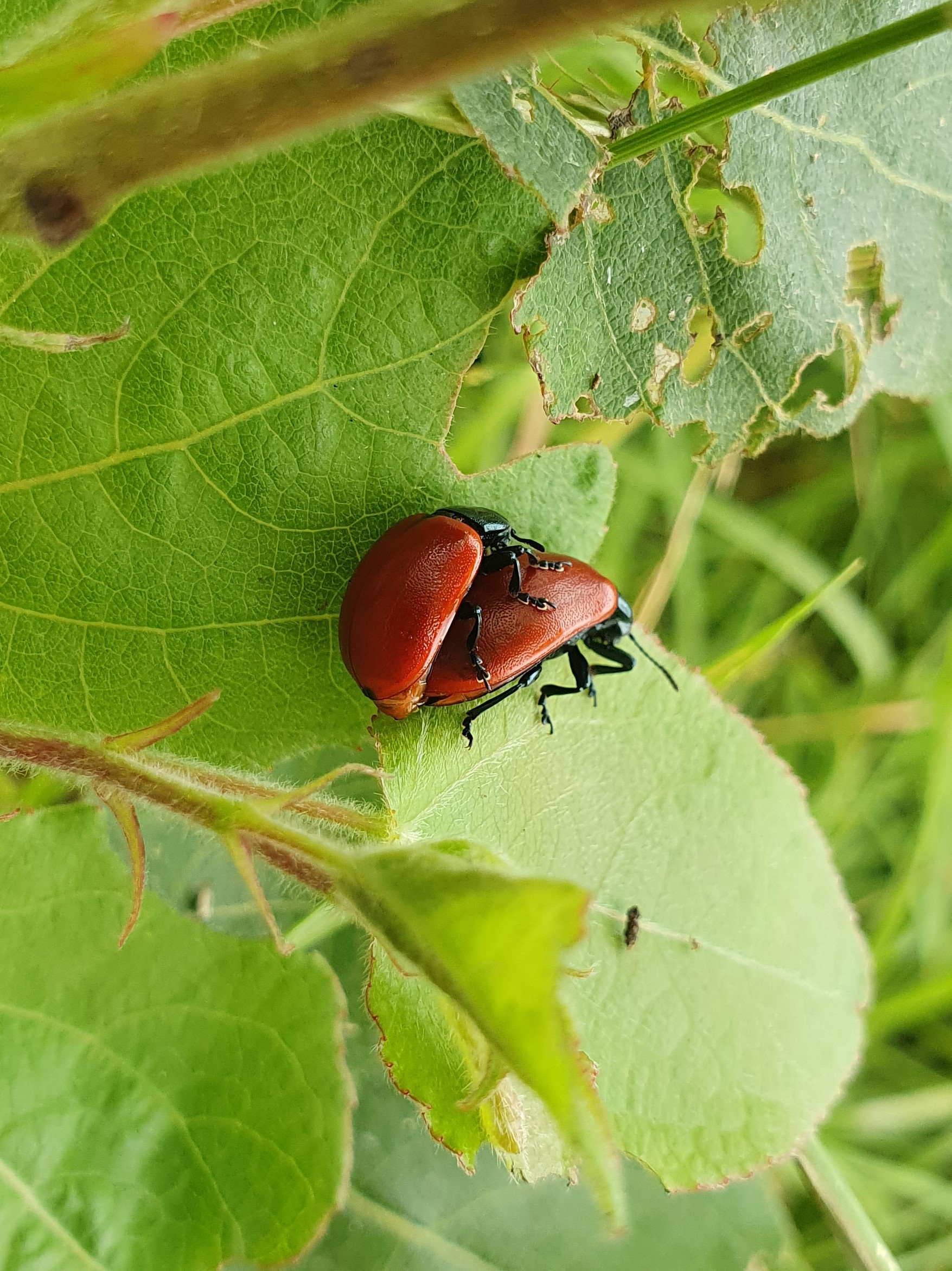 Pappelblattkäfer (Chrysomela populi) in der Gemarkung Hohenprießnitz, Sportplatz, nördlicher Waldrand, auf einer Espe (Populus tremula), April 2014