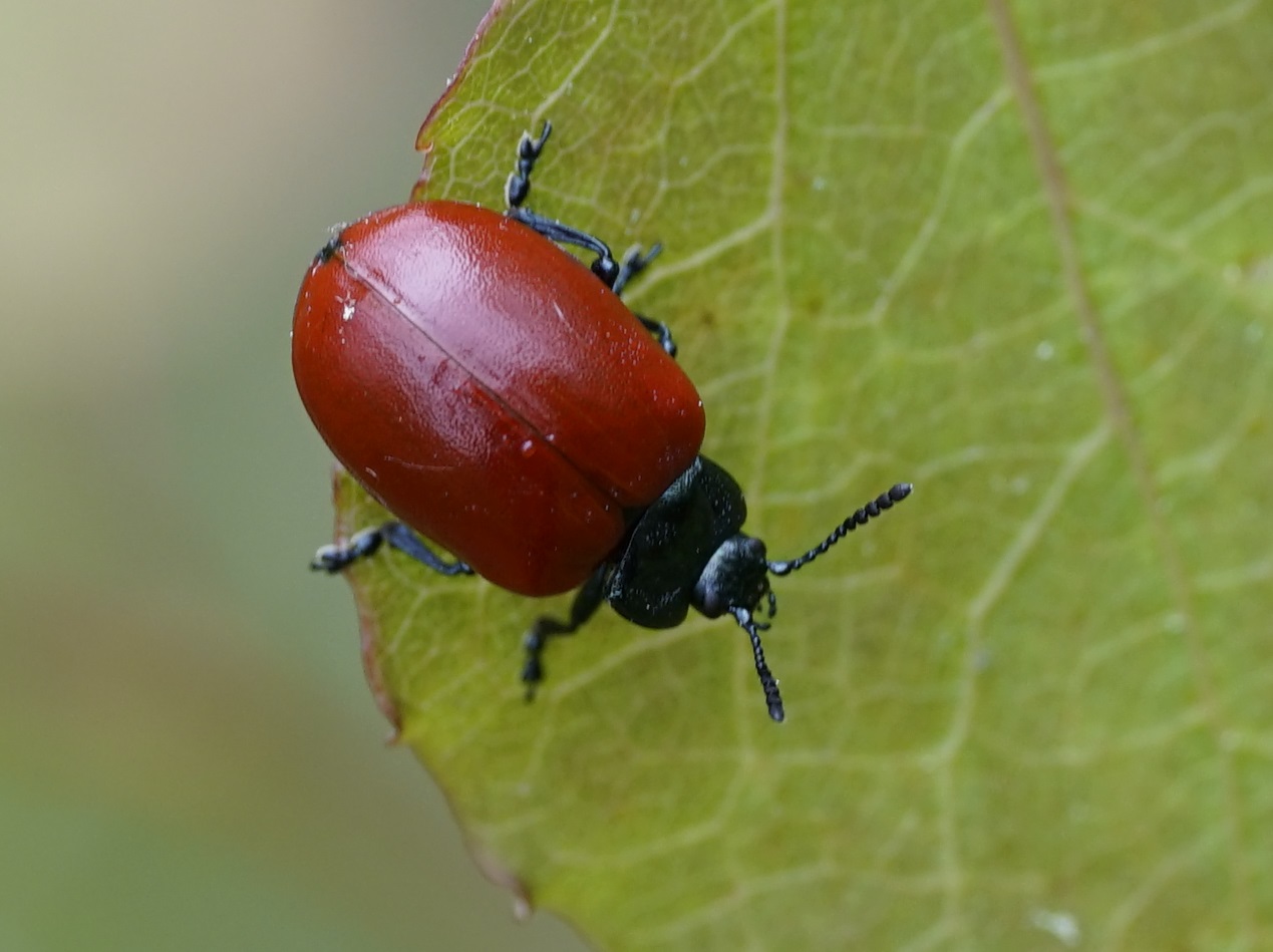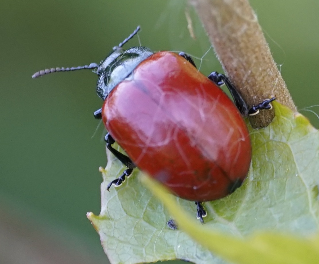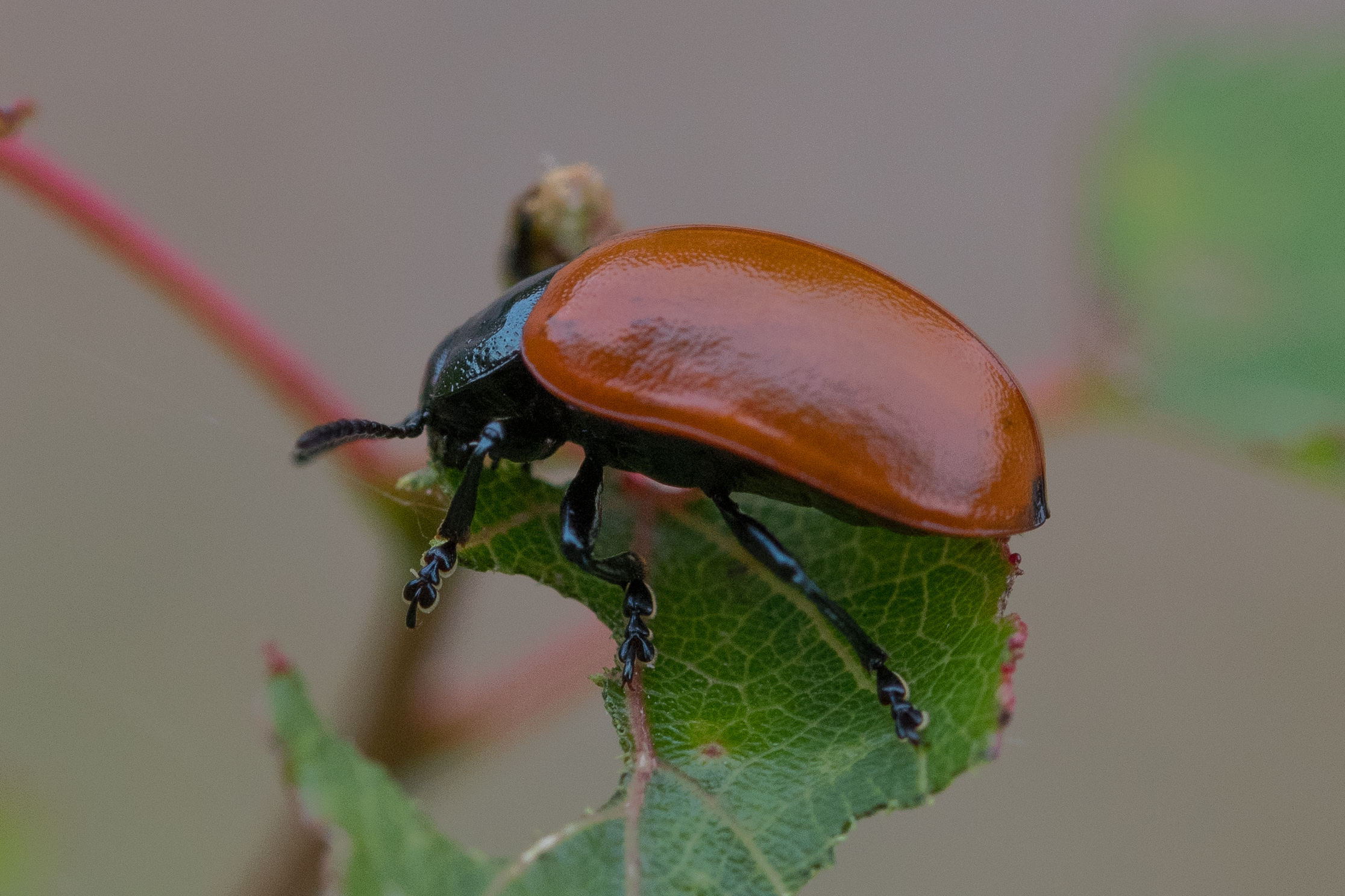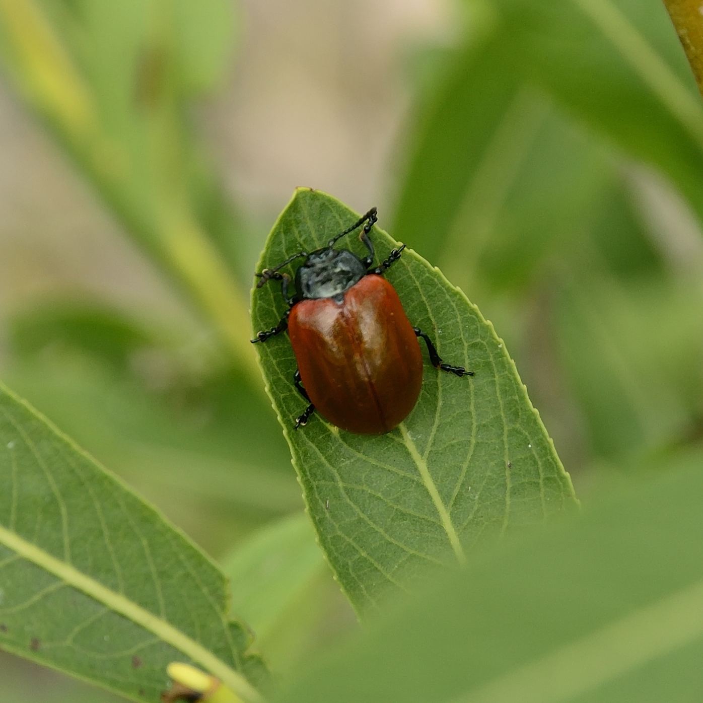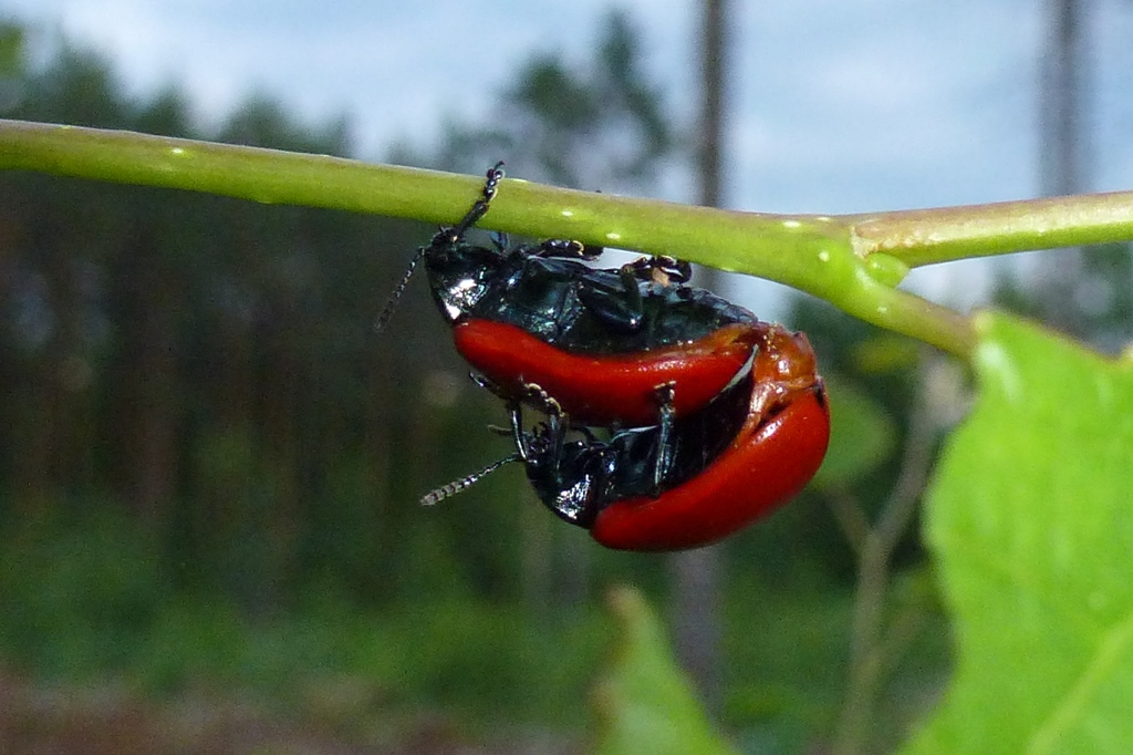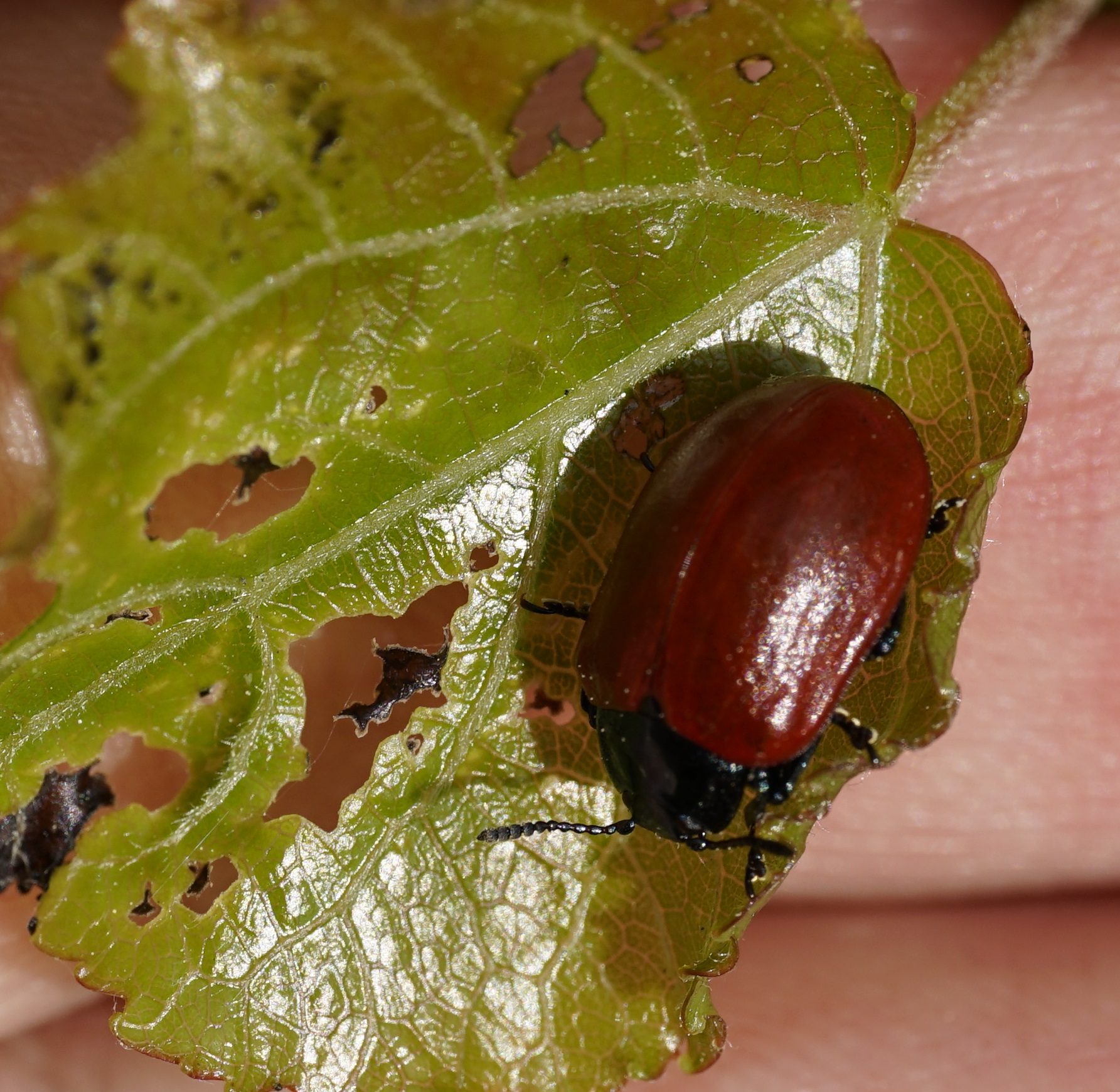 Pappelblattkäfer (Chrysomela populi) in der Gemarkung Hohenprießnitz, Sportplatz, nördlicher Waldrand, auf einer Espe (Populus tremula), April 2014