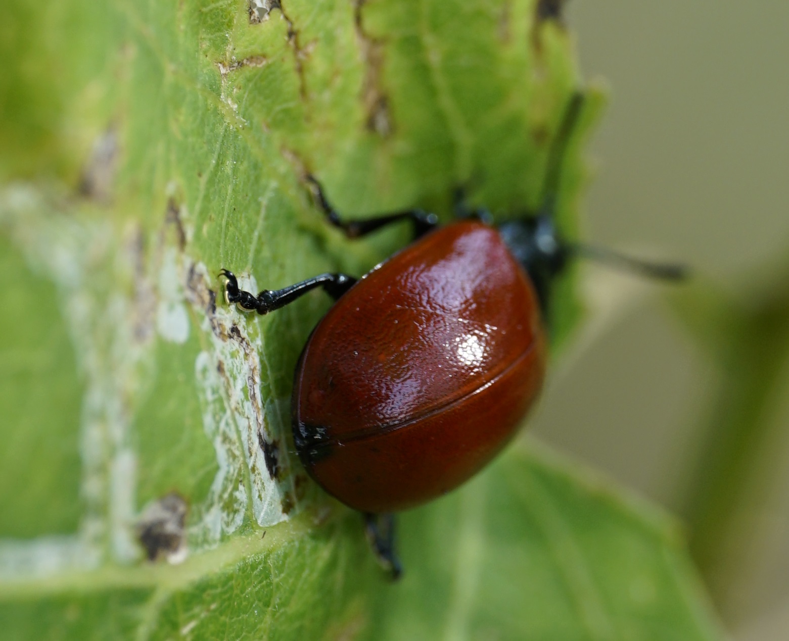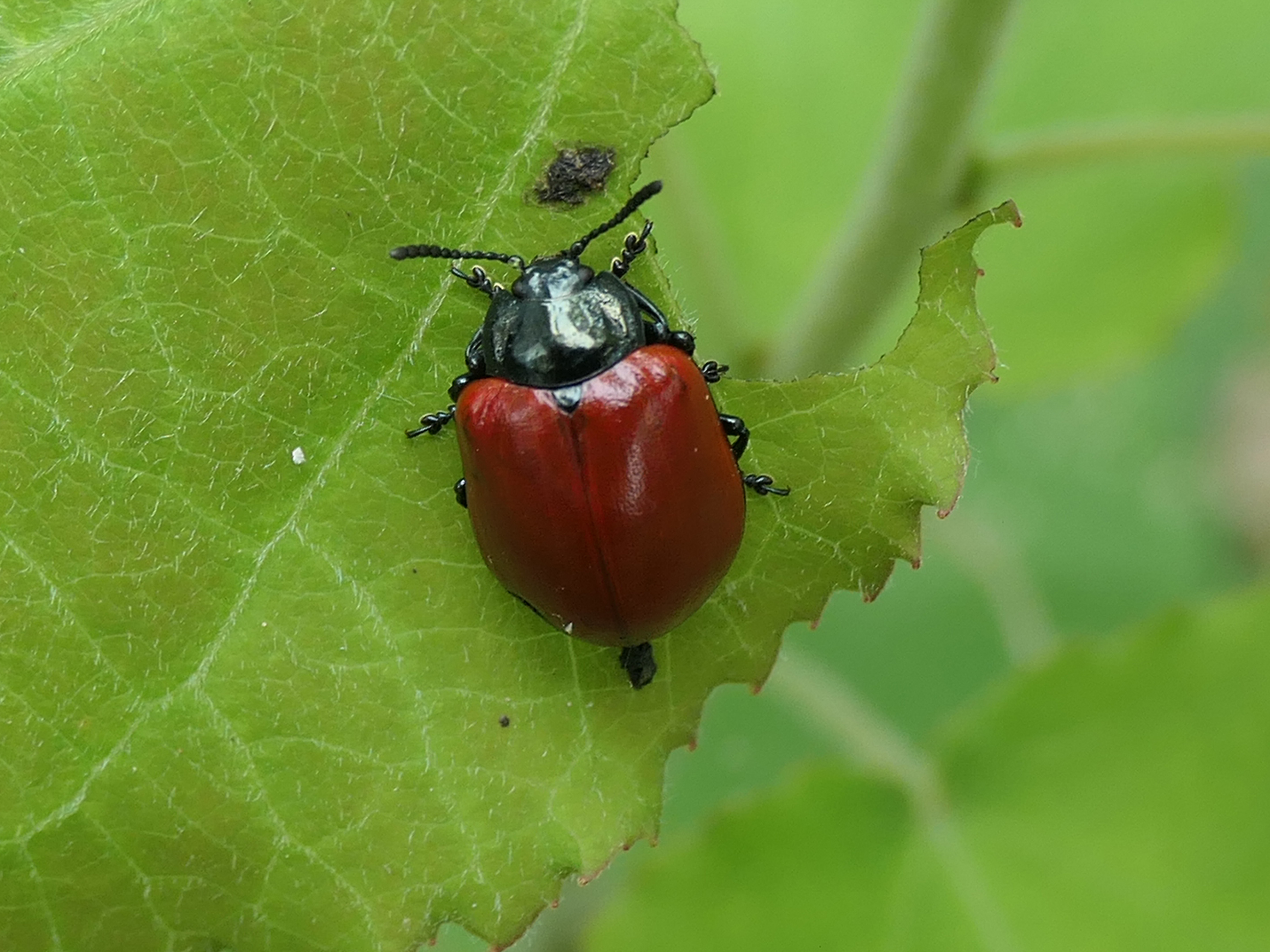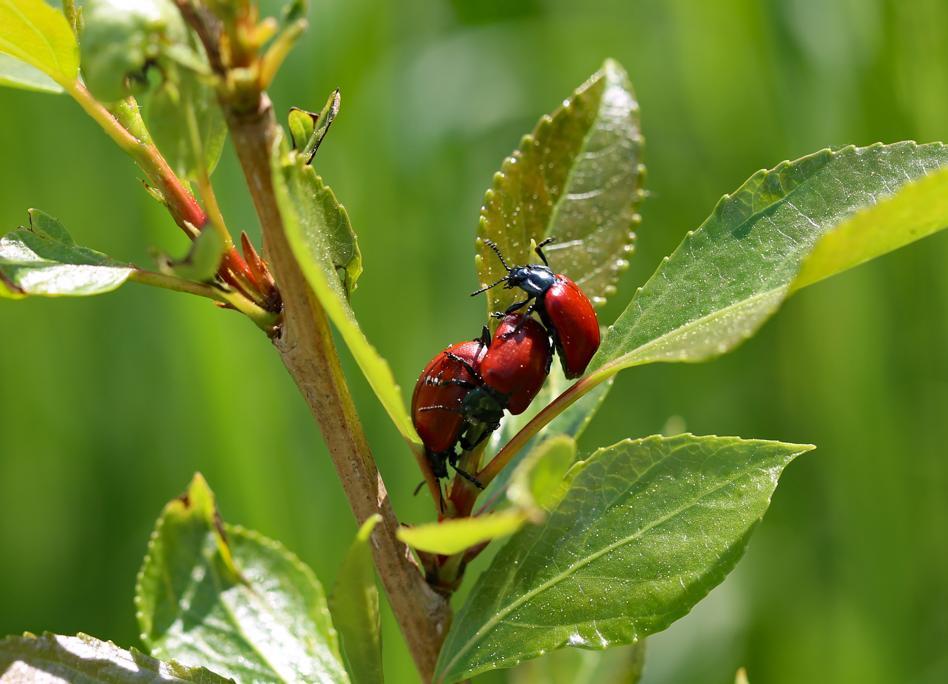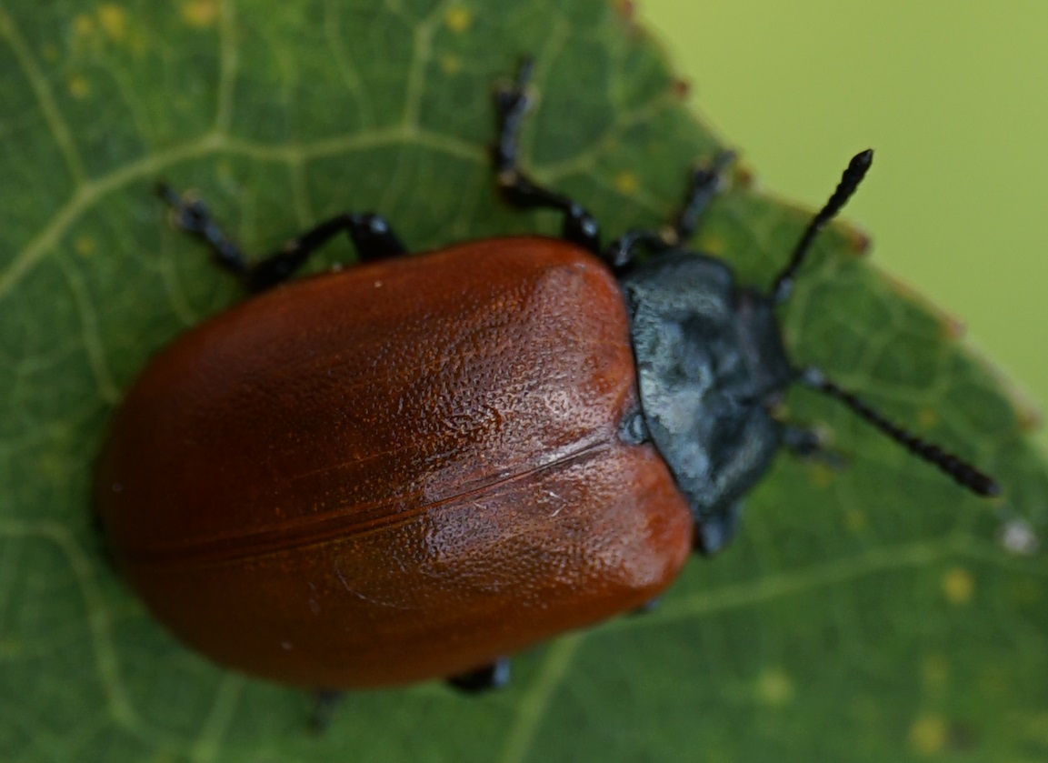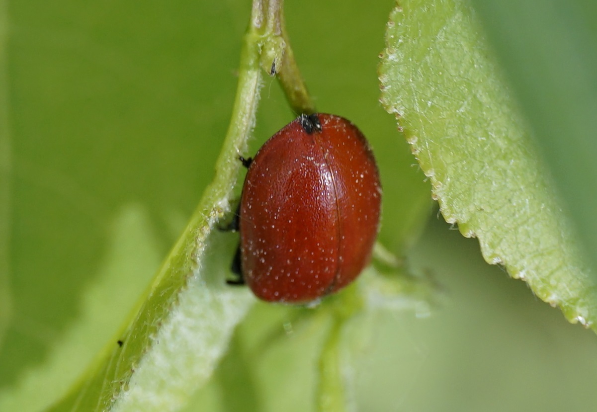 Pappelblattkäfer (Chrysomela populi) in der Gemarkung Hohenprießnitz, Sportplatz, nördlicher Waldrand, auf einer Espe (Populus tremula), April 2014