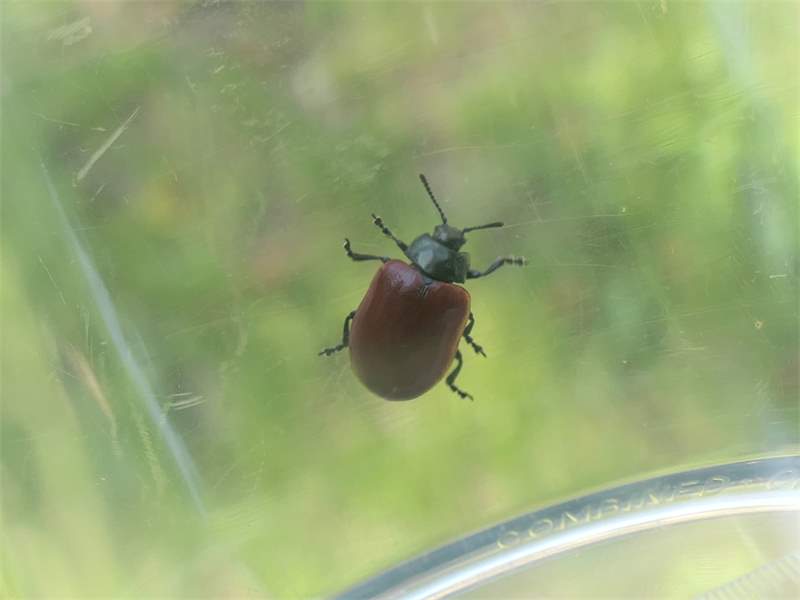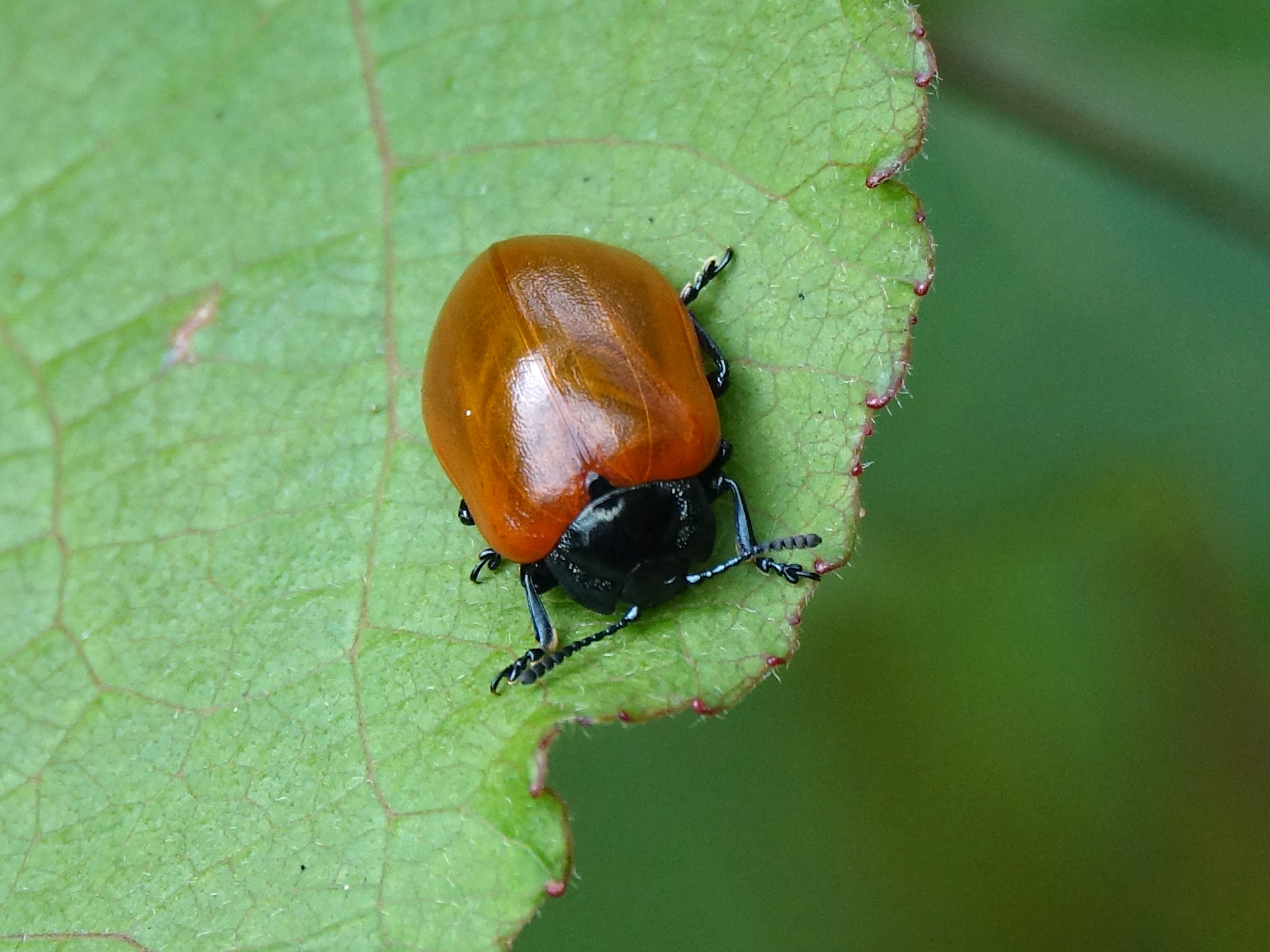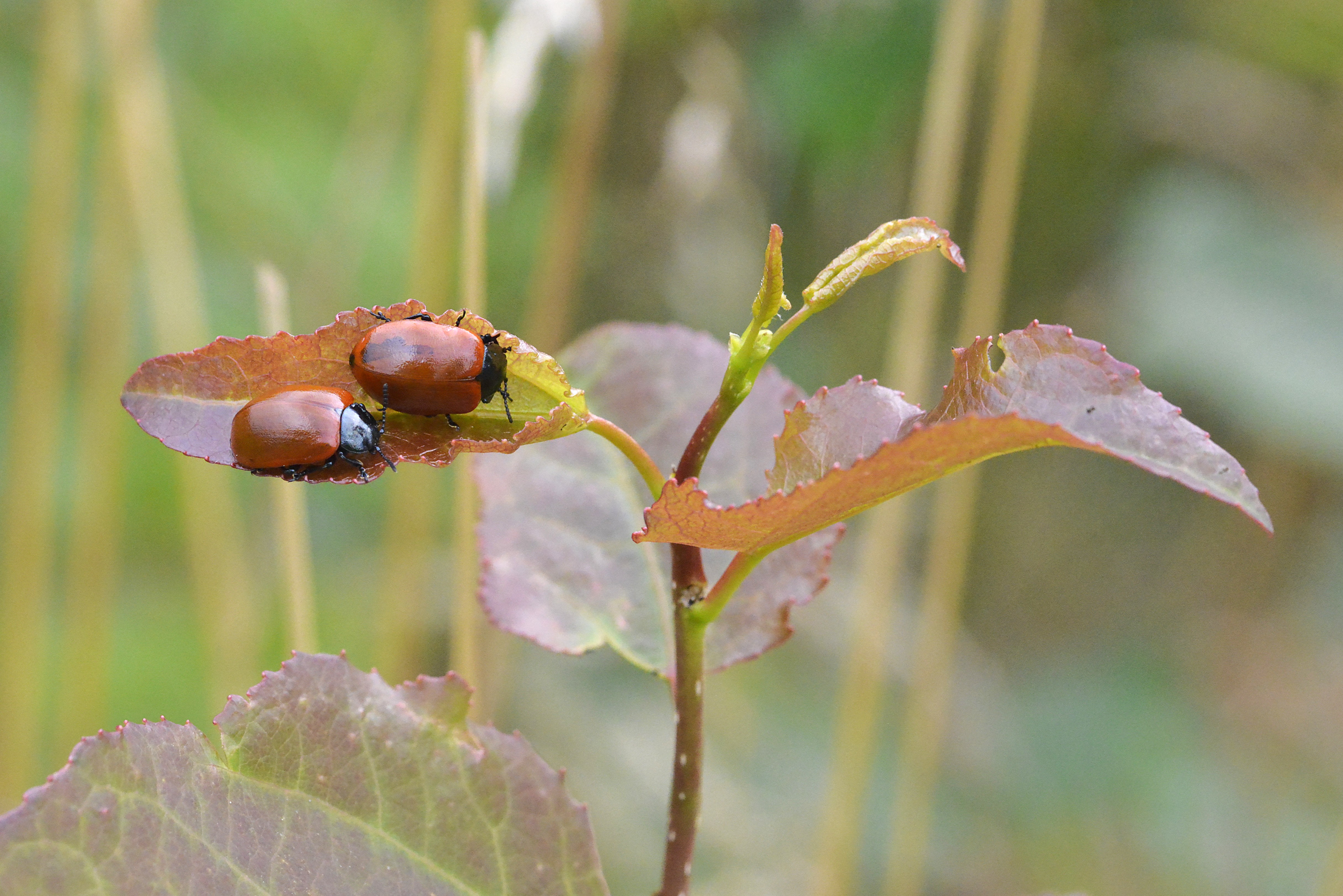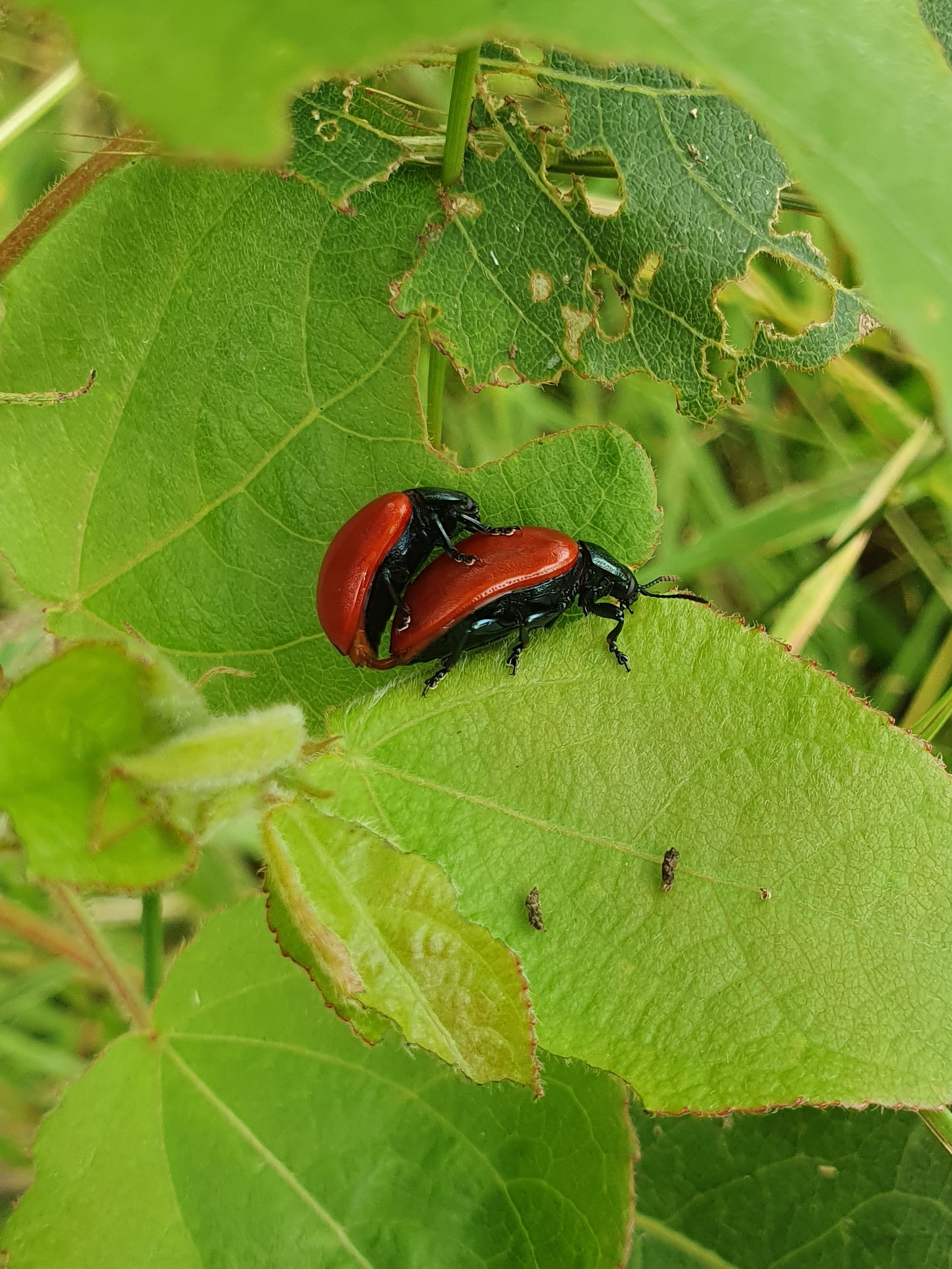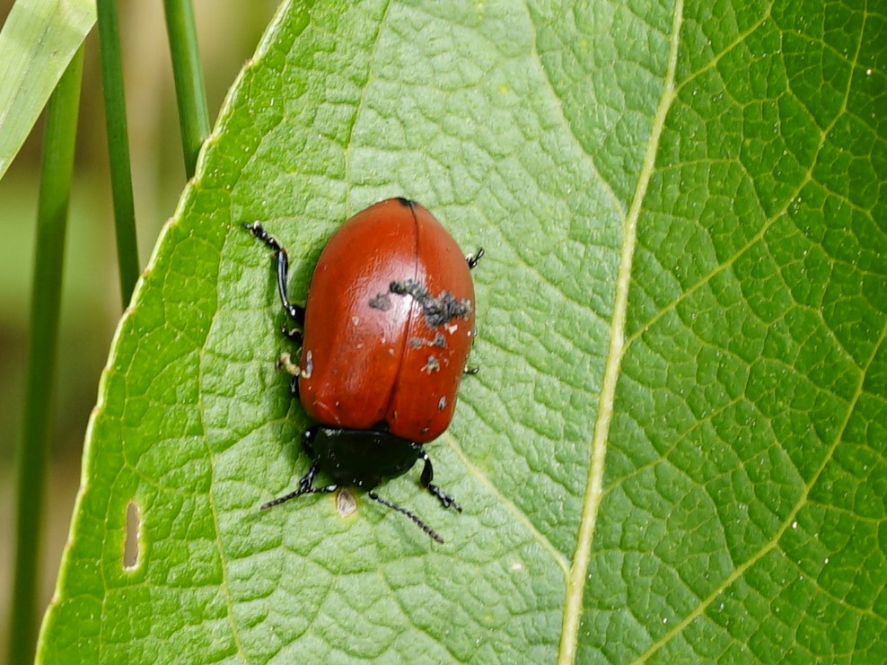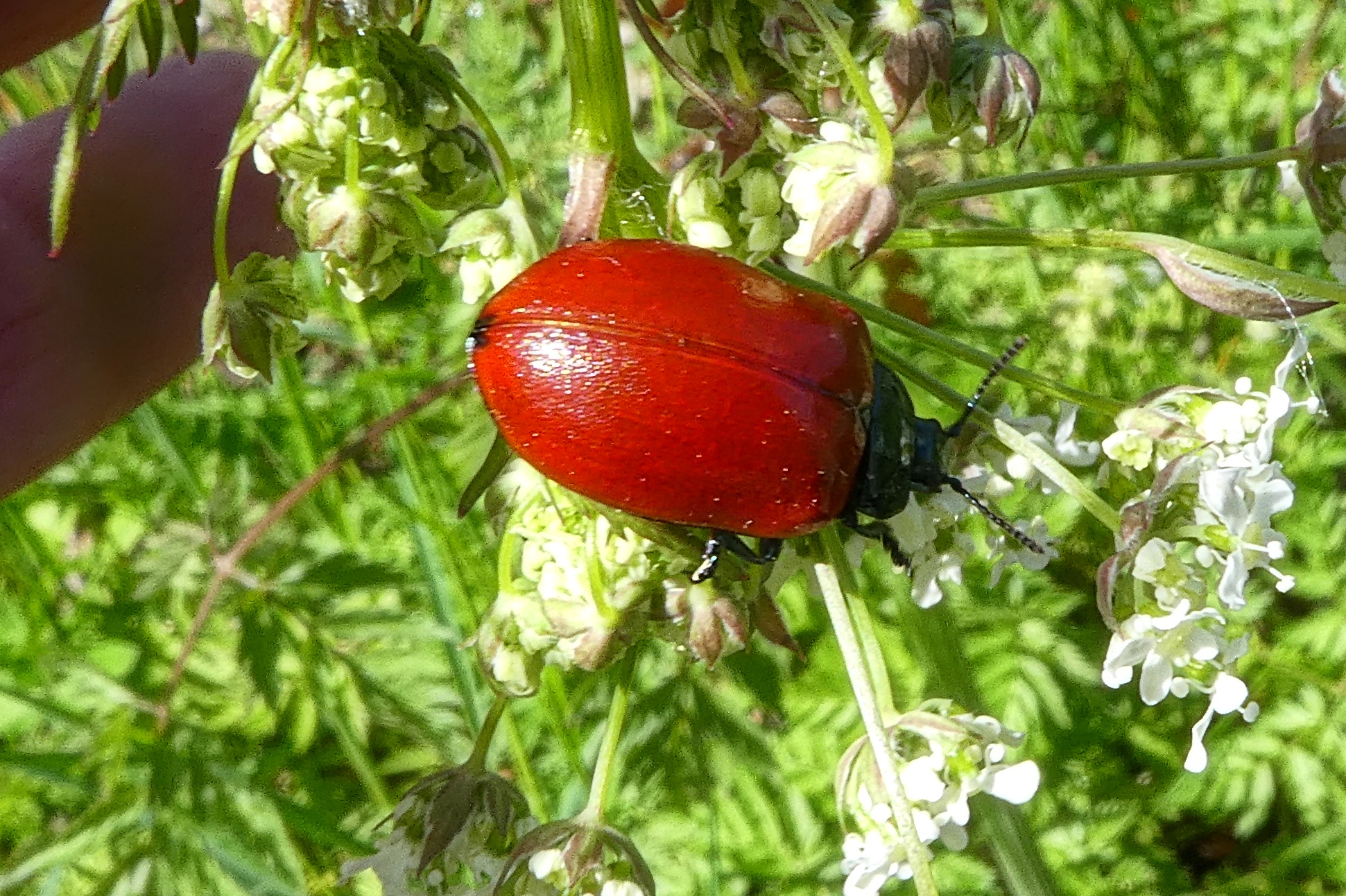 Pappelblattkäfer (Chrysomela populi) in der Gemarkung Hohenprießnitz, Sportplatz, nördlicher Waldrand, auf einer Espe (Populus tremula), April 2014