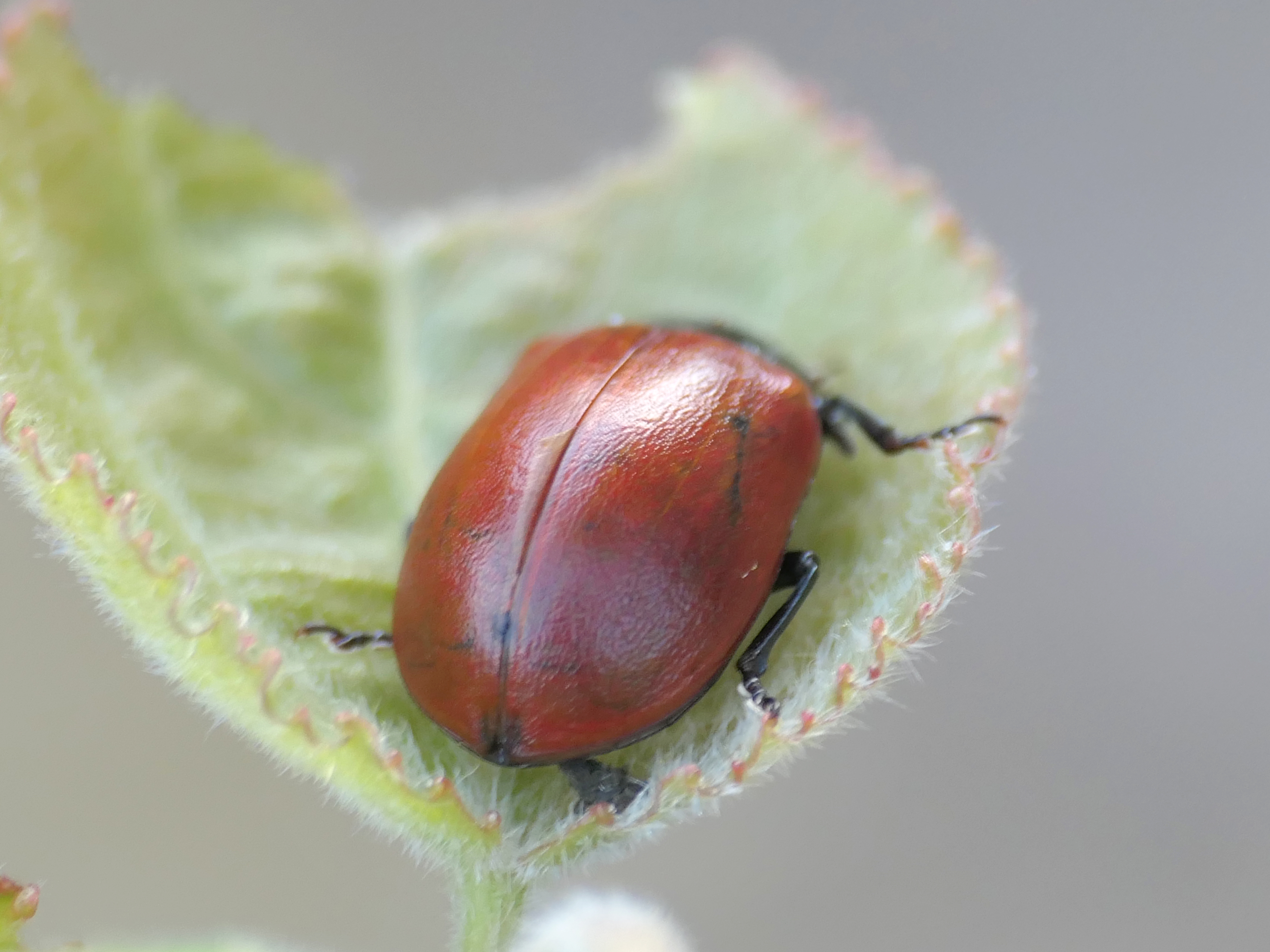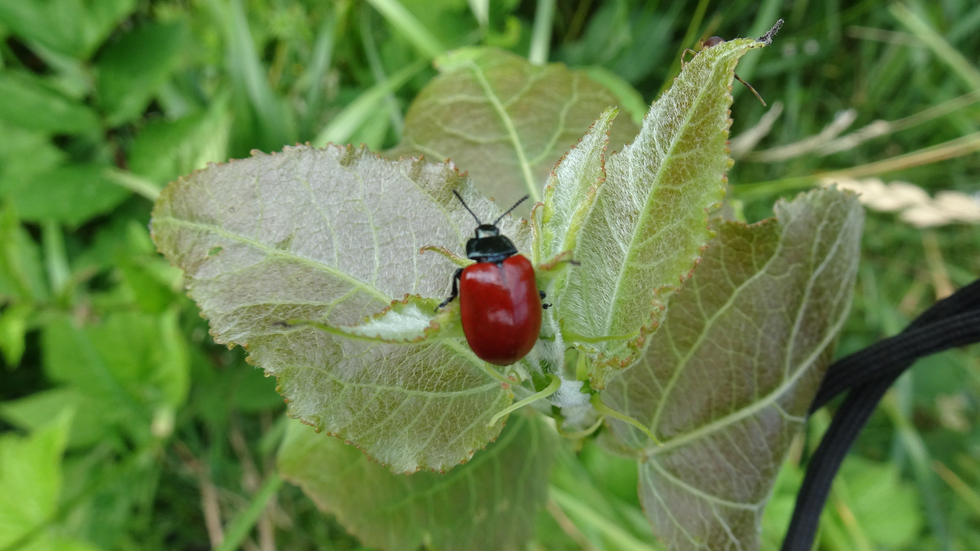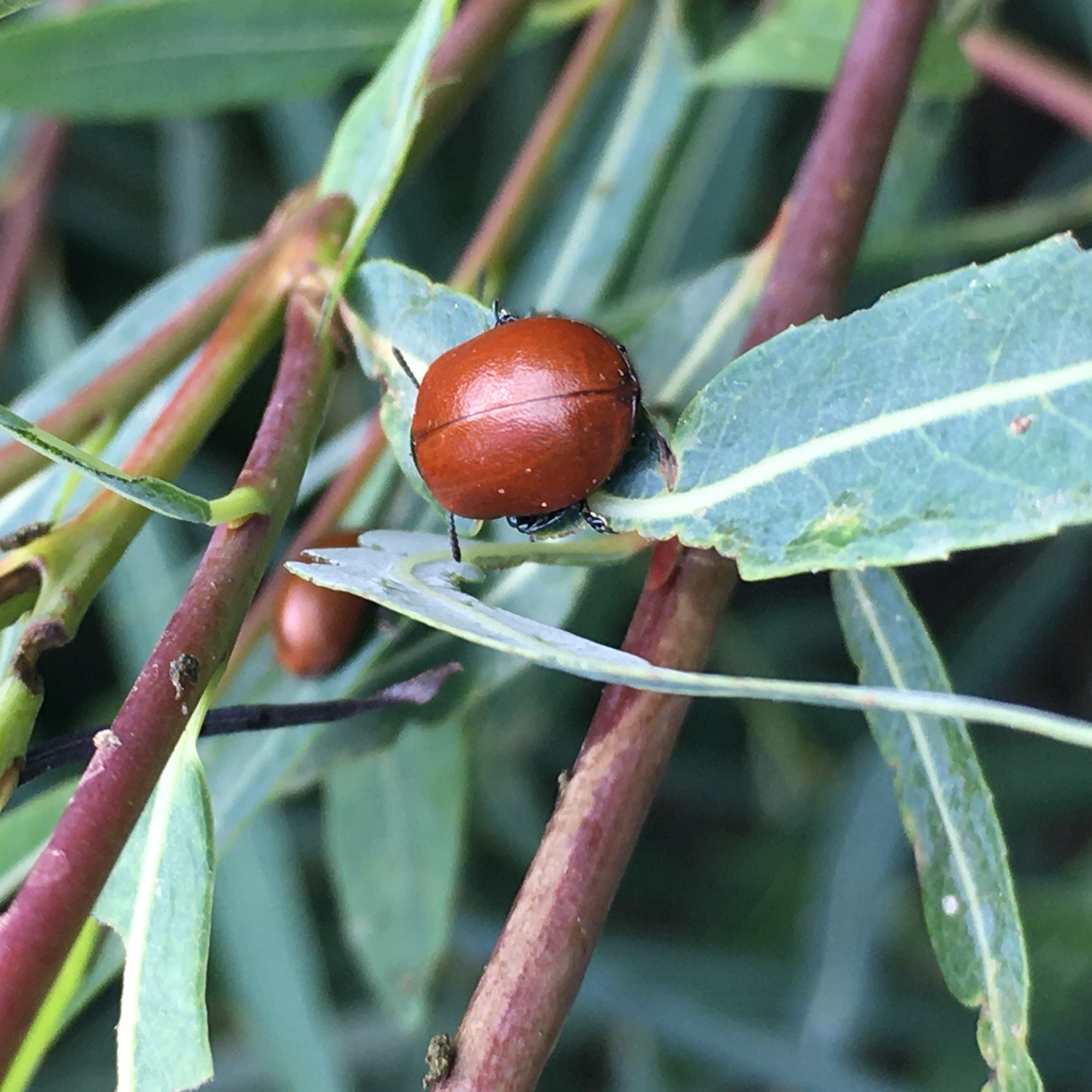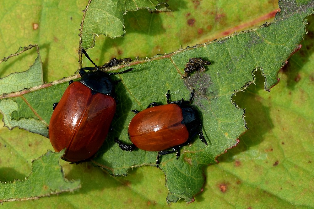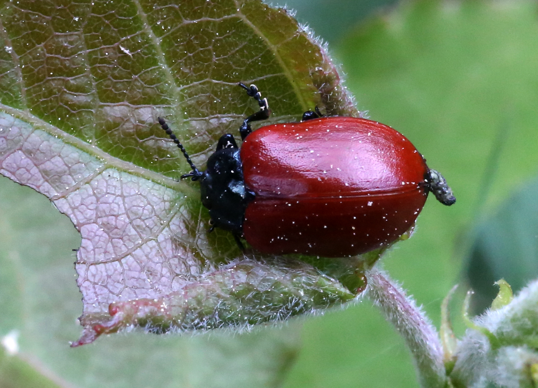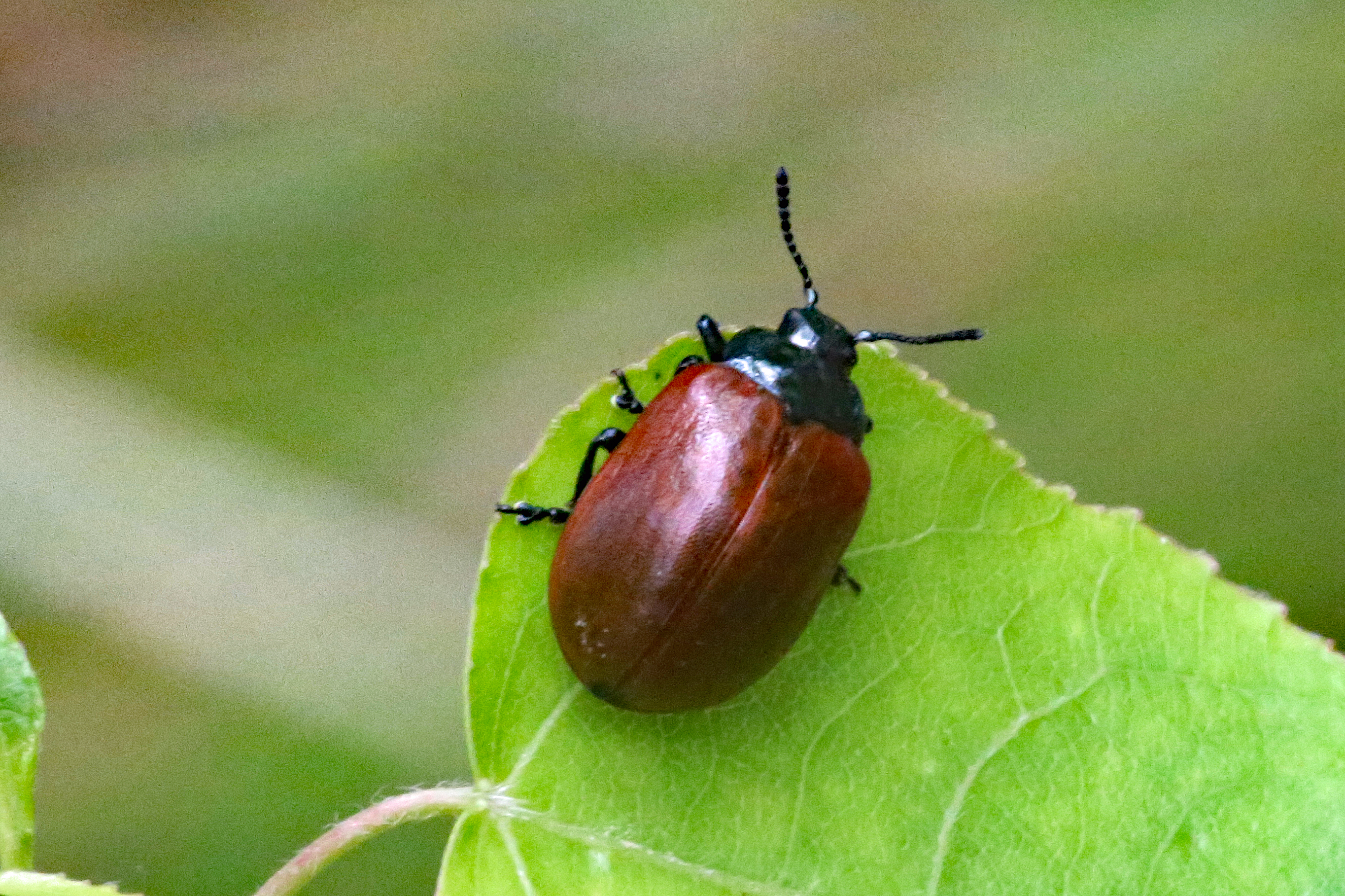 Pappelblattkäfer (Chrysomela populi) in der Gemarkung Hohenprießnitz, Sportplatz, nördlicher Waldrand, auf einer Espe (Populus tremula), April 2014