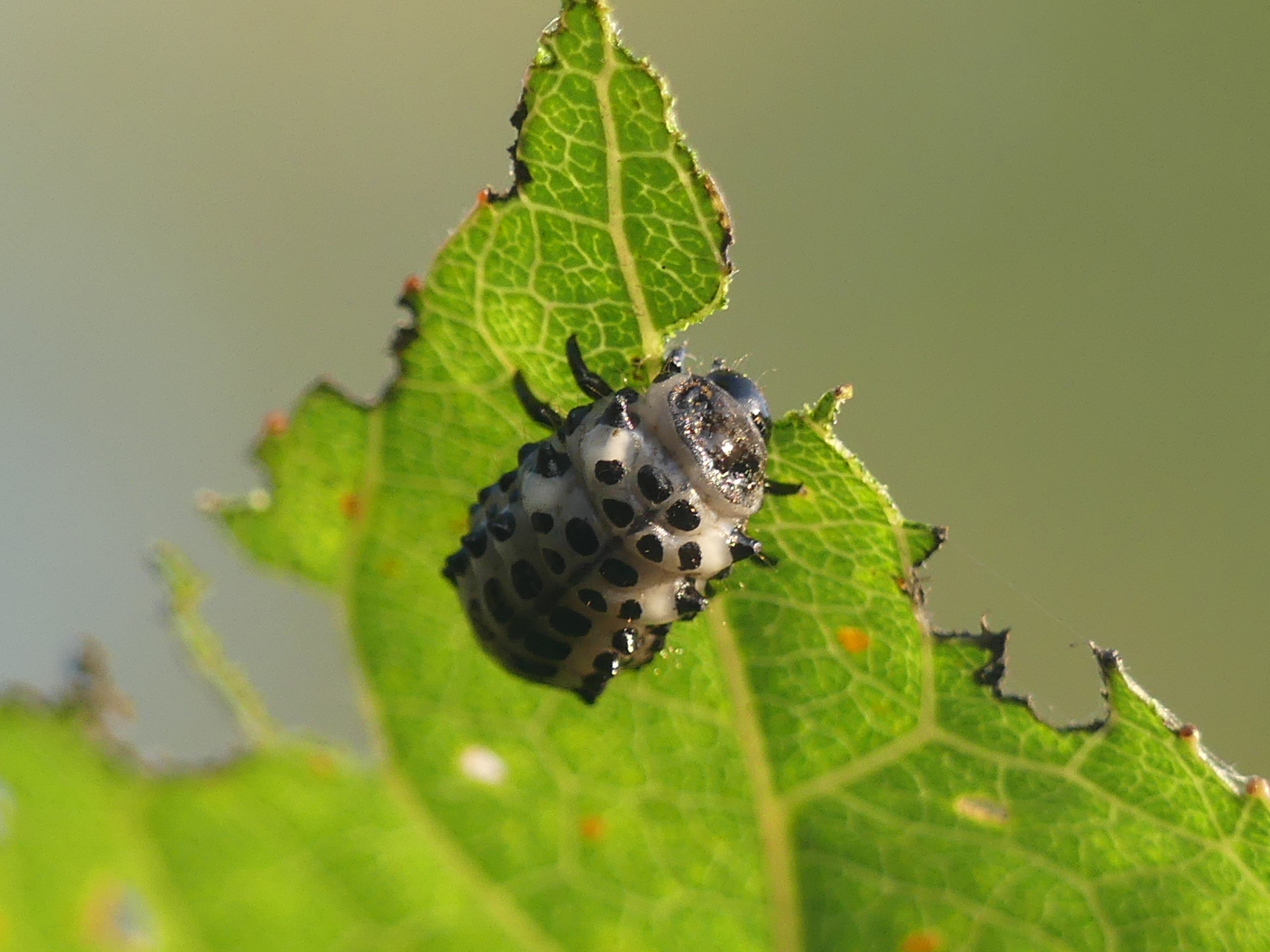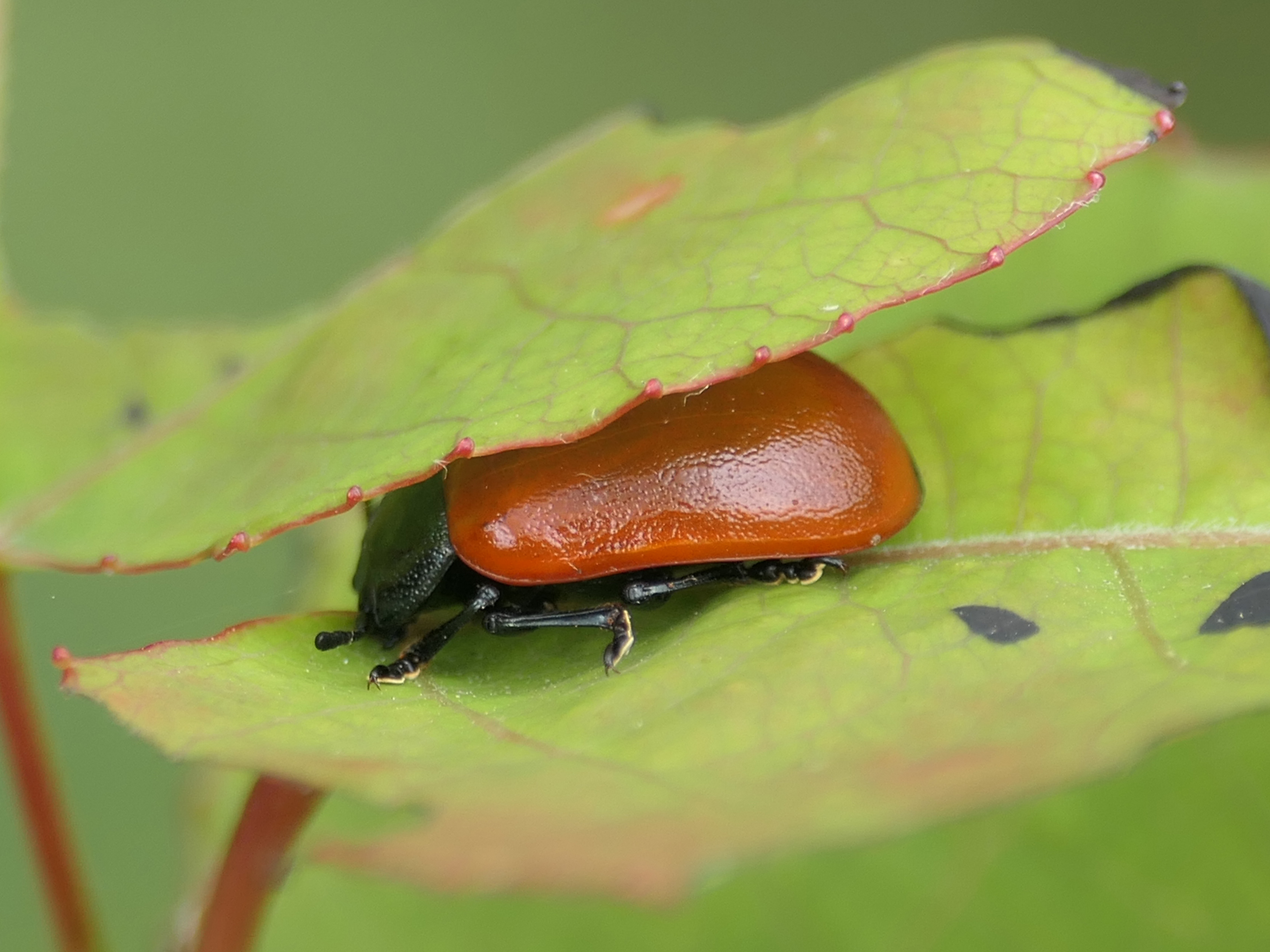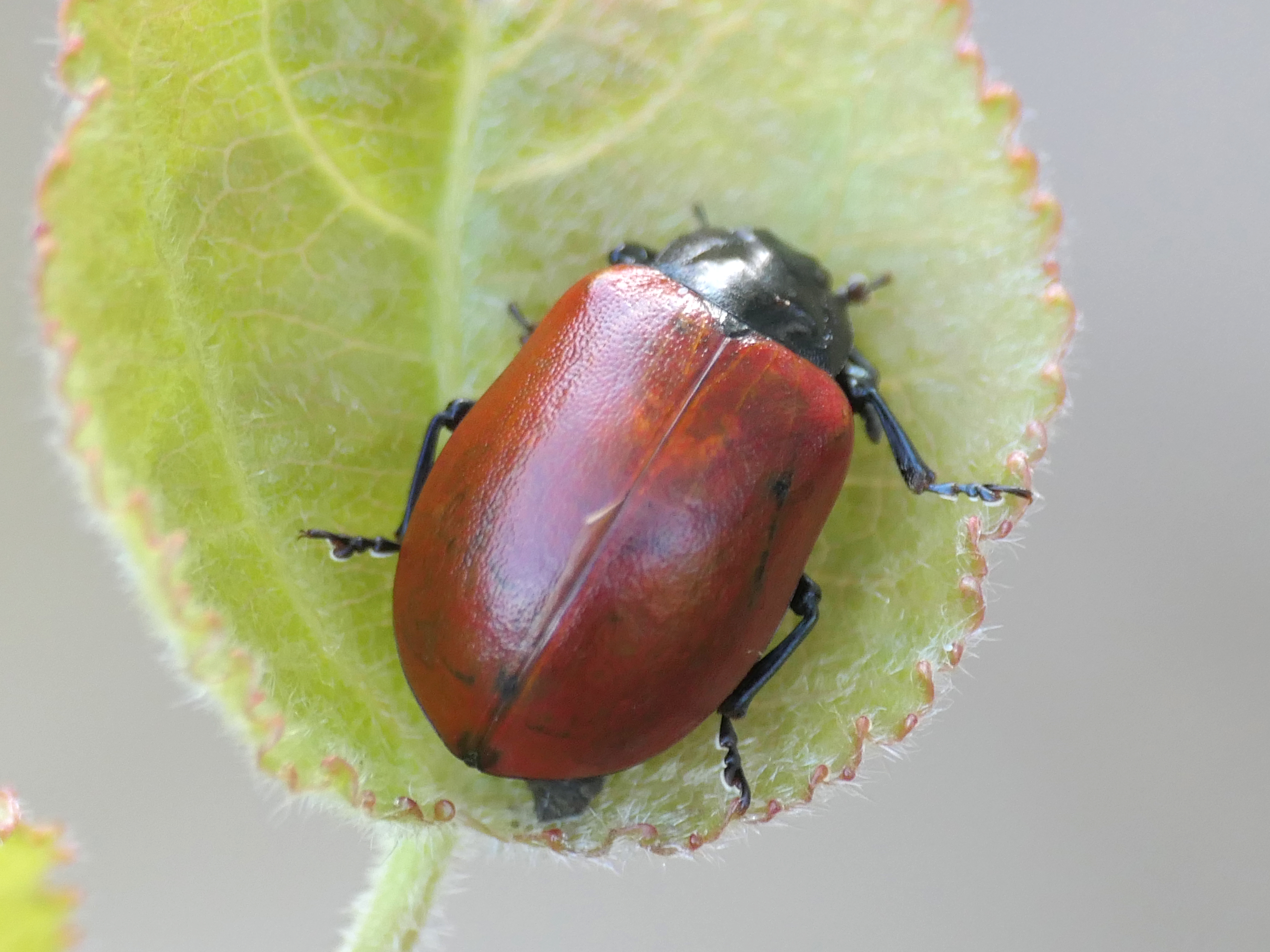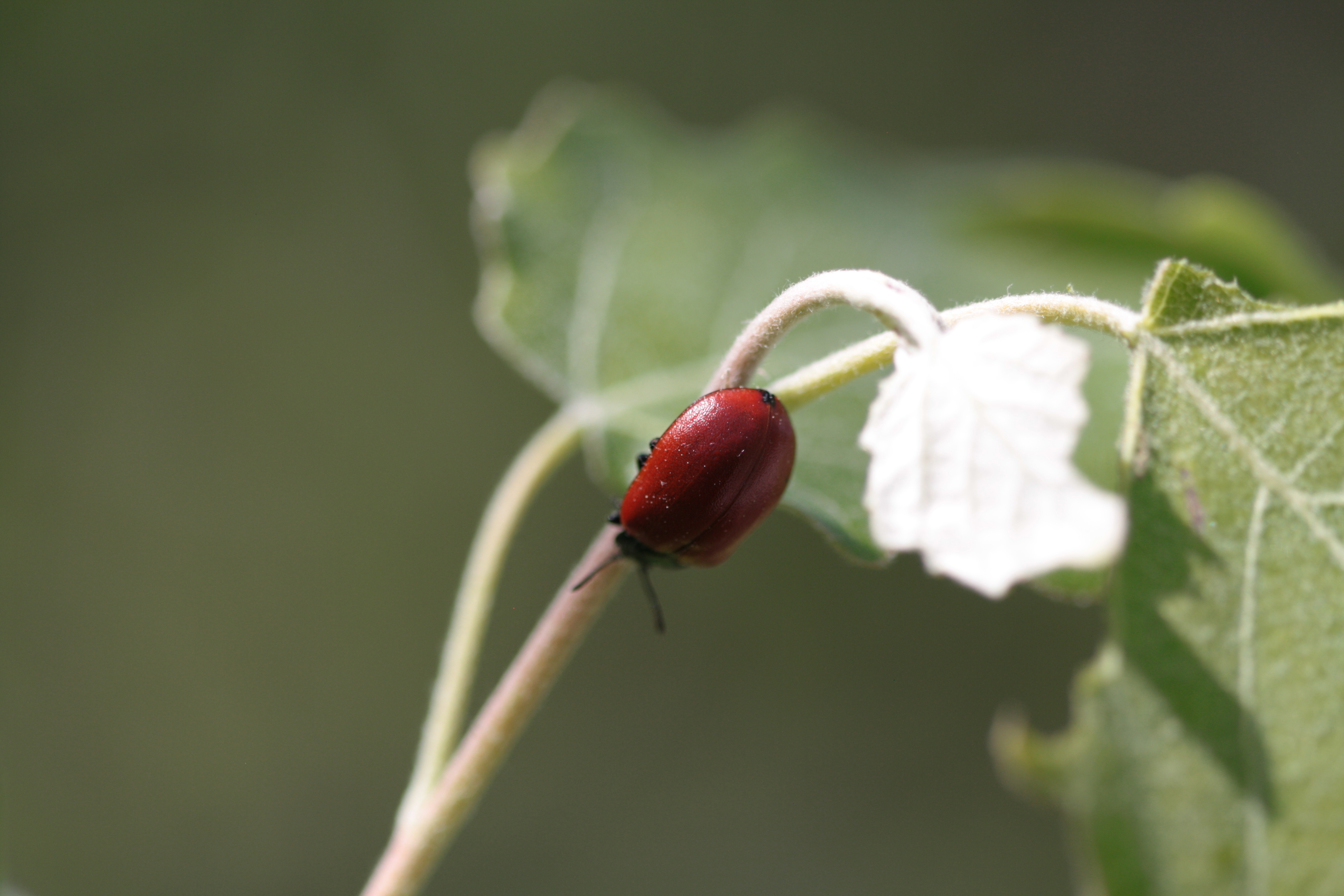 Pappelblattkäfer (Chrysomela populi) in der Gemarkung Hohenprießnitz, Sportplatz, nördlicher Waldrand, auf einer Espe (Populus tremula), April 2014