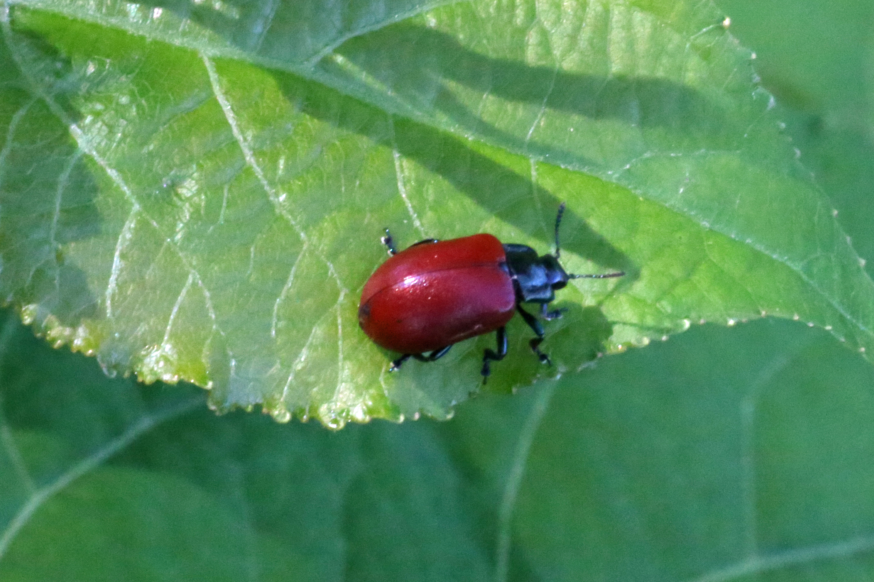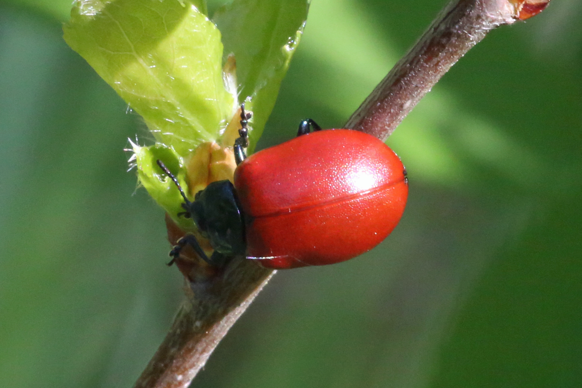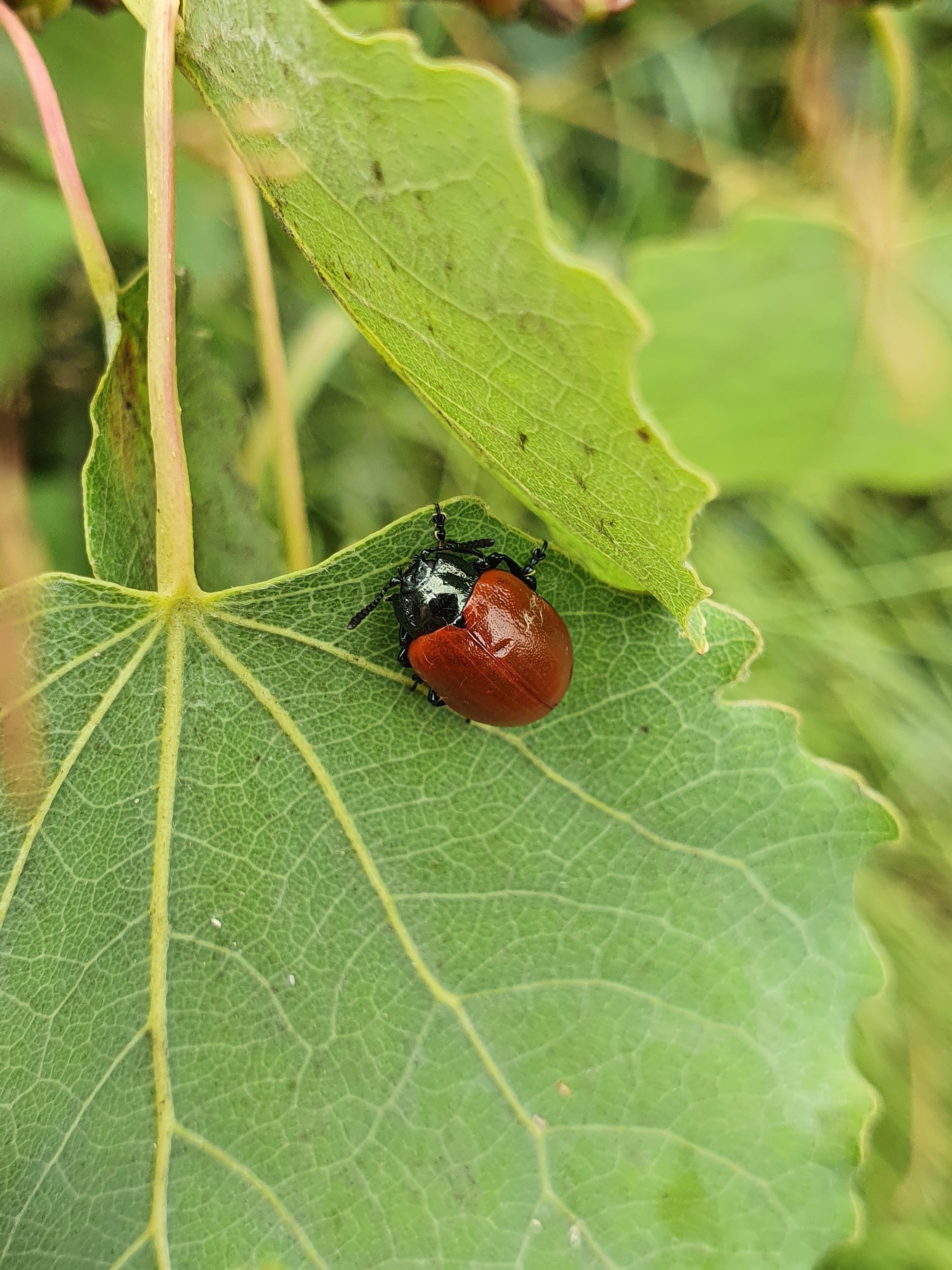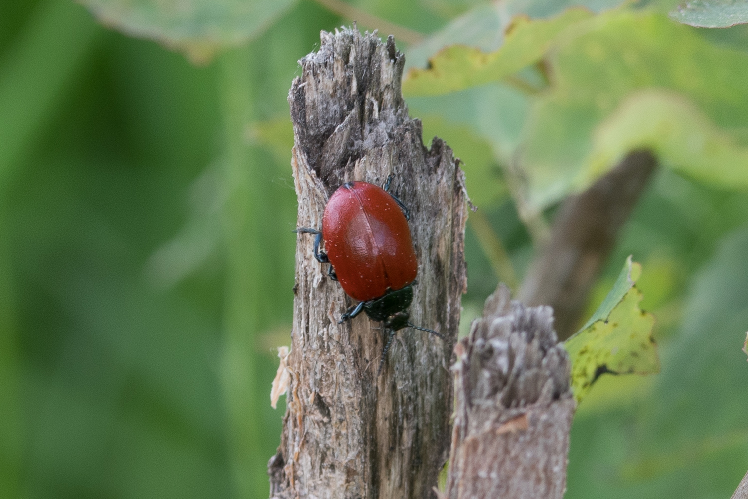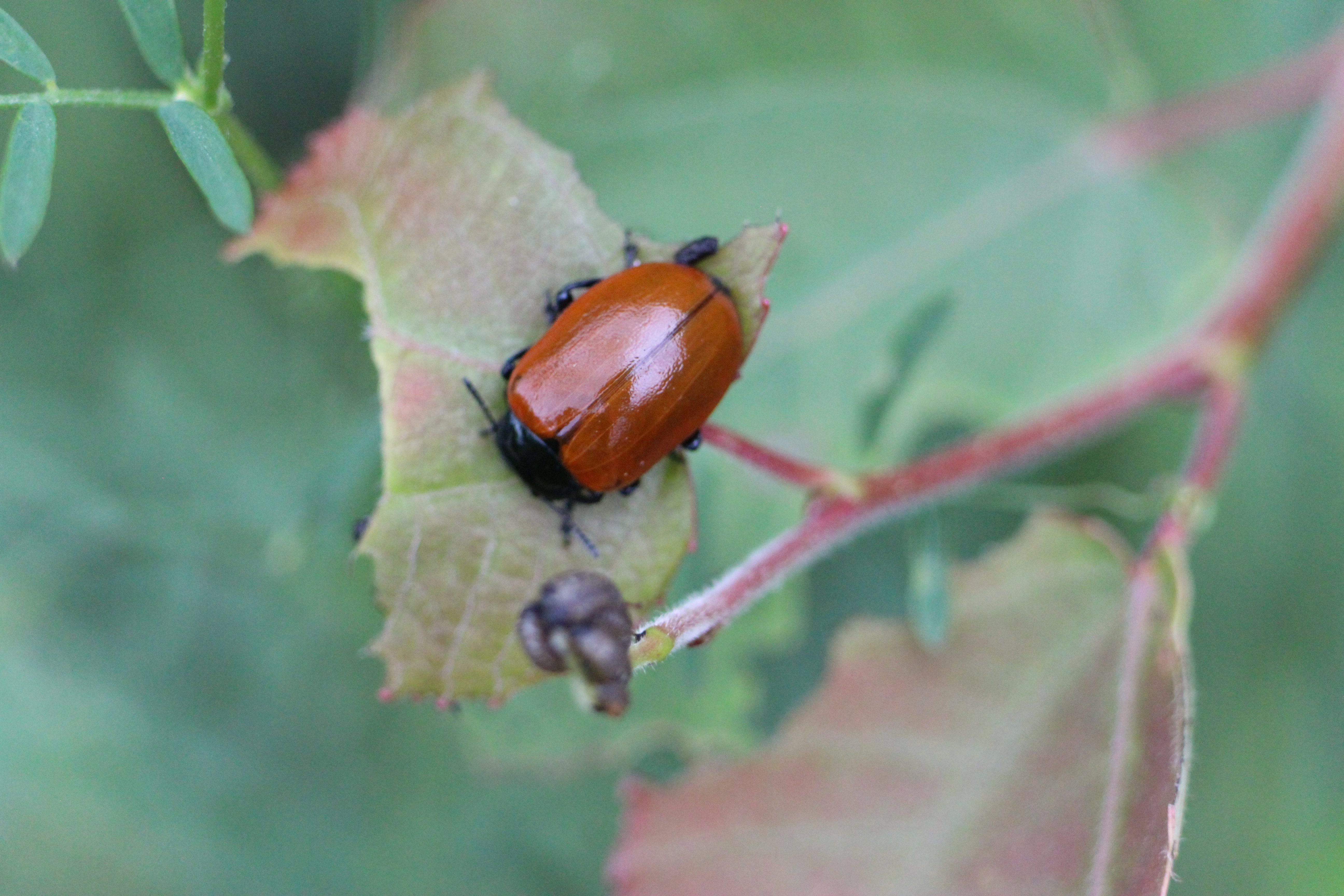 Pappelblattkäfer (Chrysomela populi) in der Gemarkung Hohenprießnitz, Sportplatz, nördlicher Waldrand, auf einer Espe (Populus tremula), April 2014