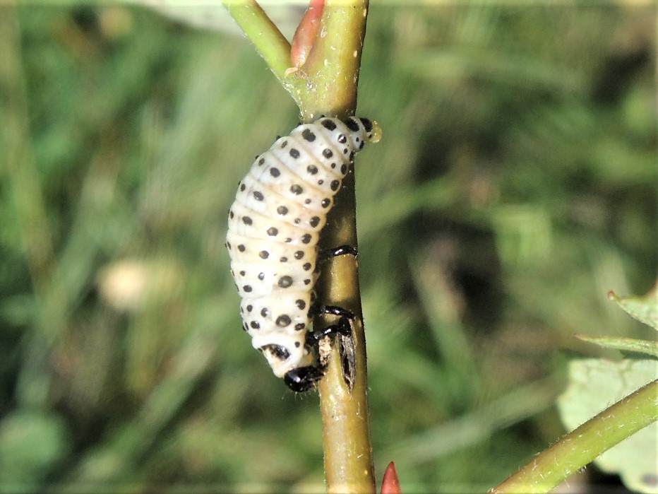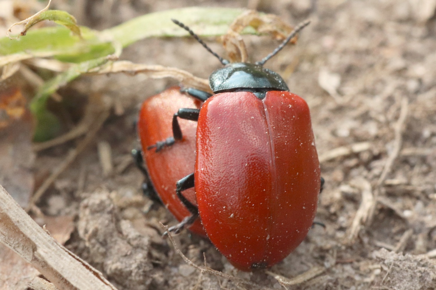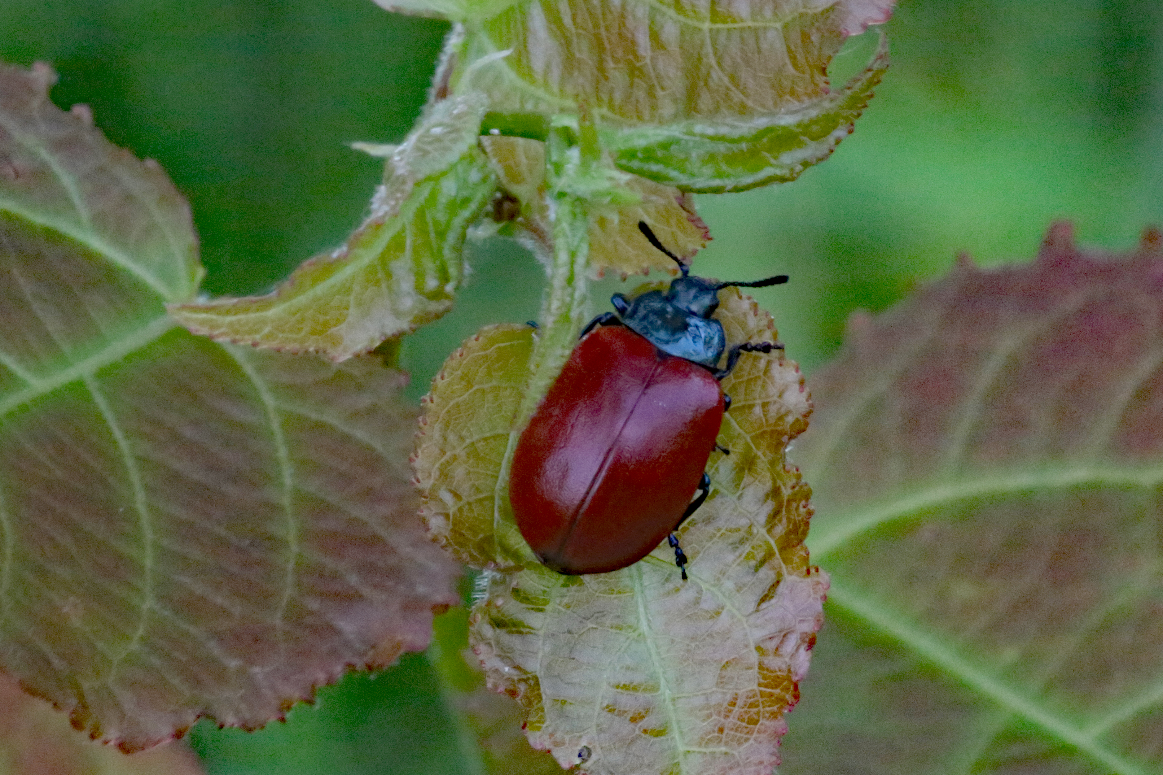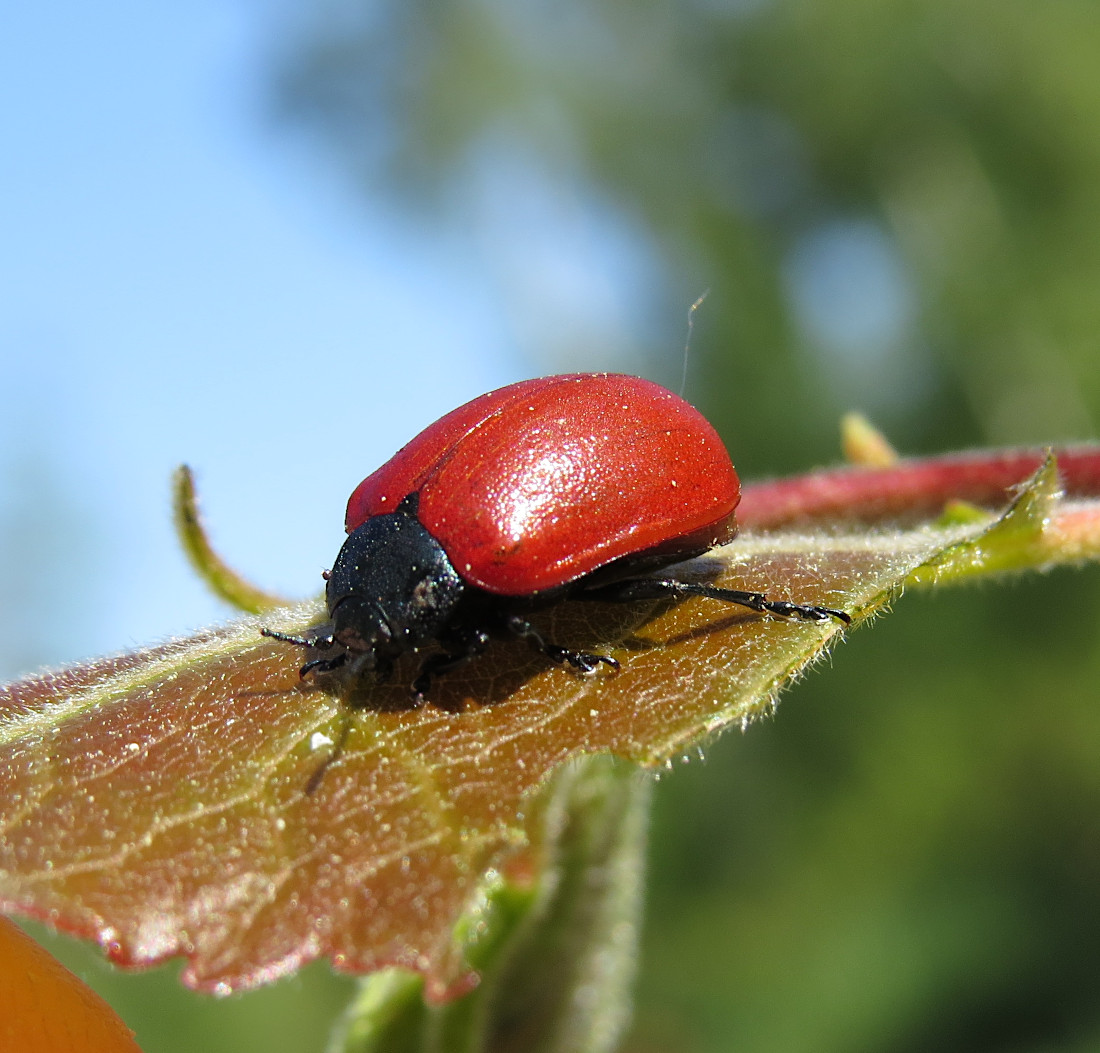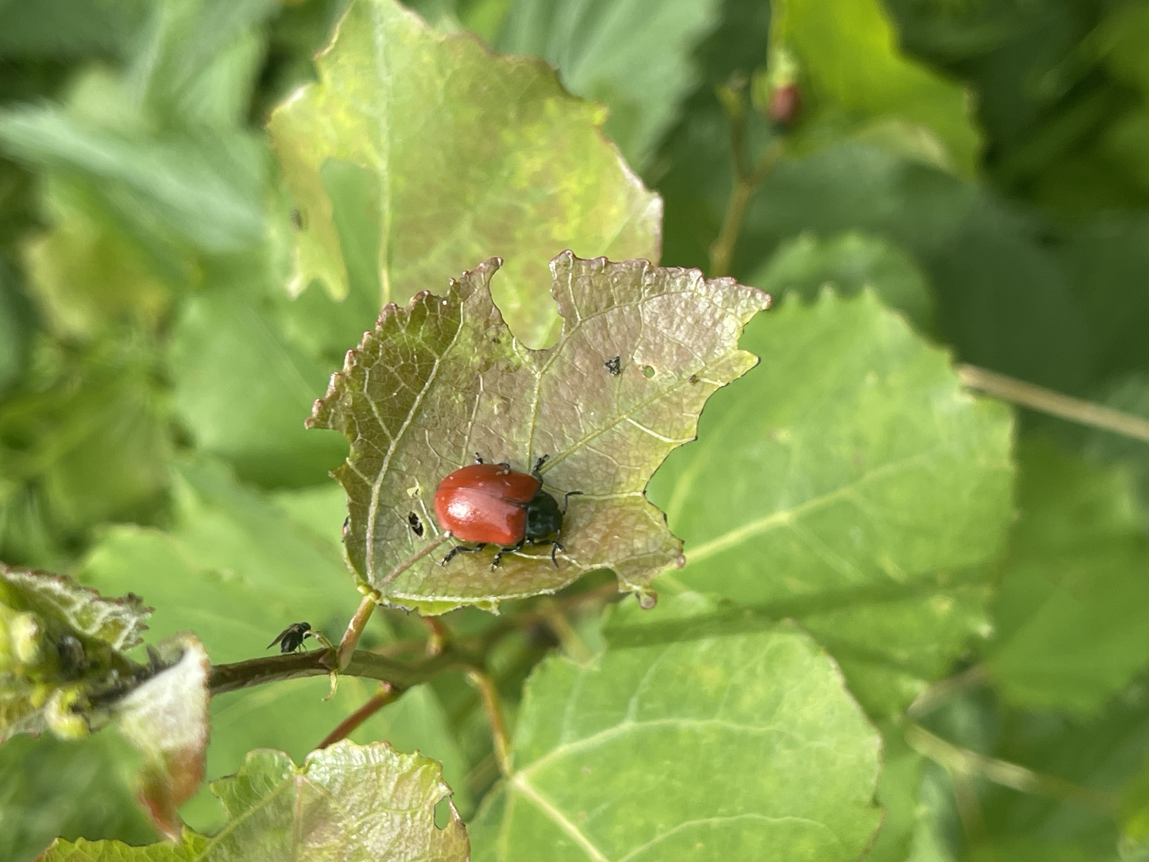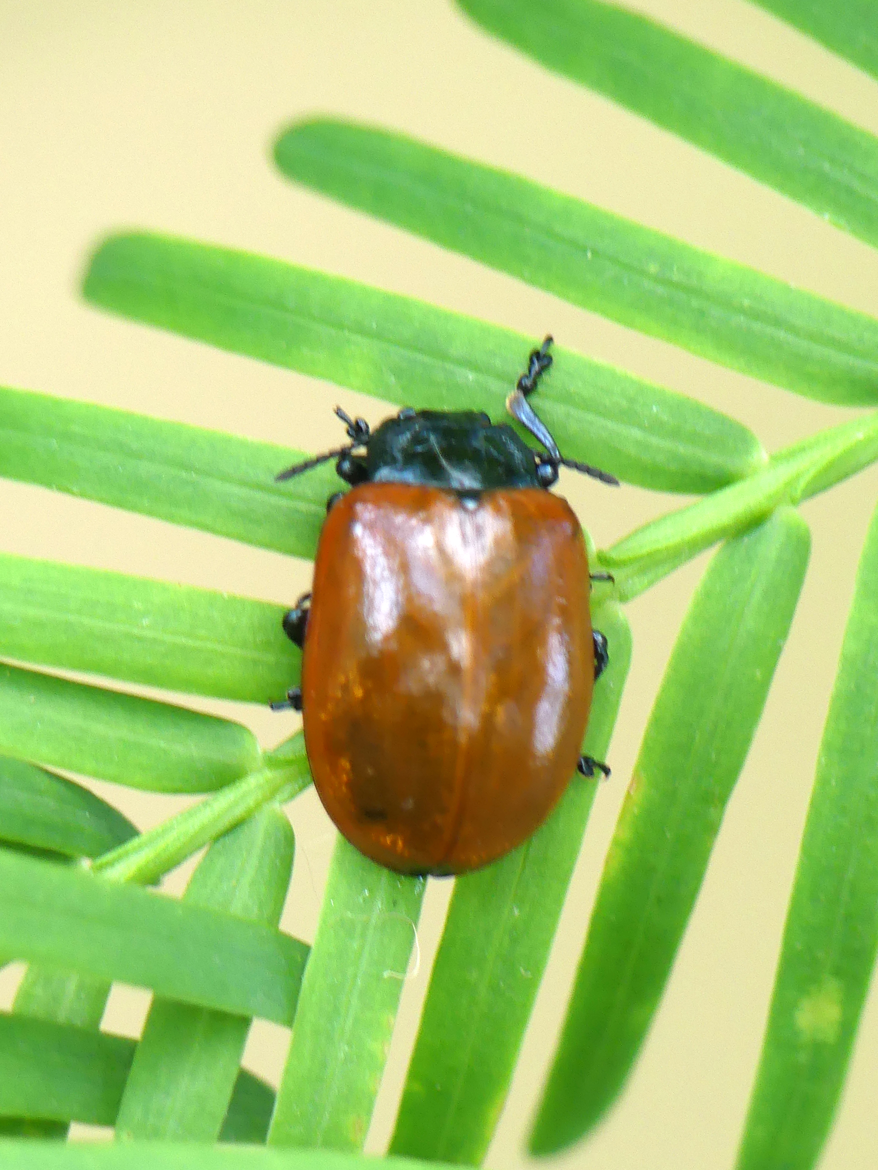 Pappelblattkäfer (Chrysomela populi) in der Gemarkung Hohenprießnitz, Sportplatz, nördlicher Waldrand, auf einer Espe (Populus tremula), April 2014