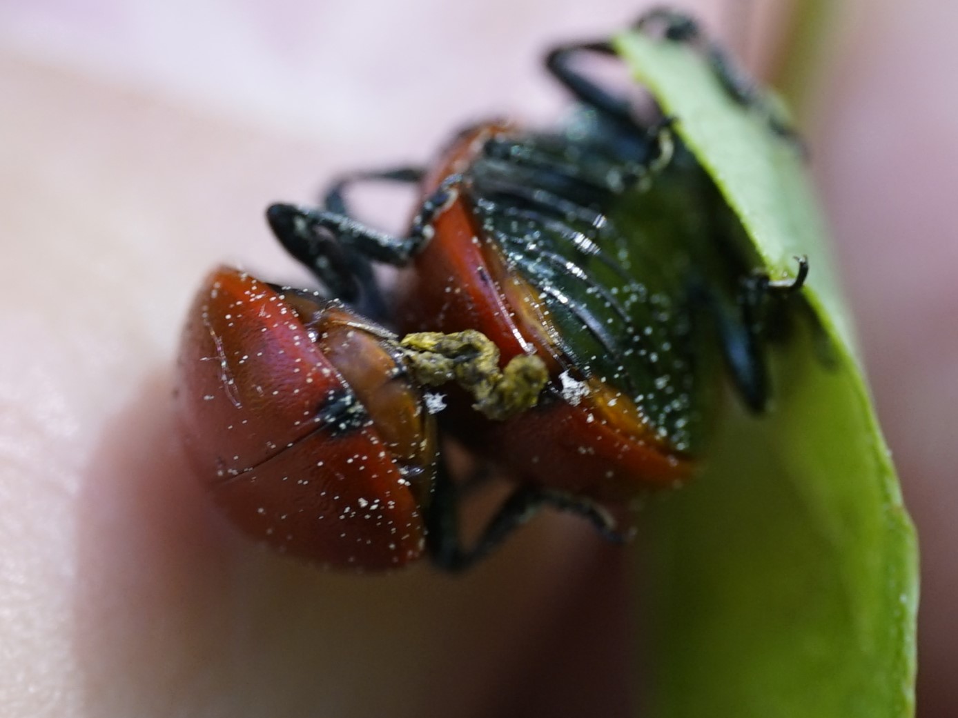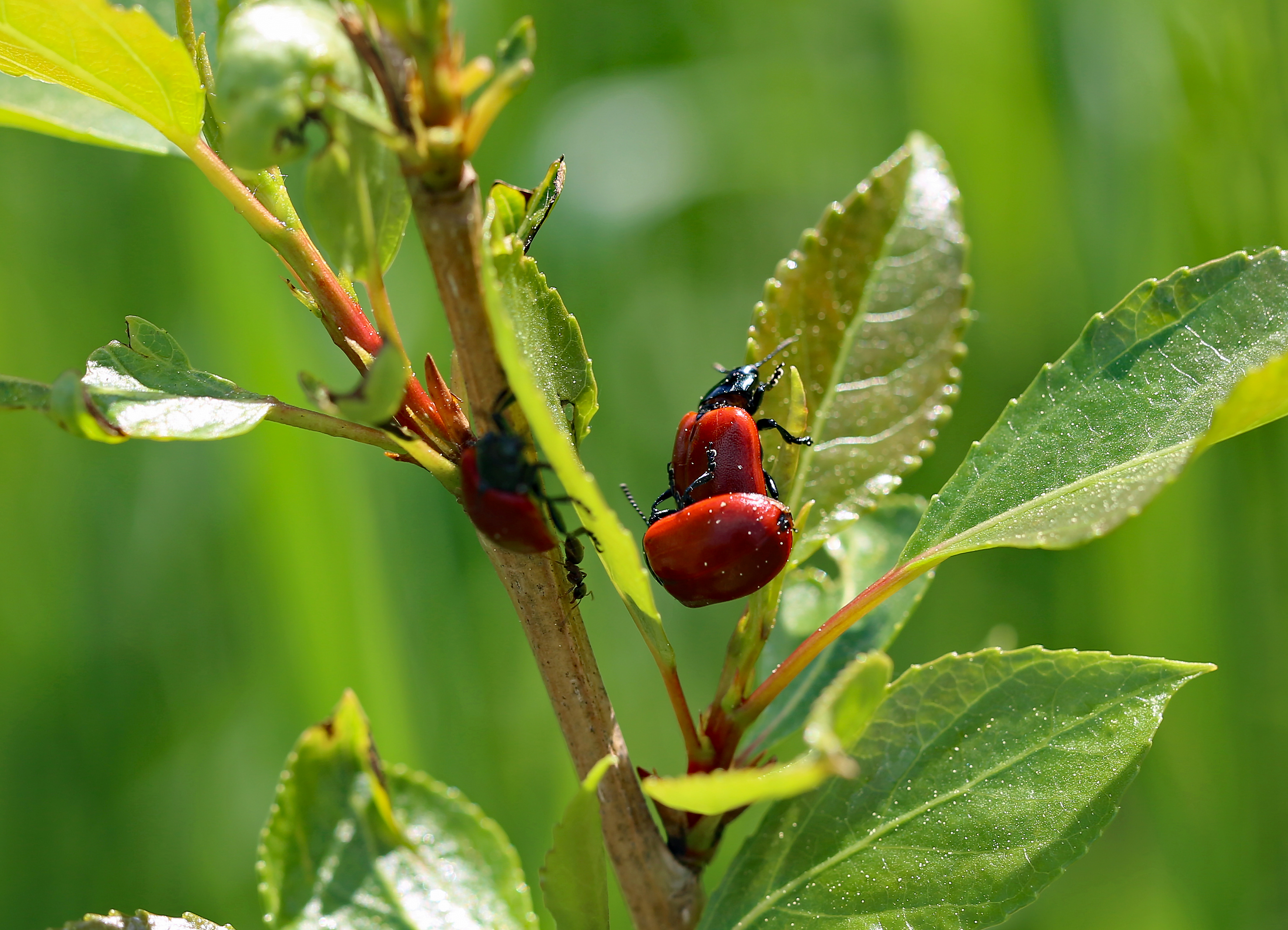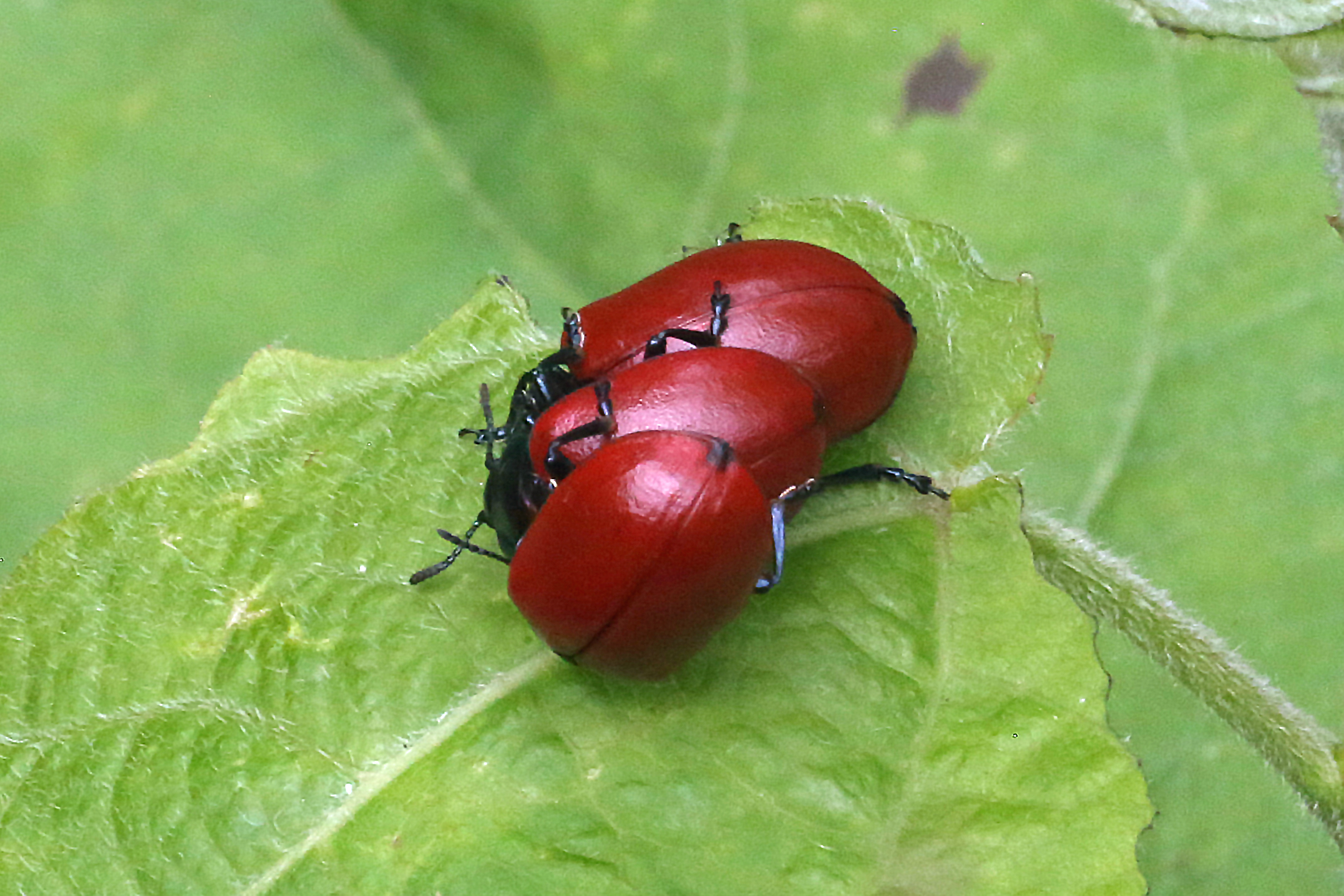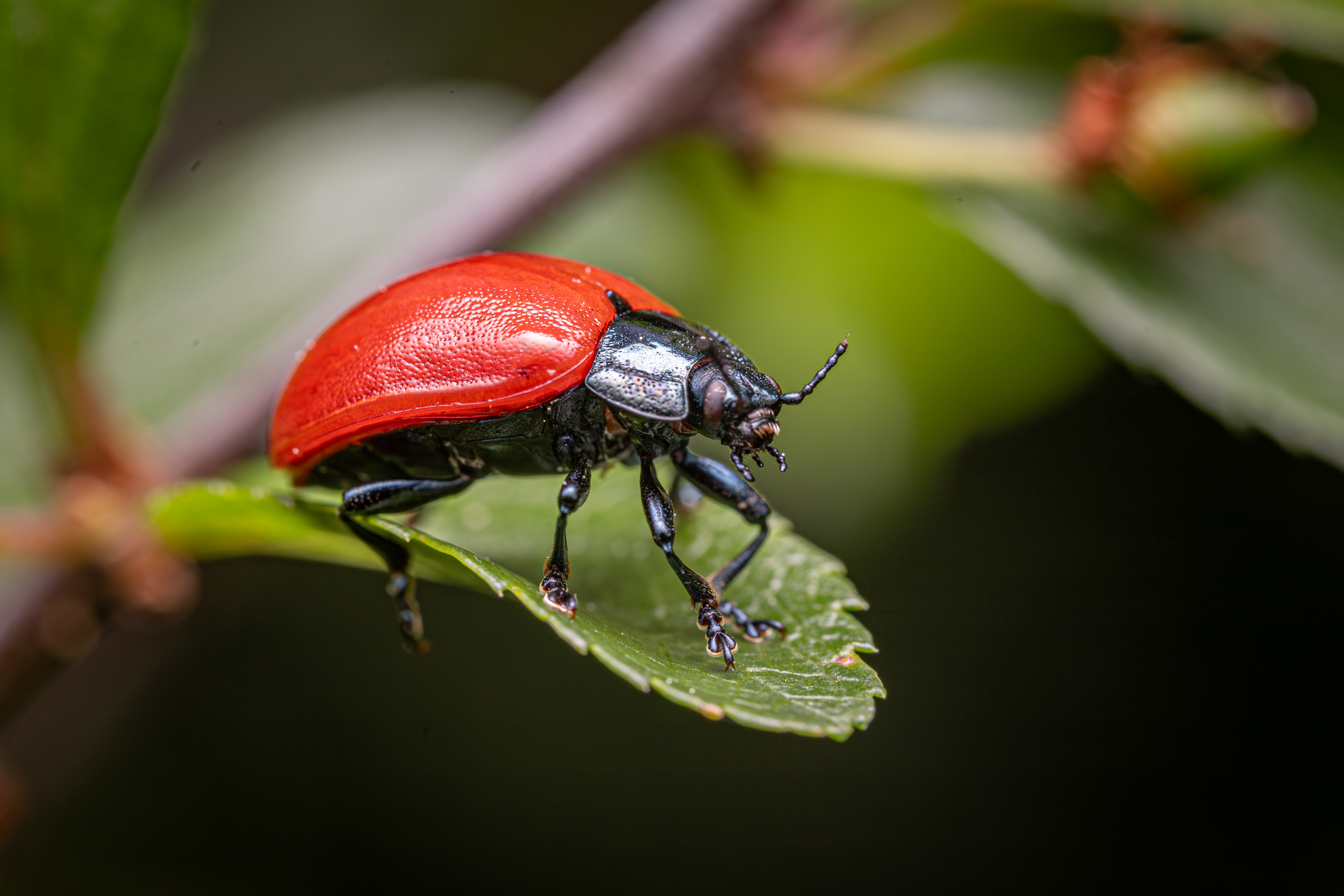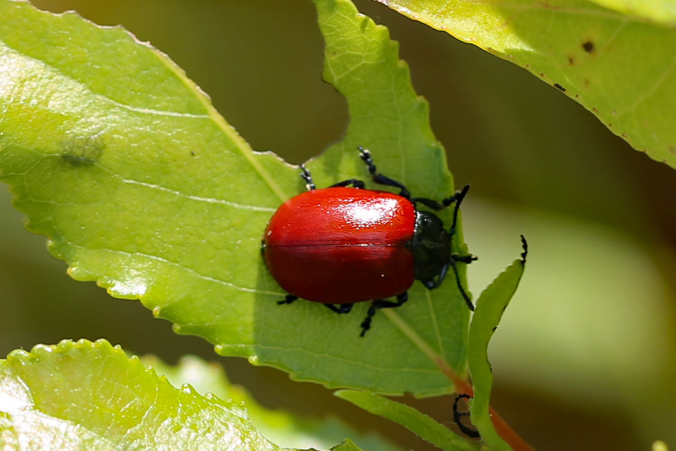 Pappelblattkäfer (Chrysomela populi) in der Gemarkung Hohenprießnitz, Sportplatz, nördlicher Waldrand, auf einer Espe (Populus tremula), April 2014
