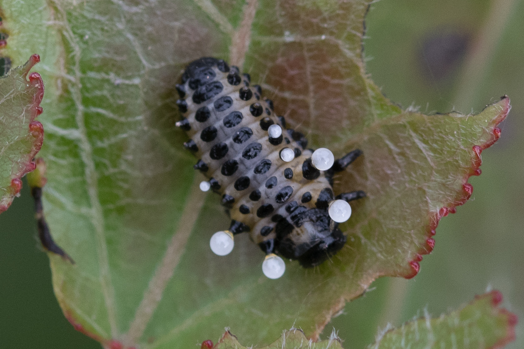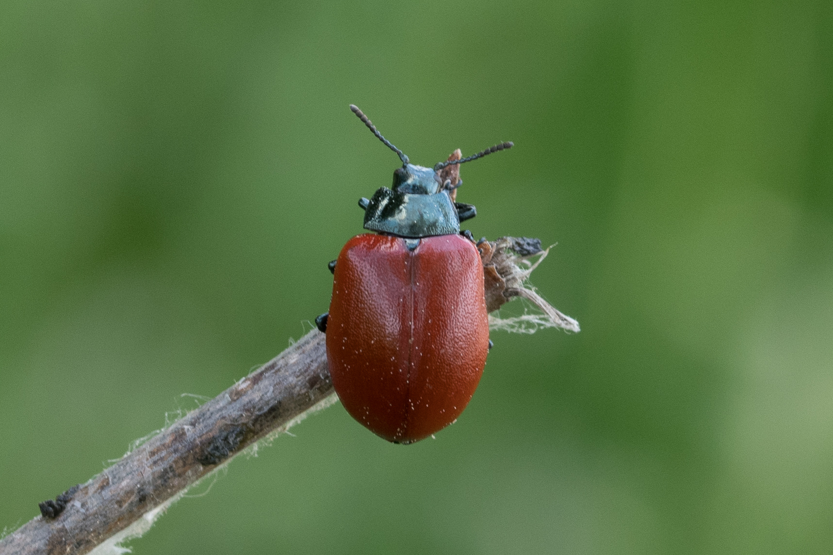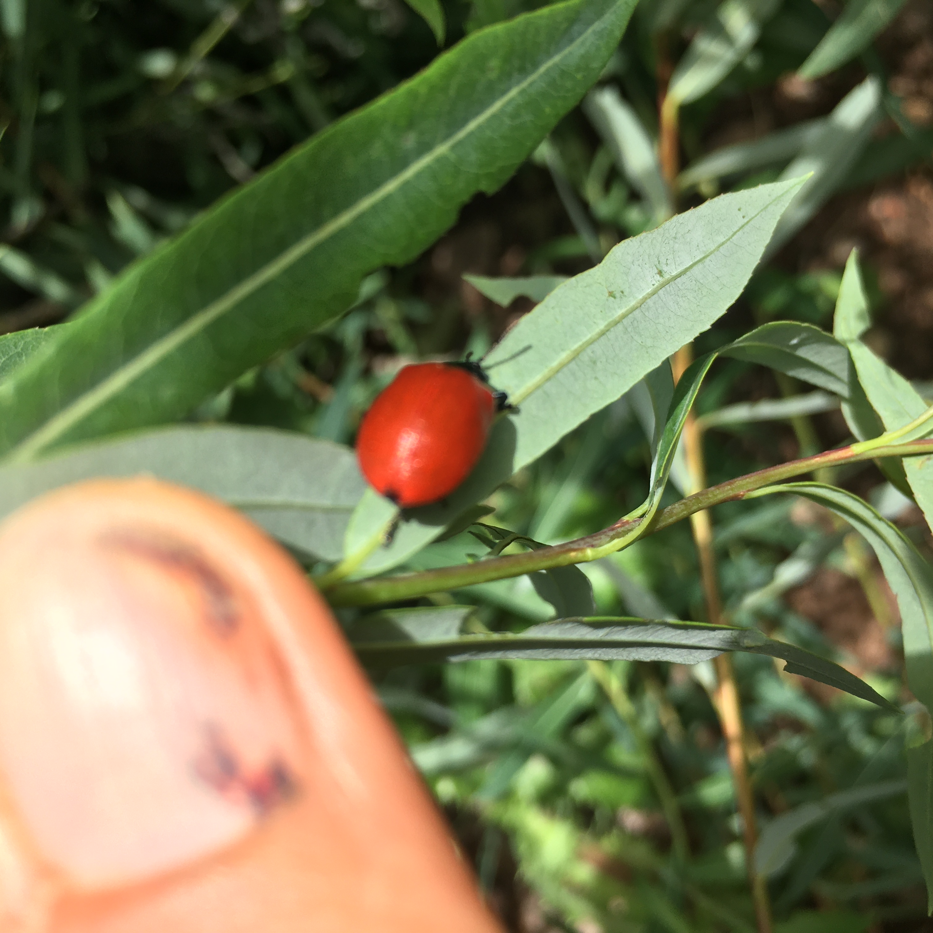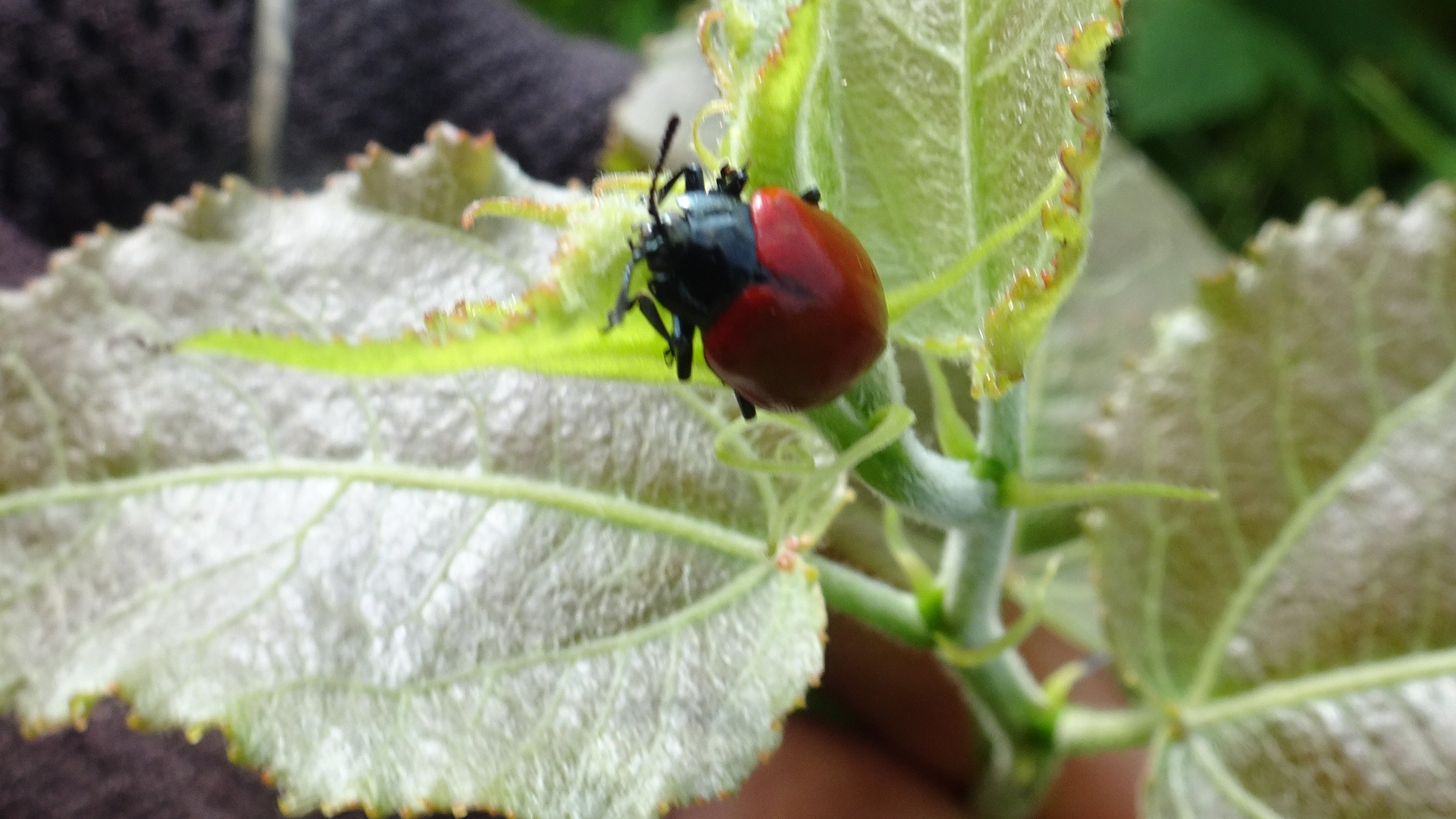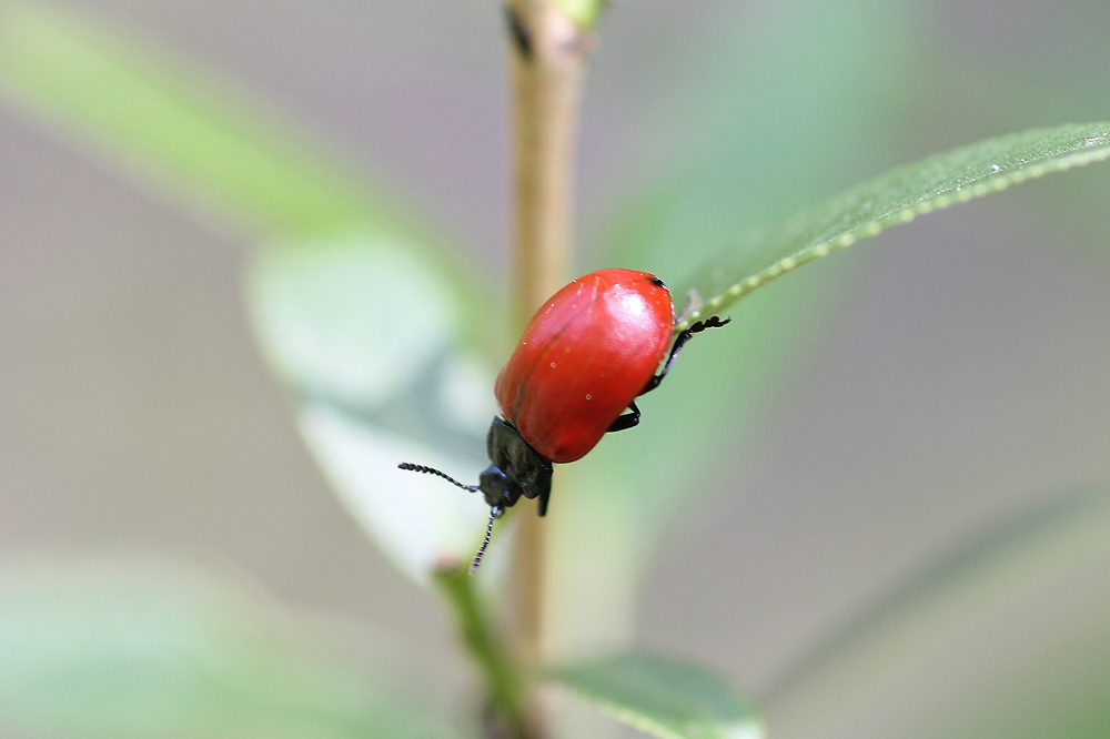 Pappelblattkäfer (Chrysomela populi) in der Gemarkung Hohenprießnitz, Sportplatz, nördlicher Waldrand, auf einer Espe (Populus tremula), April 2014