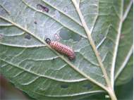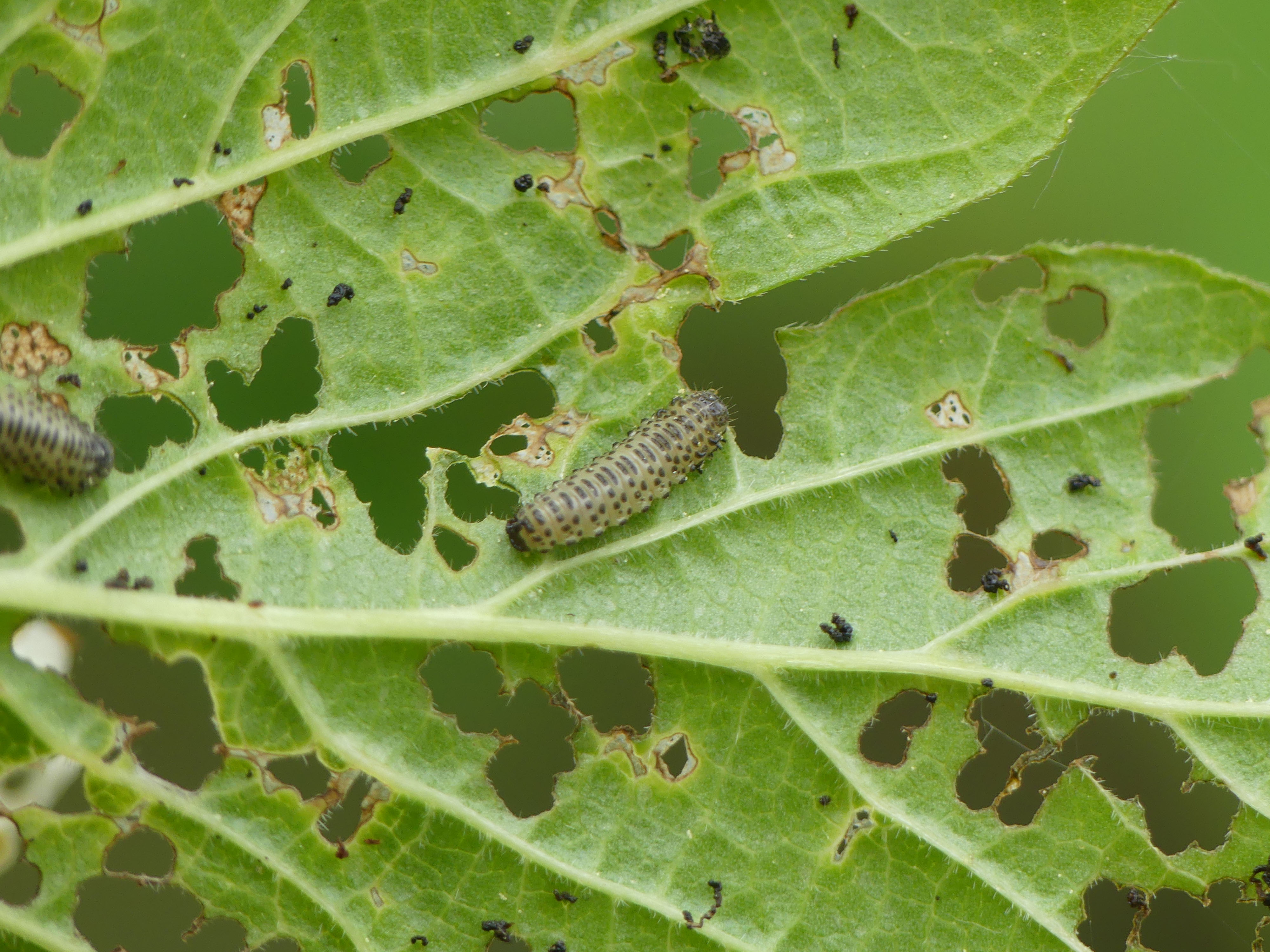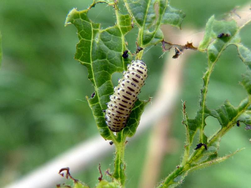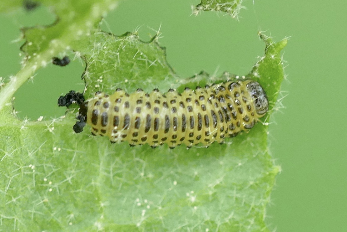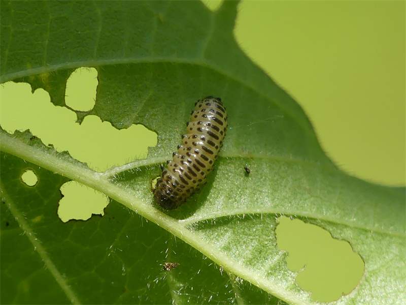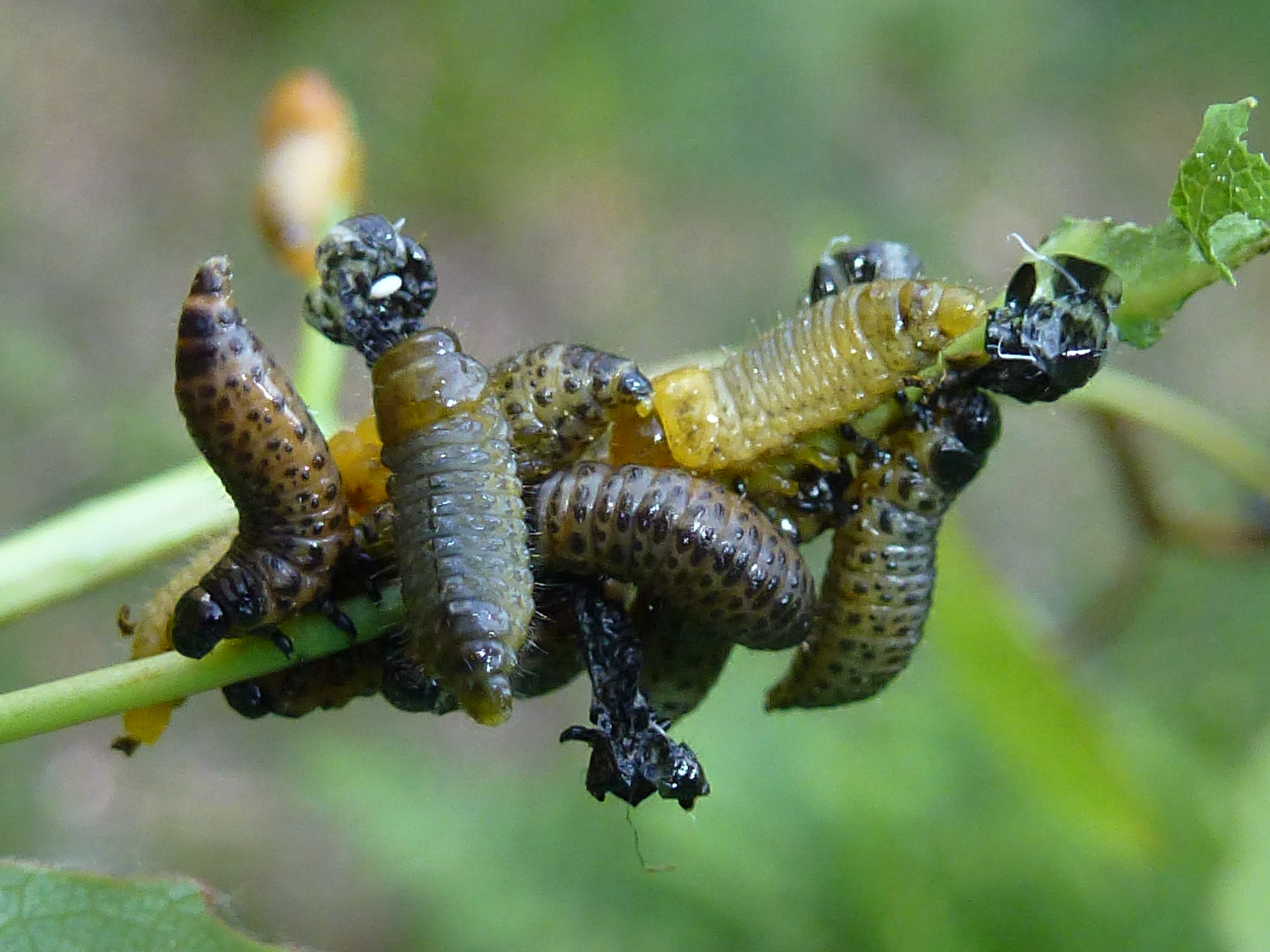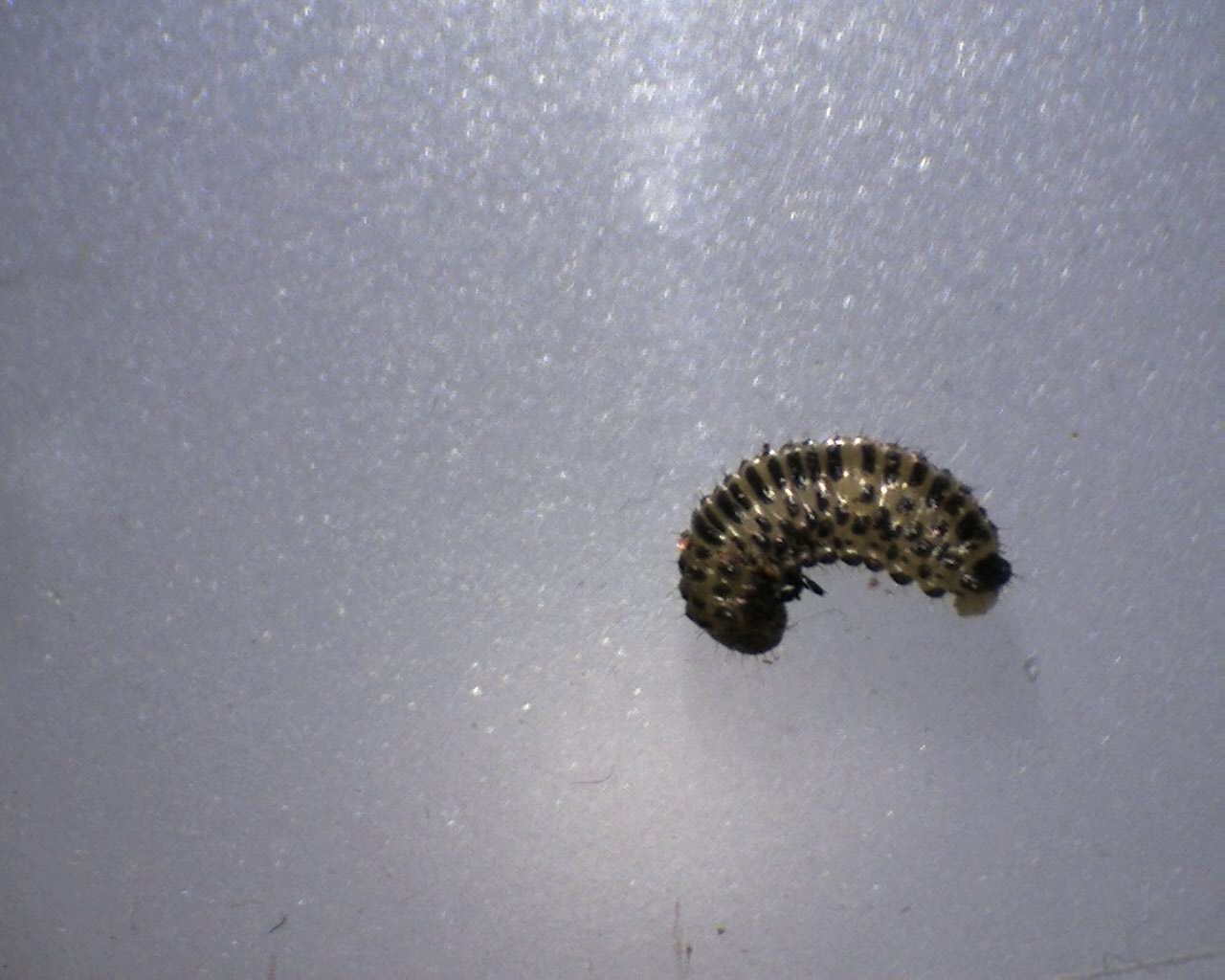 Larve des Schneeballblattkäfers, gefunden in Dresden im Mai 2014, Schneeball-Hecke über 3 Hauseingänge wurde von hunderten Larven quasi kahl gefressen