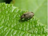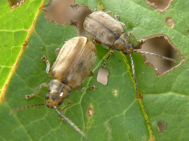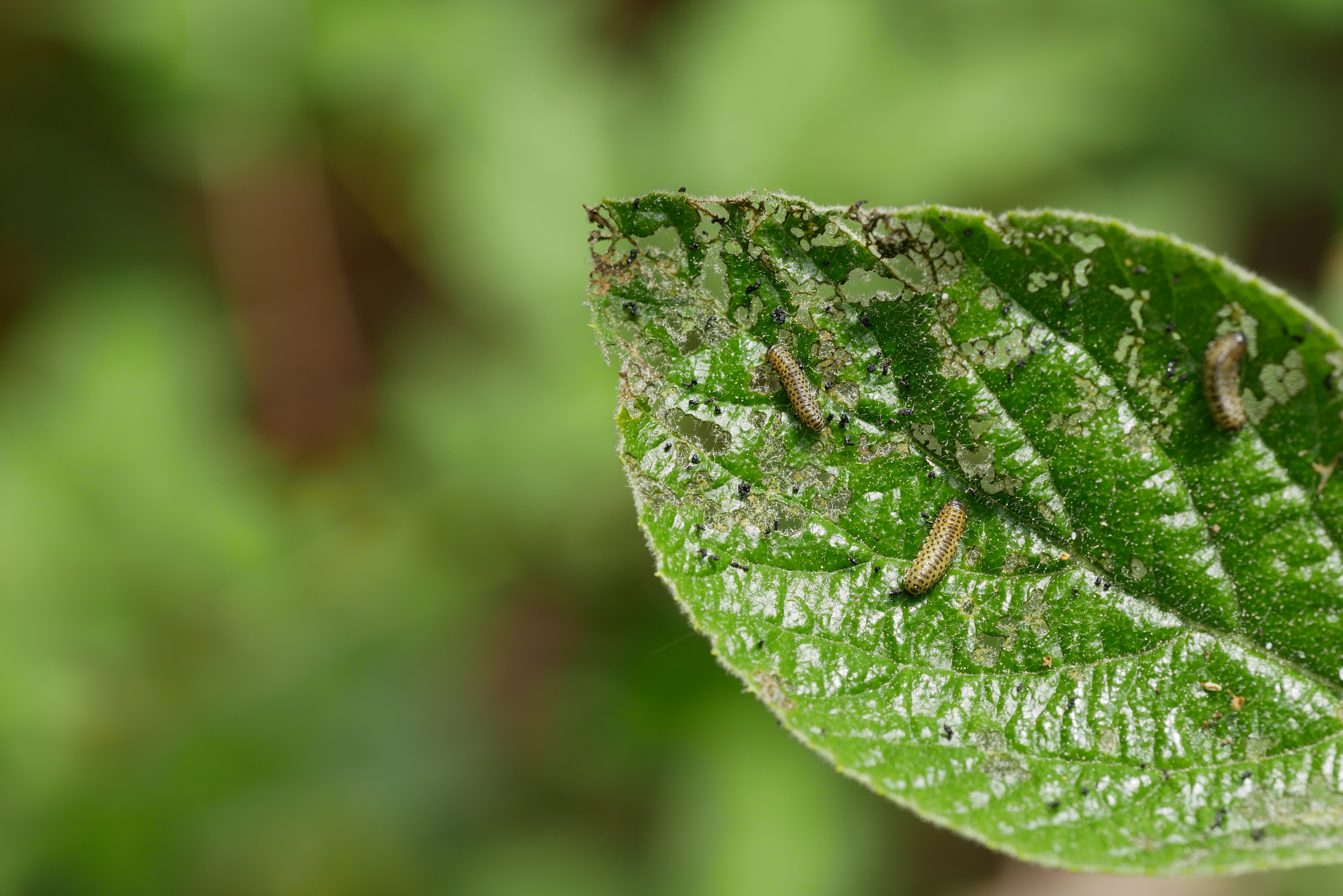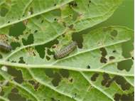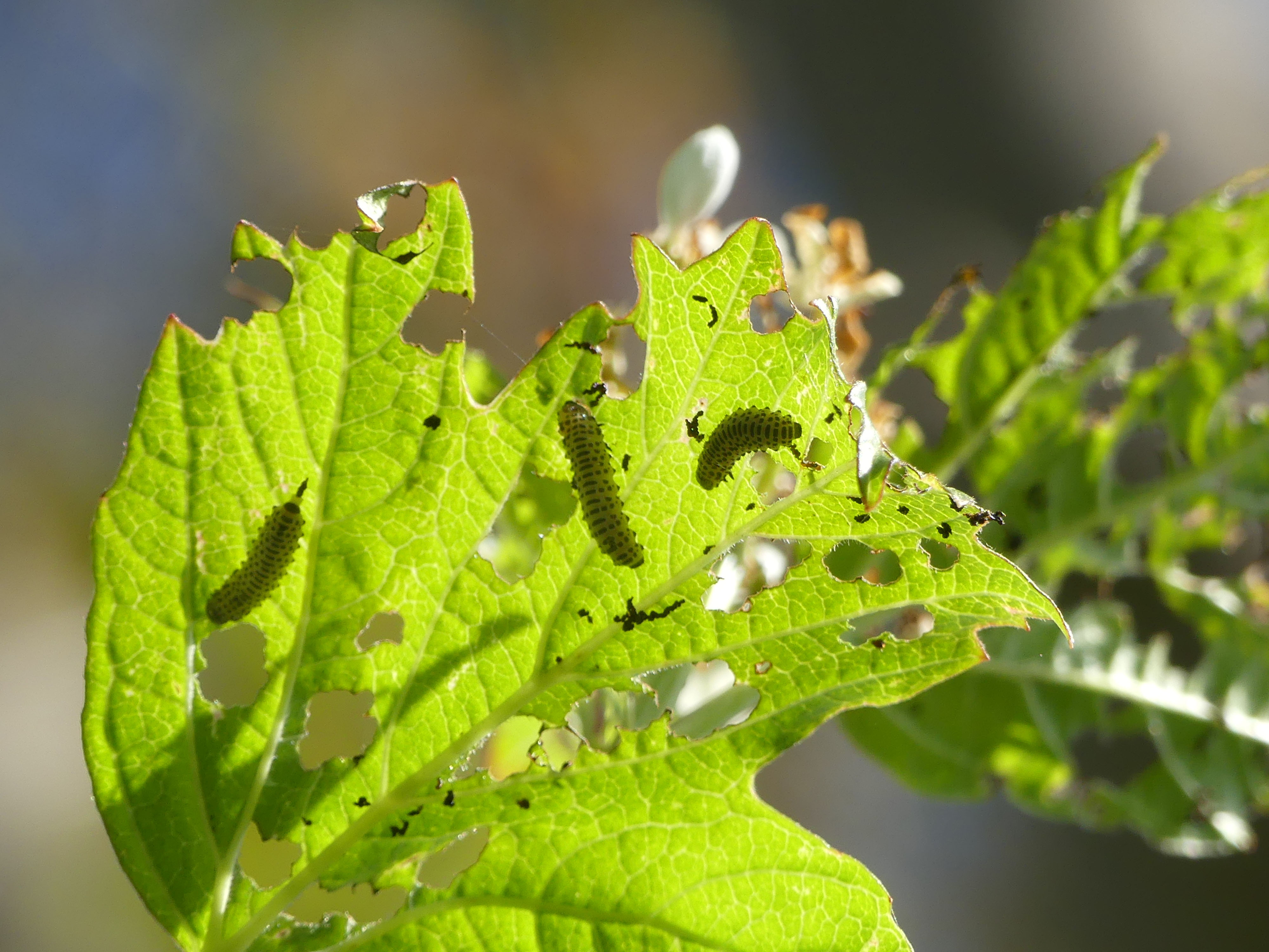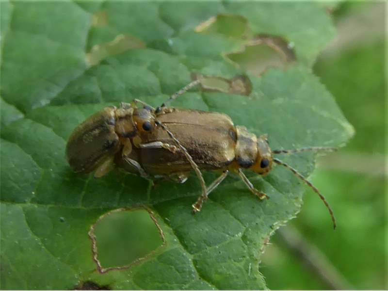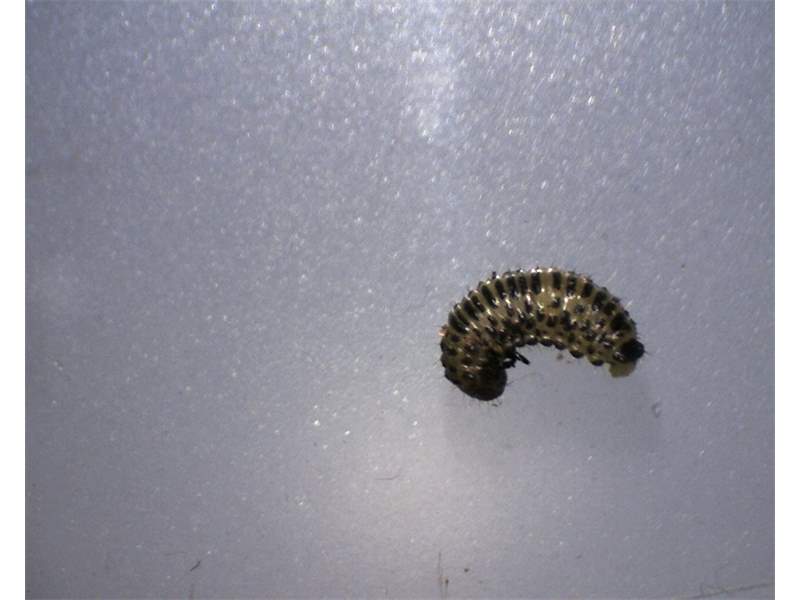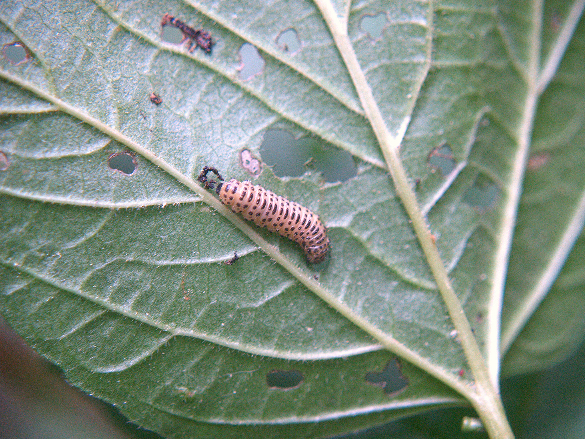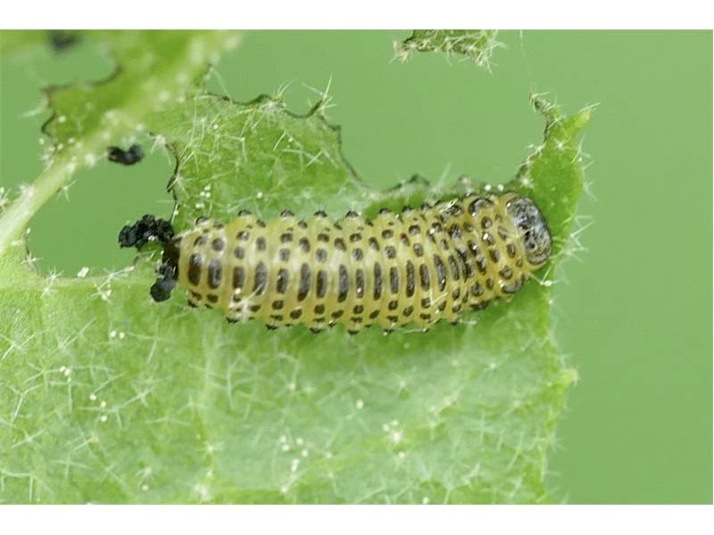 Larve des Schneeballblattkäfers, gefunden in Dresden im Mai 2014, Schneeball-Hecke über 3 Hauseingänge wurde von hunderten Larven quasi kahl gefressen