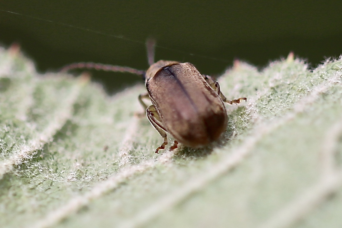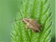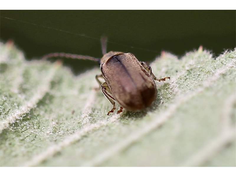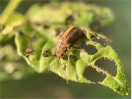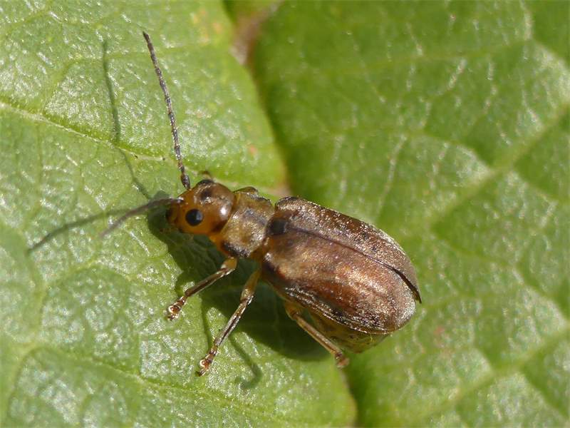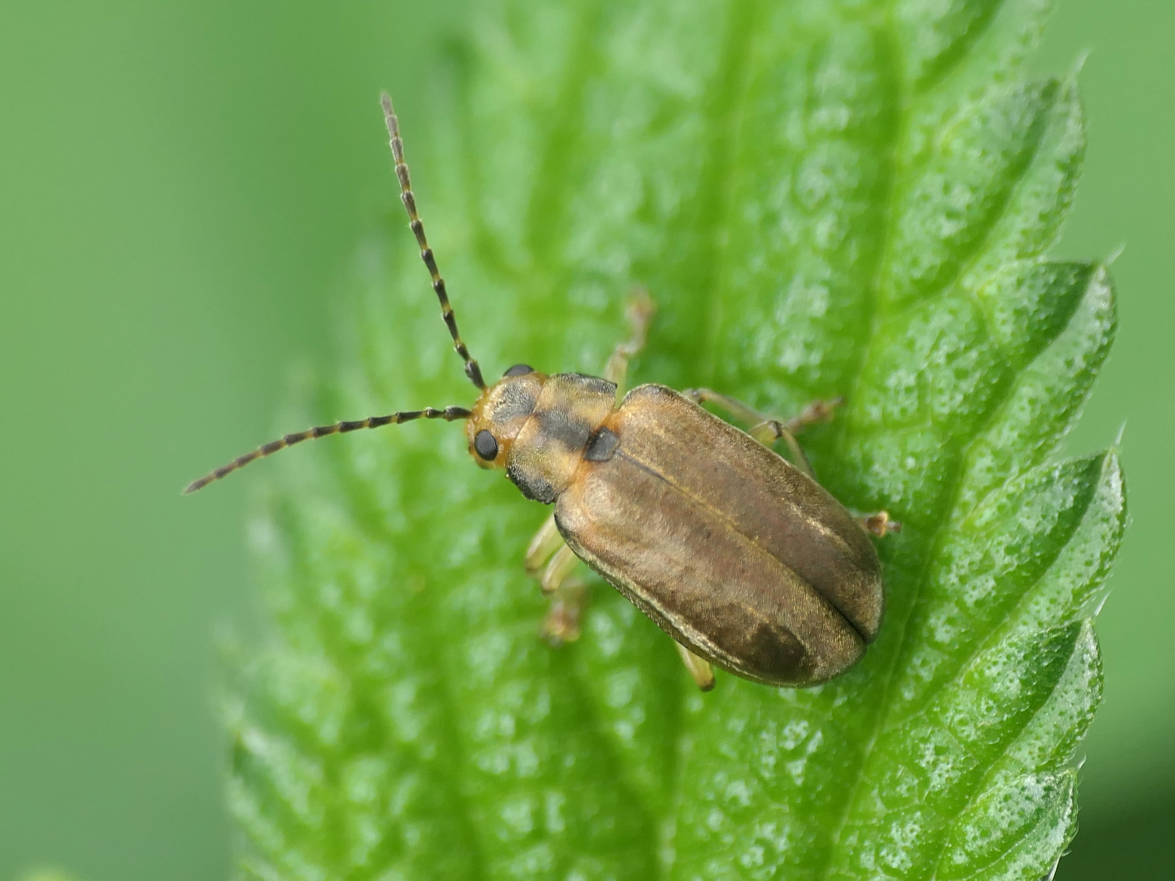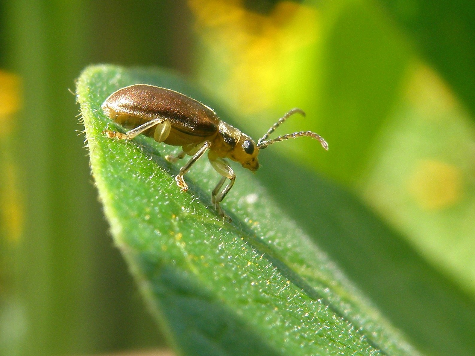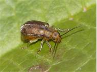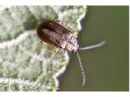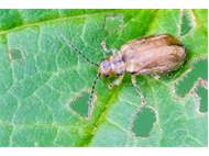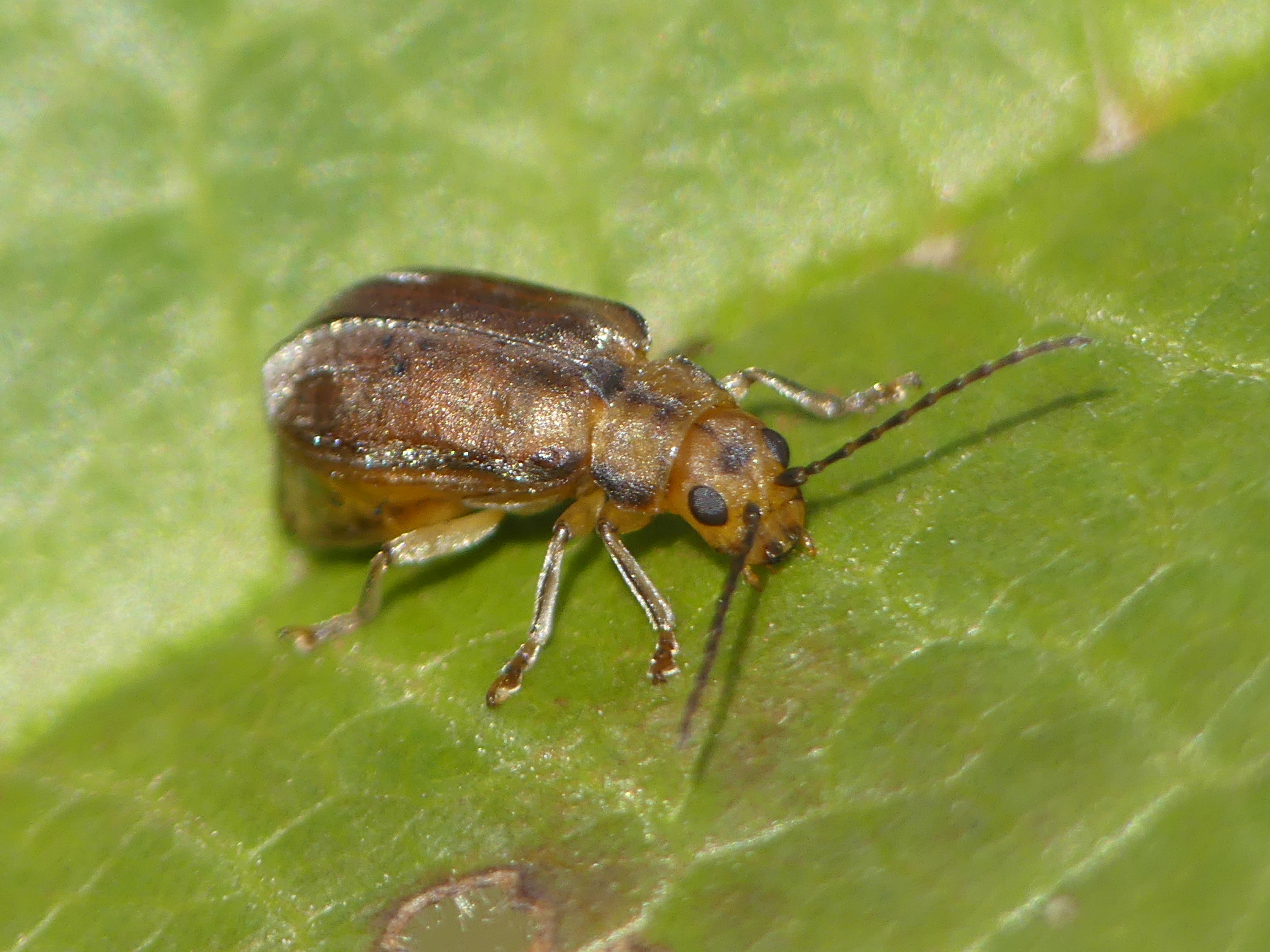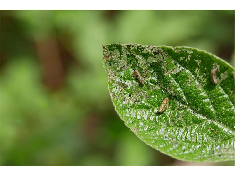 Larve des Schneeballblattkäfers, gefunden in Dresden im Mai 2014, Schneeball-Hecke über 3 Hauseingänge wurde von hunderten Larven quasi kahl gefressen