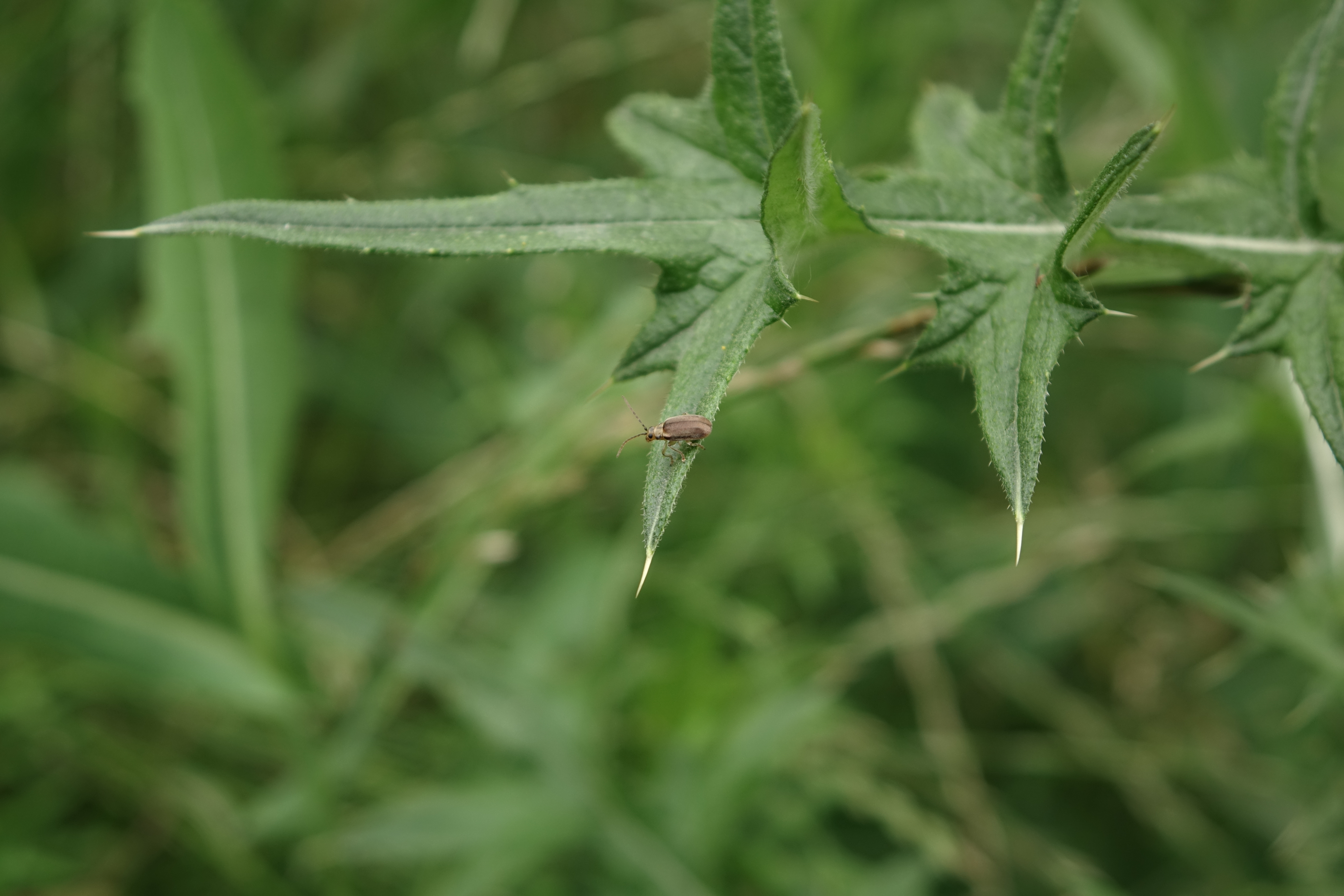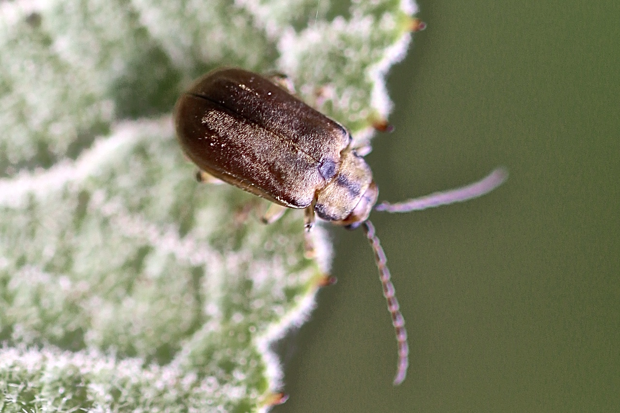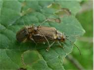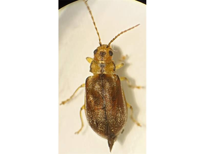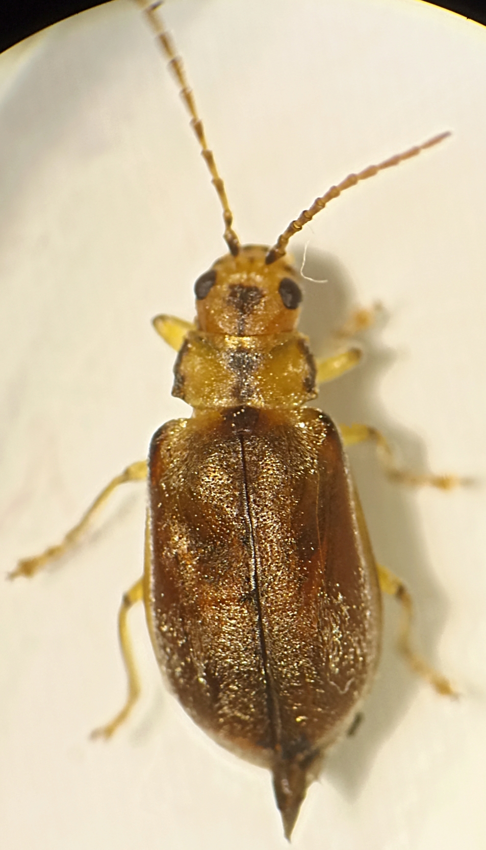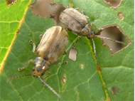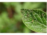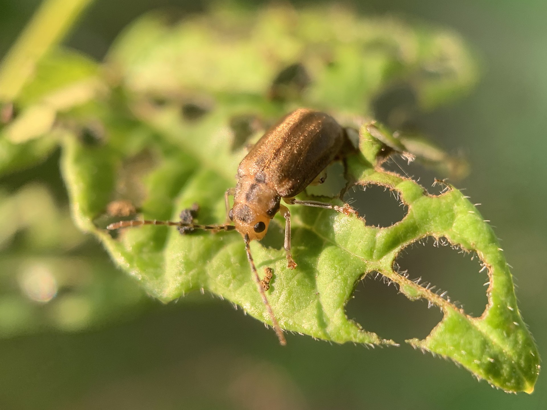 Larve des Schneeballblattkäfers, gefunden in Dresden im Mai 2014, Schneeball-Hecke über 3 Hauseingänge wurde von hunderten Larven quasi kahl gefressen