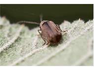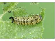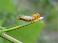 Larve des Schneeballblattkäfers, gefunden in Dresden im Mai 2014, Schneeball-Hecke über 3 Hauseingänge wurde von hunderten Larven quasi kahl gefressen (© U. Gottfried)( Bild vergrößern)