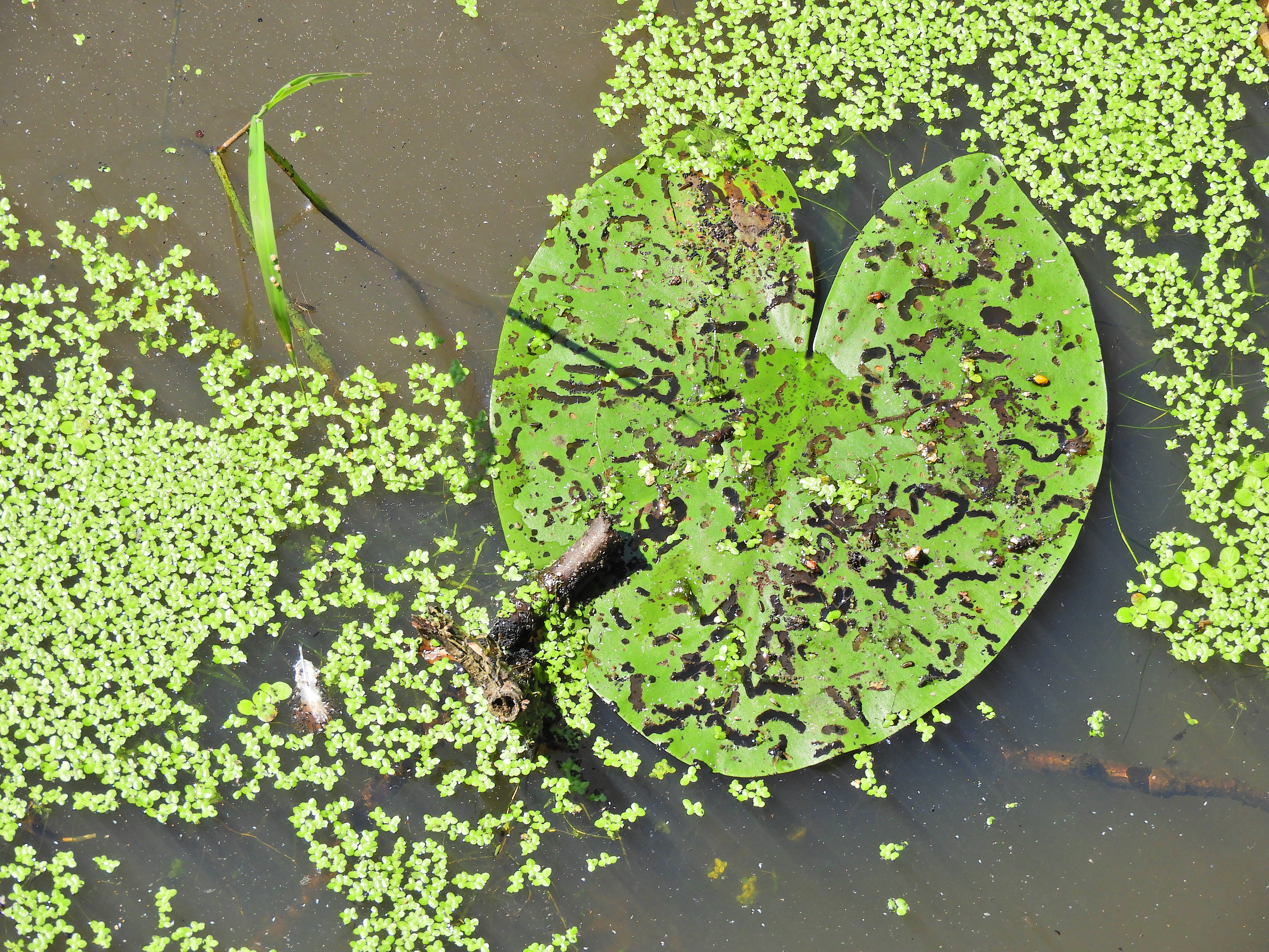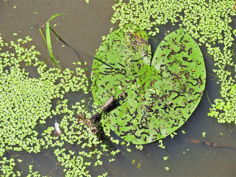 Deutlich zu sehen sind die länglichen, dunklen Fraßspuren des Seerosen-Blattkäfers. Moritzburg, 27.06.2020 (© Lisa Lepczynski)( Bild vergrößern)