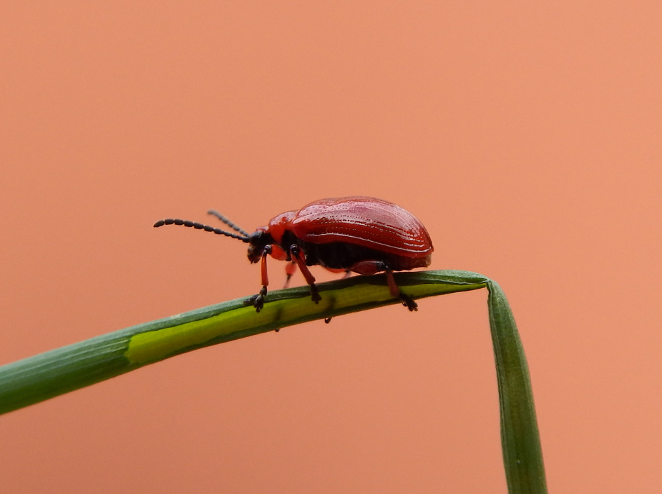 Lilioceris lilii) mit schwarzem Kopf und schwarzen Beinen.